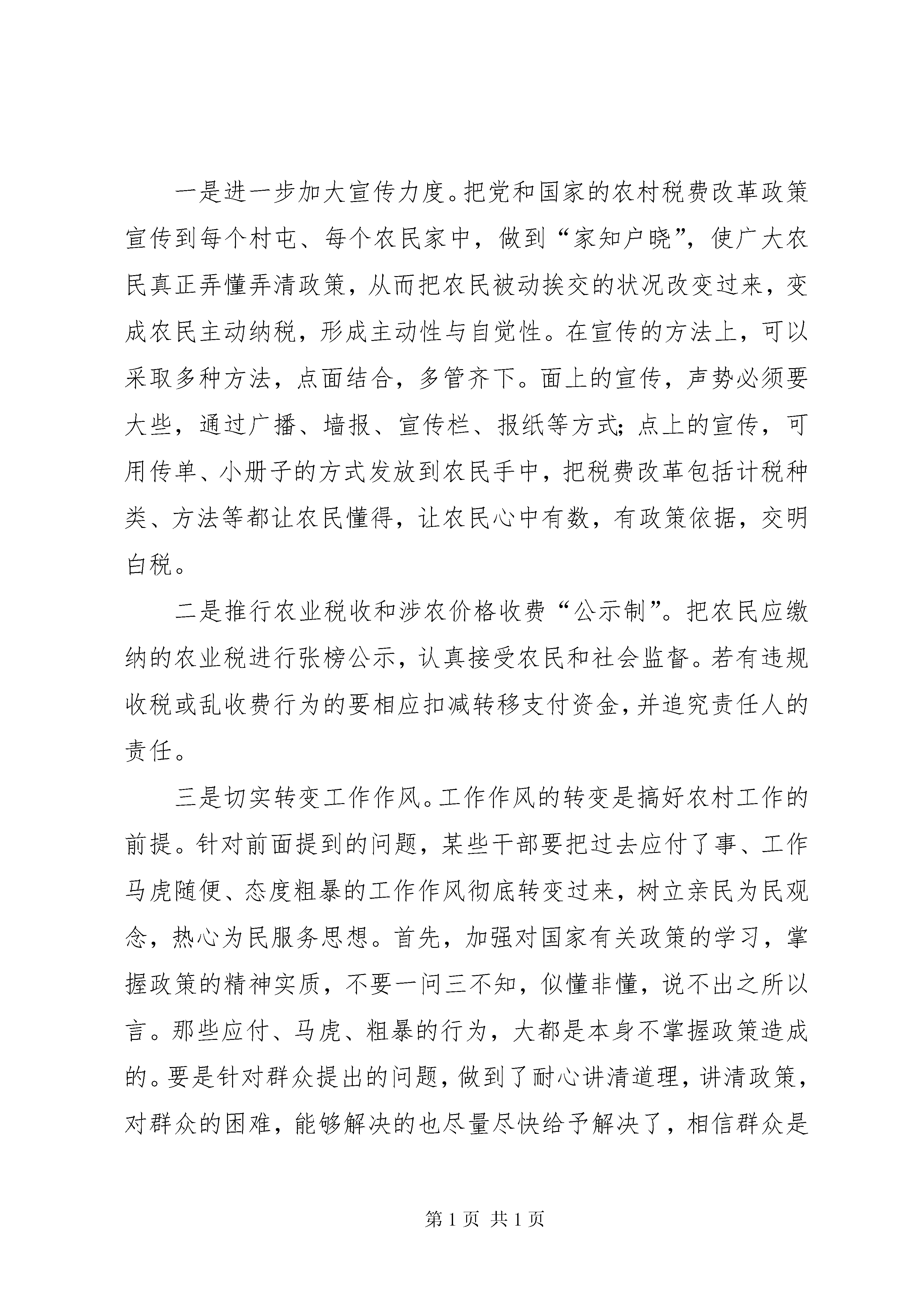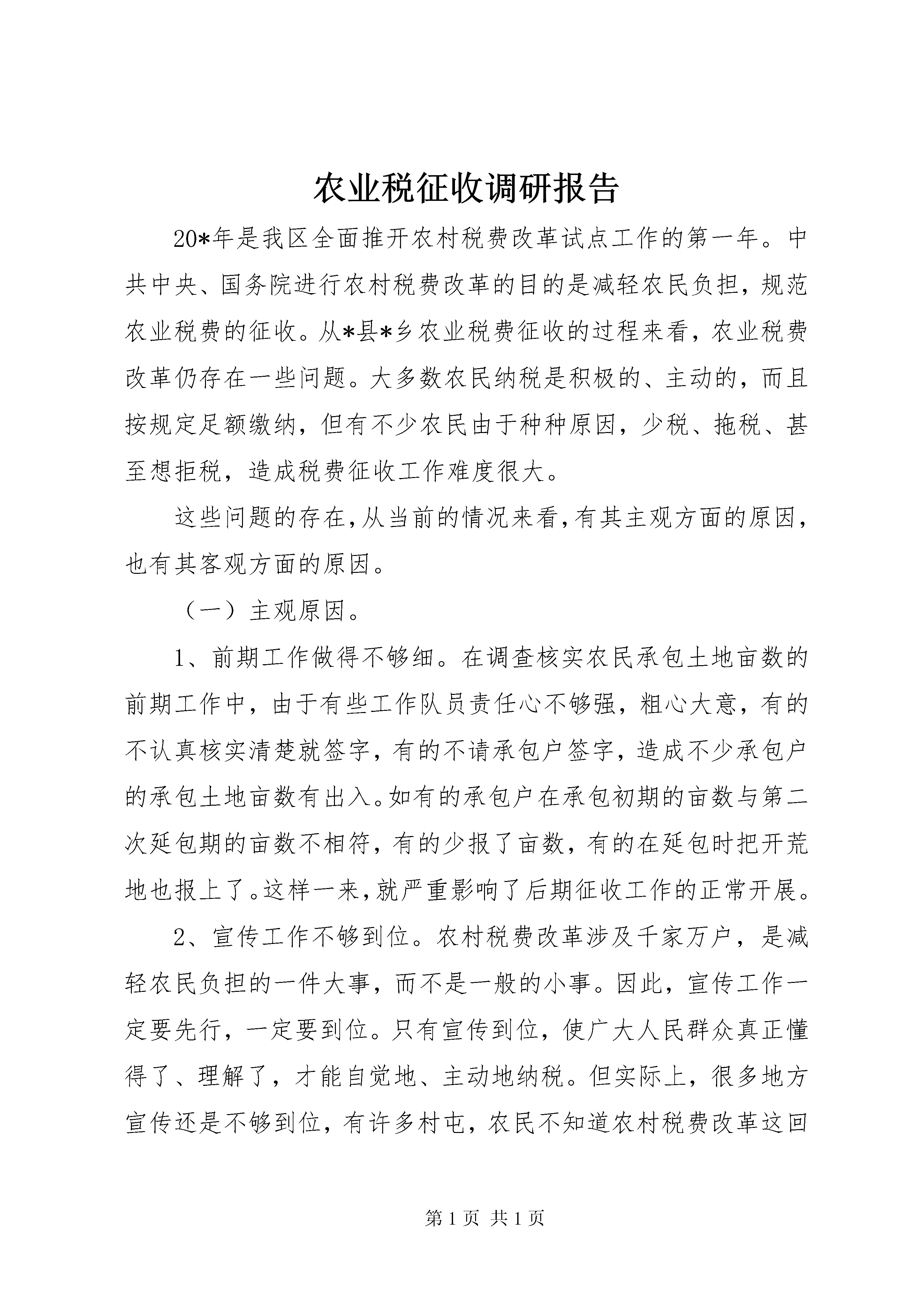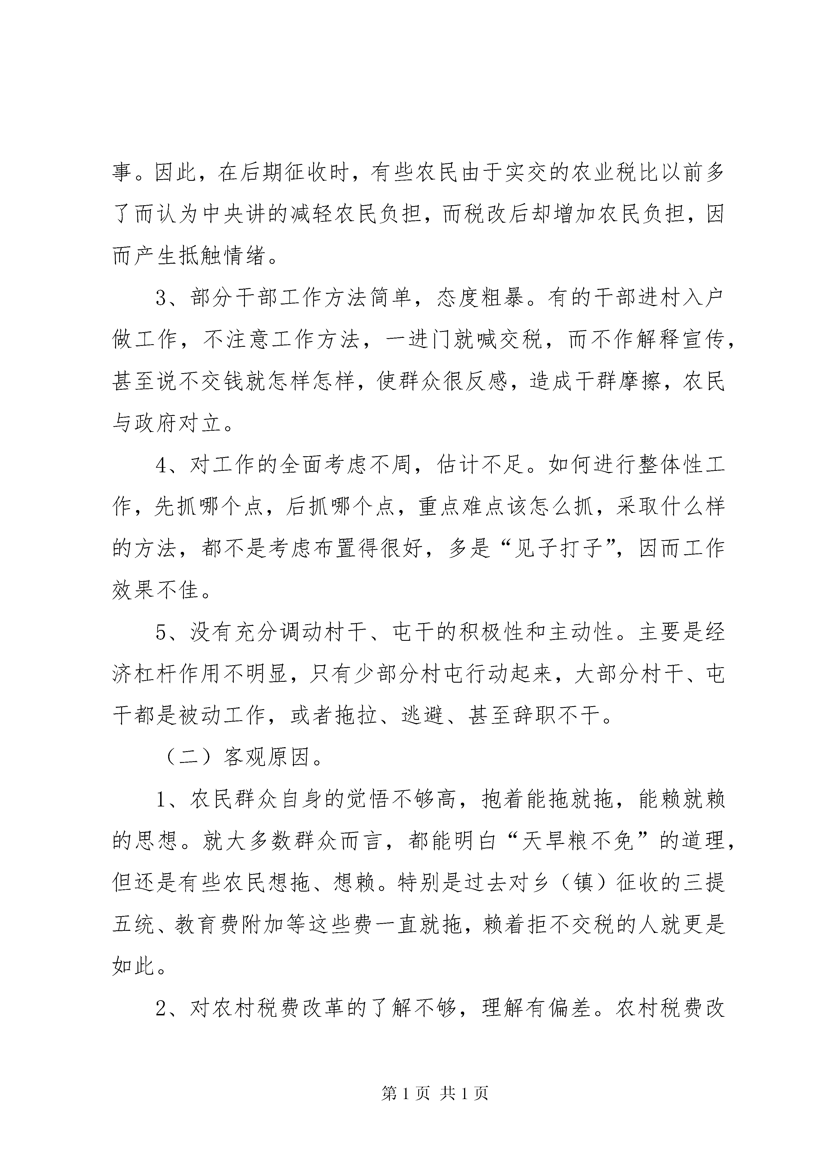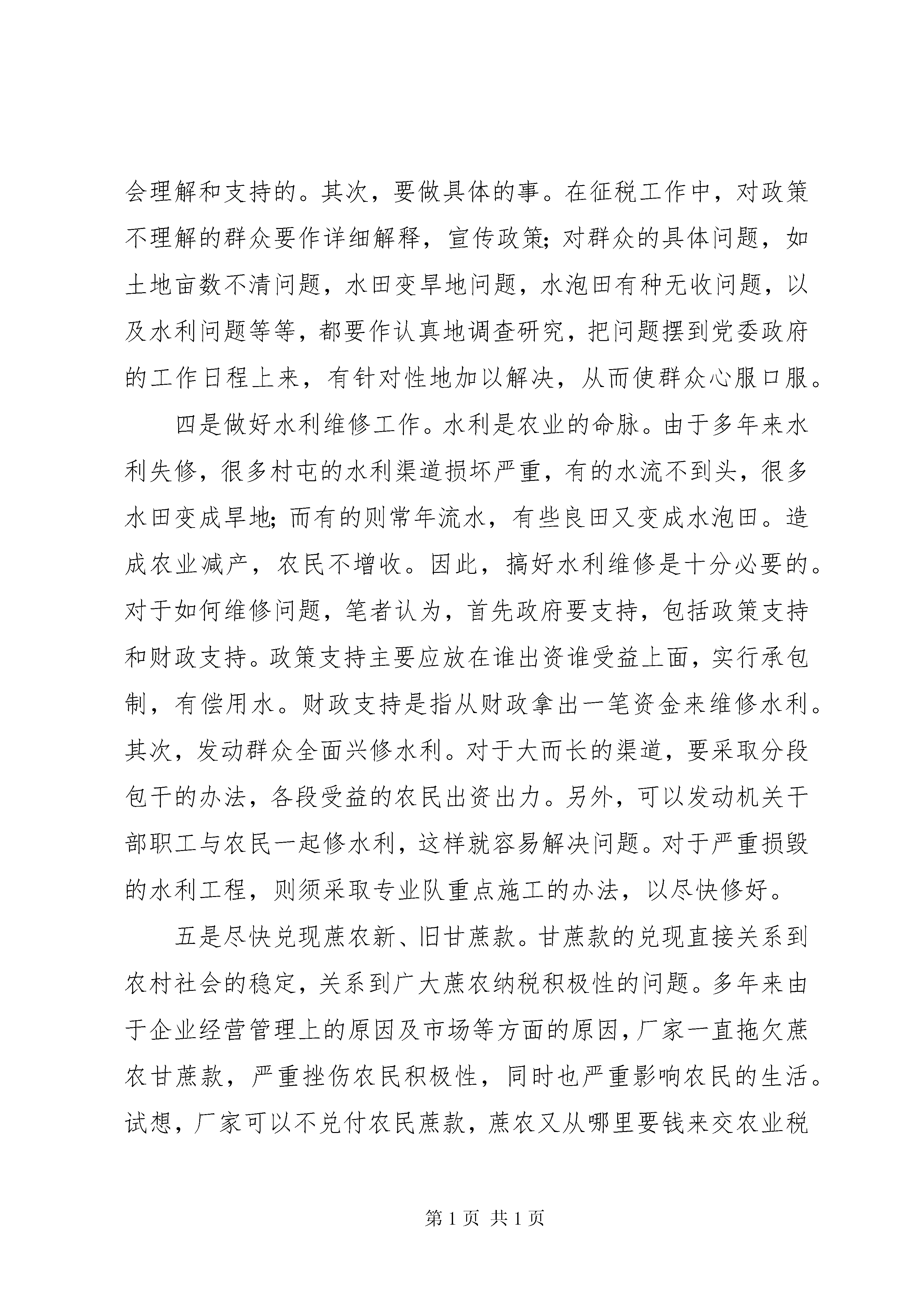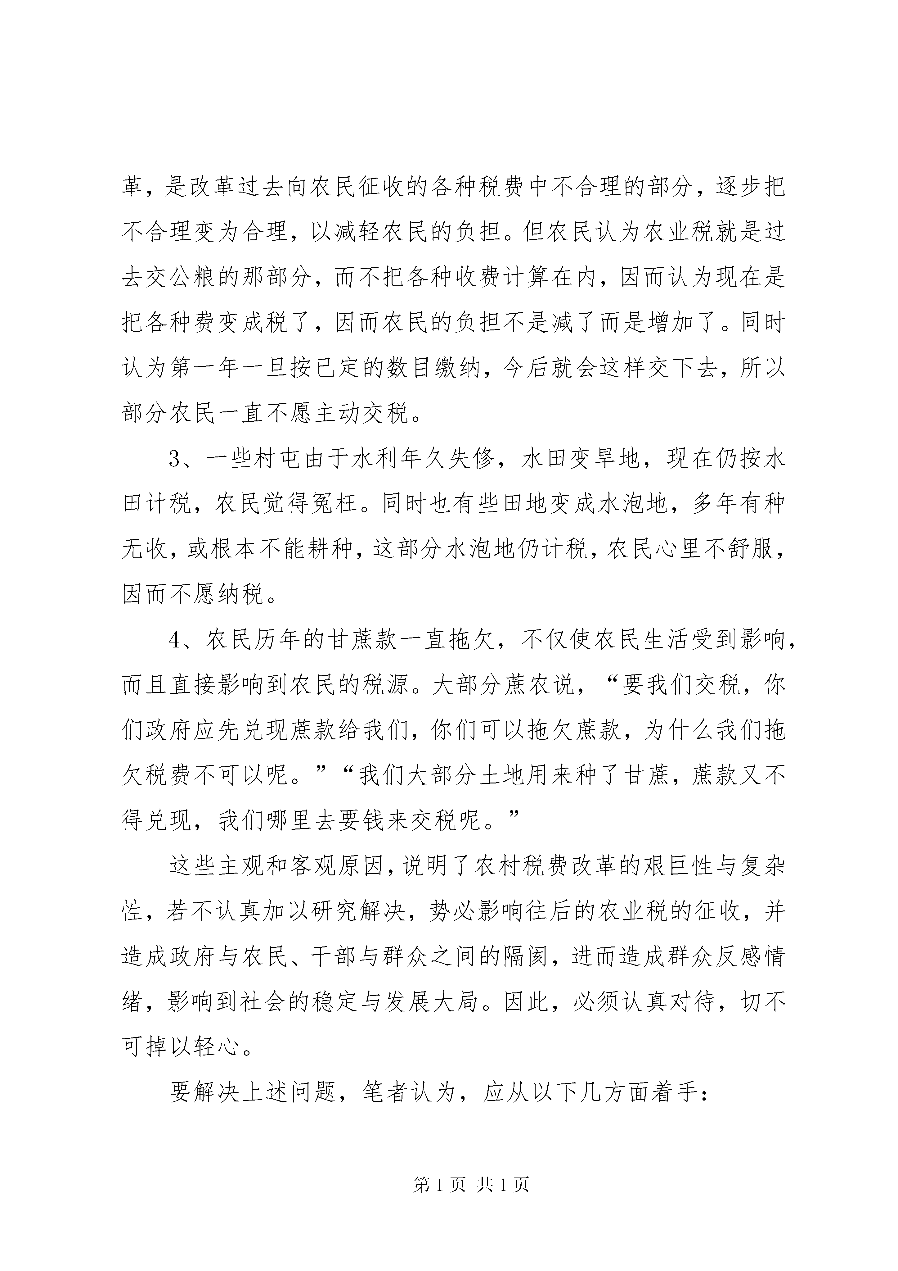 农业税征收调研报告20*年是我区全面推开农村税费改革试点工作的第一年。中共中央、国务院进行农村税费改革的目的是减轻农民负担,规范农业税费的征收。从*县*乡农业税费征收的过程来看,农业税费改革仍存在一些问题。大多数农民纳税是积极的、主动的,而且按规定足额缴纳,但有不少农民由于种种原因,少税、拖税、甚至想拒税,造成税费征收工作难度很大。这些问题的存在,从当前的情况来看,有其主观方面的原因,也有其客观方面的原因。(一)主观原因。1、前期工作做得不够细。在调查核实农民承包土地亩数的前期工作中,由于有些工作队员责任心不够强,粗心大意,有的不认真核实清楚就签字,有的不请承包户签字,造成不少承包户的承包土地亩数有出入。如有的承包户在承包初期的亩数与第二次延包期的亩数不相符,有的少报了亩数,有的在延包时把开荒地也报上了。这样一来,就严重影响了后期征收工作的正常开展。2、宣传工作不够到位。农村税费改革涉及千家万户,是减轻农民负担的一件大事,而不是一般的小事。因此,宣传工作一定要先行,一定要到位。只有宣传到位,使广大人民群众真正懂得了、理解了,才能自觉地、主动地纳税。但实际上,很多地方宣传还是不够到位,有许多村屯,农民不知道农村税费改革这回事。因此,在后期征收时,有些农民由于实交的农业税比以前多了而认为中央讲的减轻农民负担,而税改后却增加农民负担,因而产生抵触情绪。3、部分干部工作方法简单,态度粗暴。有的干部进村入户做工作,不注意工作方法,一进门就喊交税,而不作解释宣传,甚至说不交钱就怎样怎样,使群众很反感,造成干群摩擦,农民与政府对立。4、对工作的全面考虑不周,估计不足。如何进行整体性工作,先抓哪个点,后抓哪个点,重点难点该怎么抓,采取什么样的方法,都不是考虑布置得很好,多是“见子打子”,因而工作效果不佳。5、没有充分调动村干、屯干的积极性和主动性。主要是经济杠杆作用不明显,只有少部分村屯行动起来,大部分村干、屯干都是被动工作,或者拖拉、逃避、甚至辞职不干。(二)客观原因。1、农民群众自身的觉悟不够高,抱着能拖就拖,能赖就赖的思想。就大多数群众而言,都能明白“天旱粮不免”的道理,但还是有些农民想拖、想赖。特别是过去对乡(镇)征收的三提五统、教育费附加等这些费一直就拖,赖着拒不交税的人就更是如此。2、对农村税费改革的了解不够,理解有偏差。农村税费改革,是改革过去向农民征收的各种税费中不合理的部分,逐步把不合理变为合理,以减轻农民的负担。但农民认为农业税就是过去交公粮的那部分,而不把各种收费计算在内,因而认为现在是把各种费变成税了,因而农民的负担不是减了而是增加了。同时认为第一年一旦按已定的数目缴纳,今后就会这样交下去,所以部分农民一直不愿主动交税。3、一些村屯由于水利年久失修,水田变旱地,现在仍按水田计税,农民觉得冤枉。同时也有些田地变成水泡地,多年有种无收,或根本不能耕种,这部分水泡地仍计税,农民心里不舒服,因而不愿纳税。4、农民历年的甘蔗款一直拖欠,不仅使农民生活受到影响,而且直接影响到农民的税源。大部分蔗农说,“要我们交税,你们政府应先兑现蔗款给我们,你们可以拖欠蔗款,为什么我们拖欠税费不可以呢。”“我们大部分土地用来种了甘蔗,蔗款又不得兑现,我们哪里去要钱来交税呢。”这些主观和客观原因,说明了农村税费改革的艰巨性与复杂性,若不认真加以研究解决,势必影响往后的农业税的征收,并造成政府与农民、干部与群众之间的隔阂,进而造成群众反感情绪,影响到社会的稳定与发展大局。因此,必须认真对待,切不可掉以轻心。要解决上述问题,笔者认为,应从以下几方面着手:一是进一步加大宣传力度。把党和国家的农村税费改革政策宣传到每个村屯、每个农民家中,做到“家知户晓”,使广大农民真正弄懂弄清政策,从而把农民被动挨交的状况改变过来,变成农民主动纳税,形成主动性与自觉性。在宣传的方法上,可以采取多种方法,点面结合,多管齐下。面上的宣传,声势必须要大些,通过广播、墙报、宣传栏、报纸等方式;点上的宣传,可用传单、小册子的方式发放到农民手中,把税费改革包括计税种类、方法等都让农民懂得,让农民心中有数,有政策依据,交明白税。二是推行农业税收和涉农价格收费“公示制”。把农民应缴纳的农业税进行张榜公示,认真接受农民和社会监督。若有违规收税或乱收费行为的要相应扣减转移支付资金,并追究责任人的责任。三是切实转变工作作风。工作作风的转变是搞好农村工作的前提。针对前面提到的问题,某些干部要把过去应付了事、工作马虎随便、态度粗暴的工作作风彻底转变过来,树立亲民为民观念,热心为民服务思想。首先,加强对国家有关政策的学习,掌握政策的精神实质,不要一问三不知,似懂非懂,说不出之所以言。那些应付、马虎、粗暴的行为,大都是本身不掌握政策造成的。要是针对群众提出的问题,做到了耐心讲