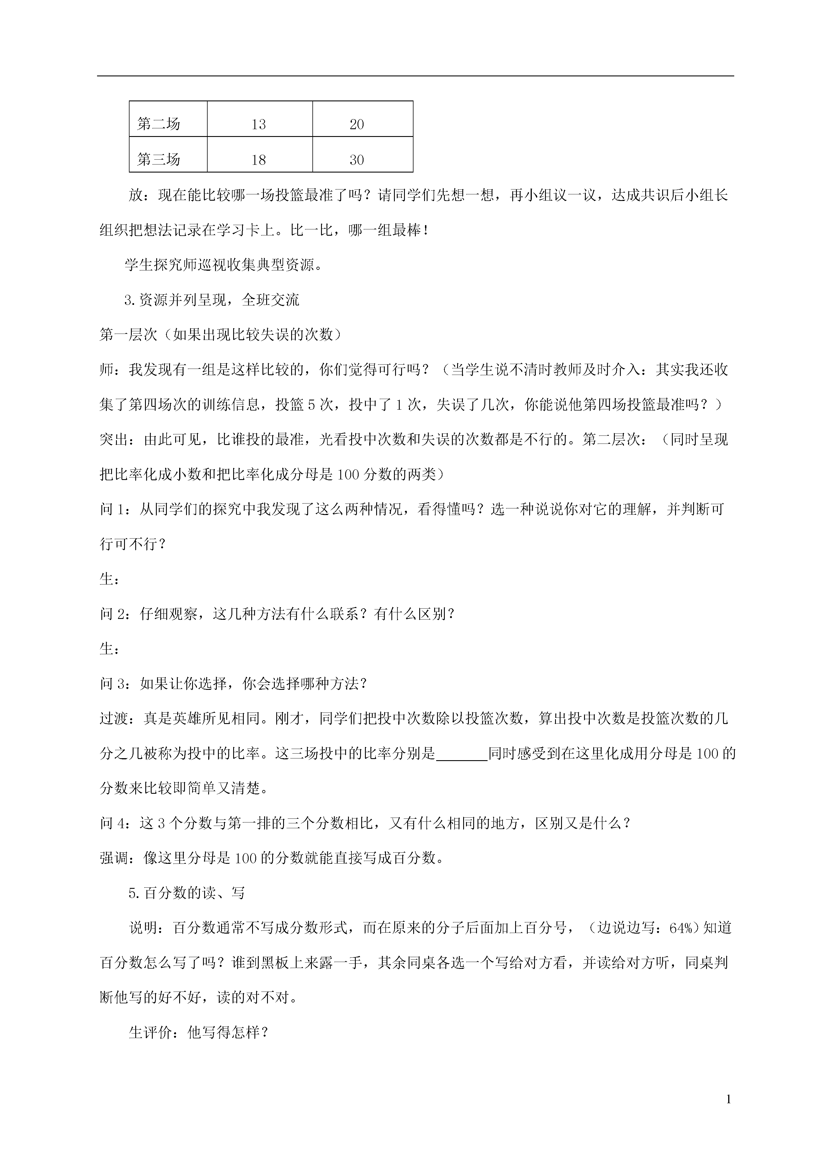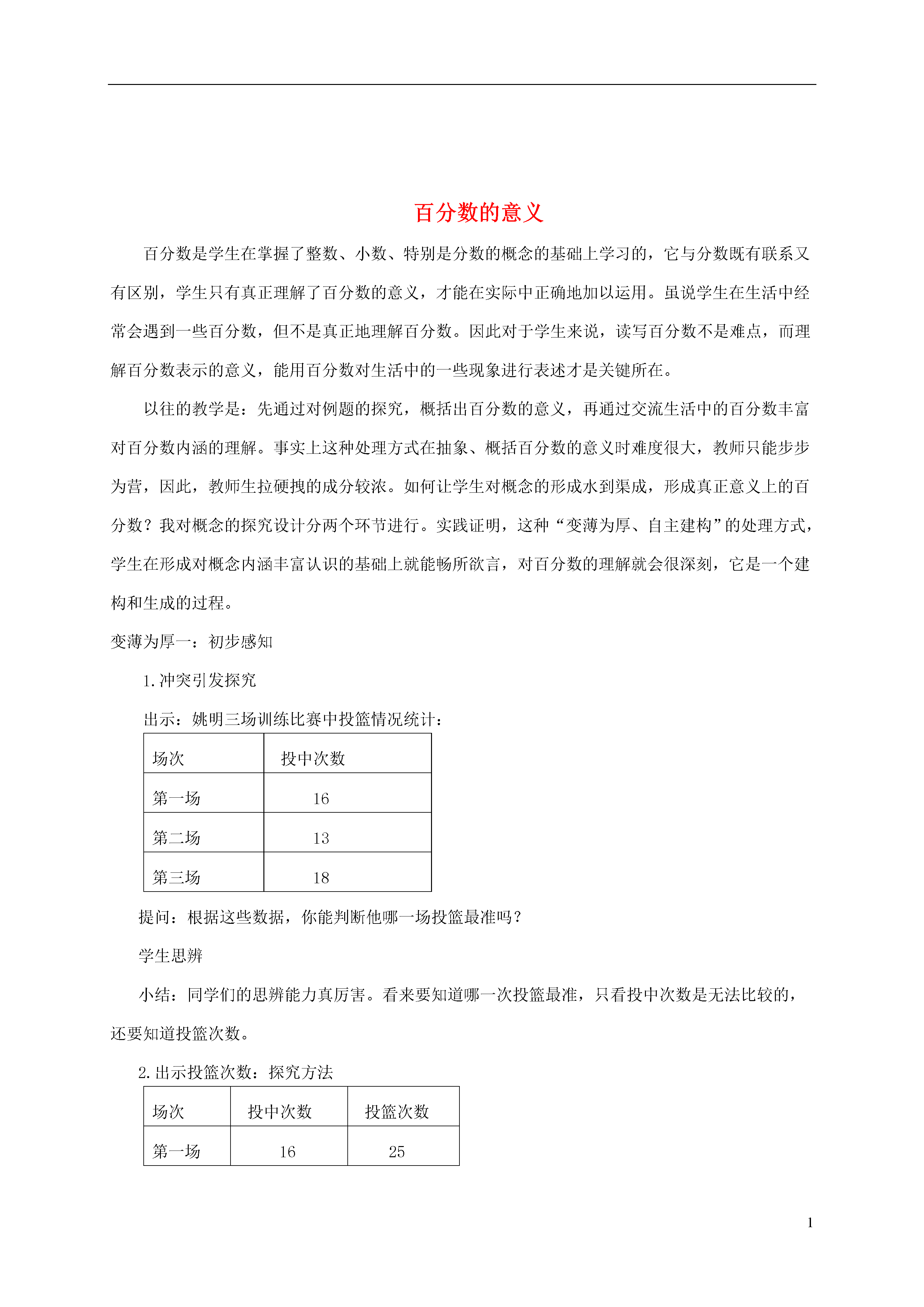 1百分数的意义百分数是学生在掌握了整数、小数、特别是分数的概念的基础上学习的,它与分数既有联系又有区别,学生只有真正理解了百分数的意义,才能在实际中正确地加以运用。虽说学生在生活中经常会遇到一些百分数,但不是真正地理解百分数。因此对于学生来说,读写百分数不是难点,而理解百分数表示的意义,能用百分数对生活中的一些现象进行表述才是关键所在。以往的教学是:先通过对例题的探究,概括出百分数的意义,再通过交流生活中的百分数丰富对百分数内涵的理解。事实上这种处理方式在抽象、概括百分数的意义时难度很大,教师只能步步为营,因此,教师生拉硬拽的成分较浓。如何让学生对概念的形成水到渠成,形成真正意义上的百分数?我对概念的探究设计分两个环节进行。实践证明,这种“变薄为厚、自主建构”的处理方式,学生在形成对概念内涵丰富认识的基础上就能畅所欲言,对百分数的理解就会很深刻,它是一个建构和生成的过程。变薄为厚一:初步感知1.冲突引发探究出示:姚明三场训练比赛中投篮情况统计:场次投中次数第一场16第二场13第三场18提问:根据这些数据,你能判断他哪一场投篮最准吗?学生思辨小结:同学们的思辨能力真厉害。看来要知道哪一次投篮最准,只看投中次数是无法比较的,还要知道投篮次数。2.出示投篮次数:探究方法场次投中次数投篮次数第一场1625第二场1320第三场1830放:现在能比较哪一场投篮最准了吗?请同学们先想一想,再小组议一议,达成共识后小组长组织把想法记录在学习卡上。比一比,哪一组最棒!学生探究师巡视收集典型资源。3.资源并列呈现,全班交流第一层次(如果出现比较失误的次数)师:我发现有一组是这样比较的,你们觉得可行吗?(当学生说不清时教师及时介入:其实我还收集了第四场次的训练信息,投篮5次,投中了1次,失误了几次,你能说他第四场投篮最准吗?)突出:由此可见,比谁投的最准,光看投中次数和失误的次数都是不行的。第二层次:(同时呈现把比率化成小数和把比率化成分母是100分数的两类)问1:从同学们的探究中我发现了这么两种情况,看得懂吗?选一种说说你对它的理解,并判断可行可不行?生:问2:仔细观察,这几种方法有什么联系?有什么区别?生:问3:如果让你选择,你会选择哪种方法?过渡:真是英雄所见相同。刚才,同学们把投中次数除以投篮次数,算出投中次数是投篮次数的几分之几被称为投中的比率。这三场投中的比率分别是同时感受到在这里化成用分母是100的分数来比较即简单又清楚。问4:这3个分数与第一排的三个分数相比,又有什么相同的地方,区别又是什么?强调:像这里分母是100的分数就能直接写成百分数。5.百分数的读、写说明:百分数通常不写成分数形式,而在原来的分子后面加上百分号,(边说边写:64%)知道百分数怎么写了吗?谁到黑板上来露一手,其余同桌各选一个写给对方看,并读给对方听,同桌判断他写的好不好,读的对不对。生评价:他写得怎样?师评价:世上无难事,只怕你认真,相信你们能写的更好。刚才我们写了3个百分数,分别是,比一比百分数与分数的的读法,你有什么发现?师评价:真细心,往往细微的不同就显示了差别。提问:这三个百分数分别表示什么意思?有什么相同的地方?(揭示:投中的次数占投篮次数的百分之几叫投中率)哪一场的投中率高?变薄为厚二:丰富内涵1.正因为百分数的便捷性,在生活中应用非常广泛。课前请大家收集了生活中的百分数,我也从同学们的收集中摘录了几条,想与大家一起交流分享:你能说出下面每个百分数的意义吗?出示:说出每个百分数的含义。(1)在踢毽练习中,李芳完成了指定个数的110%。(2)本月比上月销售额增加20.5%(3)我国与世界相比,据统计,人口约占22%,耕地面积约占7%。2.小组交流:选一条信息在小组里分享对它的理解。在此基础上归纳概括意义。概念教学要改变演绎的方式,用归纳生成的方式让学生参与到概念的形成过程中来,使学生经历和体验“材料感知-观察比较-归纳提炼-抽象命名”的概念建构过程。这个过程中对学生成长发展的教育价值在于:不仅可以使学生经历材料感知观察比较归纳提炼抽象命名的概念建构过程,而且可以帮助学生形成对概念内涵的丰富认识,形成比较和分类、概括和抽象能力,提升准确、简练和严密的数学语言表述水平。