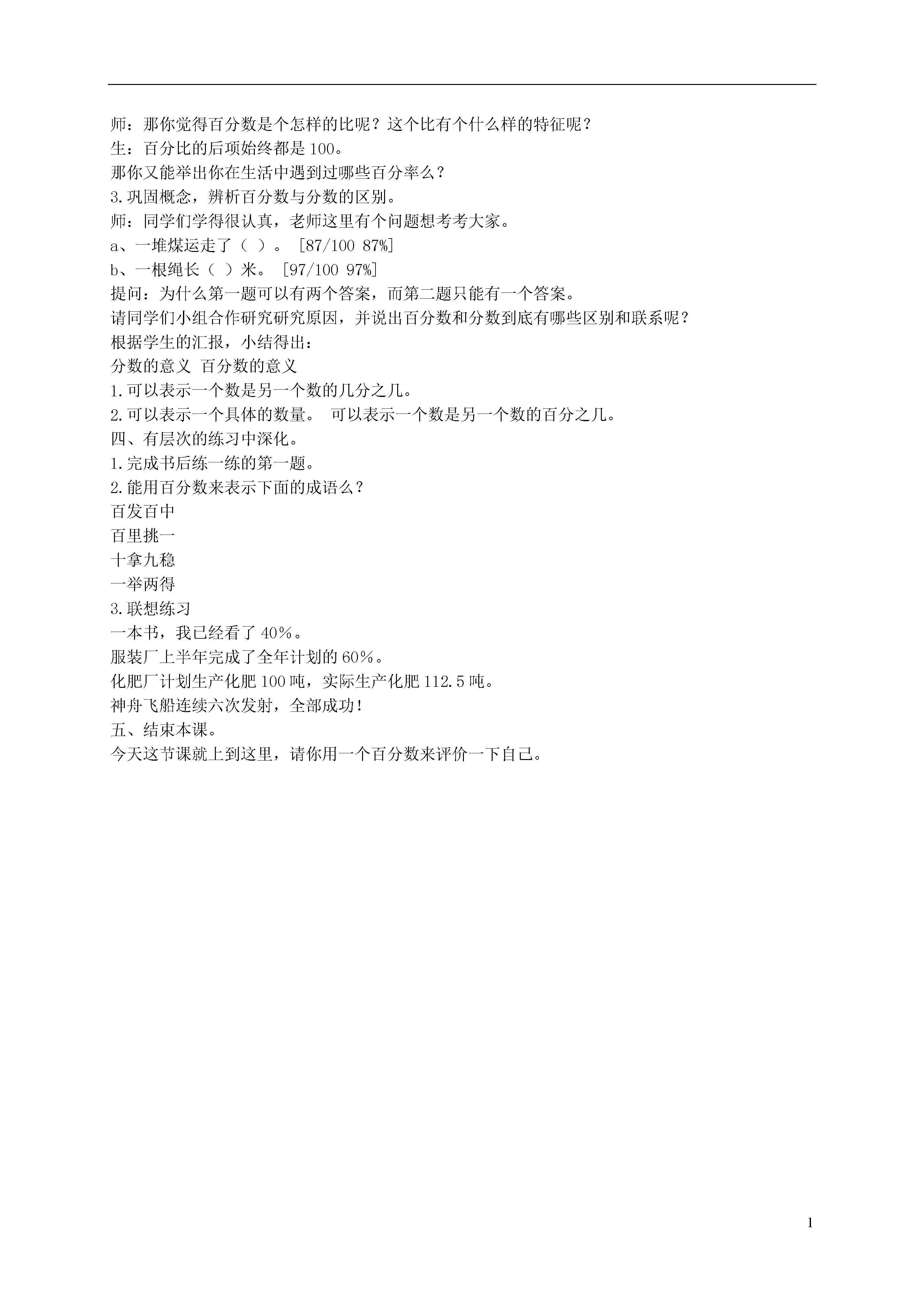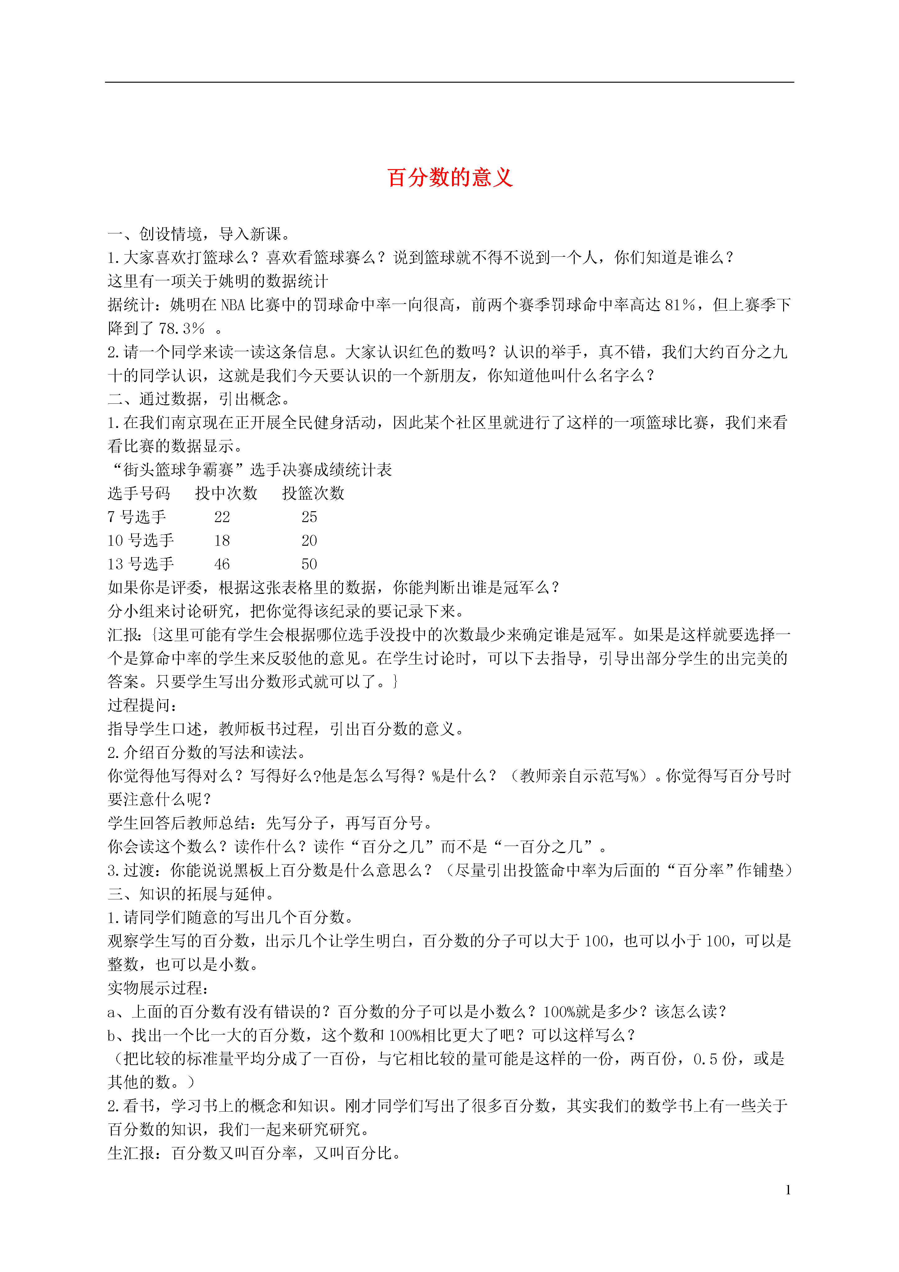 1百分数的意义一、创设情境,导入新课。1.大家喜欢打篮球么?喜欢看篮球赛么?说到篮球就不得不说到一个人,你们知道是谁么?这里有一项关于姚明的数据统计据统计:姚明在NBA比赛中的罚球命中率一向很高,前两个赛季罚球命中率高达81%,但上赛季下降到了78.3%。2.请一个同学来读一读这条信息。大家认识红色的数吗?认识的举手,真不错,我们大约百分之九十的同学认识,这就是我们今天要认识的一个新朋友,你知道他叫什么名字么?二、通过数据,引出概念。1.在我们南京现在正开展全民健身活动,因此某个社区里就进行了这样的一项篮球比赛,我们来看看比赛的数据显示。“街头篮球争霸赛”选手决赛成绩统计表选手号码投中次数投篮次数7号选手222510号选手182013号选手4650如果你是评委,根据这张表格里的数据,你能判断出谁是冠军么?分小组来讨论研究,把你觉得该纪录的要记录下来。汇报:{这里可能有学生会根据哪位选手没投中的次数最少来确定谁是冠军。如果是这样就要选择一个是算命中率的学生来反驳他的意见。在学生讨论时,可以下去指导,引导出部分学生的出完美的答案。只要学生写出分数形式就可以了。}过程提问:指导学生口述,教师板书过程,引出百分数的意义。2.介绍百分数的写法和读法。你觉得他写得对么?写得好么?他是怎么写得?%是什么?(教师亲自示范写%)。你觉得写百分号时要注意什么呢?学生回答后教师总结:先写分子,再写百分号。你会读这个数么?读作什么?读作“百分之几”而不是“一百分之几”。3.过渡:你能说说黑板上百分数是什么意思么?(尽量引出投篮命中率为后面的“百分率”作铺垫)三、知识的拓展与延伸。1.请同学们随意的写出几个百分数。观察学生写的百分数,出示几个让学生明白,百分数的分子可以大于100,也可以小于100,可以是整数,也可以是小数。实物展示过程:a、上面的百分数有没有错误的?百分数的分子可以是小数么?100%就是多少?该怎么读?b、找出一个比一大的百分数,这个数和100%相比更大了吧?可以这样写么?(把比较的标准量平均分成了一百份,与它相比较的量可能是这样的一份,两百份,0.5份,或是其他的数。)2.看书,学习书上的概念和知识。刚才同学们写出了很多百分数,其实我们的数学书上有一些关于百分数的知识,我们一起来研究研究。生汇报:百分数又叫百分率,又叫百分比。师:那你觉得百分数是个怎样的比呢?这个比有个什么样的特征呢?生:百分比的后项始终都是100。那你又能举出你在生活中遇到过哪些百分率么?3.巩固概念,辨析百分数与分数的区别。师:同学们学得很认真,老师这里有个问题想考考大家。a、一堆煤运走了()。[87/10087%]b、一根绳长()米。[97/10097%]提问:为什么第一题可以有两个答案,而第二题只能有一个答案。请同学们小组合作研究研究原因,并说出百分数和分数到底有哪些区别和联系呢?根据学生的汇报,小结得出:分数的意义百分数的意义1.可以表示一个数是另一个数的几分之几。2.可以表示一个具体的数量。可以表示一个数是另一个数的百分之几。四、有层次的练习中深化。1.完成书后练一练的第一题。2.能用百分数来表示下面的成语么?百发百中百里挑一十拿九稳一举两得3.联想练习一本书,我已经看了40%。服装厂上半年完成了全年计划的60%。化肥厂计划生产化肥100吨,实际生产化肥112.5吨。神舟飞船连续六次发射,全部成功!五、结束本课。今天这节课就上到这里,请你用一个百分数来评价一下自己。
