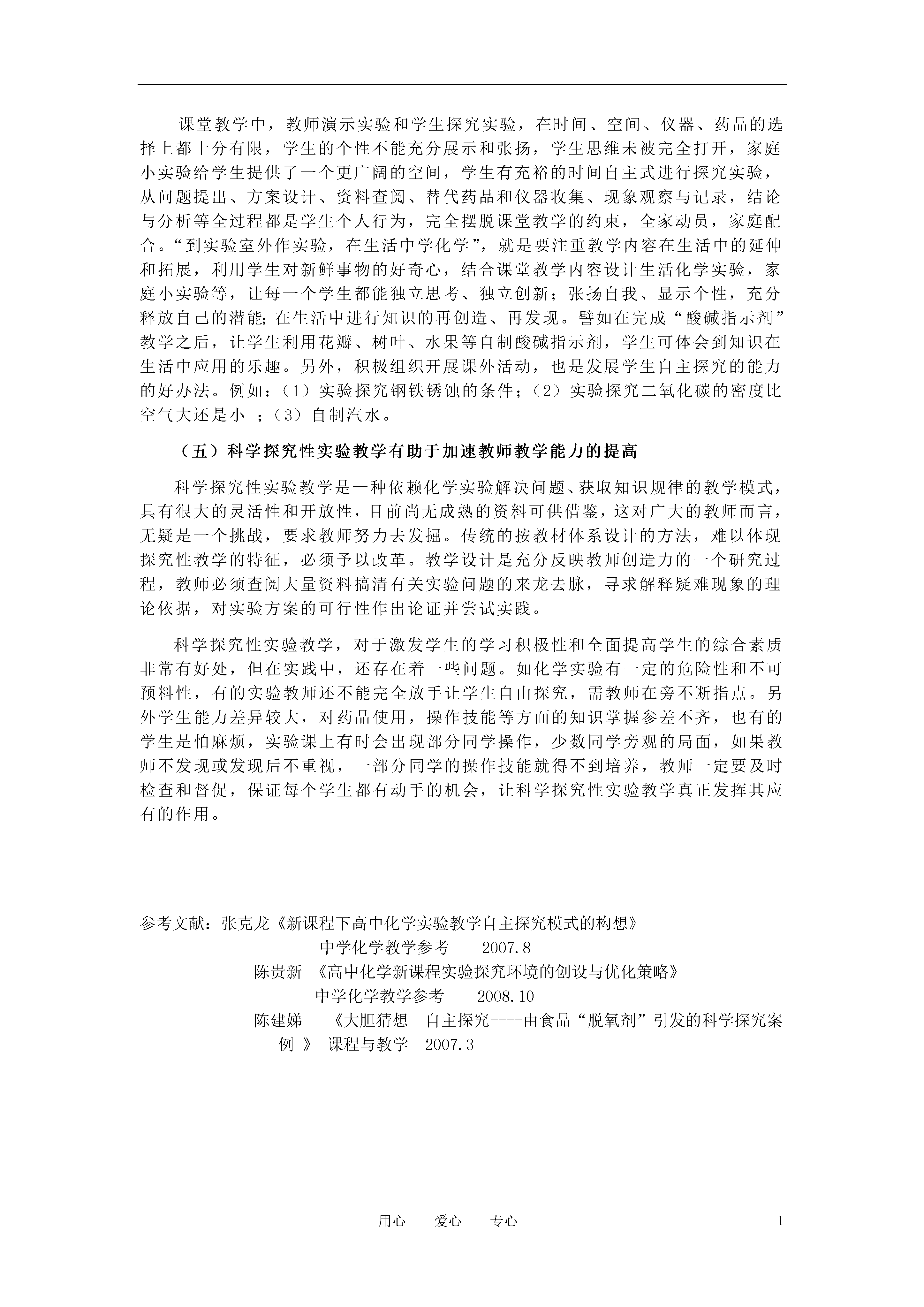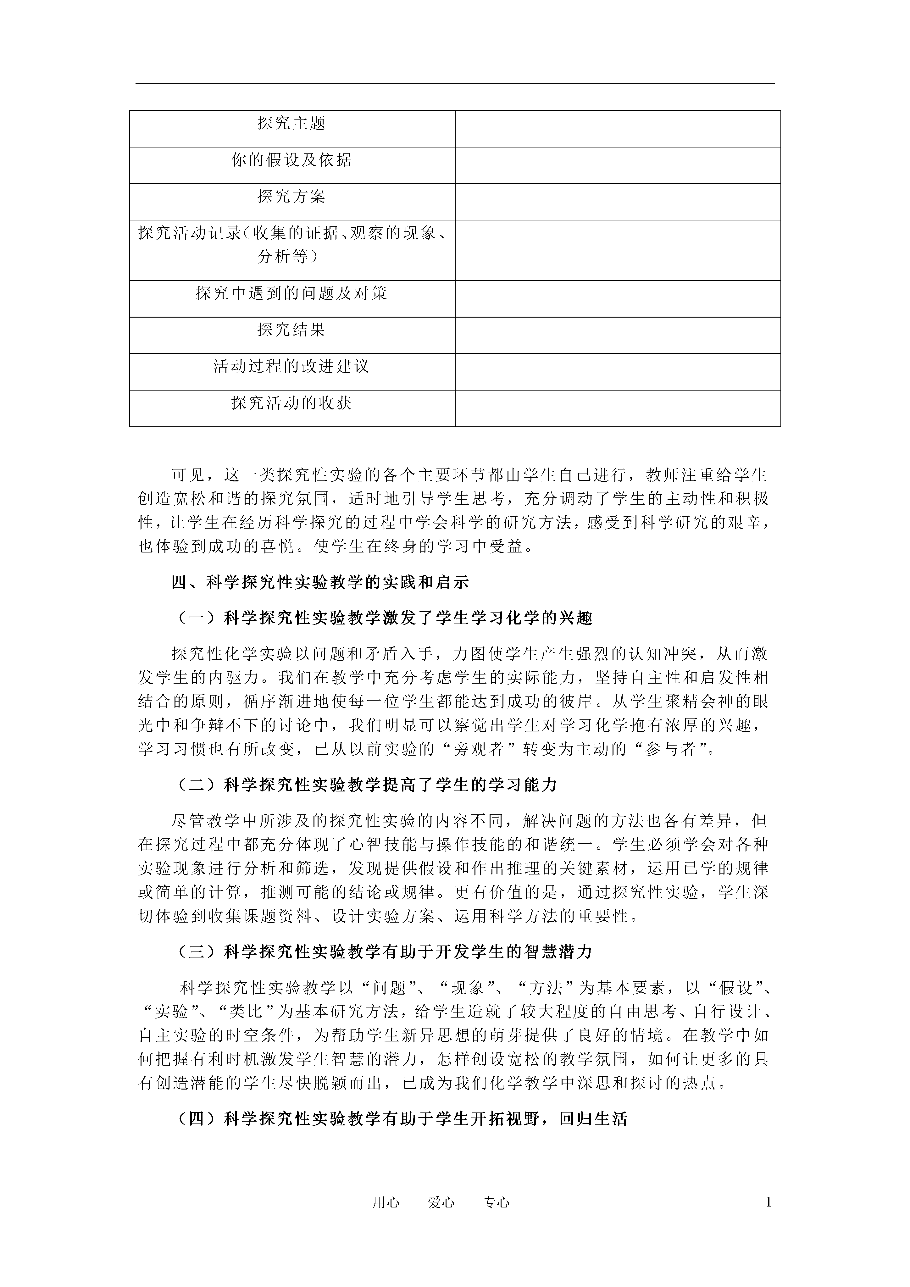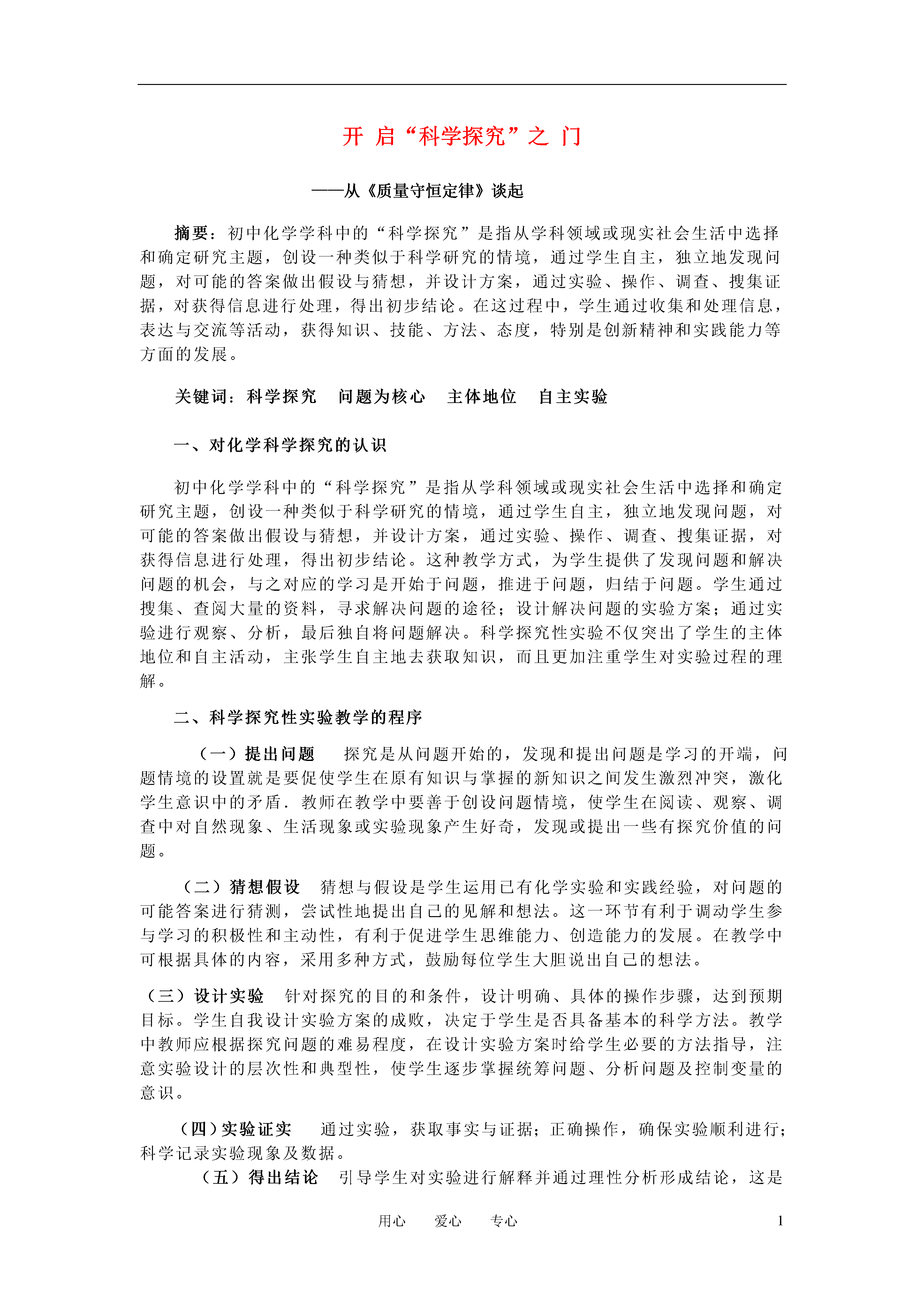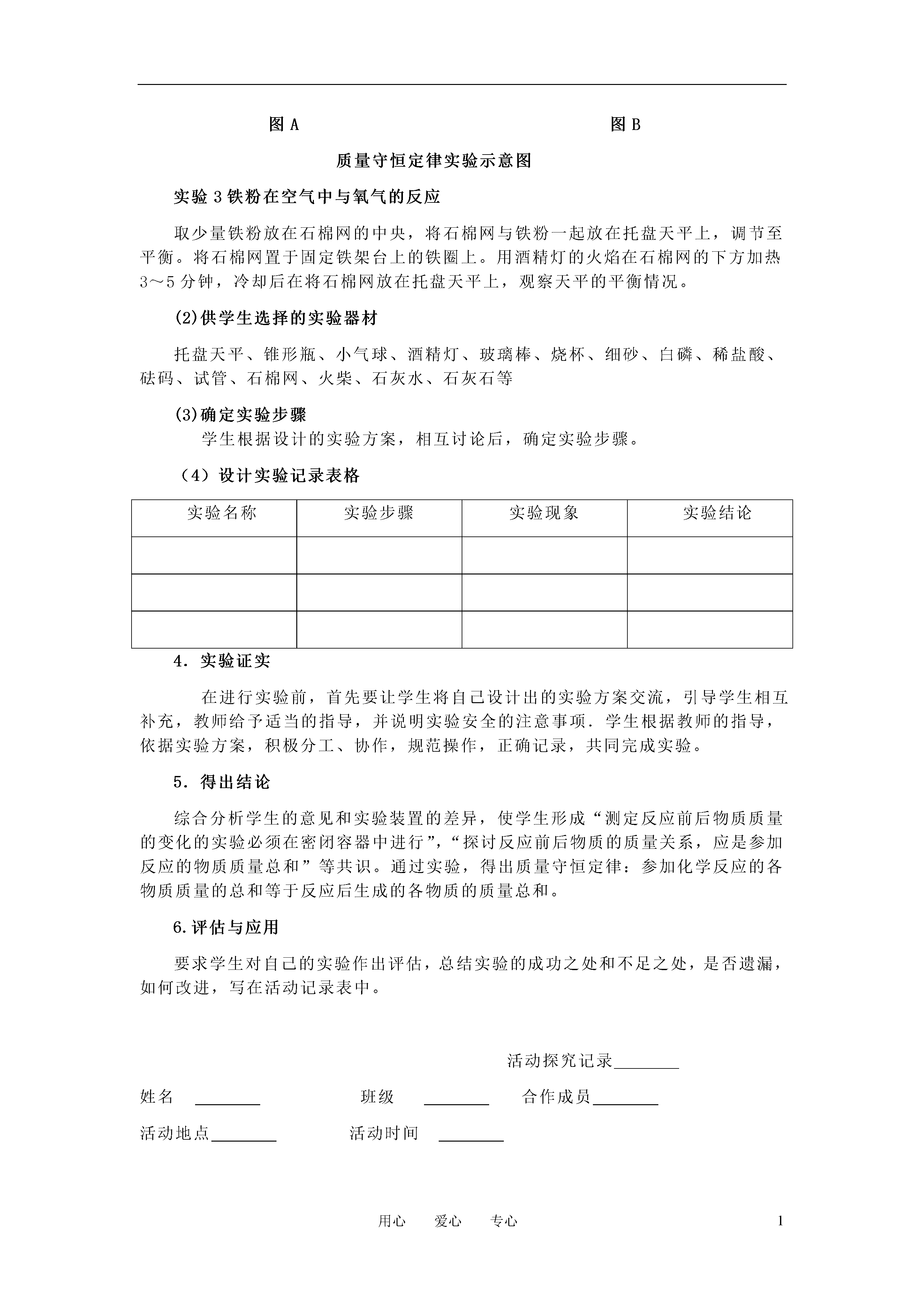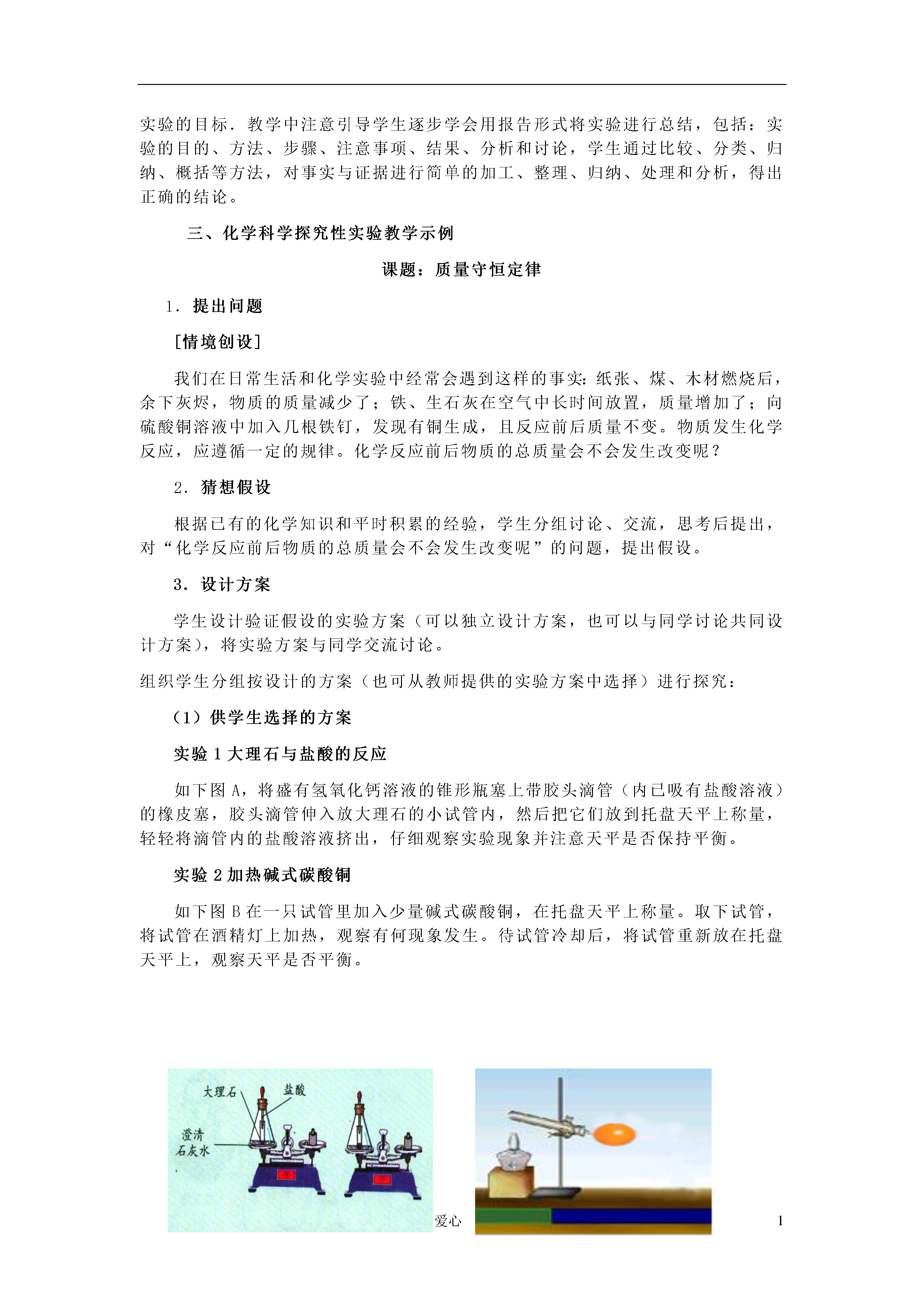 1用心爱心专心开启“科学探究”之门——从《质量守恒定律》谈起摘要:初中化学学科中的“科学探究”是指从学科领域或现实社会生活中选择和确定研究主题,创设一种类似于科学研究的情境,通过学生自主,独立地发现问题,对可能的答案做出假设与猜想,并设计方案,通过实验、操作、调查、搜集证据,对获得信息进行处理,得出初步结论。在这过程中,学生通过收集和处理信息,表达与交流等活动,获得知识、技能、方法、态度,特别是创新精神和实践能力等方面的发展。关键词:科学探究问题为核心主体地位自主实验一、对化学科学探究的认识初中化学学科中的“科学探究”是指从学科领域或现实社会生活中选择和确定研究主题,创设一种类似于科学研究的情境,通过学生自主,独立地发现问题,对可能的答案做出假设与猜想,并设计方案,通过实验、操作、调查、搜集证据,对获得信息进行处理,得出初步结论。这种教学方式,为学生提供了发现问题和解决问题的机会,与之对应的学习是开始于问题,推进于问题,归结于问题。学生通过搜集、查阅大量的资料,寻求解决问题的途径;设计解决问题的实验方案;通过实验进行观察、分析,最后独自将问题解决。科学探究性实验不仅突出了学生的主体地位和自主活动,主张学生自主地去获取知识,而且更加注重学生对实验过程的理解。二、科学探究性实验教学的程序(一)提出问题探究是从问题开始的,发现和提出问题是学习的开端,问题情境的设置就是要促使学生在原有知识与掌握的新知识之间发生激烈冲突,激化学生意识中的矛盾.教师在教学中要善于创设问题情境,使学生在阅读、观察、调查中对自然现象、生活现象或实验现象产生好奇,发现或提出一些有探究价值的问题。(二)猜想假设猜想与假设是学生运用已有化学实验和实践经验,对问题的可能答案进行猜测,尝试性地提出自己的见解和想法。这一环节有利于调动学生参与学习的积极性和主动性,有利于促进学生思维能力、创造能力的发展。在教学中可根据具体的内容,采用多种方式,鼓励每位学生大胆说出自己的想法。(三)设计实验针对探究的目的和条件,设计明确、具体的操作步骤,达到预期目标。学生自我设计实验方案的成败,决定于学生是否具备基本的科学方法。教学中教师应根据探究问题的难易程度,在设计实验方案时给学生必要的方法指导,注意实验设计的层次性和典型性,使学生逐步掌握统筹问题、分析问题及控制变量的意识。(四)实验证实通过实验,获取事实与证据;正确操作,确保实验顺利进行;科学记录实验现象及数据。(五)得出结论引导学生对实验进行解释并通过理性分析形成结论,这是实验的目标.教学中注意引导学生逐步学会用报告形式将实验进行总结,包括:实验的目的、方法、步骤、注意事项、结果、分析和讨论,学生通过比较、分类、归纳、概括等方法,对事实与证据进行简单的加工、整理、归纳、处理和分析,得出正确的结论。三、化学科学探究性实验教学示例课题:质量守恒定律1.提出问题[情境创设]我们在日常生活和化学实验中经常会遇到这样的事实:纸张、煤、木材燃烧后,余下灰烬,物质的质量减少了;铁、生石灰在空气中长时间放置,质量增加了;向硫酸铜溶液中加入几根铁钉,发现有铜生成,且反应前后质量不变。物质发生化学反应,应遵循一定的规律。化学反应前后物质的总质量会不会发生改变呢?2.猜想假设根据已有的化学知识和平时积累的经验,学生分组讨论、交流,思考后提出,对“化学反应前后物质的总质量会不会发生改变呢”的问题,提出假设。3.设计方案学生设计验证假设的实验方案(可以独立设计方案,也可以与同学讨论共同设计方案),将实验方案与同学交流讨论。组织学生分组按设计的方案(也可从教师提供的实验方案中选择)进行探究:(1)供学生选择的方案实验1大理石与盐酸的反应如下图A,将盛有氢氧化钙溶液的锥形瓶塞上带胶头滴管(内已吸有盐酸溶液)的橡皮塞,胶头滴管伸入放大理石的小试管内,然后把它们放到托盘天平上称量,轻轻将滴管内的盐酸溶液挤出,仔细观察实验现象并注意天平是否保持平衡。实验2加热碱式碳酸铜如下图B在一只试管里加入少量碱式碳酸铜,在托盘天平上称量。取下试管,将试管在酒精灯上加热,观察有何现象发生。待试管冷却后,将试管重新放在托盘天平上,观察天平是否平衡。图A图B质量守恒定律实验示意图实验3铁粉在空气中与氧气的反应取少量铁粉放在石棉网的中央,将石棉网与铁粉一起放在托盘天平上,调节至平衡。将石棉网置于固定铁架台上的铁圈上。用酒精灯的火焰在石棉网的下方加热3~5分钟,冷却后在将石棉网放在托盘天平上,观察天平的平衡情况。(2)供学生选择的实验器材托盘天平、锥形瓶、小气球、酒精灯、玻璃棒、烧杯、细砂、白磷、稀盐酸、砝码、试管、石棉网、火柴、石灰水、石灰石等(3)确定实验步骤学