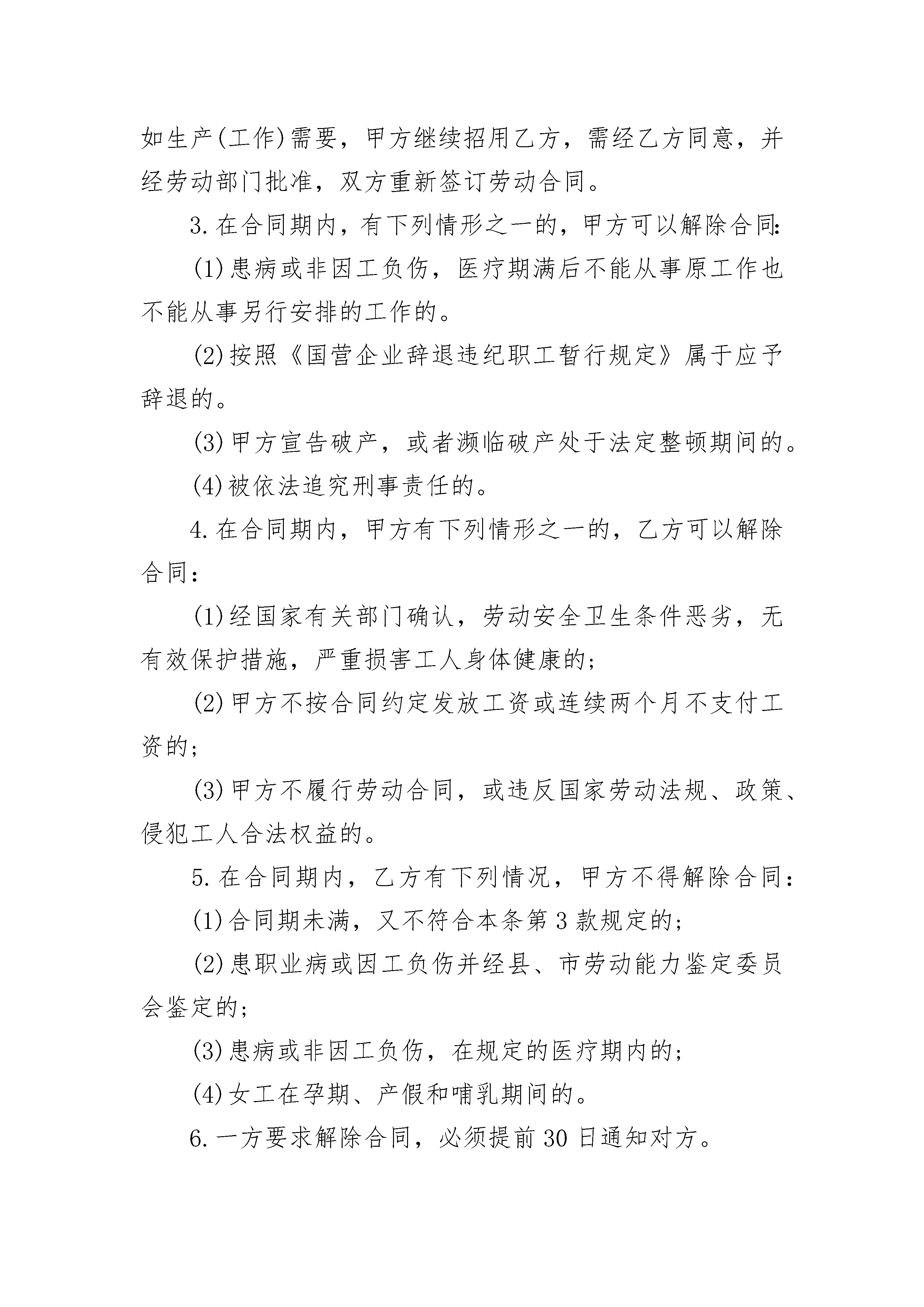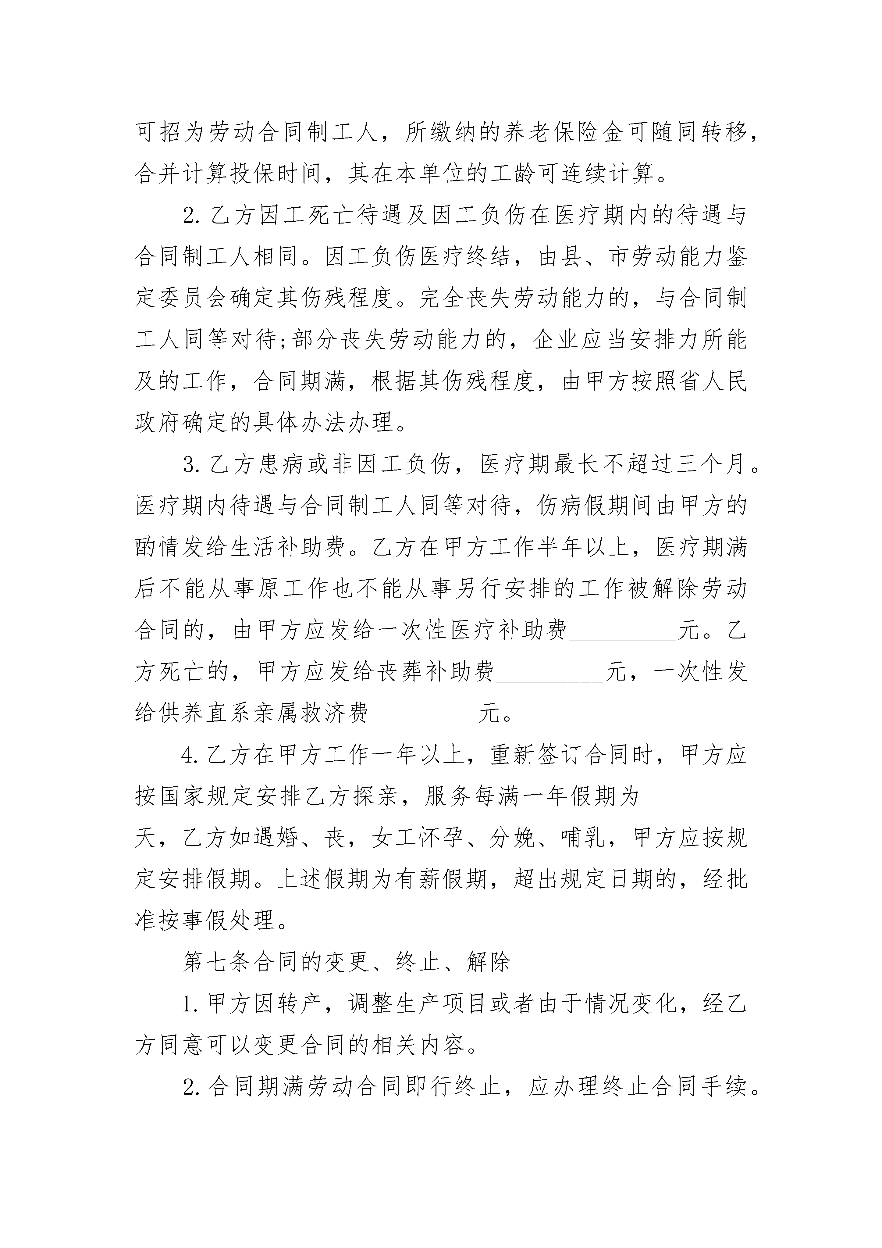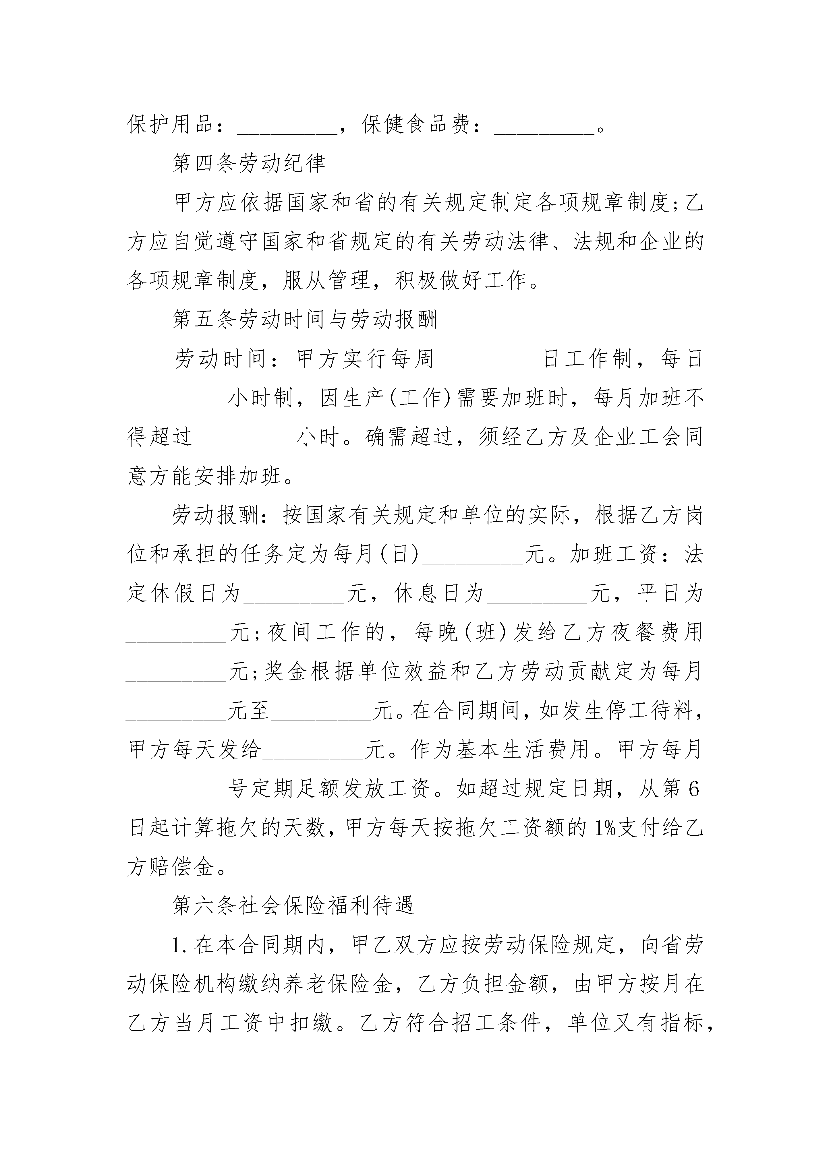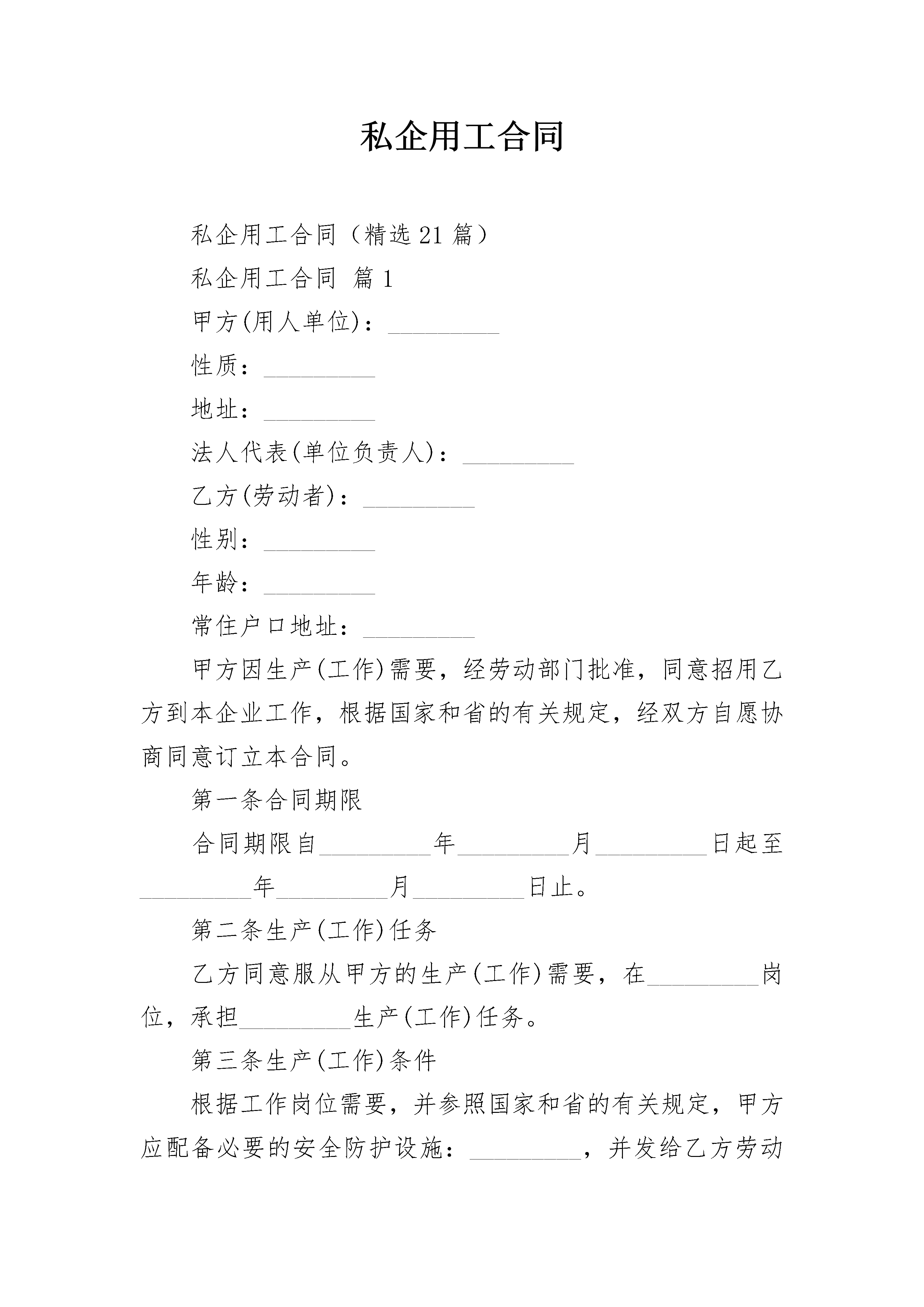 私企用工合同私企用工合同(精选21篇)私企用工合同篇1甲方(用人单位):_________性质:_________地址:_________法人代表(单位负责人):_________乙方(劳动者):_________性别:_________年龄:_________常住户口地址:_________甲方因生产(工作)需要,经劳动部门批准,同意招用乙方到本企业工作,根据国家和省的有关规定,经双方自愿协商同意订立本合同。第一条合同期限合同期限自_________年_________月_________日起至_________年_________月_________日止。第二条生产(工作)任务乙方同意服从甲方的生产(工作)需要,在_________岗位,承担_________生产(工作)任务。第三条生产(工作)条件根据工作岗位需要,并参照国家和省的有关规定,甲方应配备必要的安全防护设施:_________,并发给乙方劳动保护用品:_________,保健食品费:_________。第四条劳动纪律甲方应依据国家和省的有关规定制定各项规章制度;乙方应自觉遵守国家和省规定的有关劳动法律、法规和企业的各项规章制度,服从管理,积极做好工作。第五条劳动时间与劳动报酬劳动时间:甲方实行每周_________日工作制,每日_________小时制,因生产(工作)需要加班时,每月加班不得超过_________小时。确需超过,须经乙方及企业工会同意方能安排加班。劳动报酬:按国家有关规定和单位的实际,根据乙方岗位和承担的任务定为每月(日)_________元。加班工资:法定休假日为_________元,休息日为_________元,平日为_________元;夜间工作的,每晚(班)发给乙方夜餐费用_________元;奖金根据单位效益和乙方劳动贡献定为每月_________元至_________元。在合同期间,如发生停工待料,甲方每天发给_________元。作为基本生活费用。甲方每月_________号定期足额发放工资。如超过规定日期,从第6日起计算拖欠的天数,甲方每天按拖欠工资额的1%支付给乙方赔偿金。第六条社会保险福利待遇1.在本合同期内,甲乙双方应按劳动保险规定,向省劳动保险机构缴纳养老保险金,乙方负担金额,由甲方按月在乙方当月工资中扣缴。乙方符合招工条件,单位又有指标,可招为劳动合同制工人,所缴纳的养老保险金可随同转移,合并计算投保时间,其在本单位的工龄可连续计算。2.乙方因工死亡待遇及因工负伤在医疗期内的待遇与合同制工人相同。因工负伤医疗终结,由县、市劳动能力鉴定委员会确定其伤残程度。完全丧失劳动能力的,与合同制工人同等对待;部分丧失劳动能力的,企业应当安排力所能及的工作,合同期满,根据其伤残程度,由甲方按照省人民政府确定的具体办法办理。3.乙方患病或非因工负伤,医疗期最长不超过三个月。医疗期内待遇与合同制工人同等对待,伤病假期间由甲方的酌情发给生活补助费。乙方在甲方工作半年以上,医疗期满后不能从事原工作也不能从事另行安排的工作被解除劳动合同的,由甲方应发给一次性医疗补助费_________元。乙方死亡的,甲方应发给丧葬补助费_________元,一次性发给供养直系亲属救济费_________元。4.乙方在甲方工作一年以上,重新签订合同时,甲方应按国家规定安排乙方探亲,服务每满一年假期为_________天,乙方如遇婚、丧,女工怀孕、分娩、哺乳,甲方应按规定安排假期。上述假期为有薪假期,超出规定日期的,经批准按事假处理。第七条合同的变更、终止、解除1.甲方因转产,调整生产项目或者由于情况变化,经乙方同意可以变更合同的相关内容。2.合同期满劳动合同即行终止,应办理终止合同手续。如生产(工作)需要,甲方继续招用乙方,需经乙方同意,并经劳动部门批准,双方重新签订劳动合同。3.在合同期内,有下列情形之一的,甲方可以解除合同:(1)患病或非因工负伤,医疗期满后不能从事原工作也不能从事另行安排的工作的。(2)按照《国营企业辞退违纪职工暂行规定》属于应予辞退的。(3)甲方宣告破产,或者濒临破产处于法定整顿期间的。(4)被依法追究刑事责任的。4.在合同期内,甲方有下列情形之一的,乙方可以解除合同:(1)经国家有关部门确认,劳动安全卫生条件恶劣,无有效保护措施,严重损害工人身体健康的;(2)甲方不按合同约定发放工资或连续两个月不支付工资的;(3)甲方不履行劳动合同,或违反国家劳动法规、政策、侵犯工人合法权益的。5.在合同期内,乙方有下列情况,甲方不得解除合同:(1)合同期未满,又不符合本条第3款规定的;(2)患职业病或因工负伤并经县、市劳动能力鉴定委员会鉴定的;(3)患病或非因工负伤,在规定的医疗期内的;(4)女工在孕期、产假和哺乳期间的。6.一方要求解除合同,