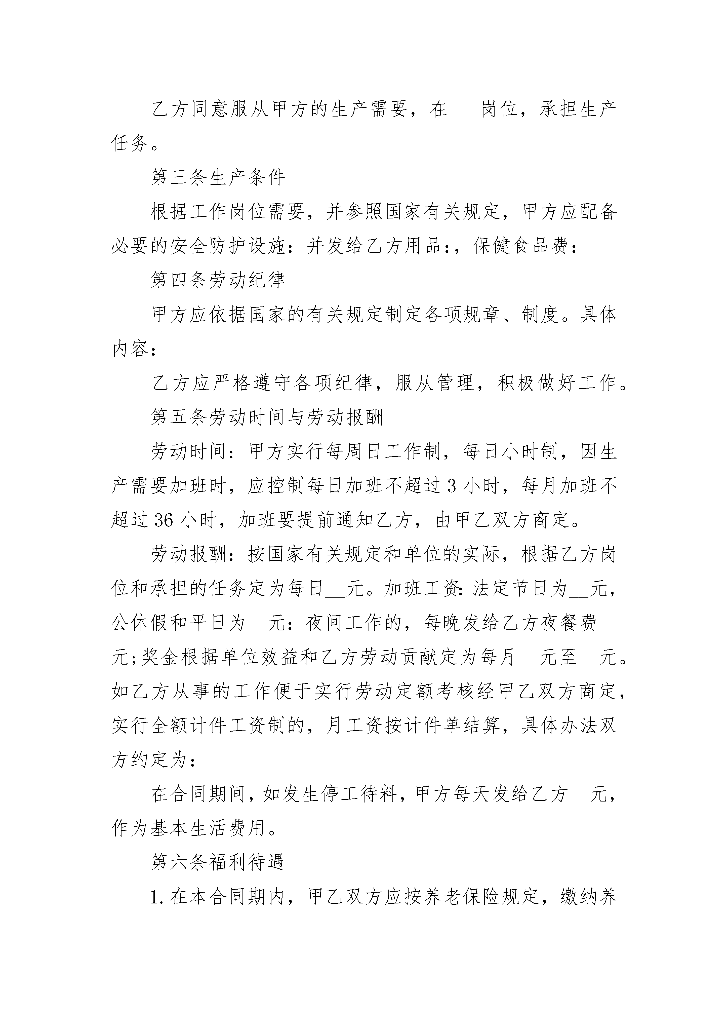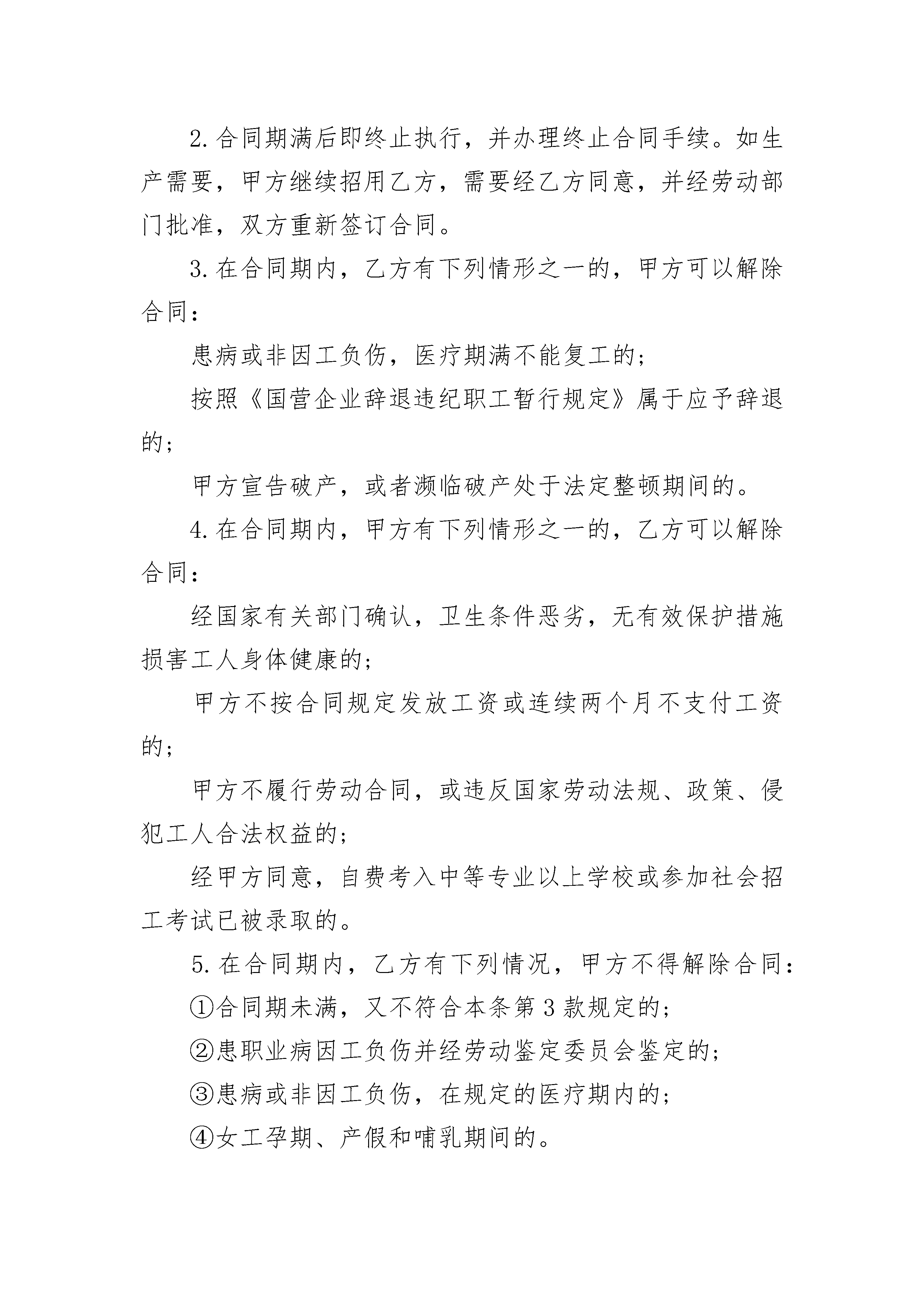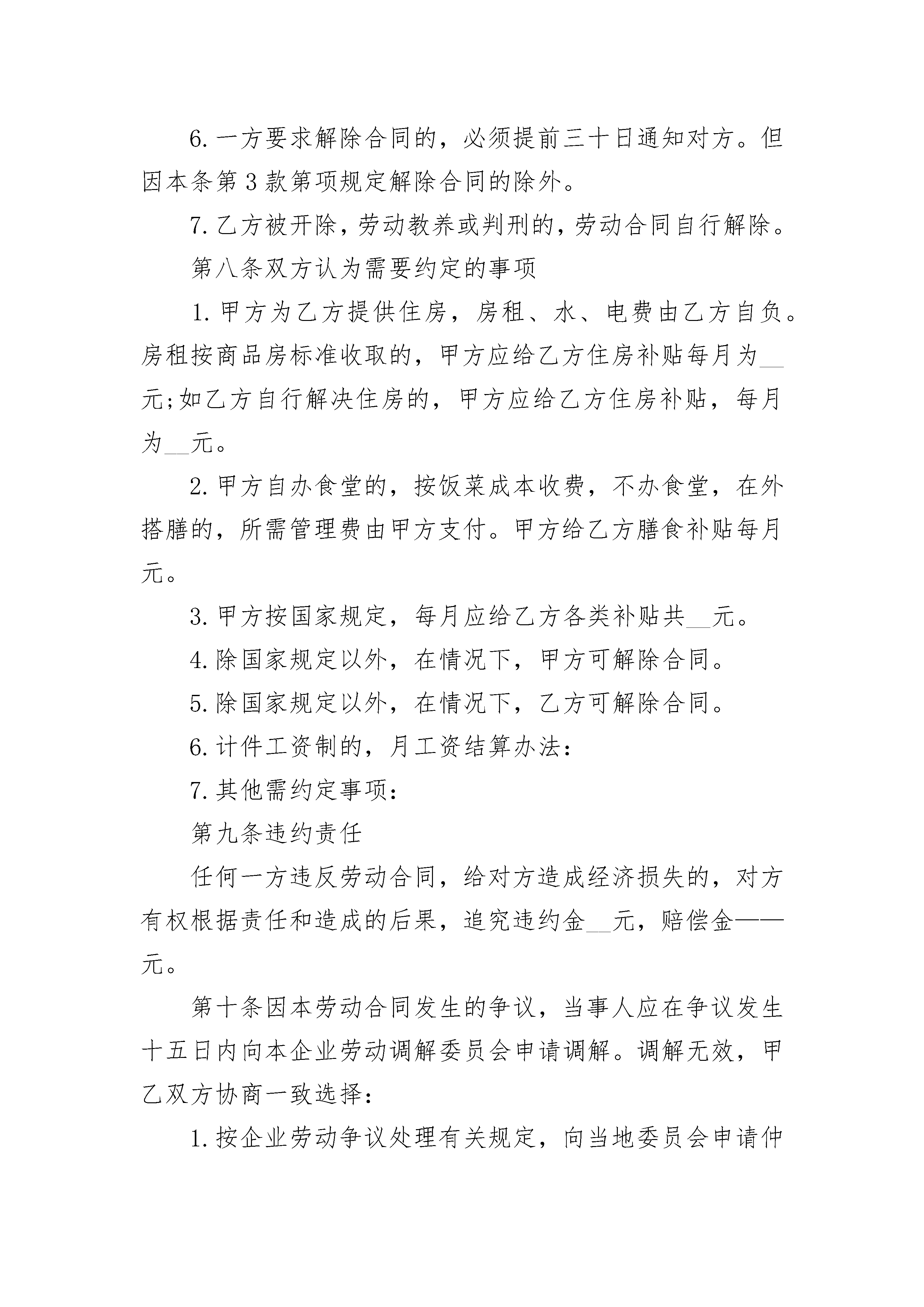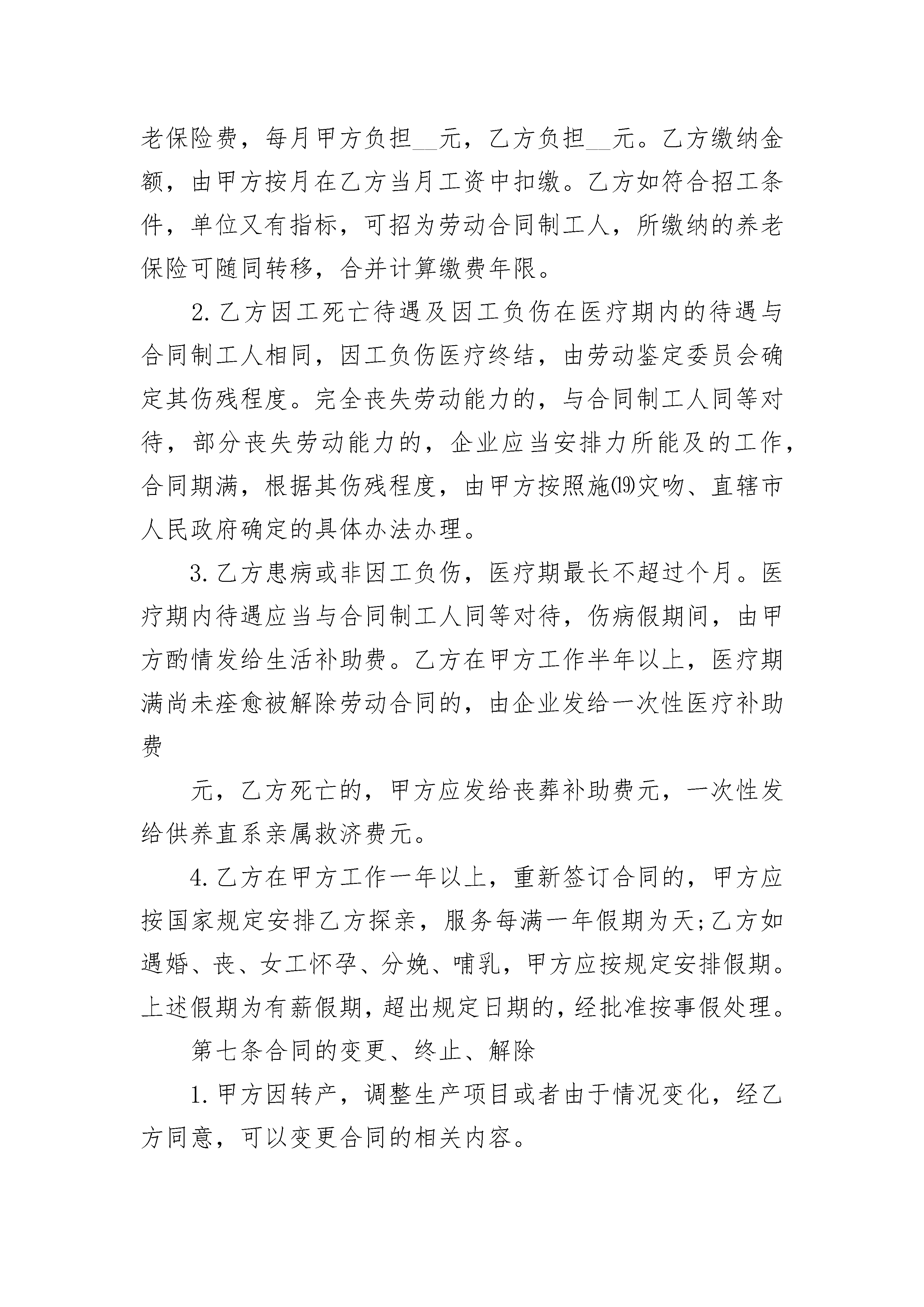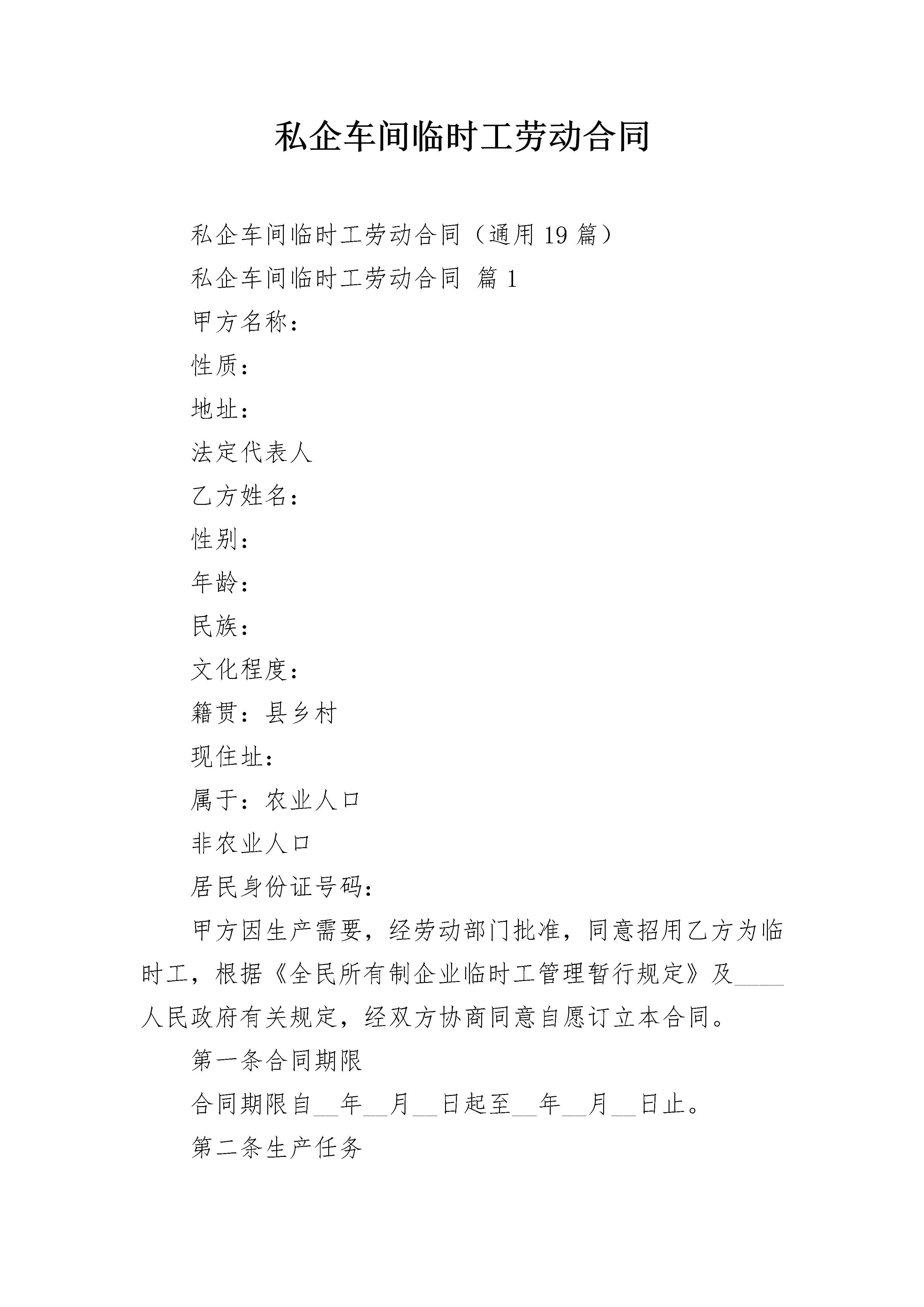 私企车间临时工劳动合同私企车间临时工劳动合同(通用19篇)私企车间临时工劳动合同篇1甲方名称:性质:地址:法定代表人乙方姓名:性别:年龄:民族:文化程度:籍贯:县乡村现住址:属于:农业人口非农业人口居民身份证号码:甲方因生产需要,经劳动部门批准,同意招用乙方为临时工,根据《全民所有制企业临时工管理暂行规定》及____人民政府有关规定,经双方协商同意自愿订立本合同。第一条合同期限合同期限自__年__月__日起至__年__月__日止。第二条生产任务乙方同意服从甲方的生产需要,在___岗位,承担生产任务。第三条生产条件根据工作岗位需要,并参照国家有关规定,甲方应配备必要的安全防护设施:并发给乙方用品:,保健食品费:第四条劳动纪律甲方应依据国家的有关规定制定各项规章、制度。具体内容:乙方应严格遵守各项纪律,服从管理,积极做好工作。第五条劳动时间与劳动报酬劳动时间:甲方实行每周日工作制,每日小时制,因生产需要加班时,应控制每日加班不超过3小时,每月加班不超过36小时,加班要提前通知乙方,由甲乙双方商定。劳动报酬:按国家有关规定和单位的实际,根据乙方岗位和承担的任务定为每日__元。加班工资:法定节日为__元,公休假和平日为__元:夜间工作的,每晚发给乙方夜餐费__元;奖金根据单位效益和乙方劳动贡献定为每月__元至__元。如乙方从事的工作便于实行劳动定额考核经甲乙双方商定,实行全额计件工资制的,月工资按计件单结算,具体办法双方约定为:在合同期间,如发生停工待料,甲方每天发给乙方__元,作为基本生活费用。第六条福利待遇1.在本合同期内,甲乙双方应按养老保险规定,缴纳养老保险费,每月甲方负担__元,乙方负担__元。乙方缴纳金额,由甲方按月在乙方当月工资中扣缴。乙方如符合招工条件,单位又有指标,可招为劳动合同制工人,所缴纳的养老保险可随同转移,合并计算缴费年限。2.乙方因工死亡待遇及因工负伤在医疗期内的待遇与合同制工人相同,因工负伤医疗终结,由劳动鉴定委员会确定其伤残程度。完全丧失劳动能力的,与合同制工人同等对待,部分丧失劳动能力的,企业应当安排力所能及的工作,合同期满,根据其伤残程度,由甲方按照施⒆灾吻、直辖市人民政府确定的具体办法办理。3.乙方患病或非因工负伤,医疗期最长不超过个月。医疗期内待遇应当与合同制工人同等对待,伤病假期间,由甲方酌情发给生活补助费。乙方在甲方工作半年以上,医疗期满尚未痊愈被解除劳动合同的,由企业发给一次性医疗补助费元,乙方死亡的,甲方应发给丧葬补助费元,一次性发给供养直系亲属救济费元。4.乙方在甲方工作一年以上,重新签订合同的,甲方应按国家规定安排乙方探亲,服务每满一年假期为天;乙方如遇婚、丧、女工怀孕、分娩、哺乳,甲方应按规定安排假期。上述假期为有薪假期,超出规定日期的,经批准按事假处理。第七条合同的变更、终止、解除1.甲方因转产,调整生产项目或者由于情况变化,经乙方同意,可以变更合同的相关内容。2.合同期满后即终止执行,并办理终止合同手续。如生产需要,甲方继续招用乙方,需要经乙方同意,并经劳动部门批准,双方重新签订合同。3.在合同期内,乙方有下列情形之一的,甲方可以解除合同:患病或非因工负伤,医疗期满不能复工的;按照《国营企业辞退违纪职工暂行规定》属于应予辞退的;甲方宣告破产,或者濒临破产处于法定整顿期间的。4.在合同期内,甲方有下列情形之一的,乙方可以解除合同:经国家有关部门确认,卫生条件恶劣,无有效保护措施损害工人身体健康的;甲方不按合同规定发放工资或连续两个月不支付工资的;甲方不履行劳动合同,或违反国家劳动法规、政策、侵犯工人合法权益的;经甲方同意,自费考入中等专业以上学校或参加社会招工考试已被录取的。5.在合同期内,乙方有下列情况,甲方不得解除合同:①合同期未满,又不符合本条第3款规定的;②患职业病因工负伤并经劳动鉴定委员会鉴定的;③患病或非因工负伤,在规定的医疗期内的;④女工孕期、产假和哺乳期间的。6.一方要求解除合同的,必须提前三十日通知对方。但因本条第3款第项规定解除合同的除外。7.乙方被开除,劳动教养或判刑的,劳动合同自行解除。第八条双方认为需要约定的事项1.甲方为乙方提供住房,房租、水、电费由乙方自负。房租按商品房标准收取的,甲方应给乙方住房补贴每月为__元;如乙方自行解决住房的,甲方应给乙方住房补贴,每月为__元。2.甲方自办食堂的,按饭菜成本收费,不办食堂,在外搭膳的,所需管理费由甲方支付。甲方给乙方膳食补贴每月元。3.甲方按国家规定,每月应给乙方各类补贴共__元。4.除国家规定以外,在情况下,甲方可解除合同。5.除国家规定以外,在情况下,乙方可解除合同。6.计件工资制的,月工资结算办法:7.其他需约定事项:第九条违约责任任何一方违反劳动合同,给对方造成经济损失的,对方有权根据责任和造成