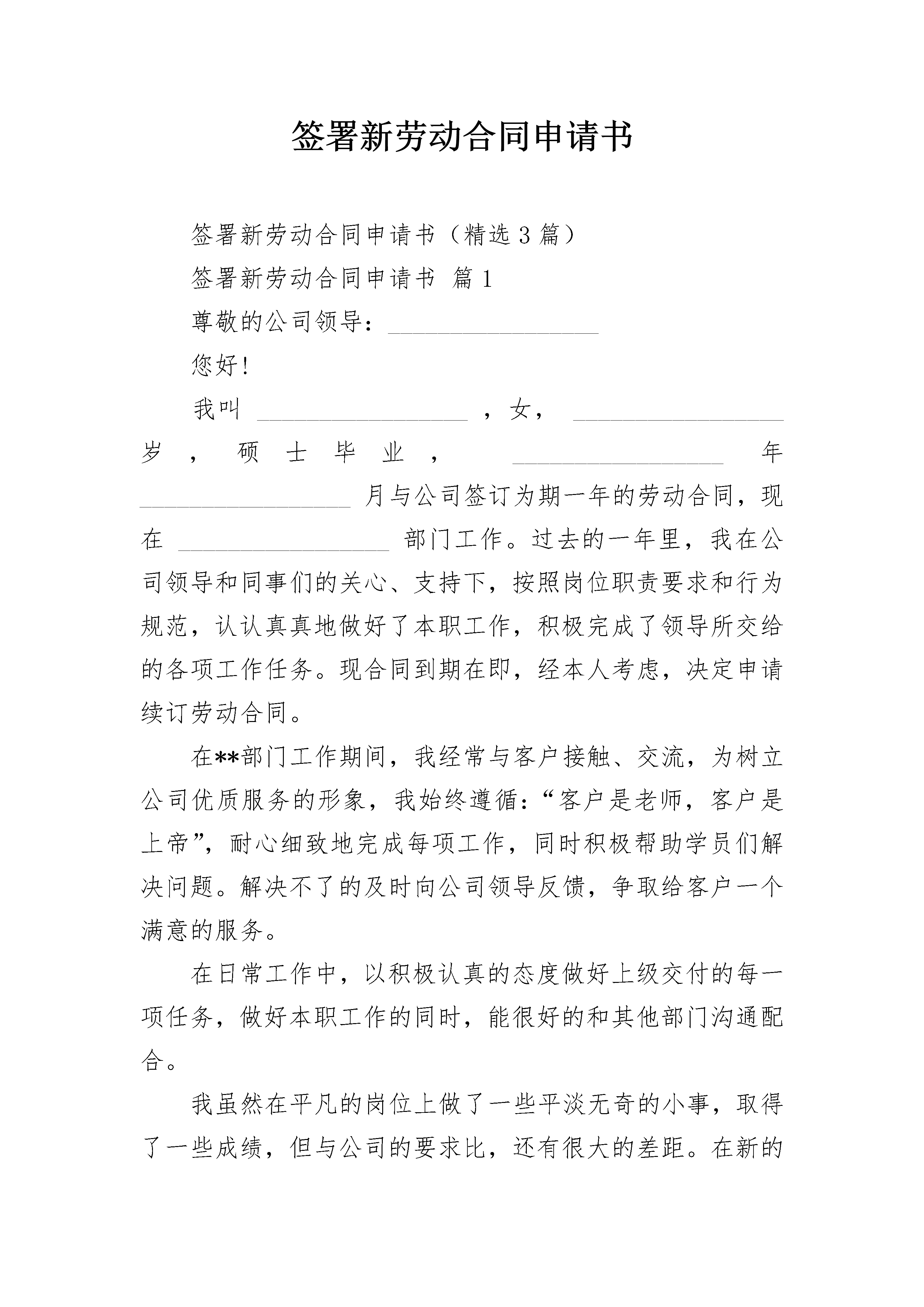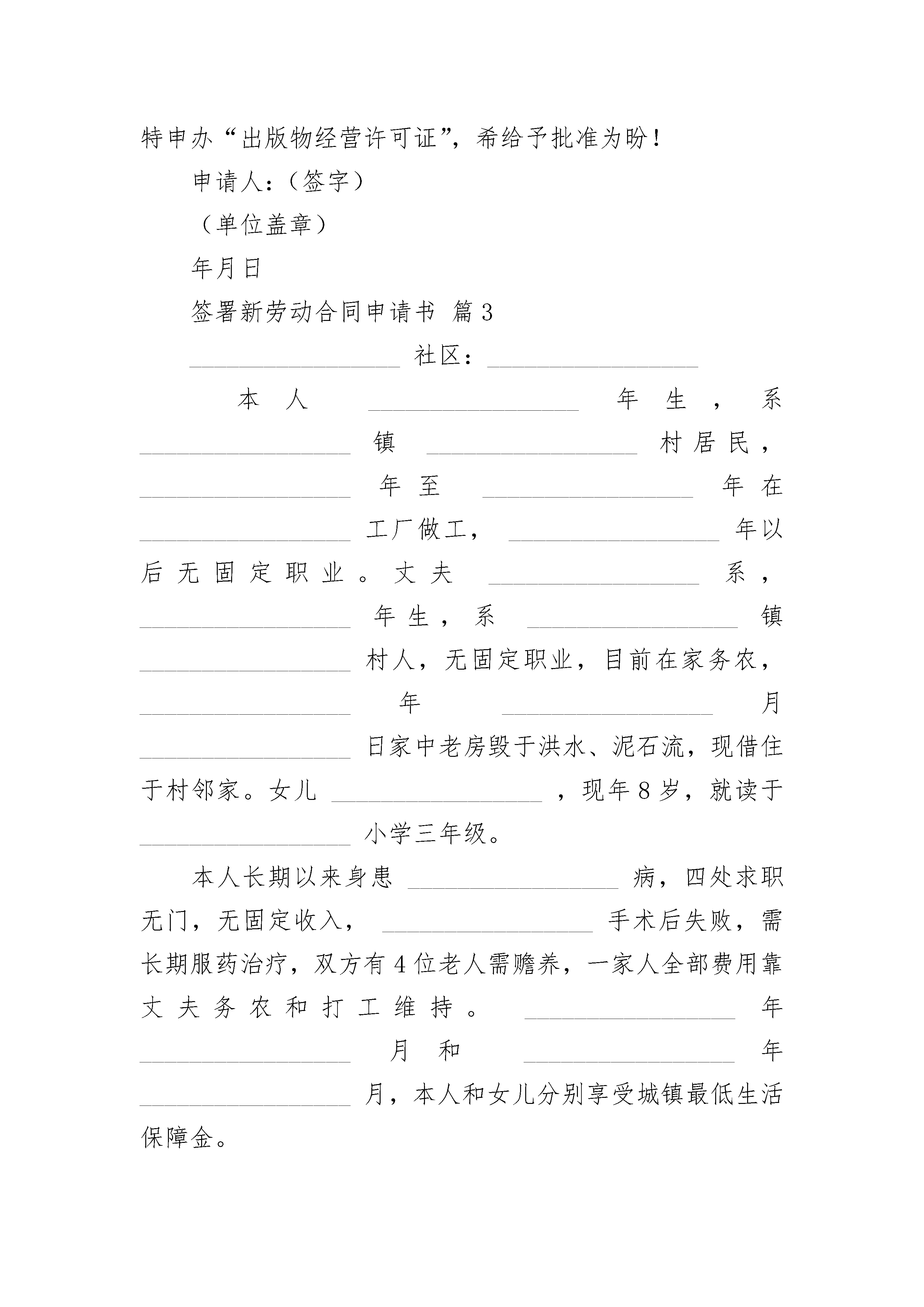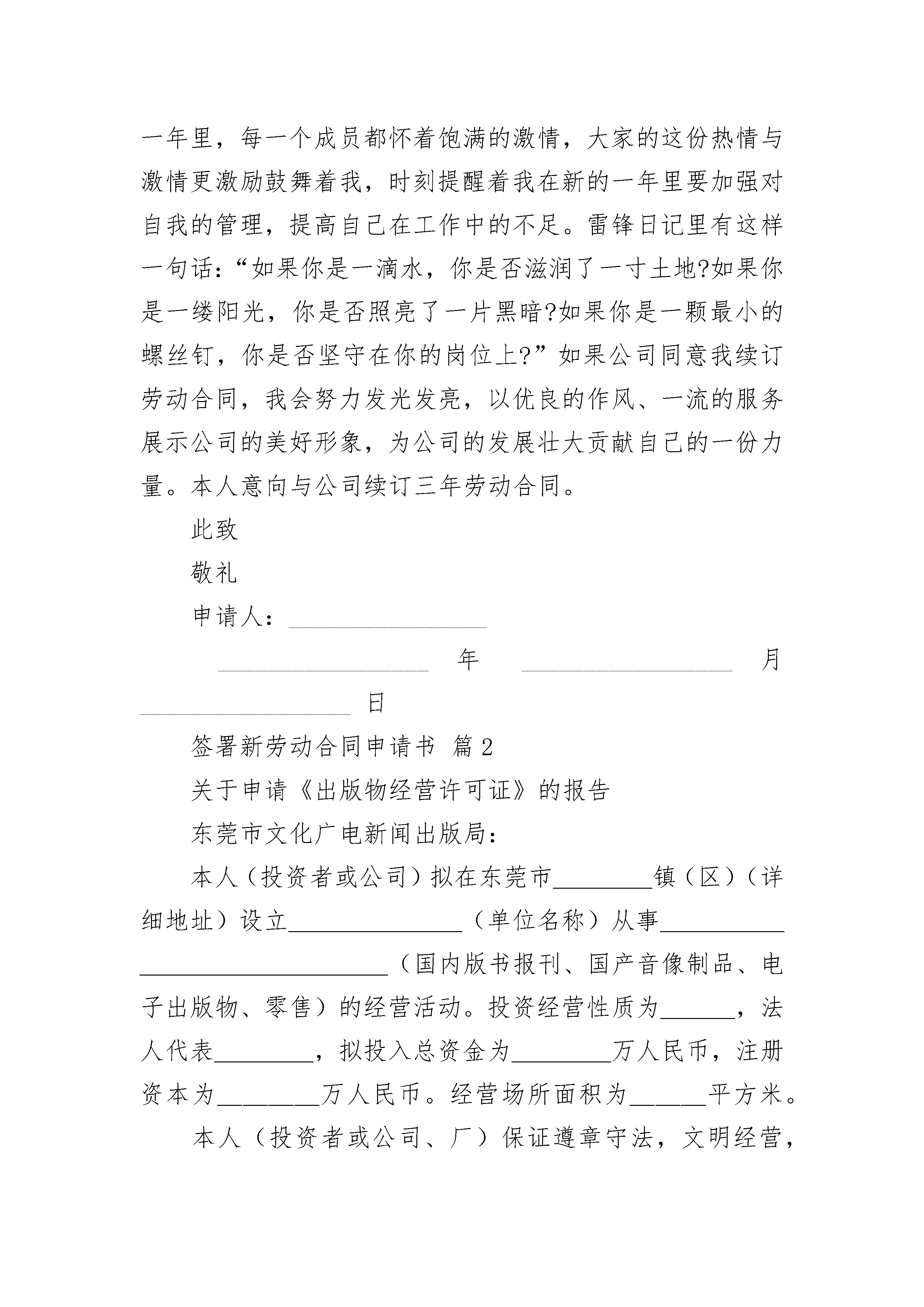 签署新劳动合同申请书签署新劳动合同申请书(精选3篇)签署新劳动合同申请书篇1尊敬的公司领导:_________________您好!我叫_________________,女,_________________岁,硕士毕业,_________________年_________________月与公司签订为期一年的劳动合同,现在_________________部门工作。过去的一年里,我在公司领导和同事们的关心、支持下,按照岗位职责要求和行为规范,认认真真地做好了本职工作,积极完成了领导所交给的各项工作任务。现合同到期在即,经本人考虑,决定申请续订劳动合同。在**部门工作期间,我经常与客户接触、交流,为树立公司优质服务的形象,我始终遵循:“客户是老师,客户是上帝”,耐心细致地完成每项工作,同时积极帮助学员们解决问题。解决不了的及时向公司领导反馈,争取给客户一个满意的服务。在日常工作中,以积极认真的态度做好上级交付的每一项任务,做好本职工作的同时,能很好的和其他部门沟通配合。我虽然在平凡的岗位上做了一些平淡无奇的小事,取得了一些成绩,但与公司的要求比,还有很大的差距。在新的一年里,每一个成员都怀着饱满的激情,大家的这份热情与激情更激励鼓舞着我,时刻提醒着我在新的一年里要加强对自我的管理,提高自己在工作中的不足。雷锋日记里有这样一句话:“如果你是一滴水,你是否滋润了一寸土地?如果你是一缕阳光,你是否照亮了一片黑暗?如果你是一颗最小的螺丝钉,你是否坚守在你的岗位上?”如果公司同意我续订劳动合同,我会努力发光发亮,以优良的作风、一流的服务展示公司的美好形象,为公司的发展壮大贡献自己的一份力量。本人意向与公司续订三年劳动合同。此致敬礼申请人:_________________________________年_________________月_________________日签署新劳动合同申请书篇2关于申请《出版物经营许可证》的报告东莞市文化广电新闻出版局:本人(投资者或公司)拟在东莞市____镇(区)(详细地址)设立_______(单位名称)从事_______________(国内版书报刊、国产音像制品、电子出版物、零售)的经营活动。投资经营性质为___,法人代表____,拟投入总资金为____万人民币,注册资本为____万人民币。经营场所面积为___平方米。本人(投资者或公司、厂)保证遵章守法,文明经营,特申办“出版物经营许可证”,希给予批准为昐!申请人:(签字)(单位盖章)年月日签署新劳动合同申请书篇3_________________社区:_________________本人_________________年生,系_________________镇_________________村居民,_________________年至_________________年在_________________工厂做工,_________________年以后无固定职业。丈夫_________________系,_________________年生,系_________________镇_________________村人,无固定职业,目前在家务农,_________________年_________________月_________________日家中老房毁于洪水、泥石流,现借住于村邻家。女儿_________________,现年8岁,就读于_________________小学三年级。本人长期以来身患_________________病,四处求职无门,无固定收入,_________________手术后失败,需长期服药治疗,双方有4位老人需赡养,一家人全部费用靠丈夫务农和打工维持。_________________年_________________月和_________________年_________________月,本人和女儿分别享受城镇最低生活保障金。本人和丈夫1999年结婚至今一向居无定所,为了生活,在县城四处奔波,租房居住,且夫妻长期两地分居,由于本人家庭生活的实际困难和无住房的实际状况,现申请政府廉租住房一套,望给予批准为盼!申请人:__________________________________年_________________月_________________日