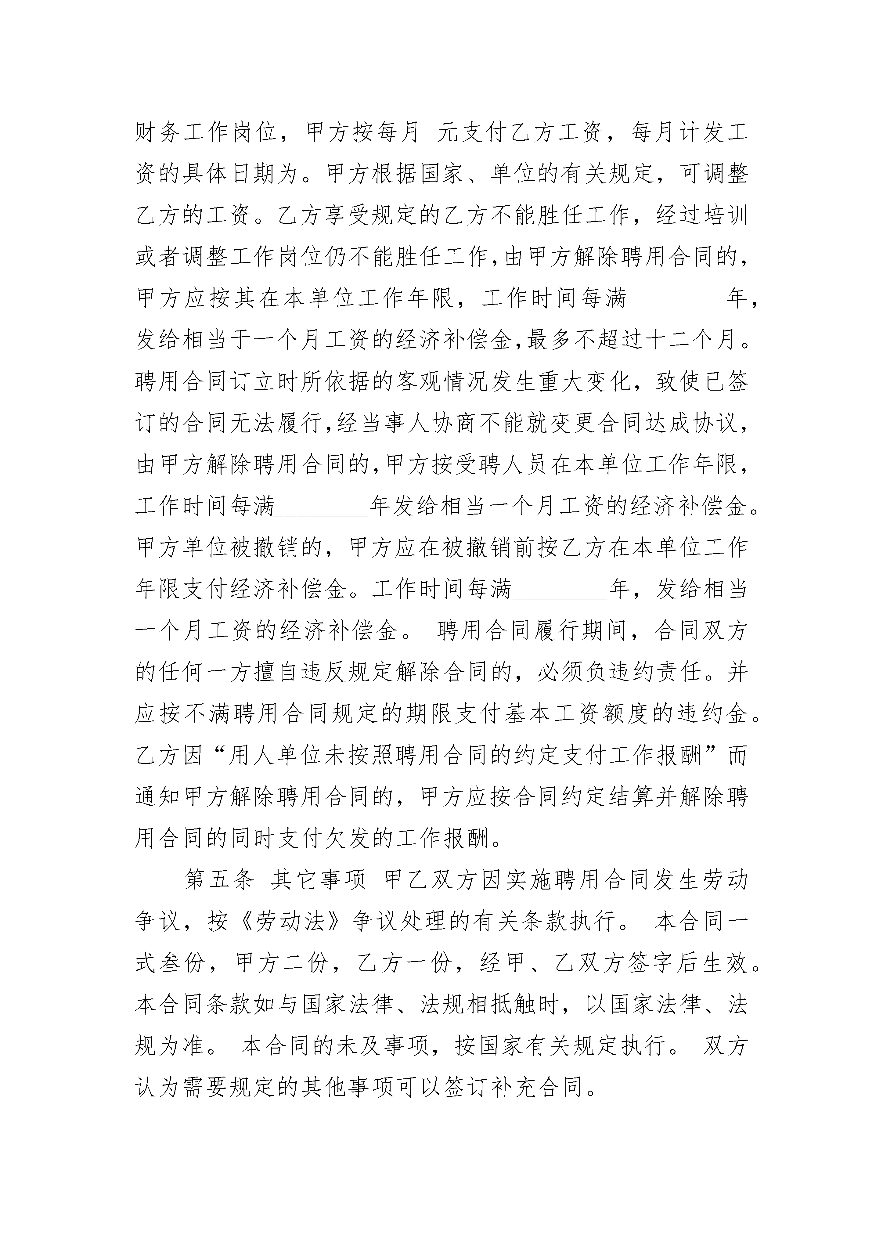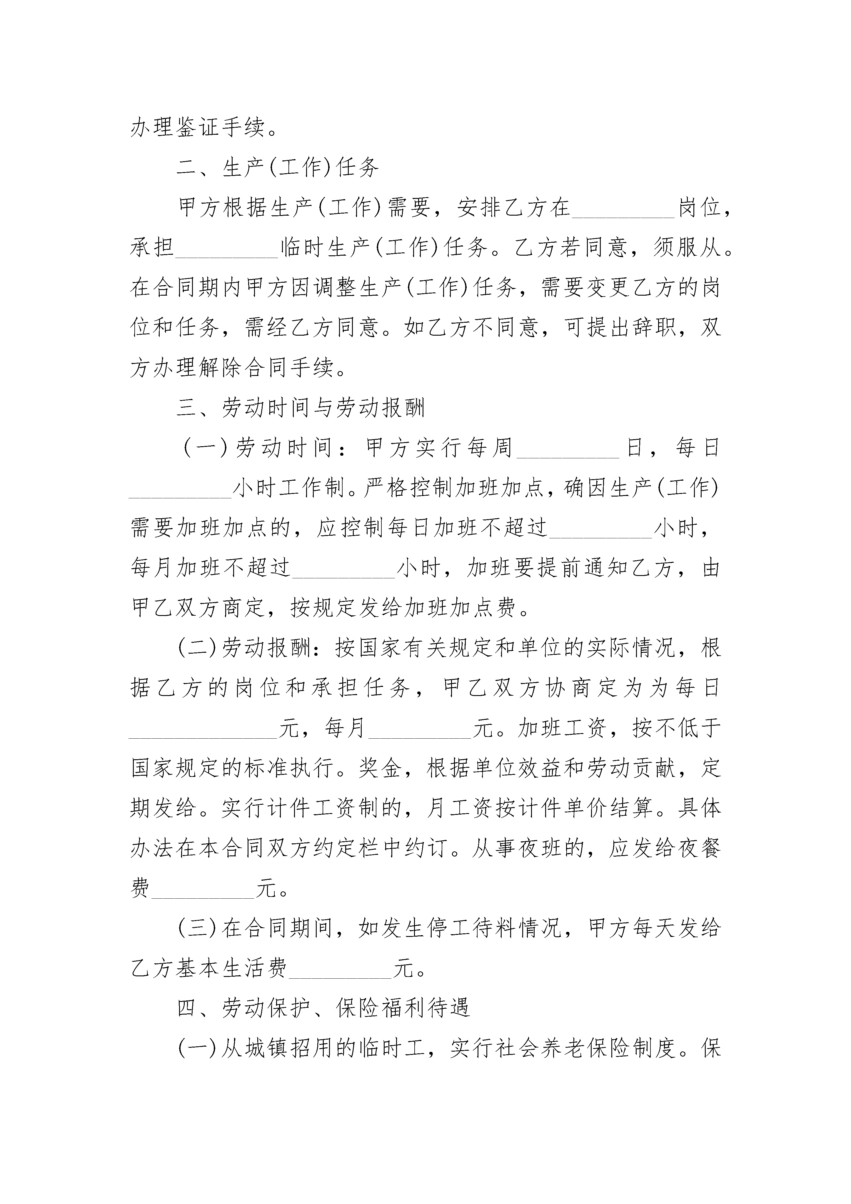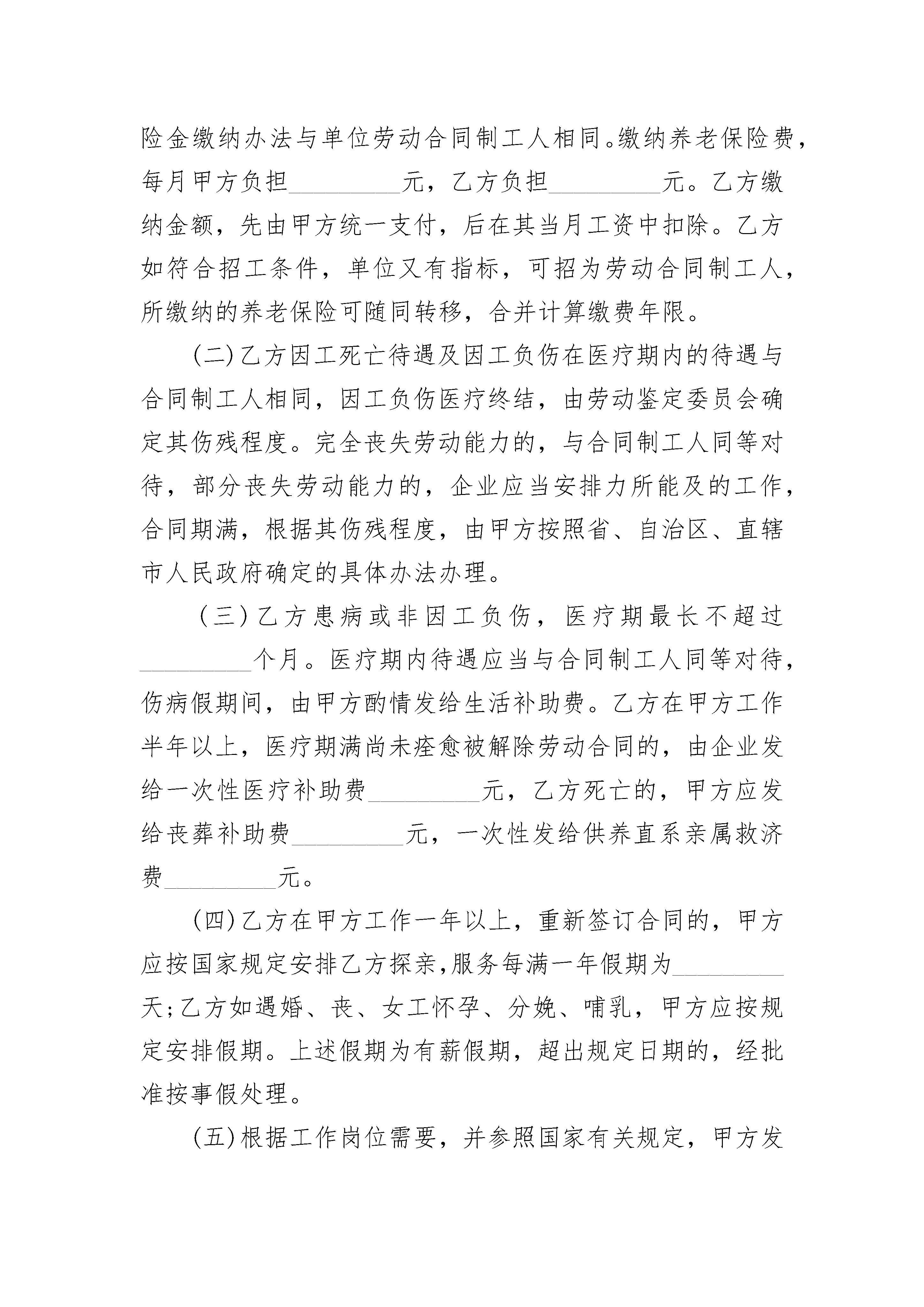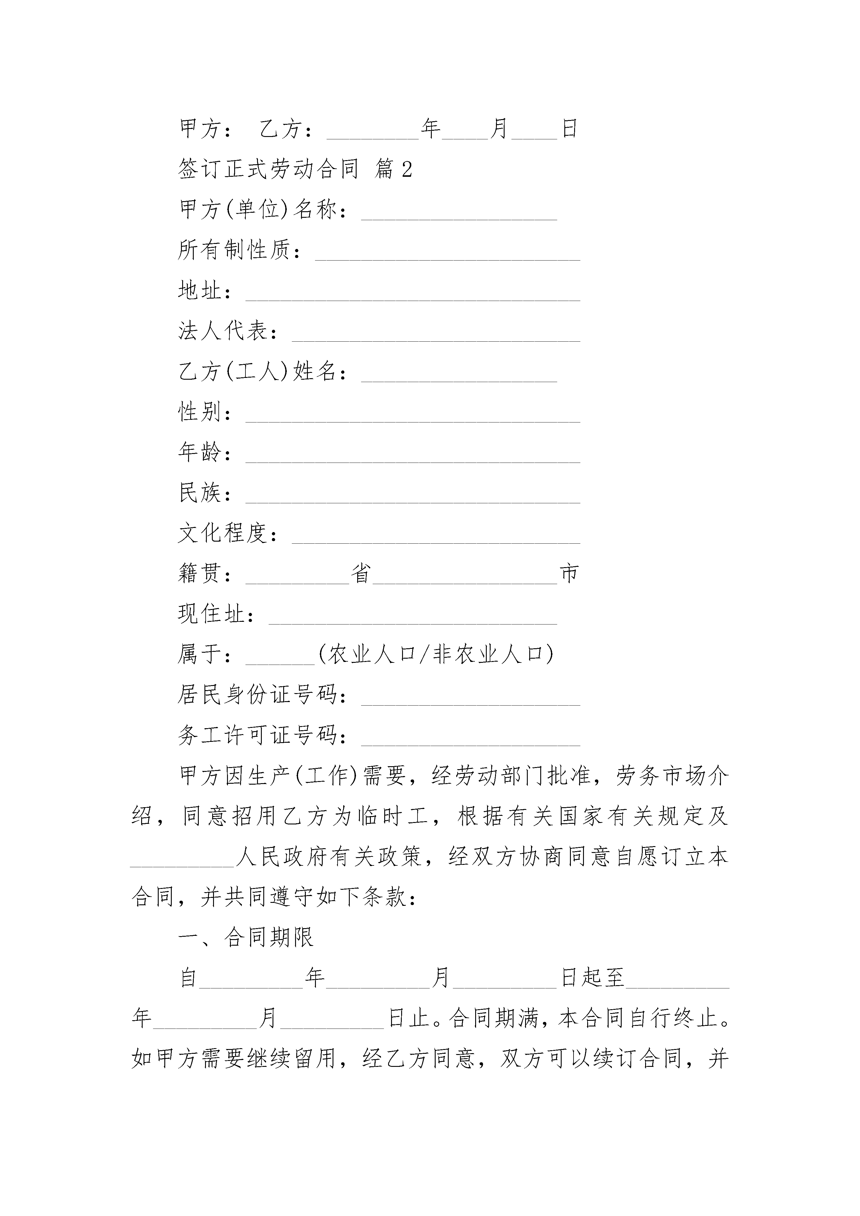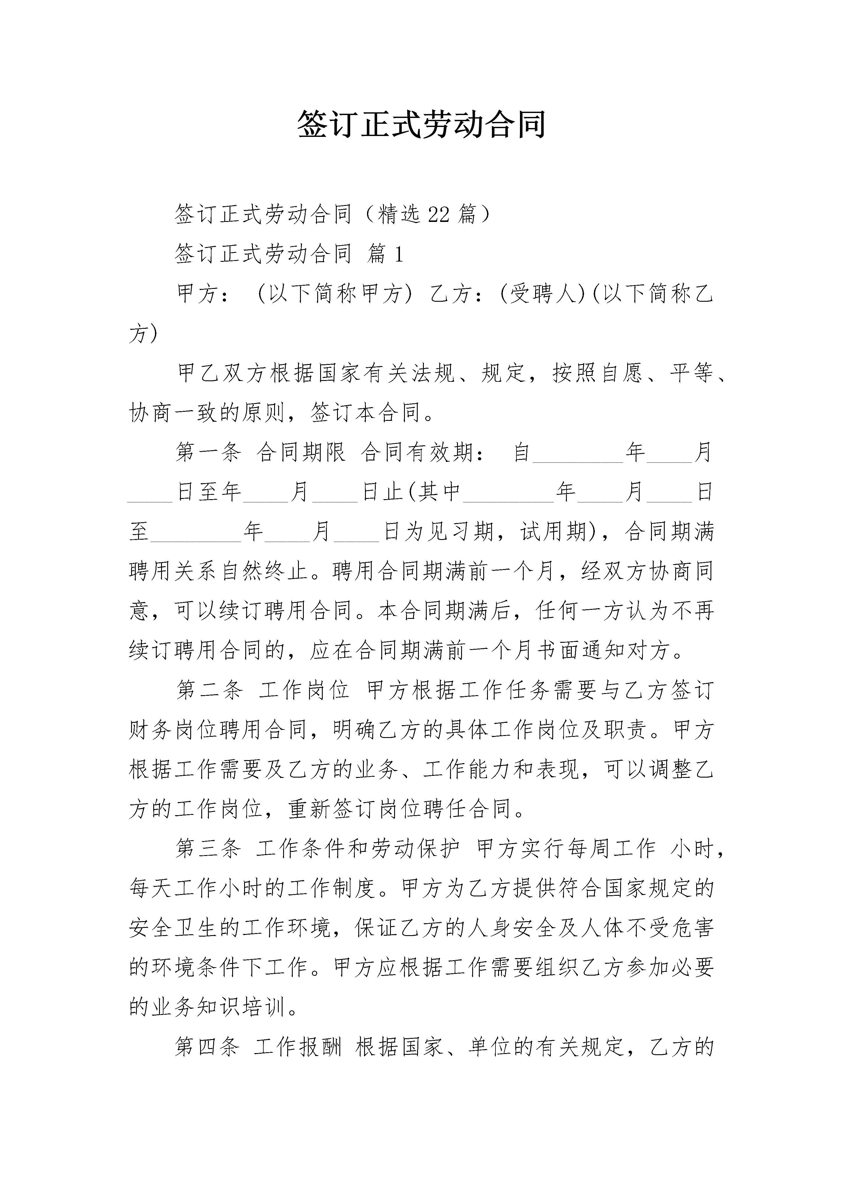 签订正式劳动合同签订正式劳动合同(精选22篇)签订正式劳动合同篇1甲方:(以下简称甲方)乙方:(受聘人)(以下简称乙方)甲乙双方根据国家有关法规、规定,按照自愿、平等、协商一致的原则,签订本合同。第一条合同期限合同有效期:自________年____月____日至年____月____日止(其中________年____月____日至________年____月____日为见习期,试用期),合同期满聘用关系自然终止。聘用合同期满前一个月,经双方协商同意,可以续订聘用合同。本合同期满后,任何一方认为不再续订聘用合同的,应在合同期满前一个月书面通知对方。第二条工作岗位甲方根据工作任务需要与乙方签订财务岗位聘用合同,明确乙方的具体工作岗位及职责。甲方根据工作需要及乙方的业务、工作能力和表现,可以调整乙方的工作岗位,重新签订岗位聘任合同。第三条工作条件和劳动保护甲方实行每周工作小时,每天工作小时的工作制度。甲方为乙方提供符合国家规定的安全卫生的工作环境,保证乙方的人身安全及人体不受危害的环境条件下工作。甲方应根据工作需要组织乙方参加必要的业务知识培训。第四条工作报酬根据国家、单位的有关规定,乙方的财务工作岗位,甲方按每月元支付乙方工资,每月计发工资的具体日期为。甲方根据国家、单位的有关规定,可调整乙方的工资。乙方享受规定的乙方不能胜任工作,经过培训或者调整工作岗位仍不能胜任工作,由甲方解除聘用合同的,甲方应按其在本单位工作年限,工作时间每满________年,发给相当于一个月工资的经济补偿金,最多不超过十二个月。聘用合同订立时所依据的客观情况发生重大变化,致使已签订的合同无法履行,经当事人协商不能就变更合同达成协议,由甲方解除聘用合同的,甲方按受聘人员在本单位工作年限,工作时间每满________年发给相当一个月工资的经济补偿金。甲方单位被撤销的,甲方应在被撤销前按乙方在本单位工作年限支付经济补偿金。工作时间每满________年,发给相当一个月工资的经济补偿金。聘用合同履行期间,合同双方的任何一方擅自违反规定解除合同的,必须负违约责任。并应按不满聘用合同规定的期限支付基本工资额度的违约金。乙方因“用人单位未按照聘用合同的约定支付工作报酬”而通知甲方解除聘用合同的,甲方应按合同约定结算并解除聘用合同的同时支付欠发的工作报酬。第五条其它事项甲乙双方因实施聘用合同发生劳动争议,按《劳动法》争议处理的有关条款执行。本合同一式叁份,甲方二份,乙方一份,经甲、乙双方签字后生效。本合同条款如与国家法律、法规相抵触时,以国家法律、法规为准。本合同的未及事项,按国家有关规定执行。双方认为需要规定的其他事项可以签订补充合同。甲方:乙方:________年____月____日签订正式劳动合同篇2甲方(单位)名称:_________________所有制性质:_______________________地址:_____________________________法人代表:_________________________乙方(工人)姓名:_________________性别:_____________________________年龄:_____________________________民族:_____________________________文化程度:_________________________籍贯:_________省________________市现住址:_________________________属于:______(农业人口/非农业人口)居民身份证号码:___________________务工许可证号码:___________________甲方因生产(工作)需要,经劳动部门批准,劳务市场介绍,同意招用乙方为临时工,根据有关国家有关规定及_________人民政府有关政策,经双方协商同意自愿订立本合同,并共同遵守如下条款:一、合同期限自_________年_________月_________日起至_________年_________月_________日止。合同期满,本合同自行终止。如甲方需要继续留用,经乙方同意,双方可以续订合同,并办理鉴证手续。二、生产(工作)任务甲方根据生产(工作)需要,安排乙方在_________岗位,承担_________临时生产(工作)任务。乙方若同意,须服从。在合同期内甲方因调整生产(工作)任务,需要变更乙方的岗位和任务,需经乙方同意。如乙方不同意,可提出辞职,双方办理解除合同手续。三、劳动时间与劳动报酬(一)劳动时间:甲方实行每周_________日,每日_________小时工作制。严格控制加班加点,确因生产(工作)需要加班加点的,应控制每日加班不超过_________小
