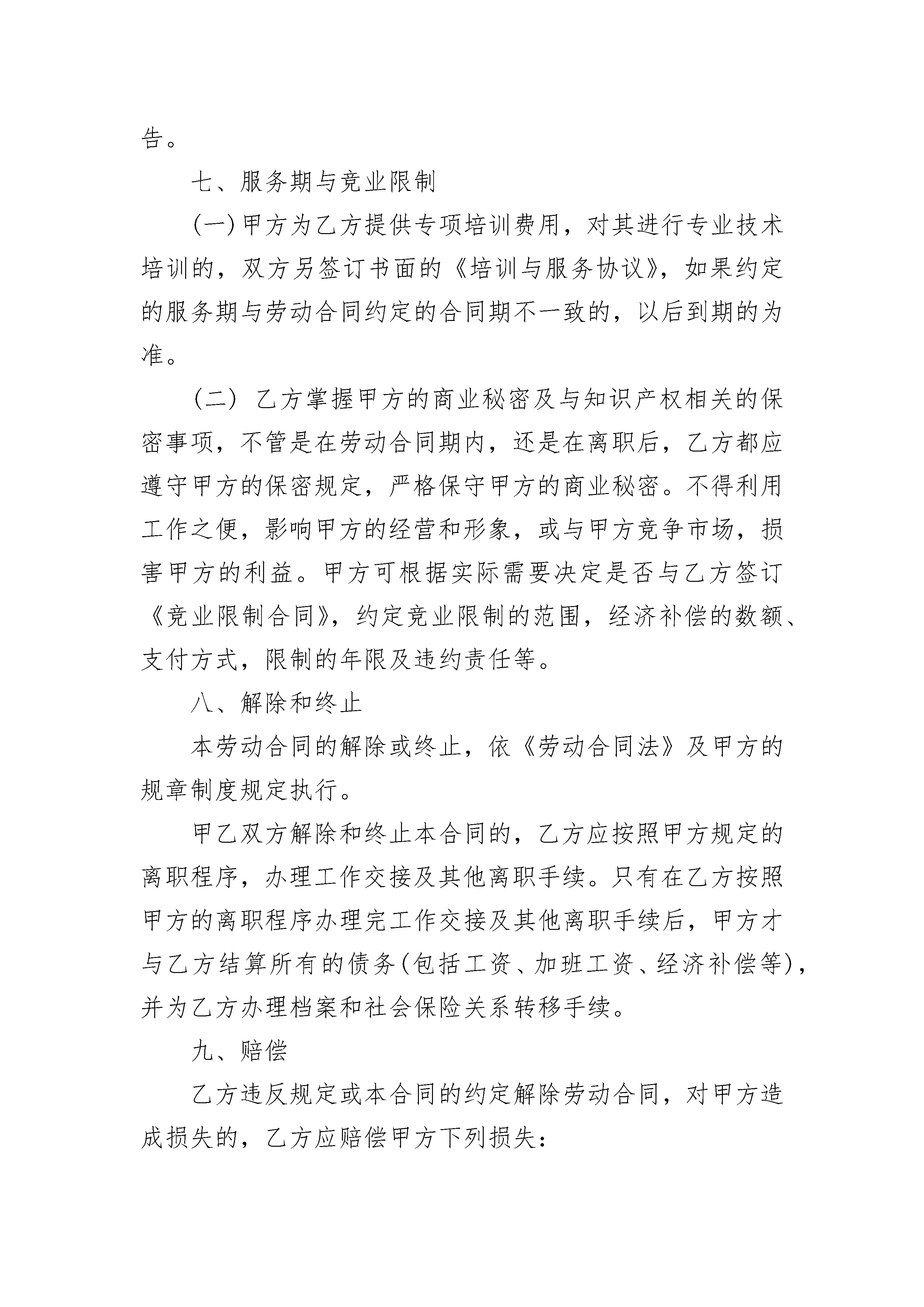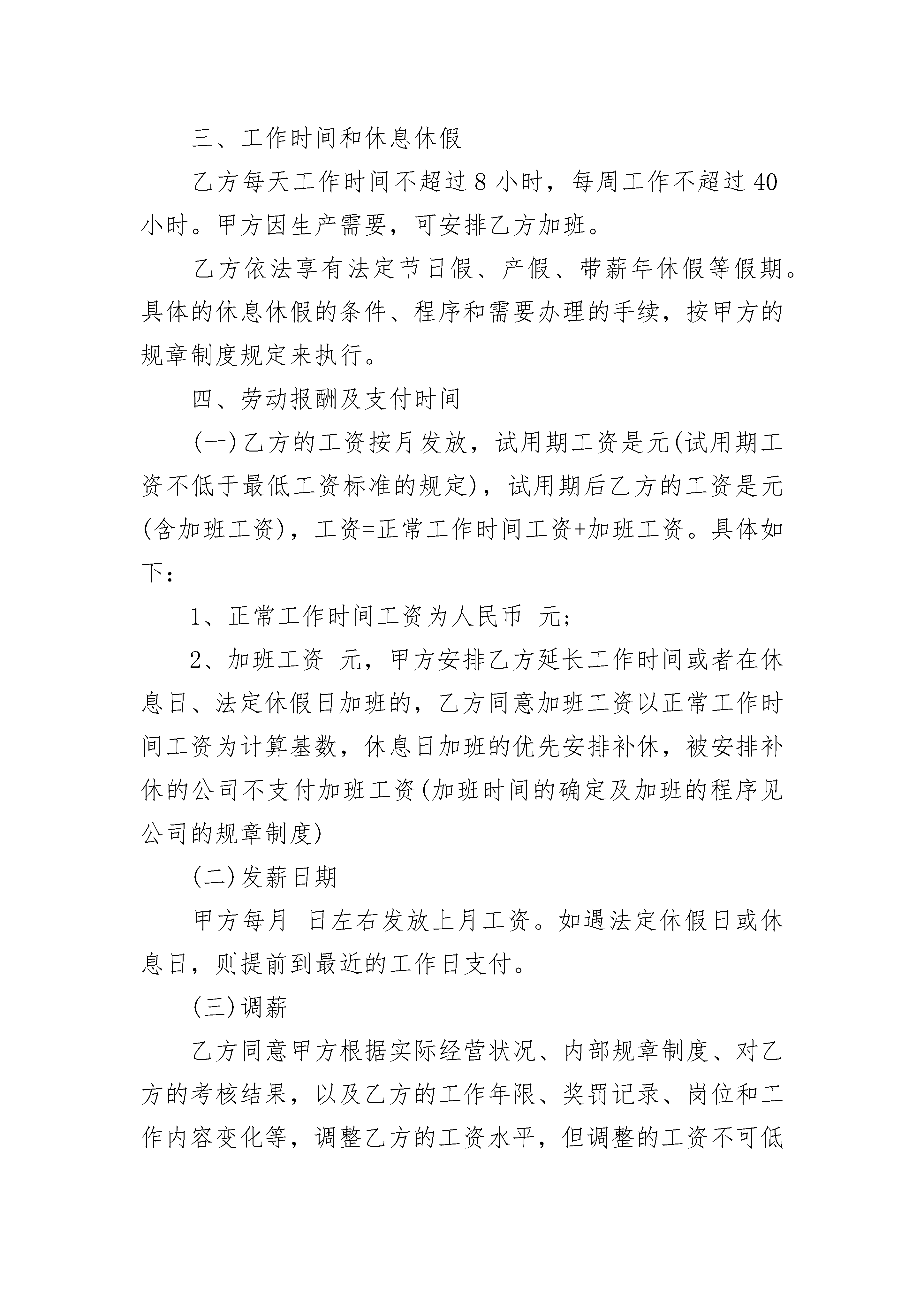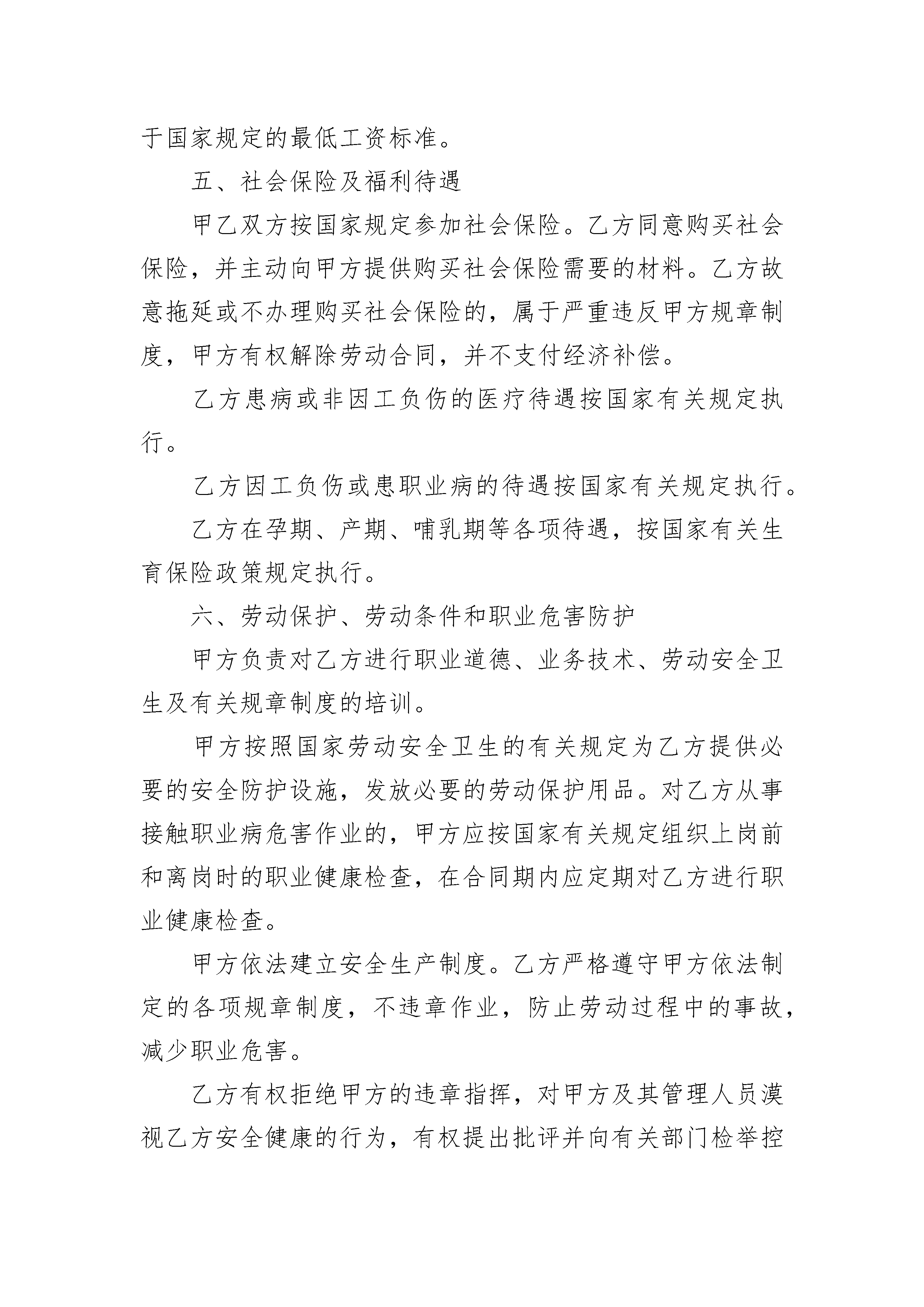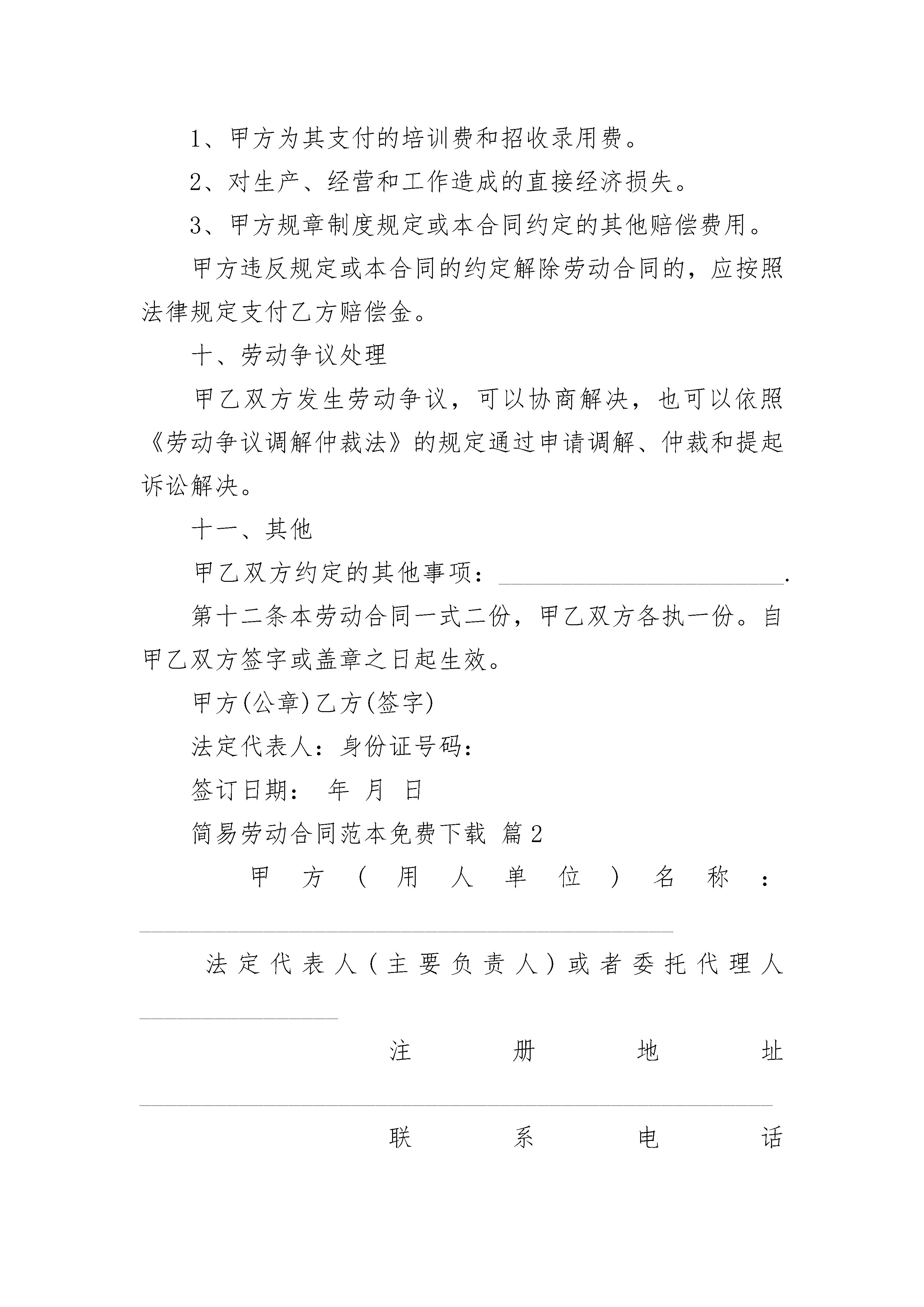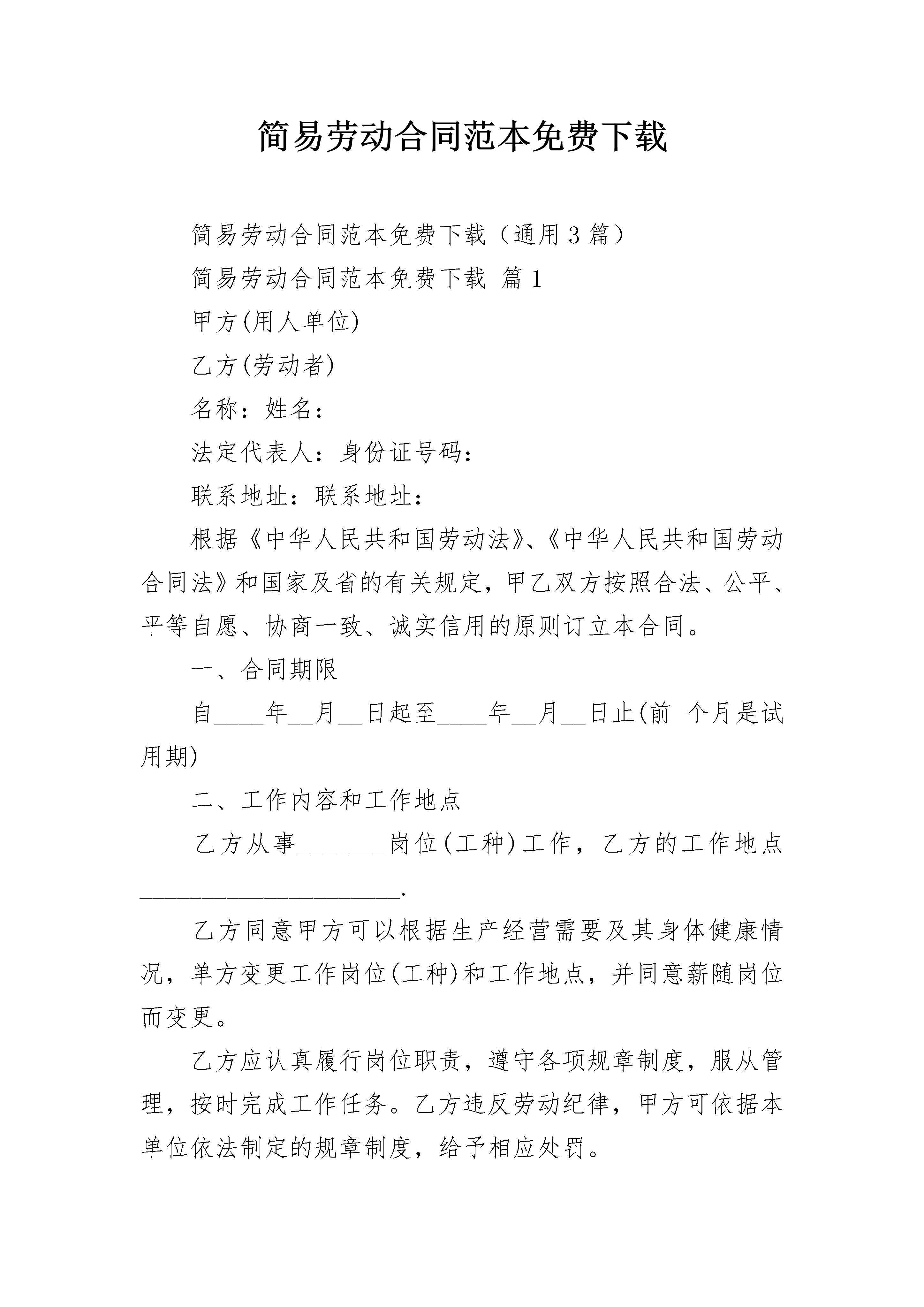 简易劳动合同范本免费下载简易劳动合同范本免费下载(通用3篇)简易劳动合同范本免费下载篇1甲方(用人单位)乙方(劳动者)名称:姓名:法定代表人:身份证号码:联系地址:联系地址:根据《中华人民共和国劳动法》、《中华人民共和国劳动合同法》和国家及省的有关规定,甲乙双方按照合法、公平、平等自愿、协商一致、诚实信用的原则订立本合同。一、合同期限自____年__月__日起至____年__月__日止(前个月是试用期)二、工作内容和工作地点乙方从事_______岗位(工种)工作,乙方的工作地点_____________________.乙方同意甲方可以根据生产经营需要及其身体健康情况,单方变更工作岗位(工种)和工作地点,并同意薪随岗位而变更。乙方应认真履行岗位职责,遵守各项规章制度,服从管理,按时完成工作任务。乙方违反劳动纪律,甲方可依据本单位依法制定的规章制度,给予相应处罚。三、工作时间和休息休假乙方每天工作时间不超过8小时,每周工作不超过40小时。甲方因生产需要,可安排乙方加班。乙方依法享有法定节日假、产假、带薪年休假等假期。具体的休息休假的条件、程序和需要办理的手续,按甲方的规章制度规定来执行。四、劳动报酬及支付时间(一)乙方的工资按月发放,试用期工资是元(试用期工资不低于最低工资标准的规定),试用期后乙方的工资是元(含加班工资),工资=正常工作时间工资+加班工资。具体如下:1、正常工作时间工资为人民币元;2、加班工资元,甲方安排乙方延长工作时间或者在休息日、法定休假日加班的,乙方同意加班工资以正常工作时间工资为计算基数,休息日加班的优先安排补休,被安排补休的公司不支付加班工资(加班时间的确定及加班的程序见公司的规章制度)(二)发薪日期甲方每月日左右发放上月工资。如遇法定休假日或休息日,则提前到最近的工作日支付。(三)调薪乙方同意甲方根据实际经营状况、内部规章制度、对乙方的考核结果,以及乙方的工作年限、奖罚记录、岗位和工作内容变化等,调整乙方的工资水平,但调整的工资不可低于国家规定的最低工资标准。五、社会保险及福利待遇甲乙双方按国家规定参加社会保险。乙方同意购买社会保险,并主动向甲方提供购买社会保险需要的材料。乙方故意拖延或不办理购买社会保险的,属于严重违反甲方规章制度,甲方有权解除劳动合同,并不支付经济补偿。乙方患病或非因工负伤的医疗待遇按国家有关规定执行。乙方因工负伤或患职业病的待遇按国家有关规定执行。乙方在孕期、产期、哺乳期等各项待遇,按国家有关生育保险政策规定执行。六、劳动保护、劳动条件和职业危害防护甲方负责对乙方进行职业道德、业务技术、劳动安全卫生及有关规章制度的培训。甲方按照国家劳动安全卫生的有关规定为乙方提供必要的安全防护设施,发放必要的劳动保护用品。对乙方从事接触职业病危害作业的,甲方应按国家有关规定组织上岗前和离岗时的职业健康检查,在合同期内应定期对乙方进行职业健康检查。甲方依法建立安全生产制度。乙方严格遵守甲方依法制定的各项规章制度,不违章作业,防止劳动过程中的事故,减少职业危害。乙方有权拒绝甲方的违章指挥,对甲方及其管理人员漠视乙方安全健康的行为,有权提出批评并向有关部门检举控告。七、服务期与竞业限制(一)甲方为乙方提供专项培训费用,对其进行专业技术培训的,双方另签订书面的《培训与服务协议》,如果约定的服务期与劳动合同约定的合同期不一致的,以后到期的为准。(二)乙方掌握甲方的商业秘密及与知识产权相关的保密事项,不管是在劳动合同期内,还是在离职后,乙方都应遵守甲方的保密规定,严格保守甲方的商业秘密。不得利用工作之便,影响甲方的经营和形象,或与甲方竞争市场,损害甲方的利益。甲方可根据实际需要决定是否与乙方签订《竞业限制合同》,约定竞业限制的范围,经济补偿的数额、支付方式,限制的年限及违约责任等。八、解除和终止本劳动合同的解除或终止,依《劳动合同法》及甲方的规章制度规定执行。甲乙双方解除和终止本合同的,乙方应按照甲方规定的离职程序,办理工作交接及其他离职手续。只有在乙方按照甲方的离职程序办理完工作交接及其他离职手续后,甲方才与乙方结算所有的债务(包括工资、加班工资、经济补偿等),并为乙方办理档案和社会保险关系转移手续。九、赔偿乙方违反规定或本合同的约定解除劳动合同,对甲方造成损失的,乙方应赔偿甲方下列损失:1、甲方为其支付的培训费和招收录用费。2、对生产、经营和工作造成的直接经济损失。3、甲方规章制度规定或本合同约定的其他赔偿费用。甲方违反规定或本合同的约定解除劳动合同的,应按照法律规定支付乙方赔偿金。十、劳动争议处理甲乙双方发生劳动争议,可以协商解决,也可以依照《劳动争议调解仲裁法》的规定通过申请调解、仲裁和提起诉讼解决。十一、其他甲乙双方约定的其他事项:_______________________.第十二条本劳