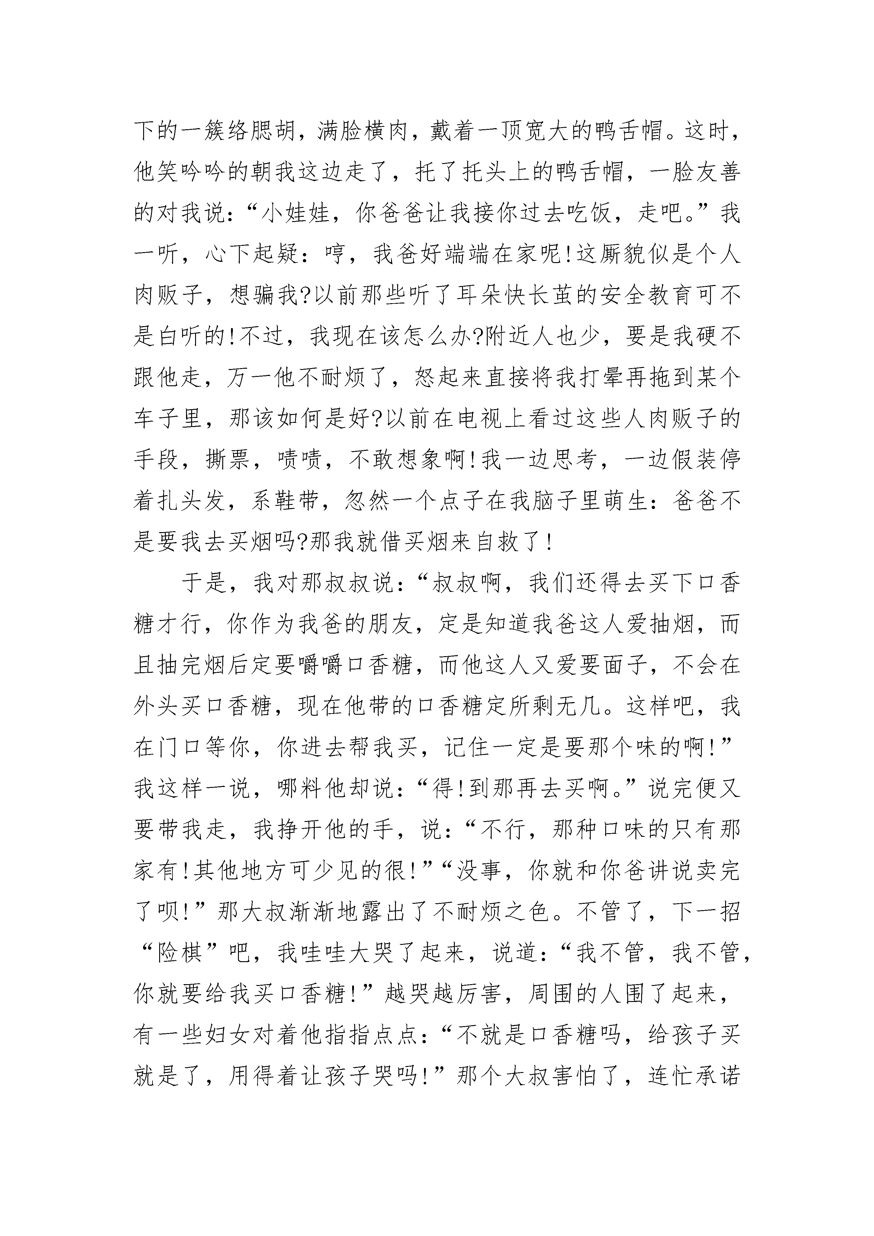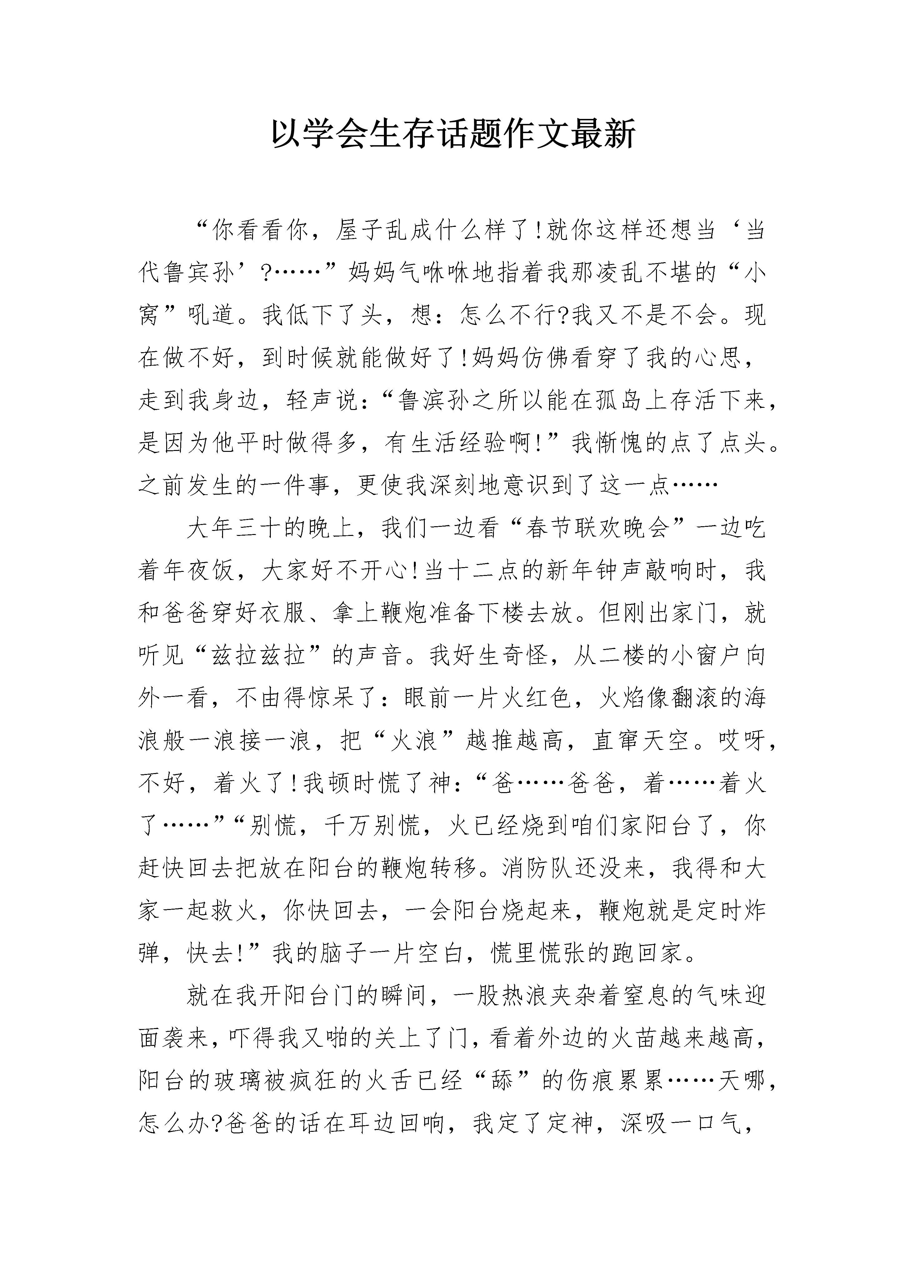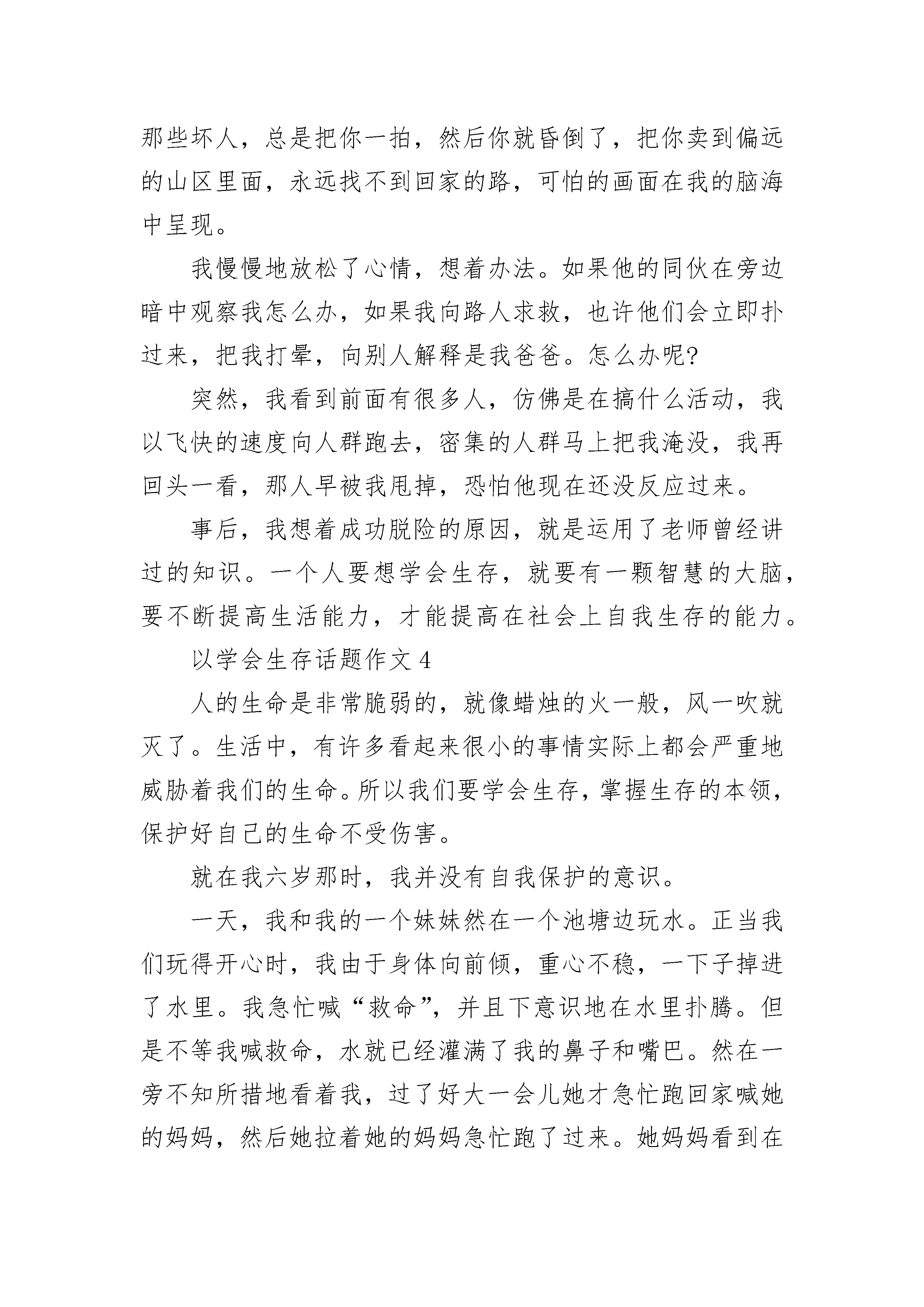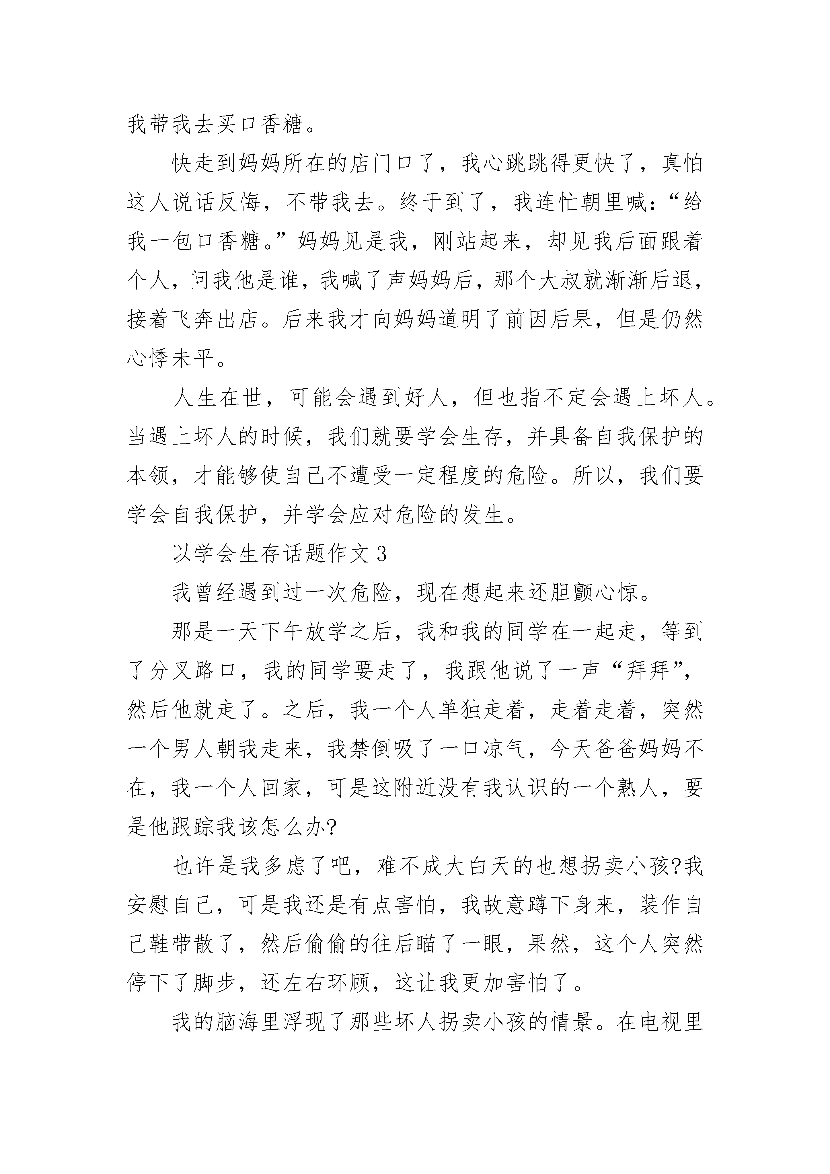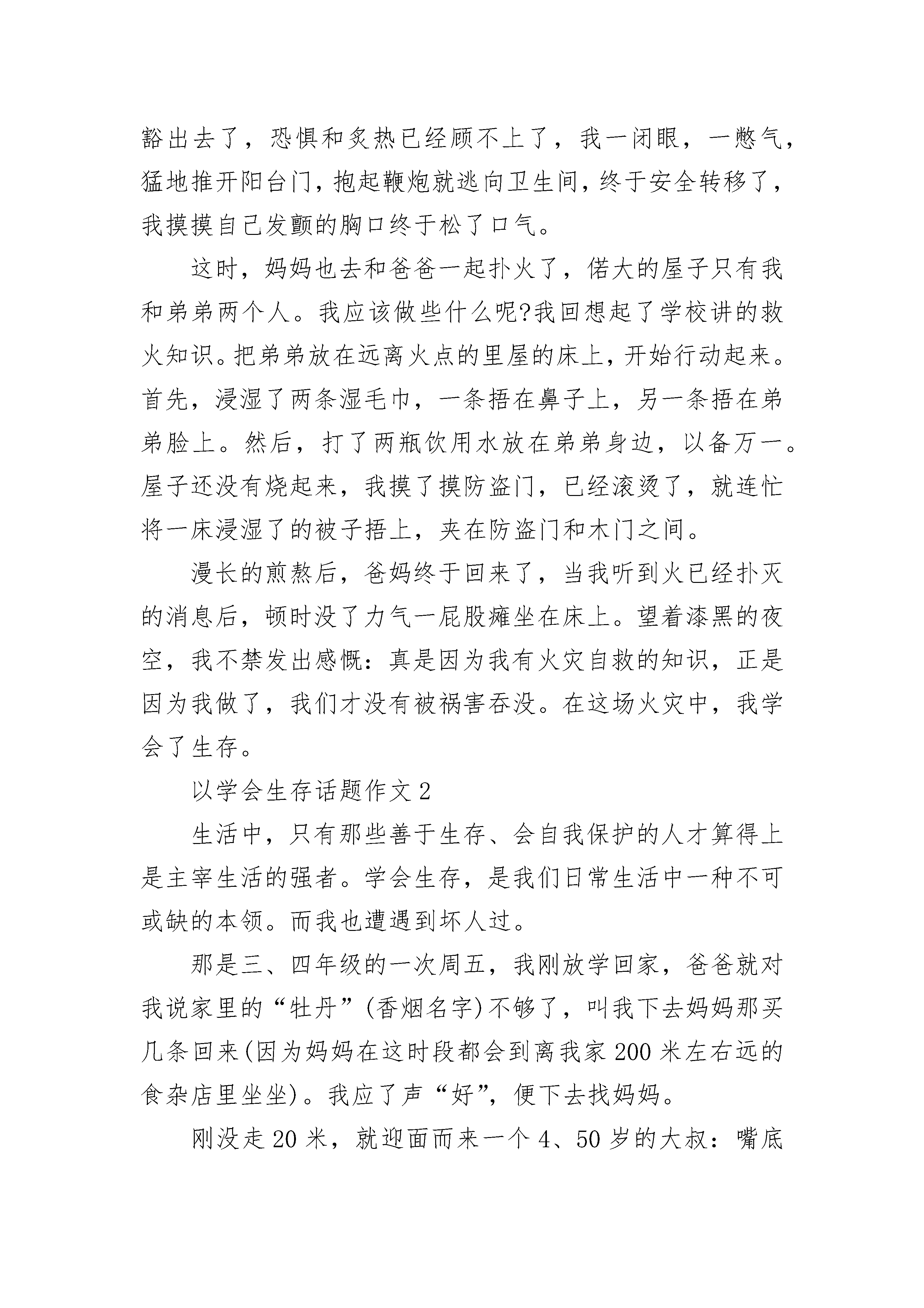 以学会生存话题作文最新“你看看你,屋子乱成什么样了!就你这样还想当‘当代鲁宾孙’?……”妈妈气咻咻地指着我那凌乱不堪的“小窝”吼道。我低下了头,想:怎么不行?我又不是不会。现在做不好,到时候就能做好了!妈妈仿佛看穿了我的心思,走到我身边,轻声说:“鲁滨孙之所以能在孤岛上存活下来,是因为他平时做得多,有生活经验啊!”我惭愧的点了点头。之前发生的一件事,更使我深刻地意识到了这一点……大年三十的晚上,我们一边看“春节联欢晚会”一边吃着年夜饭,大家好不开心!当十二点的新年钟声敲响时,我和爸爸穿好衣服、拿上鞭炮准备下楼去放。但刚出家门,就听见“兹拉兹拉”的声音。我好生奇怪,从二楼的小窗户向外一看,不由得惊呆了:眼前一片火红色,火焰像翻滚的海浪般一浪接一浪,把“火浪”越推越高,直窜天空。哎呀,不好,着火了!我顿时慌了神:“爸……爸爸,着……着火了……”“别慌,千万别慌,火已经烧到咱们家阳台了,你赶快回去把放在阳台的鞭炮转移。消防队还没来,我得和大家一起救火,你快回去,一会阳台烧起来,鞭炮就是定时炸弹,快去!”我的脑子一片空白,慌里慌张的跑回家。就在我开阳台门的瞬间,一股热浪夹杂着窒息的气味迎面袭来,吓得我又啪的关上了门,看着外边的火苗越来越高,阳台的玻璃被疯狂的火舌已经“舔”的伤痕累累……天哪,怎么办?爸爸的话在耳边回响,我定了定神,深吸一口气,豁出去了,恐惧和炙热已经顾不上了,我一闭眼,一憋气,猛地推开阳台门,抱起鞭炮就逃向卫生间,终于安全转移了,我摸摸自己发颤的胸口终于松了口气。这时,妈妈也去和爸爸一起扑火了,偌大的屋子只有我和弟弟两个人。我应该做些什么呢?我回想起了学校讲的救火知识。把弟弟放在远离火点的里屋的床上,开始行动起来。首先,浸湿了两条湿毛巾,一条捂在鼻子上,另一条捂在弟弟脸上。然后,打了两瓶饮用水放在弟弟身边,以备万一。屋子还没有烧起来,我摸了摸防盗门,已经滚烫了,就连忙将一床浸湿了的被子捂上,夹在防盗门和木门之间。漫长的煎熬后,爸妈终于回来了,当我听到火已经扑灭的消息后,顿时没了力气一屁股瘫坐在床上。望着漆黑的夜空,我不禁发出感慨:真是因为我有火灾自救的知识,正是因为我做了,我们才没有被祸害吞没。在这场火灾中,我学会了生存。以学会生存话题作文2生活中,只有那些善于生存、会自我保护的人才算得上是主宰生活的强者。学会生存,是我们日常生活中一种不可或缺的本领。而我也遭遇到坏人过。那是三、四年级的一次周五,我刚放学回家,爸爸就对我说家里的“牡丹”(香烟名字)不够了,叫我下去妈妈那买几条回来(因为妈妈在这时段都会到离我家200米左右远的食杂店里坐坐)。我应了声“好”,便下去找妈妈。刚没走20米,就迎面而来一个4、50岁的大叔:嘴底下的一簇络腮胡,满脸横肉,戴着一顶宽大的鸭舌帽。这时,他笑吟吟的朝我这边走了,托了托头上的鸭舌帽,一脸友善的对我说:“小娃娃,你爸爸让我接你过去吃饭,走吧。”我一听,心下起疑:哼,我爸好端端在家呢!这厮貌似是个人肉贩子,想骗我?以前那些听了耳朵快长茧的安全教育可不是白听的!不过,我现在该怎么办?附近人也少,要是我硬不跟他走,万一他不耐烦了,怒起来直接将我打晕再拖到某个车子里,那该如何是好?以前在电视上看过这些人肉贩子的手段,撕票,啧啧,不敢想象啊!我一边思考,一边假装停着扎头发,系鞋带,忽然一个点子在我脑子里萌生:爸爸不是要我去买烟吗?那我就借买烟来自救了!于是,我对那叔叔说:“叔叔啊,我们还得去买下口香糖才行,你作为我爸的朋友,定是知道我爸这人爱抽烟,而且抽完烟后定要嚼嚼口香糖,而他这人又爱要面子,不会在外头买口香糖,现在他带的口香糖定所剩无几。这样吧,我在门口等你,你进去帮我买,记住一定是要那个味的啊!”我这样一说,哪料他却说:“得!到那再去买啊。”说完便又要带我走,我挣开他的手,说:“不行,那种口味的只有那家有!其他地方可少见的很!”“没事,你就和你爸讲说卖完了呗!”那大叔渐渐地露出了不耐烦之色。不管了,下一招“险棋”吧,我哇哇大哭了起来,说道:“我不管,我不管,你就要给我买口香糖!”越哭越厉害,周围的人围了起来,有一些妇女对着他指指点点:“不就是口香糖吗,给孩子买就是了,用得着让孩子哭吗!”那个大叔害怕了,连忙承诺我带我去买口香糖。快走到妈妈所在的店门口了,我心跳跳得更快了,真怕这人说话反悔,不带我去。终于到了,我连忙朝里喊:“给我一包口香糖。”妈妈见是我,刚站起来,却见我后面跟着个人,问我他是谁,我喊了声妈妈后,那个大叔就渐渐后退,接着飞奔出店。后来我才向妈妈道明了前因后果,但是仍然心悸未平。人生在世,可能会遇到好人,但也指不定会遇上坏人。当遇上坏人的时候,我们就要学会生存,并具备自我保护的本领,才能够使自己不遭受一定程度的危险。所以,我们要学会自我保护,并学会应对危险的发生。以学会生存话题