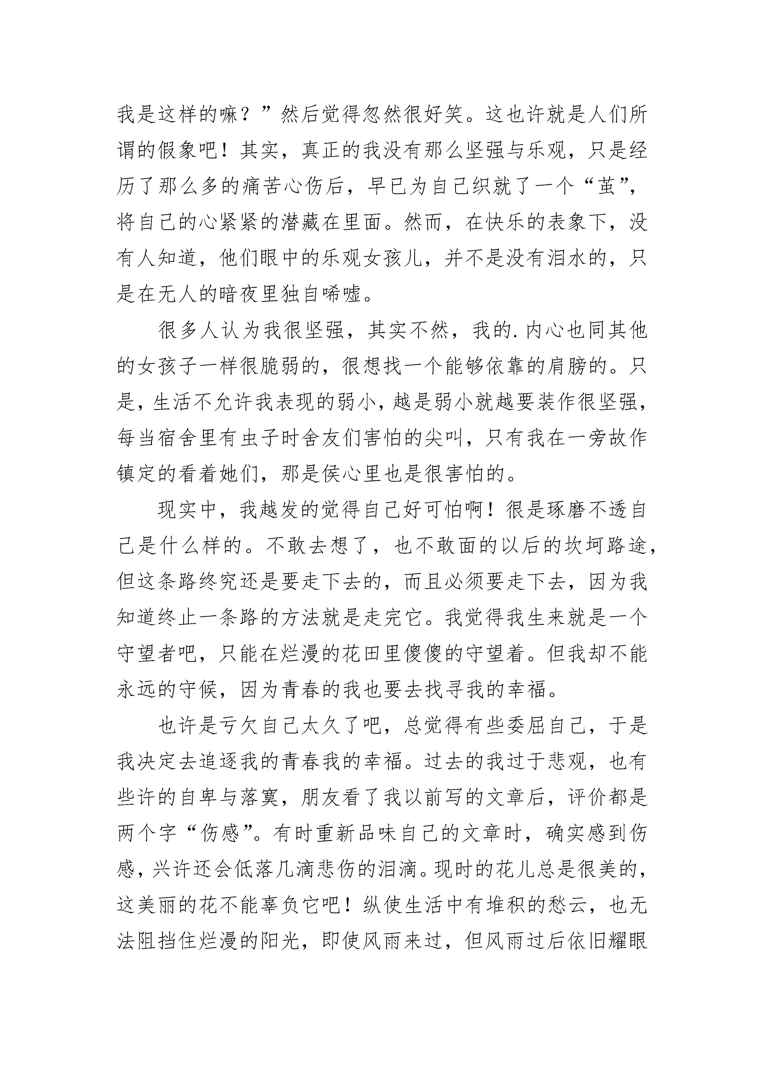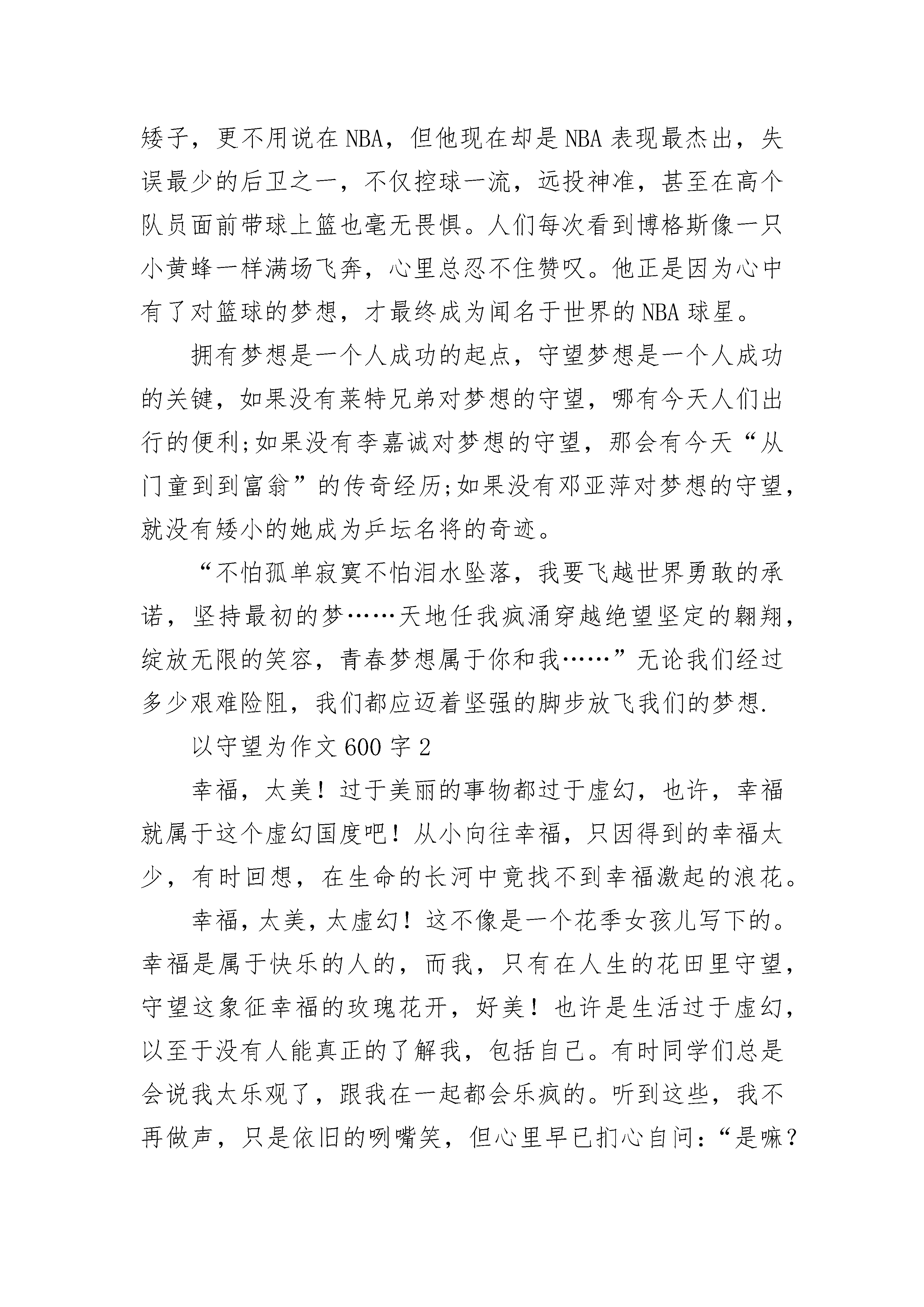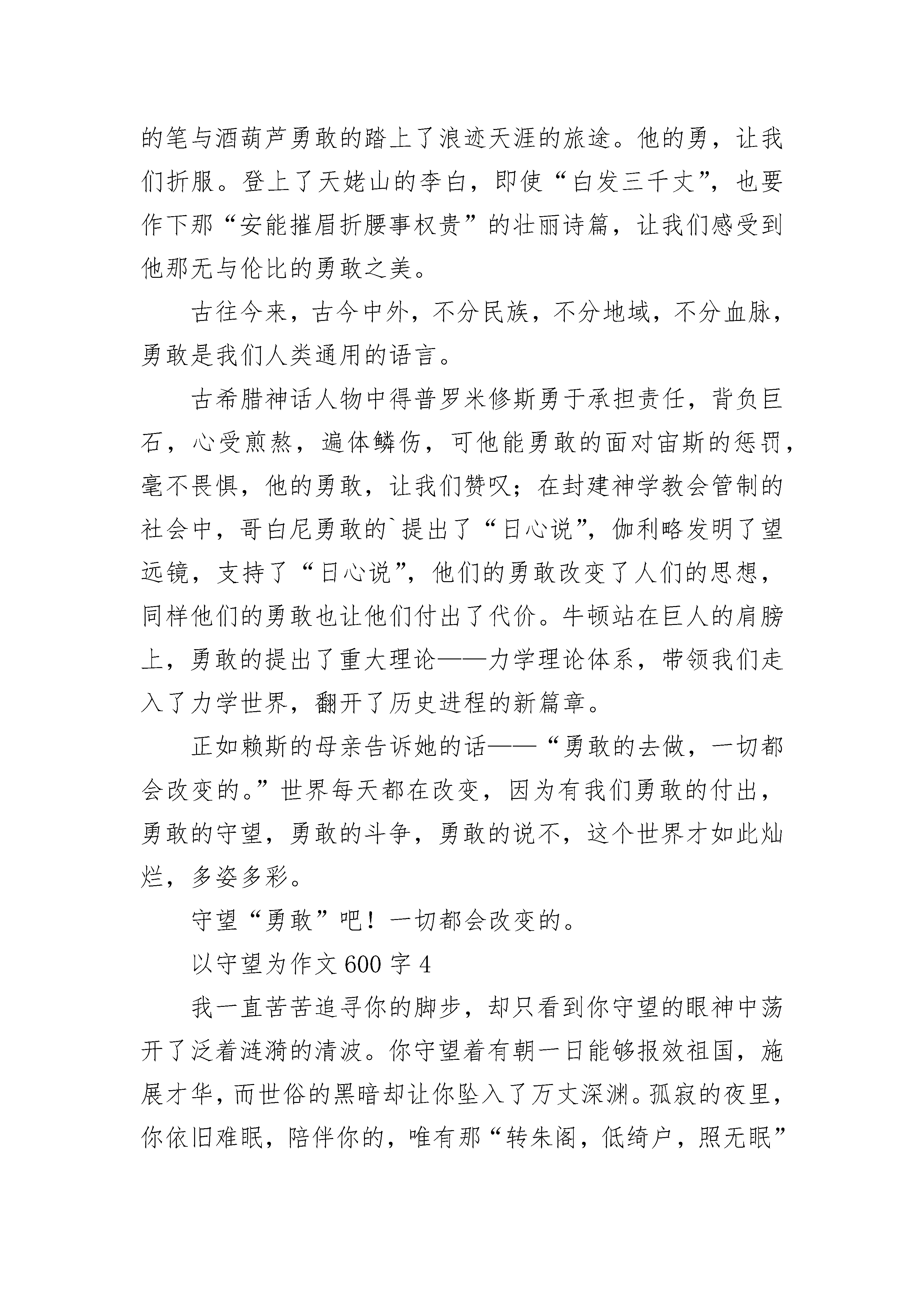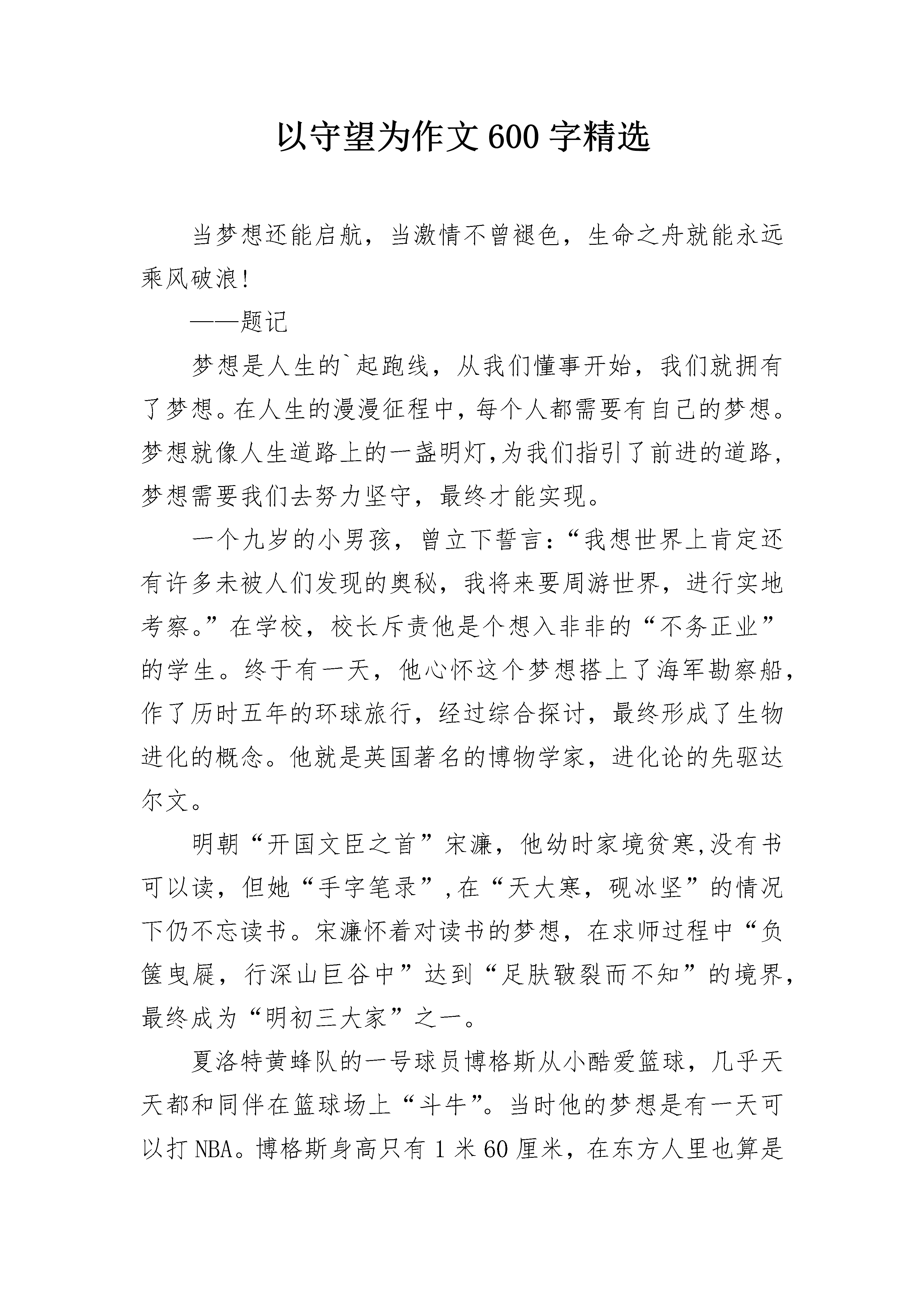 以守望为作文600字精选当梦想还能启航,当激情不曾褪色,生命之舟就能永远乘风破浪!——题记梦想是人生的`起跑线,从我们懂事开始,我们就拥有了梦想。在人生的漫漫征程中,每个人都需要有自己的梦想。梦想就像人生道路上的一盏明灯,为我们指引了前进的道路,梦想需要我们去努力坚守,最终才能实现。一个九岁的小男孩,曾立下誓言:“我想世界上肯定还有许多未被人们发现的奥秘,我将来要周游世界,进行实地考察。”在学校,校长斥责他是个想入非非的“不务正业”的学生。终于有一天,他心怀这个梦想搭上了海军勘察船,作了历时五年的环球旅行,经过综合探讨,最终形成了生物进化的概念。他就是英国著名的博物学家,进化论的先驱达尔文。明朝“开国文臣之首”宋濂,他幼时家境贫寒,没有书可以读,但她“手字笔录”,在“天大寒,砚冰坚”的情况下仍不忘读书。宋濂怀着对读书的梦想,在求师过程中“负箧曳屣,行深山巨谷中”达到“足肤皲裂而不知”的境界,最终成为“明初三大家”之一。夏洛特黄蜂队的一号球员博格斯从小酷爱篮球,几乎天天都和同伴在篮球场上“斗牛”。当时他的梦想是有一天可以打NBA。博格斯身高只有1米60厘米,在东方人里也算是矮子,更不用说在NBA,但他现在却是NBA表现最杰出,失误最少的后卫之一,不仅控球一流,远投神准,甚至在高个队员面前带球上篮也毫无畏惧。人们每次看到博格斯像一只小黄蜂一样满场飞奔,心里总忍不住赞叹。他正是因为心中有了对篮球的梦想,才最终成为闻名于世界的NBA球星。拥有梦想是一个人成功的起点,守望梦想是一个人成功的关键,如果没有莱特兄弟对梦想的守望,哪有今天人们出行的便利;如果没有李嘉诚对梦想的守望,那会有今天“从门童到到富翁”的传奇经历;如果没有邓亚萍对梦想的守望,就没有矮小的她成为乒坛名将的奇迹。“不怕孤单寂寞不怕泪水坠落,我要飞越世界勇敢的承诺,坚持最初的梦……天地任我疯涌穿越绝望坚定的翱翔,绽放无限的笑容,青春梦想属于你和我……”无论我们经过多少艰难险阻,我们都应迈着坚强的脚步放飞我们的梦想.以守望为作文600字2幸福,太美!过于美丽的事物都过于虚幻,也许,幸福就属于这个虚幻国度吧!从小向往幸福,只因得到的幸福太少,有时回想,在生命的长河中竟找不到幸福激起的浪花。幸福,太美,太虚幻!这不像是一个花季女孩儿写下的。幸福是属于快乐的人的,而我,只有在人生的花田里守望,守望这象征幸福的玫瑰花开,好美!也许是生活过于虚幻,以至于没有人能真正的了解我,包括自己。有时同学们总是会说我太乐观了,跟我在一起都会乐疯的。听到这些,我不再做声,只是依旧的咧嘴笑,但心里早已扪心自问:“是嘛?我是这样的嘛?”然后觉得忽然很好笑。这也许就是人们所谓的假象吧!其实,真正的我没有那么坚强与乐观,只是经历了那么多的痛苦心伤后,早已为自己织就了一个“茧”,将自己的心紧紧的潜藏在里面。然而,在快乐的表象下,没有人知道,他们眼中的乐观女孩儿,并不是没有泪水的,只是在无人的暗夜里独自唏嘘。很多人认为我很坚强,其实不然,我的.内心也同其他的女孩子一样很脆弱的,很想找一个能够依靠的肩膀的。只是,生活不允许我表现的弱小,越是弱小就越要装作很坚强,每当宿舍里有虫子时舍友们害怕的尖叫,只有我在一旁故作镇定的看着她们,那是侯心里也是很害怕的。现实中,我越发的觉得自己好可怕啊!很是琢磨不透自己是什么样的。不敢去想了,也不敢面的以后的坎坷路途,但这条路终究还是要走下去的,而且必须要走下去,因为我知道终止一条路的方法就是走完它。我觉得我生来就是一个守望者吧,只能在烂漫的花田里傻傻的守望着。但我却不能永远的守候,因为青春的我也要去找寻我的幸福。也许是亏欠自己太久了吧,总觉得有些委屈自己,于是我决定去追逐我的青春我的幸福。过去的我过于悲观,也有些许的自卑与落寞,朋友看了我以前写的文章后,评价都是两个字“伤感”。有时重新品味自己的文章时,确实感到伤感,兴许还会低落几滴悲伤的泪滴。现时的花儿总是很美的,这美丽的花不能辜负它吧!纵使生活中有堆积的愁云,也无法阻挡住烂漫的阳光,即使风雨来过,但风雨过后依旧耀眼夺目,去吧,去找寻幸福的花田吧!那才是属于青春年少的。无论幸福有多么的虚幻缥缈,我相信:我,一个快乐女孩儿,会把它找到的。我想,这也许就是我人生的一个转折吧,过去的十八年里我的世界是黯淡的,但今天过后,我的生命将充满色彩,我的人生也将在曾经守候过的花田里盛开着,亦如那颗永不凋落的太阳一样,永远,永远的芬芳着幸福花田!以守望为作文600字3勇敢是一种美德,但切忌做勇夫。每一次战争的胜利,都需要人民与战士勇敢的战斗,勇于冲锋,敢于牺牲,这样的勇敢为我们今后快乐富足的生活带来了可能。不只是在战斗中,在我们的日常生活中,勇敢也处处体现着他的价值。勇于与歹徒搏斗,维护我们身边的正义;勇于救人,视生命为无价之宝;勇于克服困难,