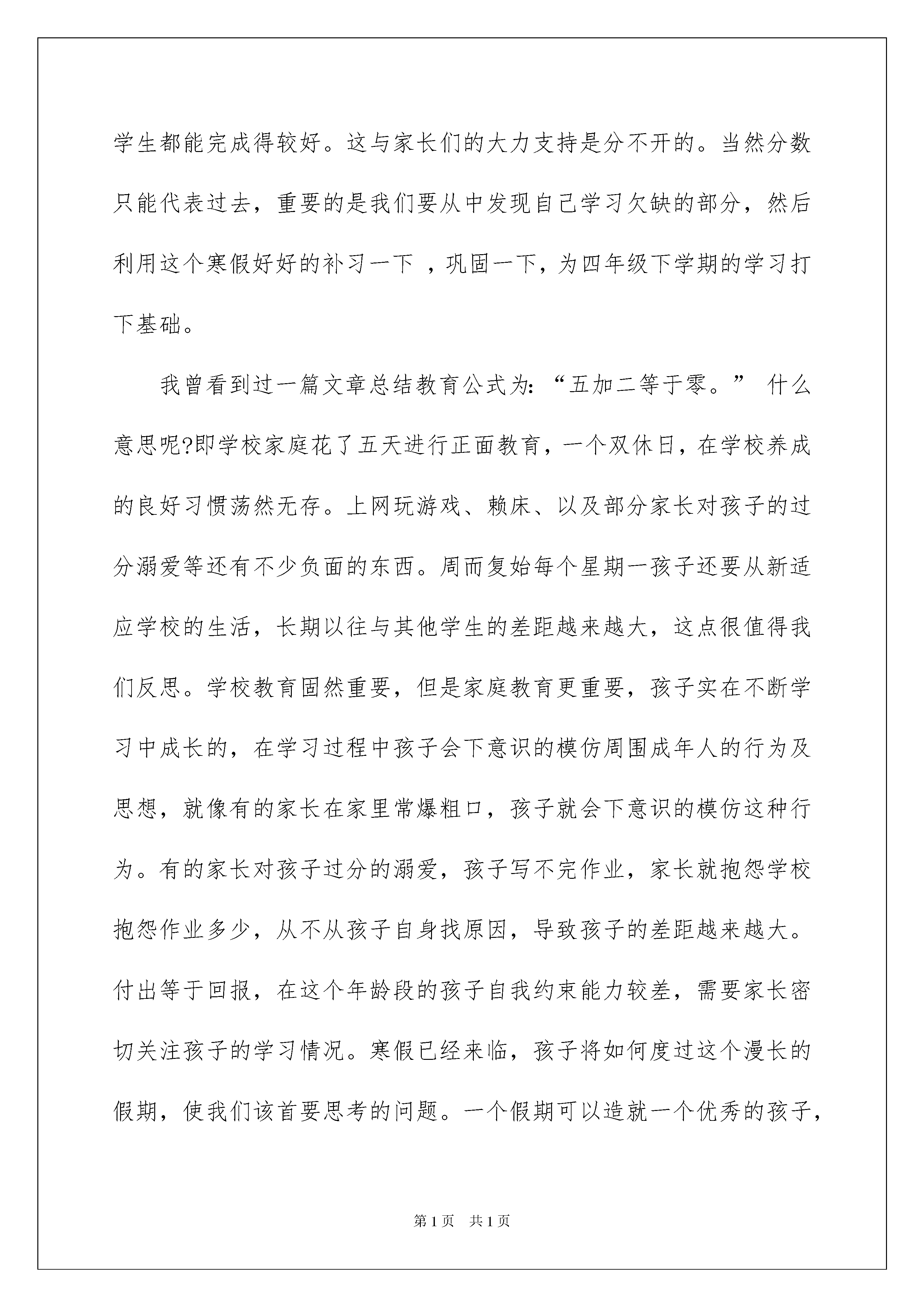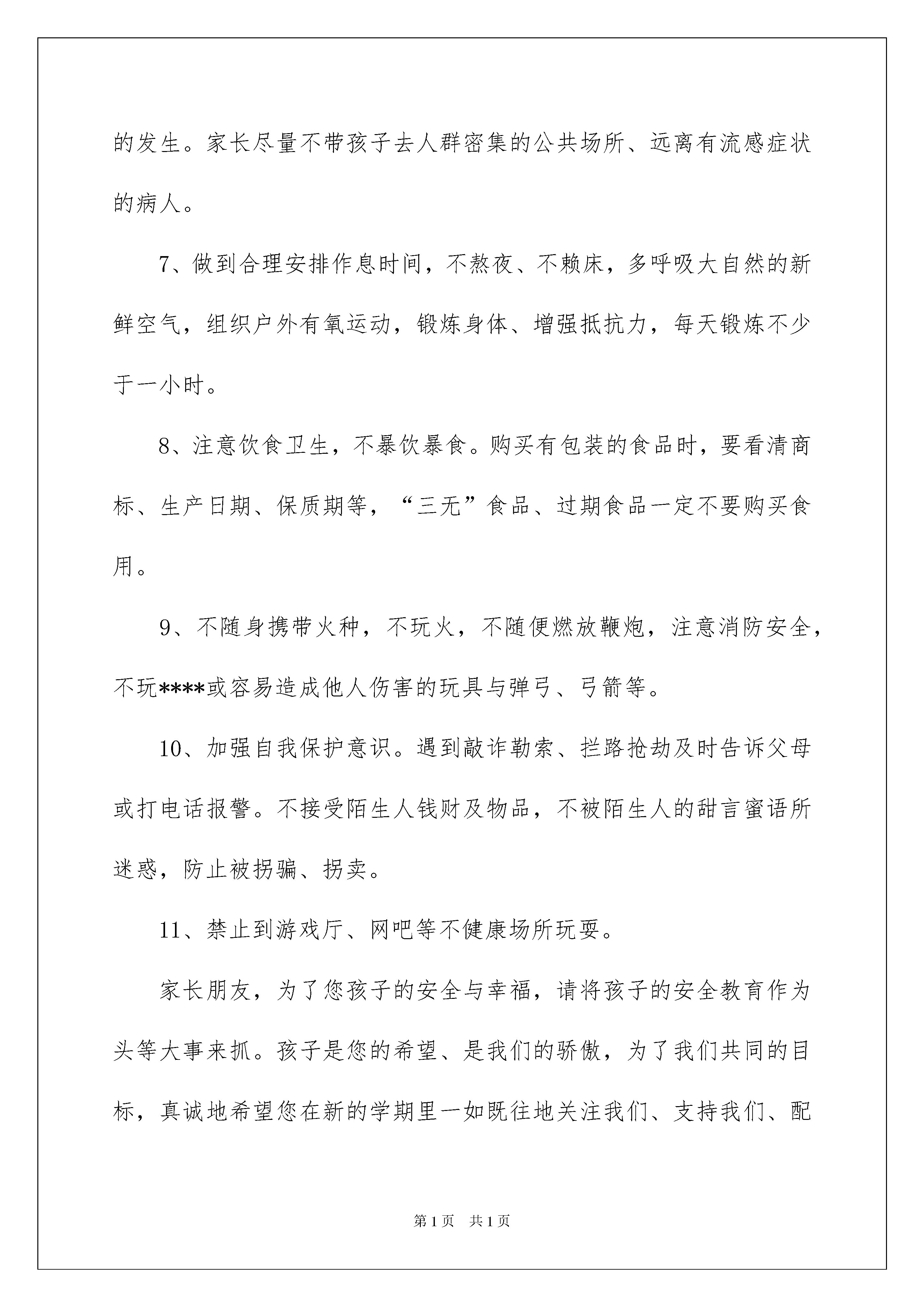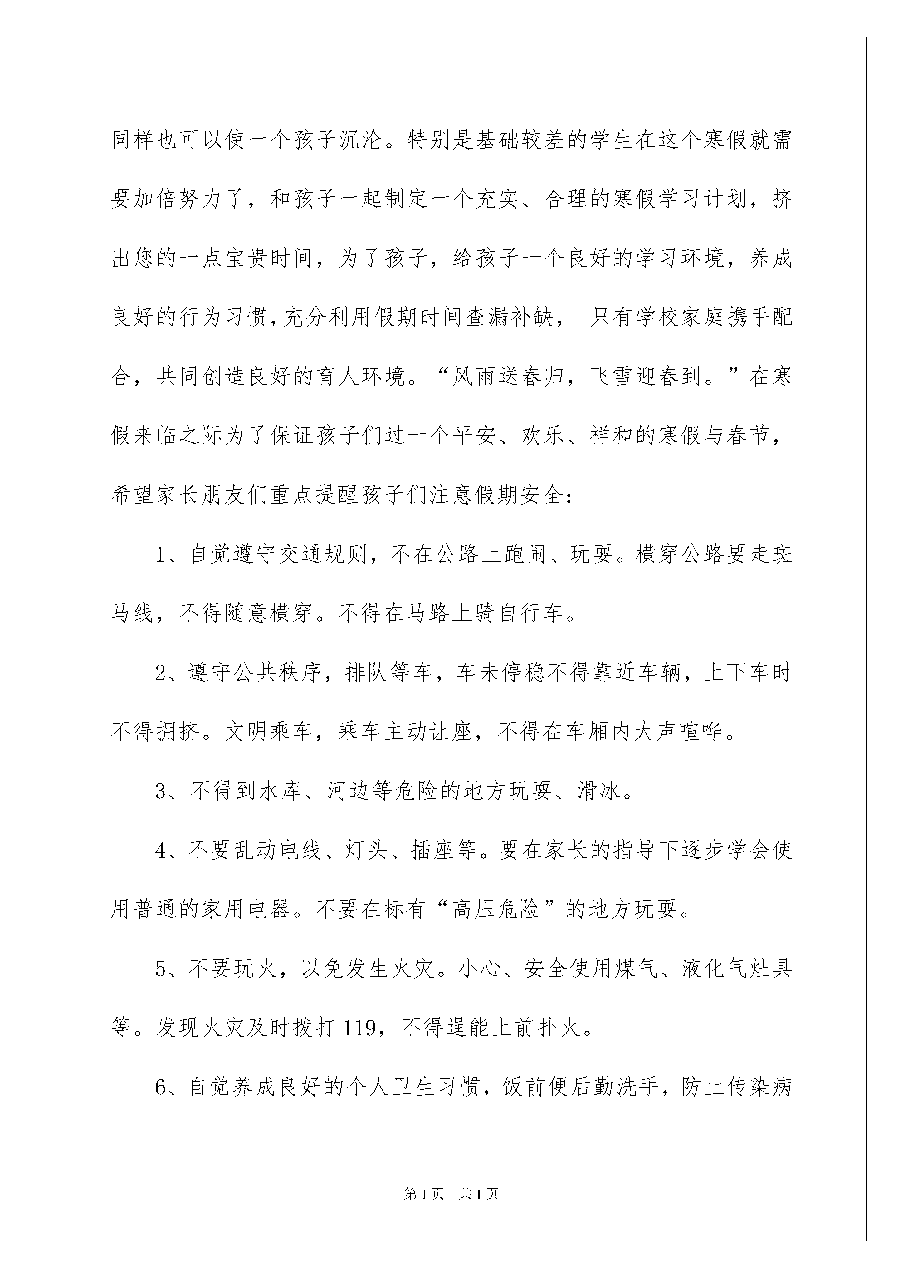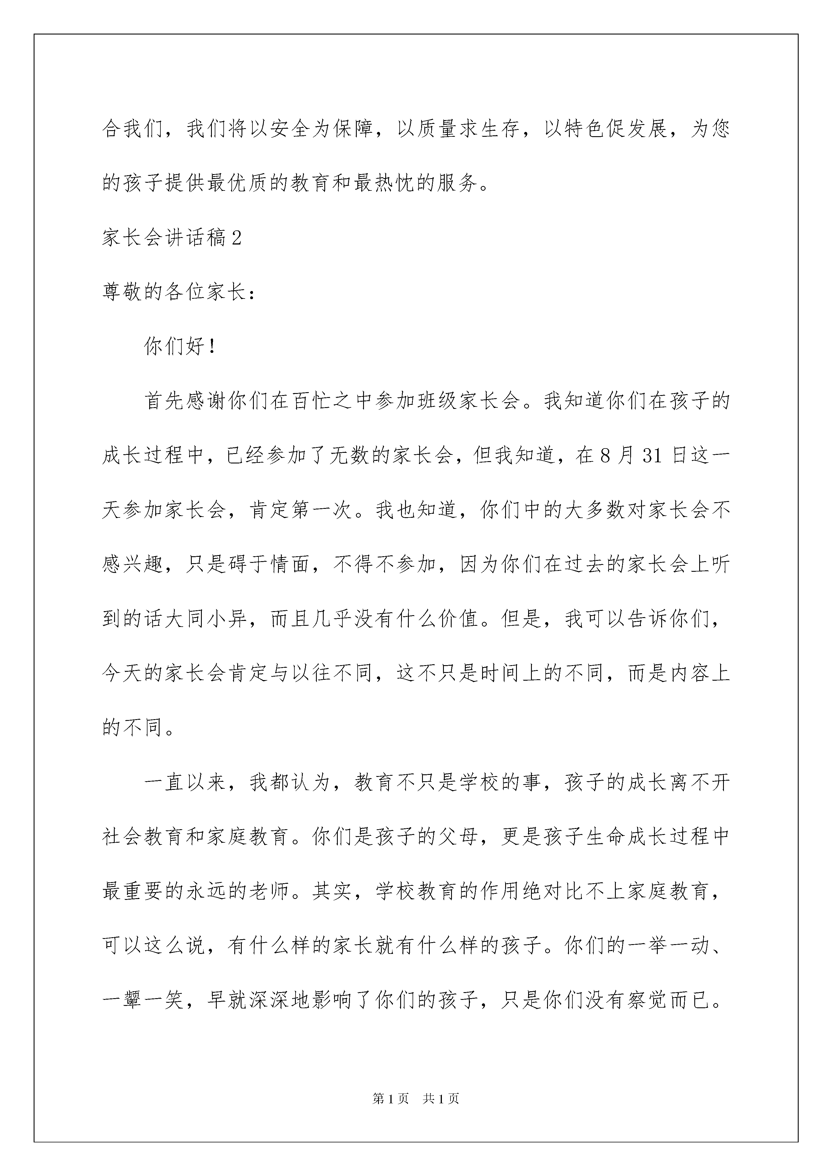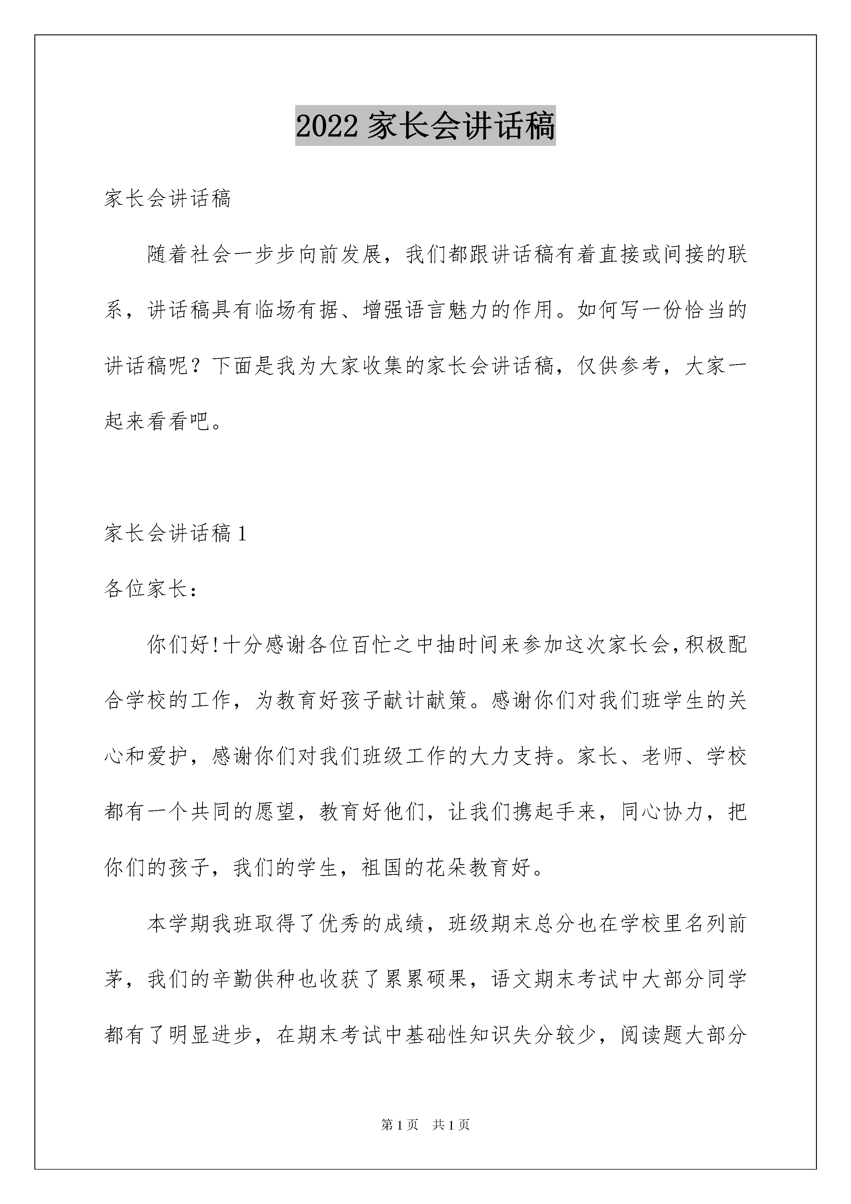 2022家长会讲话稿家长会讲话稿随着社会一步步向前发展,我们都跟讲话稿有着直接或间接的联系,讲话稿具有临场有据、增强语言魅力的作用。如何写一份恰当的讲话稿呢?下面是我为大家收集的家长会讲话稿,仅供参考,大家一起来看看吧。家长会讲话稿1各位家长:你们好!十分感谢各位百忙之中抽时间来参加这次家长会,积极配合学校的工作,为教育好孩子献计献策。感谢你们对我们班学生的关心和爱护,感谢你们对我们班级工作的大力支持。家长、老师、学校都有一个共同的愿望,教育好他们,让我们携起手来,同心协力,把你们的孩子,我们的学生,祖国的花朵教育好。本学期我班取得了优秀的成绩,班级期末总分也在学校里名列前茅,我们的辛勤供种也收获了累累硕果,语文期末考试中大部分同学都有了明显进步,在期末考试中基础性知识失分较少,阅读题大部分学生都能完成得较好。这与家长们的大力支持是分不开的。当然分数只能代表过去,重要的是我们要从中发现自己学习欠缺的部分,然后利用这个寒假好好的补习一下,巩固一下,为四年级下学期的学习打下基础。我曾看到过一篇文章总结教育公式为:“五加二等于零。”什么意思呢?即学校家庭花了五天进行正面教育,一个双休日,在学校养成的良好习惯荡然无存。上网玩游戏、赖床、以及部分家长对孩子的过分溺爱等还有不少负面的东西。周而复始每个星期一孩子还要从新适应学校的生活,长期以往与其他学生的差距越来越大,这点很值得我们反思。学校教育固然重要,但是家庭教育更重要,孩子实在不断学习中成长的,在学习过程中孩子会下意识的模仿周围成年人的行为及思想,就像有的家长在家里常爆粗口,孩子就会下意识的模仿这种行为。有的家长对孩子过分的溺爱,孩子写不完作业,家长就抱怨学校抱怨作业多少,从不从孩子自身找原因,导致孩子的差距越来越大。付出等于回报,在这个年龄段的孩子自我约束能力较差,需要家长密切关注孩子的学习情况。寒假已经来临,孩子将如何度过这个漫长的假期,使我们该首要思考的问题。一个假期可以造就一个优秀的孩子,同样也可以使一个孩子沉沦。特别是基础较差的学生在这个寒假就需要加倍努力了,和孩子一起制定一个充实、合理的寒假学习计划,挤出您的一点宝贵时间,为了孩子,给孩子一个良好的学习环境,养成良好的行为习惯,充分利用假期时间查漏补缺,只有学校家庭携手配合,共同创造良好的育人环境。“风雨送春归,飞雪迎春到。”在寒假来临之际为了保证孩子们过一个平安、欢乐、祥和的寒假与春节,希望家长朋友们重点提醒孩子们注意假期安全:1、自觉遵守交通规则,不在公路上跑闹、玩耍。横穿公路要走斑马线,不得随意横穿。不得在马路上骑自行车。2、遵守公共秩序,排队等车,车未停稳不得靠近车辆,上下车时不得拥挤。文明乘车,乘车主动让座,不得在车厢内大声喧哗。3、不得到水库、河边等危险的地方玩耍、滑冰。4、不要乱动电线、灯头、插座等。要在家长的指导下逐步学会使用普通的家用电器。不要在标有“高压危险”的地方玩耍。5、不要玩火,以免发生火灾。小心、安全使用煤气、液化气灶具等。发现火灾及时拨打119,不得逞能上前扑火。6、自觉养成良好的个人卫生习惯,饭前便后勤洗手,防止传染病的发生。家长尽量不带孩子去人群密集的公共场所、远离有流感症状的病人。7、做到合理安排作息时间,不熬夜、不赖床,多呼吸大自然的新鲜空气,组织户外有氧运动,锻炼身体、增强抵抗力,每天锻炼不少于一小时。8、注意饮食卫生,不暴饮暴食。购买有包装的食品时,要看清商标、生产日期、保质期等,“三无”食品、过期食品一定不要购买食用。9、不随身携带火种,不玩火,不随便燃放鞭炮,注意消防安全,不玩****或容易造成他人伤害的玩具与弹弓、弓箭等。10、加强自我保护意识。遇到敲诈勒索、拦路抢劫及时告诉父母或打电话报警。不接受陌生人钱财及物品,不被陌生人的甜言蜜语所迷惑,防止被拐骗、拐卖。11、禁止到游戏厅、网吧等不健康场所玩耍。家长朋友,为了您孩子的安全与幸福,请将孩子的安全教育作为头等大事来抓。孩子是您的希望、是我们的骄傲,为了我们共同的目标,真诚地希望您在新的学期里一如既往地关注我们、支持我们、配合我们,我们将以安全为保障,以质量求生存,以特色促发展,为您的孩子提供最优质的教育和最热忱的服务。家长会讲话稿2尊敬的各位家长:你们好!首先感谢你们在百忙之中参加班级家长会。我知道你们在孩子的成长过程中,已经参加了无数的家长会,但我知道,在8月31日这一天参加家长会,肯定第一次。我也知道,你们中的大多数对家长会不感兴趣,只是碍于情面,不得不参加,因为你们在过去的家长会上听到的话大同小异,而且几乎没有什么价值。但是,我可以告诉你们,今天的家长会肯定与以