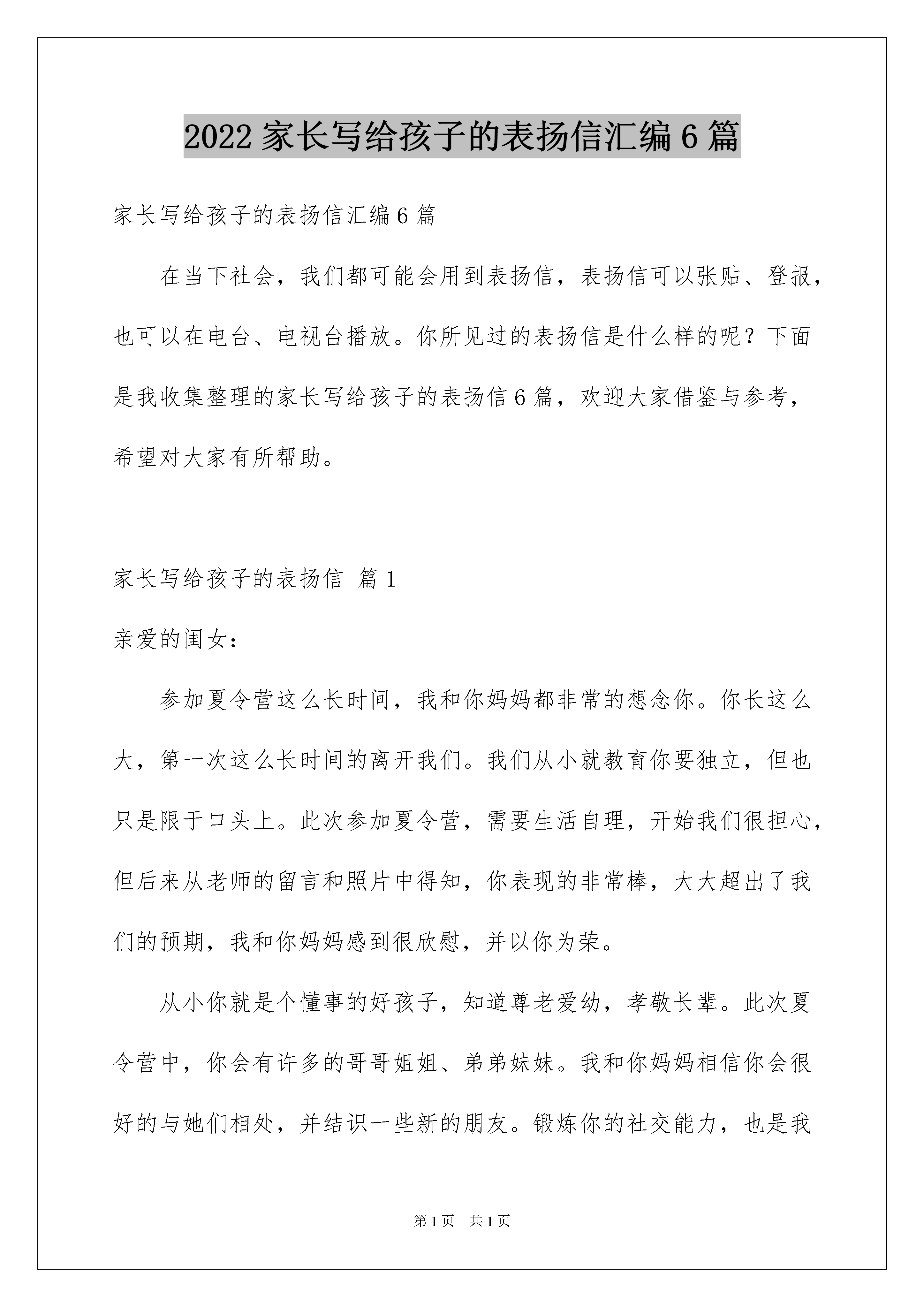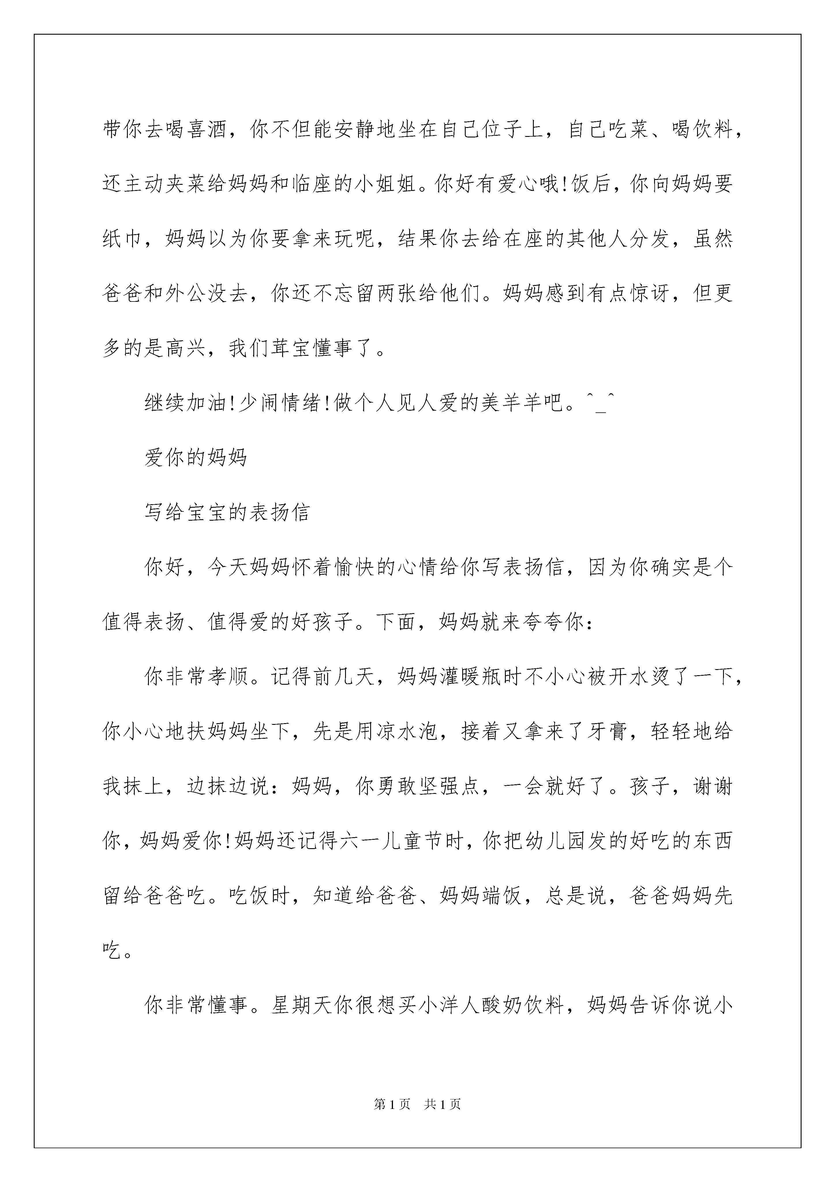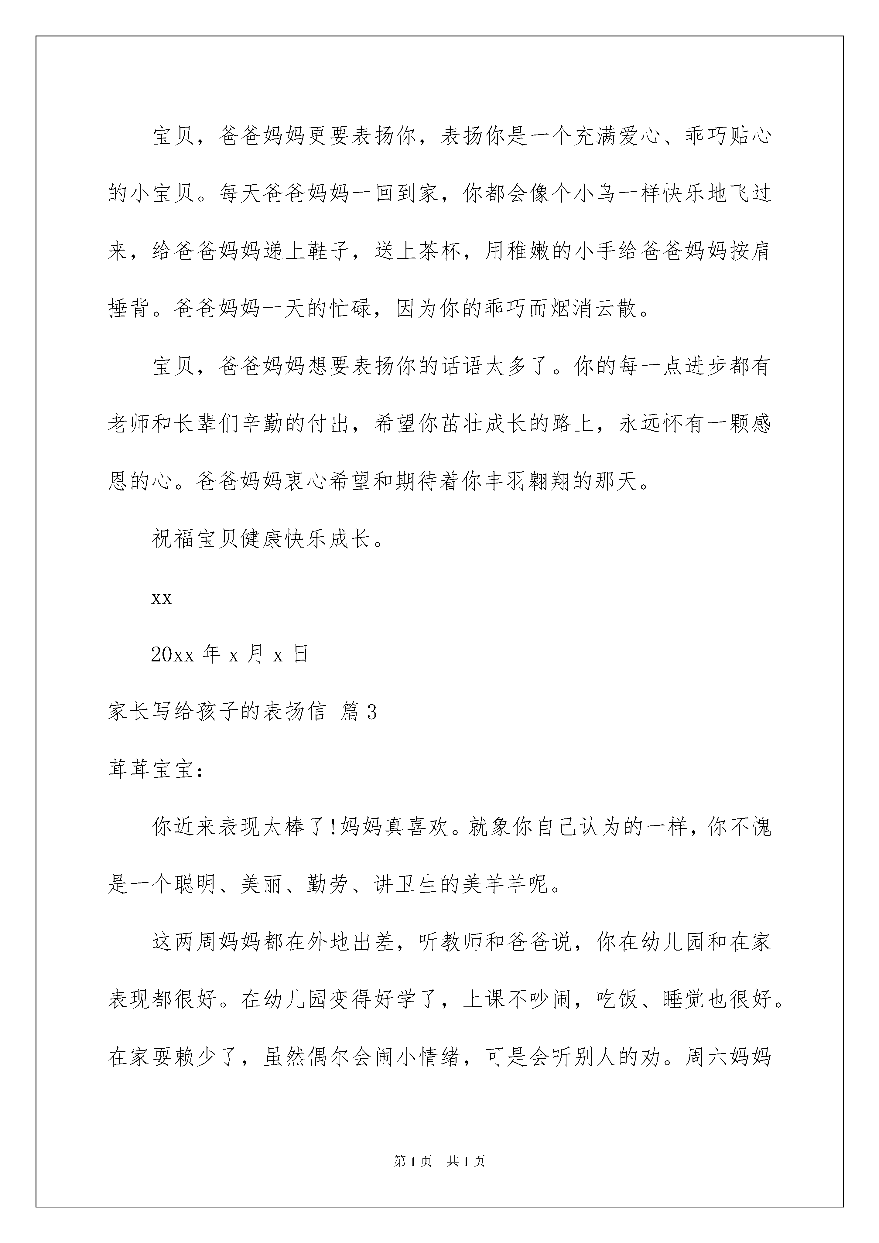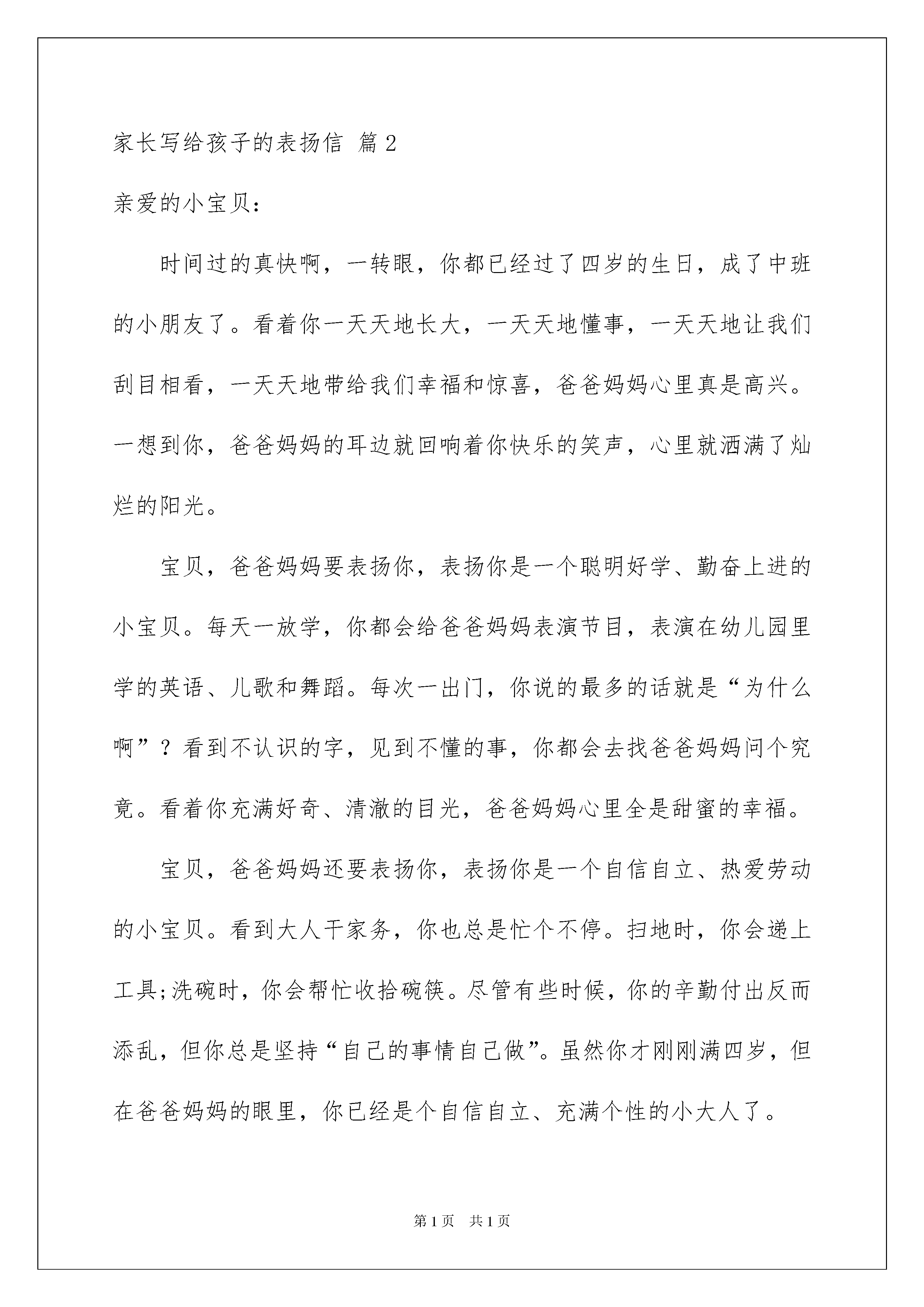 2022家长写给孩子的表扬信汇编6篇家长写给孩子的表扬信汇编6篇在当下社会,我们都可能会用到表扬信,表扬信可以张贴、登报,也可以在电台、电视台播放。你所见过的表扬信是什么样的呢?下面是我收集整理的家长写给孩子的表扬信6篇,欢迎大家借鉴与参考,希望对大家有所帮助。家长写给孩子的表扬信篇1亲爱的闺女:参加夏令营这么长时间,我和你妈妈都非常的想念你。你长这么大,第一次这么长时间的离开我们。我们从小就教育你要独立,但也只是限于口头上。此次参加夏令营,需要生活自理,开始我们很担心,但后来从老师的留言和照片中得知,你表现的非常棒,大大超出了我们的预期,我和你妈妈感到很欣慰,并以你为荣。从小你就是个懂事的好孩子,知道尊老爱幼,孝敬长辈。此次夏令营中,你会有许多的哥哥姐姐、弟弟妹妹。我和你妈妈相信你会很好的与她们相处,并结识一些新的朋友。锻炼你的社交能力,也是我们让你参加夏令营的目的之一。现在看你,你与同学们相处的非常愉快,这是你的成功,我和你妈妈为你高兴。中国传统文化是祖先留给我们的宝贵财富,此次学习国学,背诵精典,就是要在你的心里种下传统文化的种子。许多句子或许你还不能理解,但这并不重要,你的人生路还很长,古圣先贤讲的许多道理,你会逐步领悟。闺女,我们希望你多学国学,从古圣先贤那里学习到生活和做人的道理。相信经过夏令营的国学课程,你已经体会到国学并不是枯燥无味的,而是丰富多彩的。我和你妈妈相信,此次的夏令营活动,让你度过了一个非常有意义的暑假,或许你会终生难忘。你能在夏令营愉快的学习和成长,首先要感恩老师们的关爱,是他们的付出才让你们度过了一个难忘的假期;也要感恩山庄的工作人员,感恩你的同学,也感恩你的妈妈。感恩的心就是一颗最漂亮的心,我想,你已经懂得用感恩的心面对所有人。因为你不再为小事发脾气,懂得了多替别人着想,懂得了谦让。最后,我和你妈妈祝愿你更加勇敢、坚强、健康、快乐的成长。xx20xx年x月x日家长写给孩子的表扬信篇2亲爱的小宝贝:时间过的真快啊,一转眼,你都已经过了四岁的生日,成了中班的小朋友了。看着你一天天地长大,一天天地懂事,一天天地让我们刮目相看,一天天地带给我们幸福和惊喜,爸爸妈妈心里真是高兴。一想到你,爸爸妈妈的耳边就回响着你快乐的笑声,心里就洒满了灿烂的阳光。宝贝,爸爸妈妈要表扬你,表扬你是一个聪明好学、勤奋上进的小宝贝。每天一放学,你都会给爸爸妈妈表演节目,表演在幼儿园里学的英语、儿歌和舞蹈。每次一出门,你说的最多的话就是“为什么啊”?看到不认识的字,见到不懂的事,你都会去找爸爸妈妈问个究竟。看着你充满好奇、清澈的目光,爸爸妈妈心里全是甜蜜的幸福。宝贝,爸爸妈妈还要表扬你,表扬你是一个自信自立、热爱劳动的小宝贝。看到大人干家务,你也总是忙个不停。扫地时,你会递上工具;洗碗时,你会帮忙收拾碗筷。尽管有些时候,你的辛勤付出反而添乱,但你总是坚持“自己的事情自己做”。虽然你才刚刚满四岁,但在爸爸妈妈的眼里,你已经是个自信自立、充满个性的小大人了。宝贝,爸爸妈妈更要表扬你,表扬你是一个充满爱心、乖巧贴心的小宝贝。每天爸爸妈妈一回到家,你都会像个小鸟一样快乐地飞过来,给爸爸妈妈递上鞋子,送上茶杯,用稚嫩的小手给爸爸妈妈按肩捶背。爸爸妈妈一天的忙碌,因为你的乖巧而烟消云散。宝贝,爸爸妈妈想要表扬你的话语太多了。你的每一点进步都有老师和长辈们辛勤的付出,希望你茁壮成长的路上,永远怀有一颗感恩的心。爸爸妈妈衷心希望和期待着你丰羽翱翔的那天。祝福宝贝健康快乐成长。xx20xx年x月x日家长写给孩子的表扬信篇3茸茸宝宝:你近来表现太棒了!妈妈真喜欢。就象你自己认为的一样,你不愧是一个聪明、美丽、勤劳、讲卫生的美羊羊呢。这两周妈妈都在外地出差,听教师和爸爸说,你在幼儿园和在家表现都很好。在幼儿园变得好学了,上课不吵闹,吃饭、睡觉也很好。在家耍赖少了,虽然偶尔会闹小情绪,可是会听别人的劝。周六妈妈带你去喝喜酒,你不但能安静地坐在自己位子上,自己吃菜、喝饮料,还主动夹菜给妈妈和临座的小姐姐。你好有爱心哦!饭后,你向妈妈要纸巾,妈妈以为你要拿来玩呢,结果你去给在座的其他人分发,虽然爸爸和外公没去,你还不忘留两张给他们。妈妈感到有点惊讶,但更多的是高兴,我们茸宝懂事了。继续加油!少闹情绪!做个人见人爱的美羊羊吧。^_^爱你的妈妈写给宝宝的表扬信你好,今天妈妈怀着愉快的心情给你写表扬信,因为你确实是个值得表扬、值得爱的好孩子。下面,妈妈就来夸夸你:你非常孝顺。记得前几天,妈妈灌暖瓶时不小心被开水烫了一下,你小心地扶妈妈坐下,先是用凉水泡,接着又拿来了牙膏,轻轻地给我抹上,边抹边说:妈妈,你