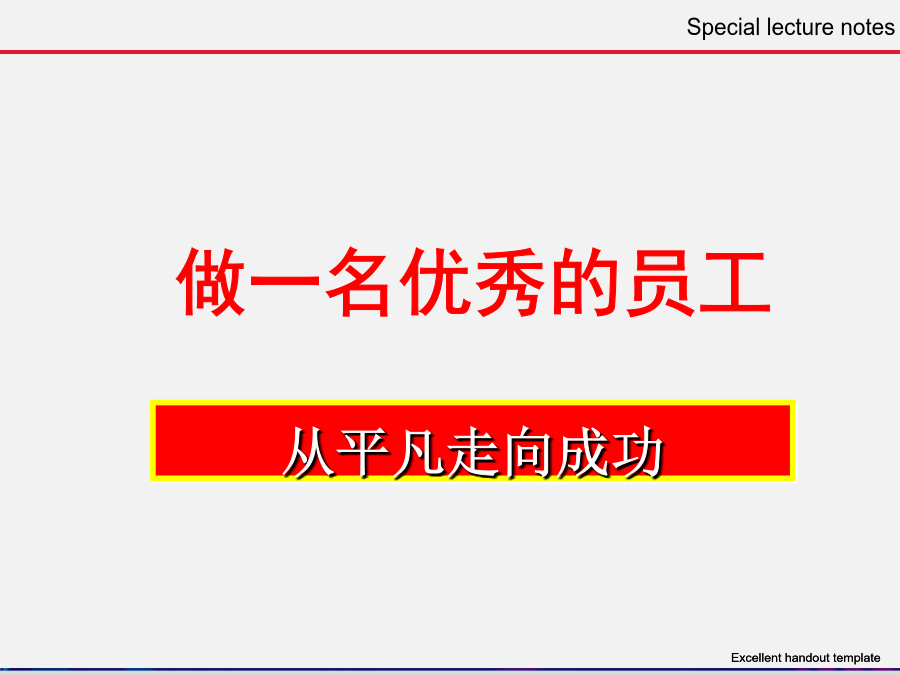 做一名优秀的员工第一讲:心态决定命运知识、技巧、态度是影响工作进行的三个重要因素,其中态度尤其扮演着带动的角色。二十一世纪怎样才会赢?赢每天,当太阳升起来的时候,非洲大草原上的动物们就开始奔跑了。羚羊妈妈在教育自己的孩子:“孩子,你必须跑得再快一点,再快一点,如果你不能比跑得最快的狮子还要快,那你就肯定会被他们吃掉。在另外一个场地上,狮子妈妈也在教育自己的孩子:“孩子,你必须跑得再快一点,再快一点。为什么?一流的企业由一流的员工组成企业不是缺少目标,是缺少达成目标的人个人成功的六个心态比尔盖次愿跟什么样的人合作?舍老子曰:企者不立,跨者不行;自见者不明,自是者不彰;自伐者无功;自矜者不长。踮起脚跟想站得高一点,反而站不稳;急切的大跨步前行,反而走不快;自我显示的人,反而不能显明;自以为是的人,反而不能彰显;自我夸耀的人,反而是无功劳之人;自高自大的人,反而不能持久。个人成功的六个心态从致加西亚的信你感悟到什么?怎样才是一个有责任心的人认真负责「朱熔基:作风正派,工作很有魄力,很有实干精神。他来上海以後,不但使上海的各方面工作有很大起色,而且也深得人民群众拥护。懂经济。」自朱熔基到国务院出任副总理职务後,立刻开始了陆续到全国各地视察的活动。两年半时间以後,他的足迹几乎踏过了中国的每一个省级行政区域。「我到上海当了几年市长,头发掉了不少,到北京当了几年副总理,头发白了不少。我宁愿把头发掉光,也要把中国经济搞上去!」1998年3月任中华人民共和国总理基层要有责任心中层除了责任心还要有上进心高层除了责任心、上进心还要有事业心----联想柳传志个人成功的六个心态敬业是成功的第一步我们可能没有比别人更聪明;但是我们可以更努力个人成功的六个心态从千手观音看我们的团队为什么现代企业都在学习狼的精神?唯有合作才能双赢群体合作达成多赢成员关系:决定团队的整体效能个人成功的六个心态我们为什么要学习?品牌高度你你是那一块温水里的青蛙故事告诉我们什么道理经验过时学历贬值能力褪化普通员工晋升至经理的比率为45%,经理至总监的晋升率13%,总监至副总经理的晋升率3%,副总经理晋升至总经理不足0.2%你面对的,是迅速成长的群体,是整个新生代的挑战!先贤对德、识、才、学的关系而言学习三修个人成功的六个心态愤世嫉俗,认为人性丑恶,与人不和;没有目标,缺乏动力,不思进取;缺乏恒心,经常为自己寻找借口和合理化的理由;心存侥幸,不愿付出;固执己见,不能宽容人;自卑懦弱,无所事事;自高自大,清高虚荣,不守信用,等等。有必胜的信念;善于称赞别人;乐于助人,具有奉献精神;微笑常在,乐观自信;能使别人感到你的重要。我是最棒的我是最优秀的我是成功者阳光思维寻找每个人身上最好的东西你眼睛盯住什么你肯定就能看到什么寻找别人身上最好的东西能促使他们努力做到最好并且创造出一个积极的、卓有成效的环境阳光思维阳光思维阳光思维对人生、对大自然的一切东西心存感激人生就会美好许多感恩伤害我的人,因为他磨练了我的心志;感恩绊倒我的人,因为他强化了我的双腿;感恩欺骗我的人,因为他增进了我的智慧;感恩蔑视我的人,因为他醒觉了我的自尊;感恩遗弃我的人,因为他培养了我的自立;…………我永远心存感恩,感恩一切使我成长的人!我来自偶然,象一颗尘土有谁看出我的脆弱我来自何方,我情归何处谁在下一刻呼唤我每件事的发生,必有其原因,皆有利于我;没有失败,只有结果;过去并不代表未来;每个人都有无限的潜力;我是100%负责任的人;我热爱自己的工作;每天进步一点点;立即行动,全力以赴,坚持到底。THANKYOUSWOT分析模板SWOT分析是市场营销管理中经常使用的功能强大的分析工具,最早是由美国旧金山大学的管理学教授在80年代初提出来的:S代表strength(优势),W代表weakness(弱势),O代表opportunity(机会),T代表threat(威胁)。市场分析人员经常使用这一工具来扫描、分析整个行业和市场,获取相关的市场资讯,为高层提供决策依据,其中,S、W是内部因素,O、T是外部因素。它在制定公司发展战略和进行竞争对手分析中也经常被使用。SWOT的分析技巧类似于波士顿咨询(BCG)公司的增长/份额矩阵(TheGrowth/ShareMatrix),SWOT行业分析适用范围SW优势与劣势分析(内部环境分析)OT机会与威胁分析(外部环境分析)OT机会与威胁分析方法一:PEST法OT机会与威胁分析方法一:波特五力模型构造SWOT矩阵制订行动计划