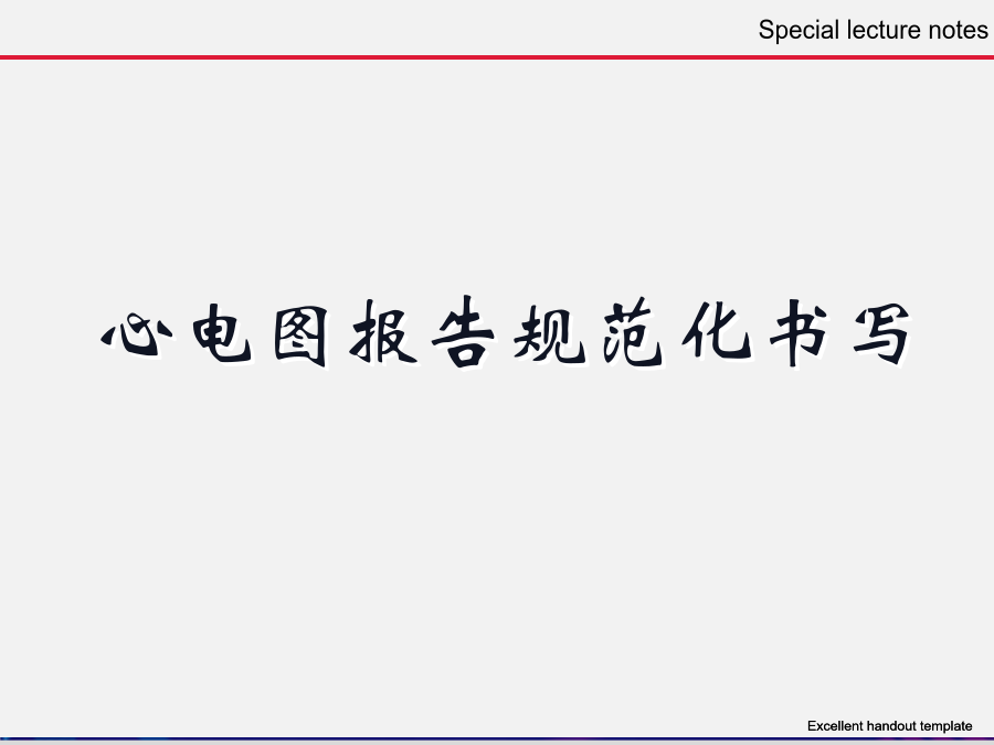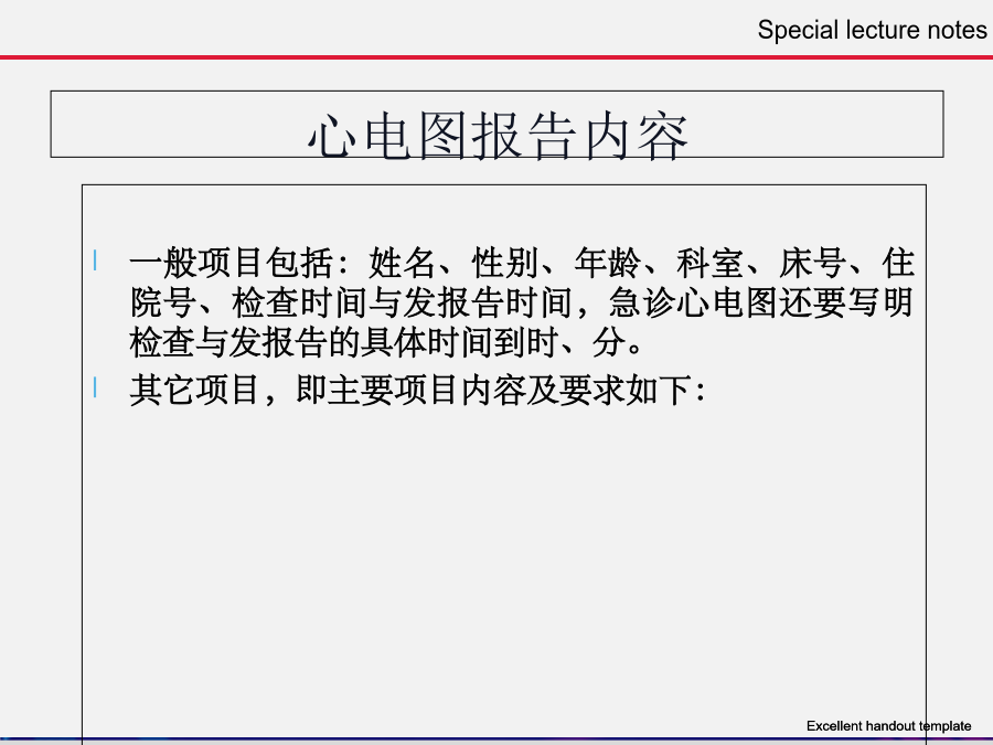 心电图报告规范化书写一般项目包括:姓名、性别、年龄、科室、床号、住院号、检查时间与发报告时间,急诊心电图还要写明检查与发报告的具体时间到时、分。其它项目,即主要项目内容及要求如下:一、心律心律是指整幅心电图的主导心律。一般是窦性心律。如主导心律不是窦性时,则写异位心律。2、异位心律①有P波,但不符合窦性P波标准。如结内折返性心动过速、左房心律,冠状窦心律等。②有P波,但P波落在QRS中而看不清,如阵发性室上性心动过速、结内折返性心动过速及房室折返性心动过速等。③P波消失,代以F波或f波等,如心房纤颤、心房扑动等。④P-QRS-T波群消失,代以VF、Vf波,即室扑、室颤。常见异位心律有:心房纤颤、心房扑动、各种房性心律、交界性心律、阵发性室上性心动过速及各种类型的折返性心动过速,伴逆向传导的室性心律、室扑及室颤等。逆行P波即aVR导联P波正向,II、III、aVF导联P波倒置。二、各波与波段的测量及各种数据的填写用报告单形式发报告,全部数据要按实测值填写。用分规测量得出的实测值用秒表示。3、QRS时限即Q波起点至S波终点的时间间期。为心室除极所需的总时限。正常值:成人0.06s~0.10s。一般用V1V2导联测量。以<110ms为正常,≥110ms,<120ms为室内传导延缓,≥120ms为室内传导阻滞。4、Q-T间期Q-T间期是指从QRS波起点至T波终末的时间间期。即心室激动所需总时间。一般在V4导联或T波明显的导联测量。正常Q-T间期与心率成反比,心率越快Q-T间期越短,正常Q-T间期为60到100次/分心率时Q-T间期对应最高值为0.44s至0.34s。5、电轴电轴是指心室除极过程中,额面QRS环最大向量与X轴夹角的度数。正常额面QRS电轴为0~+90,通常用电轴不偏表示。超出此范围分别称为电轴左偏、电轴右偏。电轴测量分目测法与查表法。四、ST段改变的描述正常情况下ST段在等电位线上,部分有轻度偏移,向上抬高≤0.1mV,向下水平型压低<0.05mV。但V1~V3导联R波电压正常情况下可上斜型抬高0.1mV~0.3mV,正常ST段时限在0.12s以内,一般不超过0.14s。凡超过上述标准为异常。ST段改变分:抬高、压低与平直延长三种情况。1、抬高与压低ST段抬高与压低应描述其形态与抬高、压低的幅度。ST段抬高形态:常见ST段抬高分弓背型、凹面向上型、近水平型、斜上型与斜下型五种。ST段压低形态:常见ST段分下垂型、水平型(缺血型)、近似水平型(近似缺血型)与斜上型(单纯J点型压低)四种。ST段抬高或压低的幅度测量:通常ST段抬高或压低测量基点为P-R段近Q波起点处(以前用T-P段做基线)。ST段抬高时测量以J点后0.08s处。ST段抬高或压低的幅度一般用mV表示2、ST段平直延长通常ST段呈上斜形,后半部与T波升支难以区分。ST段平直部分达0.15s称为平直延长。ST段平直延长时ST段与T波夹角变锐利要单独描述。五、T波T波是心室的复极波。正常T波时限较宽,约0.10s~0.25s之间。顶稍圆钝,升肢较缓慢,降肢较陡峭。T波电压:以R波为主导联T波高度应大于1/10R。但电压不能过高。肢导联T波电压通常≤0.5mV,胸导联≤1.0mV。T波方向:(1)aVR导联必需倒置。(2)I、II、V4~V6导联应正向并>1/10R。(3)V3、aVF导联以R波为主时必须正向。(4)III、aVL、V1、V2导联可正向、低平、双向或倒置。发报告时必须认识正常T波特征,凡不符合上述特征的应描述清楚。书写心电图报告主要描述T波方向,如有电压异常(过高、过平、双向或倒置)同时描述清楚。诊断时就要根据描述判断T波是否异常。六、U波正常U波出现在T波后0.02s~0.04s,方向与T波一致,时限约0.1s~0.2s,电压不应超过T波1/2,肢导联U波电压<0.05mV,胸导联U波电压<0.2mV(三基要求),V2V3导联一般不超过0.3mV,且T-U无融合现象。凡不符合上述标准为异常。如以R波为主导联U波双向、倒置,或电压大于上述标准,或呈现T-U融合,应描述清楚。七、心电图特征除上述各项在相应项目上描述外,其他心电图特征均在此栏描述。如肢导联或胸导联低电压、电轴偏移、超过正常值的R波电压(如RV5、RV1、RI、SV5、SV1电压)、各种早搏的特征、房颤、房扑特征、房室传导比例、U波特征、Q波异常特征,如报告单有P波、QRS波、ST段或T波异常时应描述清楚哪些导联改变。总之,最后下的所有诊断必需在报告单上找到其依据。八、结合临床资料进行心电图诊断对心律失常即有确诊的价值。需要行心内电生理检查方可明确。结合临床资料,急性心肌梗死、急性肺原性心脏病及急性心包积液等也可获得确诊。虽然单次静态的ST-T改变对诊断心肌缺血并无意义,但如果在不同时期所记