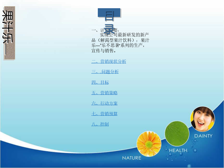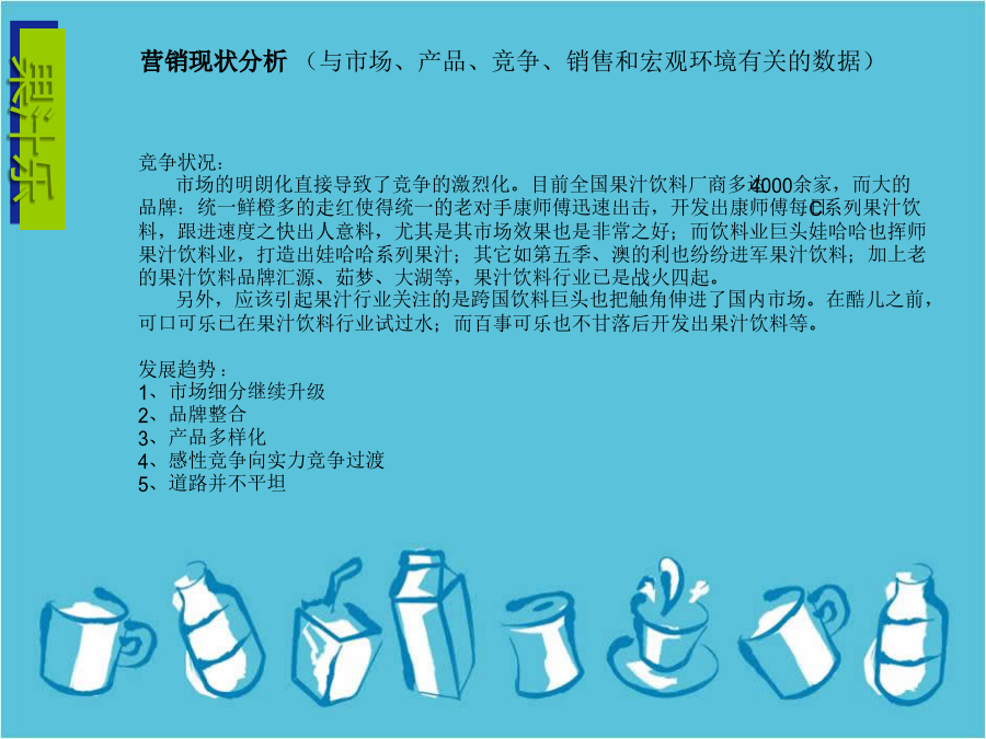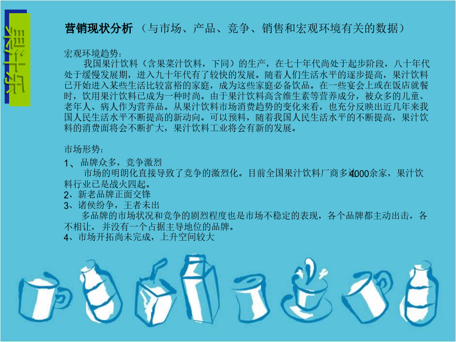 新饮料如何进入市场营销计划书果汁乐—“乐不思暑”系列果汁乐—“乐不思暑”系列果汁乐—“乐不思暑”系列果汁乐—“乐不思暑”系列问题分析(机会和威胁、优势和劣势以及计划中所面临的问题)果汁乐—“乐不思暑”系列果汁乐—“乐不思暑”系列果汁乐—“乐不思暑”系列果汁乐—“乐不思暑”系列果汁乐—“乐不思暑”系列谢谢观赏THANKYOUSWOT分析模板SWOT分析是市场营销管理中经常使用的功能强大的分析工具,最早是由美国旧金山大学的管理学教授在80年代初提出来的:S代表strength(优势),W代表weakness(弱势),O代表opportunity(机会),T代表threat(威胁)。市场分析人员经常使用这一工具来扫描、分析整个行业和市场,获取相关的市场资讯,为高层提供决策依据,其中,S、W是内部因素,O、T是外部因素。它在制定公司发展战略和进行竞争对手分析中也经常被使用。SWOT的分析技巧类似于波士顿咨询(BCG)公司的增长/份额矩阵(TheGrowth/ShareMatrix),SWOT行业分析适用范围SW优势与劣势分析(内部环境分析)OT机会与威胁分析(外部环境分析)OT机会与威胁分析方法一:PEST法OT机会与威胁分析方法一:波特五力模型构造SWOT矩阵制订行动计划