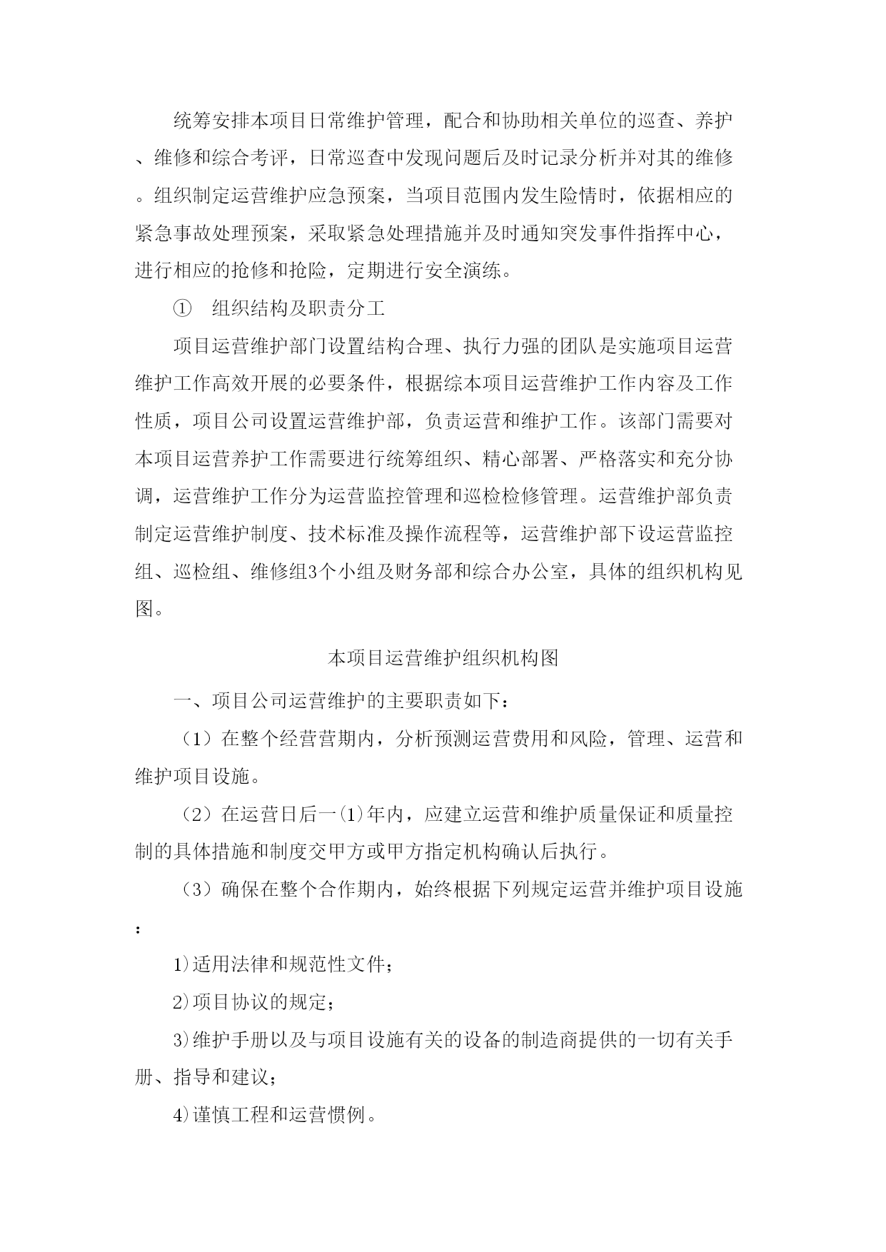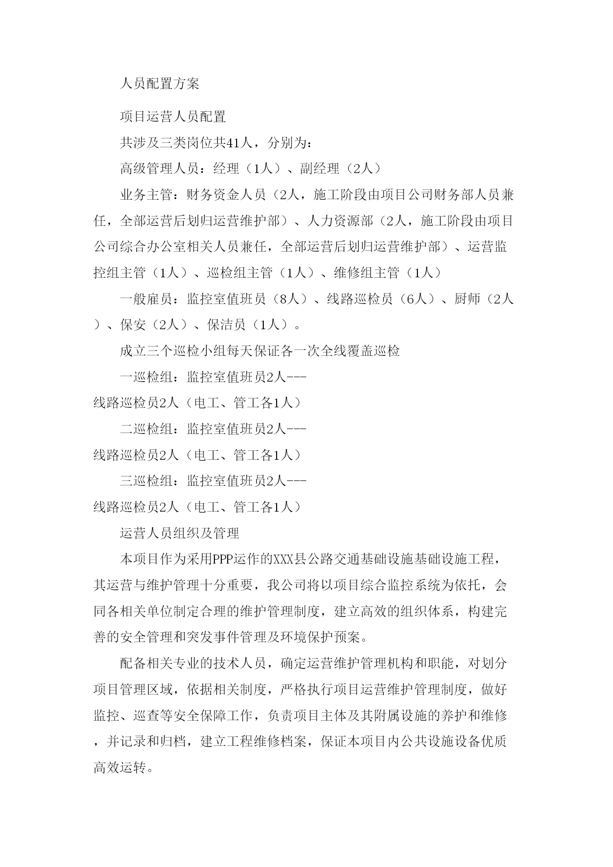文件编码(GHTU-UITID-GGBKT-POIU-WUUI-8968)PPP项目运营方案人员配置方案项目运营人员配置共涉及三类岗位共41人,分别为:高级管理人员:经理(1人)、副经理(2人)业务主管:财务资金人员(2人,施工阶段由项目公司财务部人员兼任,全部运营后划归运营维护部)、人力资源部(2人,施工阶段由项目公司综合办公室相关人员兼任,全部运营后划归运营维护部)、运营监控组主管(1人)、巡检组主管(1人)、维修组主管(1人)一般雇员:监控室值班员(8人)、线路巡检员(6人)、厨师(2人)、保安(2人)、保洁员(1人)。成立三个巡检小组每天保证各一次全线覆盖巡检一巡检组:监控室值班员2人---线路巡检员2人(电工、管工各1人)二巡检组:监控室值班员2人---线路巡检员2人(电工、管工各1人)三巡检组:监控室值班员2人---线路巡检员2人(电工、管工各1人)运营人员组织及管理本项目作为采用PPP运作的XXX县公路交通基础设施基础设施工程,其运营与维护管理十分重要,我公司将以项目综合监控系统为依托,会同各相关单位制定合理的维护管理制度,建立高效的组织体系,构建完善的安全管理和突发事件管理及环境保护预案。配备相关专业的技术人员,确定运营维护管理机构和职能,对划分项目管理区域,依据相关制度,严格执行项目运营维护管理制度,做好监控、巡查等安全保障工作,负责项目主体及其附属设施的养护和维修,并记录和归档,建立工程维修档案,保证本项目内公共设施设备优质高效运转。统筹安排本项目日常维护管理,配合和协助相关单位的巡查、养护、维修和综合考评,日常巡查中发现问题后及时记录分析并对其的维修。组织制定运营维护应急预案,当项目范围内发生险情时,依据相应的紧急事故处理预案,采取紧急处理措施并及时通知突发事件指挥中心,进行相应的抢修和抢险,定期进行安全演练。①组织结构及职责分工项目运营维护部门设置结构合理、执行力强的团队是实施项目运营维护工作高效开展的必要条件,根据综本项目运营维护工作内容及工作性质,项目公司设置运营维护部,负责运营和维护工作。该部门需要对本项目运营养护工作需要进行统筹组织、精心部署、严格落实和充分协调,运营维护工作分为运营监控管理和巡检检修管理。运营维护部负责制定运营维护制度、技术标准及操作流程等,运营维护部下设运营监控组、巡检组、维修组3个小组及财务部和综合办公室,具体的组织机构见图。本项目运营维护组织机构图一、项目公司运营维护的主要职责如下:(1)在整个经营营期内,分析预测运营费用和风险,管理、运营和维护项目设施。(2)在运营日后一(1)年内,应建立运营和维护质量保证和质量控制的具体措施和制度交甲方或甲方指定机构确认后执行。(3)确保在整个合作期内,始终根据下列规定运营并维护项目设施:1)适用法律和规范性文件;2)项目协议的规定;3)维护手册以及与项目设施有关的设备的制造商提供的一切有关手册、指导和建议;4)谨慎工程和运营惯例。(4)确保项目设施始终处于良好营运状态并能够以安全、连续和稳定的方式提供符合适用法律和本协议要求的服务。按照甲方或甲方指定机构要求,每月提交运营成本资料以及甲方或甲方指定机构可合理要求提供的有关乙方财务状况的其它资料。二、做好日常的运营、维护和修理记录,我方保证确保:(1)对运营、维护和修理项目的情况进行详细记录;(2)准许甲方或甲方指定机构在给予合理通知后于正常工作时间对其运营维护情况进行检查并查阅和复制上述记录。甲方和甲方指定机构承诺若乙方的上述记录可能包含商业秘密的,其应尽合理努力予以保密。三、接受监督与检查(1)甲方或甲方指定机构有权派出监督员或者指定任何代表在任何时候进入项目场地,以监察我方项目设施的运营和维护。(2)应甲方或甲方指定机构的要求,我方在十(10)日内提供:1)自运营日起,在每个季度结束后的十(10)个工作日内提交的一份关于项目运营和维护的报告;2)向甲方或甲方指定机构提交认为必要的任何其他运营和维护资料和信息。四、甲方介入运营或维护的权利如果甲方或甲方指定机构认为:我方未能按照本协议的规定运营或维护项目,且我方在收到甲方或甲方指定机构通知后的三十(30)个工作日或双方另行商定的合理期限内未能就上述情况进行补救的,则甲方或甲方指定机构有权自行或者委托第三方介入项目运营和维护工作,费用和风险均由我方承担。甲方或甲方指定机构有权在向我方提供详细的费用和支出记录后,从运营维护保函项下提取该款项。五、对项目进行变动在运营期内,项目公司征得甲方或甲方指定机构书面同意后可以对项目进行更新改造,改造程序和费用适用项目协议有关(乙方要求的变动)的规定。六、项目大修在运营期内,需对本项目进行大修的,我公司在事先报经甲方或其指定机构书面同意,并应取得相应的许可和批准。本协议所述运维绩效服务费不包括大修费