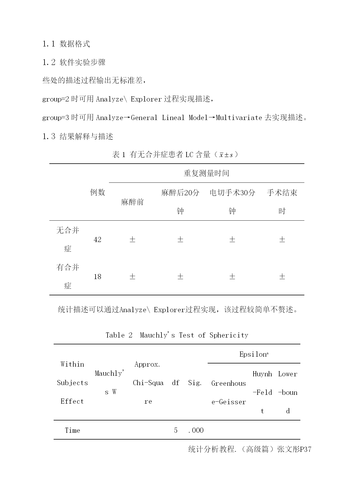 重复测方差分析实例操作分析过程1.数据格式2.软件实验步骤3.结果解释与描述原始数据groupt0t1t2t3groupt0t1t2t31010101010101010101010101010101010100000000000000000000000010数据格式软件实验步骤些处的描述过程输出无标准差,group=2时可用Analyze\Explorer过程实现描述,group=3时可用Analyze→GeneralLinealModel→Multivariate去实现描述。结果解释与描述表1有无合并症患者LC含量()例数重复测量时间麻醉前麻醉后20分钟电切手术30分钟手术结束时无合并症42±±±±有合并症18±±±±统计描述可以通过Analyze\Explorer过程实现,该过程较简单不赘述。Table2Mauchly'sTestofSphericityWithinSubjectsEffectMauchly'sWApprox.Chi-SquaredfSig.EpsilonaGreenhouse-GeisserHuynh-FeldtLower-boundTime5.000统计分析教程.(高级篇)张文彤P37也就是说,在分析时,我们首先要判断,重复测量的不同时间点之间的结果是否存在相关性,也就是进行球形检验,即Mauchly'sTestofSphericity。如果P<,不符合Huynh-Feldt条件,说明重复测量数据之间存在相关性,不可按单因素方差分析方法处理,需要进行多变量方差分析。以多元检验结果为准。统计分析教程.(高级篇)张文彤P41如果P>,符合Huynh-Feldt条件,说明重复测量数据之间不存在相关性,可按单因素方差分析方法处理。统计分析教程.(高级篇)张文彤P40本例由Table2Mauchly'sTestofSphericity可知,P<,不符合Huynh-Feldt条件,说明重复测量数据之间存在相关性,不可按单因素方差分析方法处理,需要进行多变量方差分析,以多元检验结果为准。Table3MultivariateTestsEffectValueFHypothesisdfErrordfSig.TimePillai'sTrace.271.000Wilks'Lambda.729.000Hotelling'sTrace.372.000Roy'sLargestRoot.372.000Time*groupPillai'sTrace.292.000Wilks'Lambda.708.000Hotelling'sTrace.411.000Roy'sLargestRoot.411.000多变量方差分析结果如Table3MultivariateTests所示,四种检验结果Time和Time*group的P值均<,说明时间因素以及时间因素和分组的交互作用有统计学意义,即测量指标有随时间变化的趋势并且时间因素的作用随着分组的不同而不同。Table4TestsofBetween-SubjectsEffectsSourceTypeIIISumofSquaresdfMeanSquareFSig.Intercept1.000group1.035Error58.291表4组间效应的检验。F=,P=,说明不同合并症患者的LC含量有差别。综上,也就是说患者LC含量随手术时间的变化趋势不同,且这种变化趋势随着合并症(有/无)分组情况不同而不同。如下图所示。