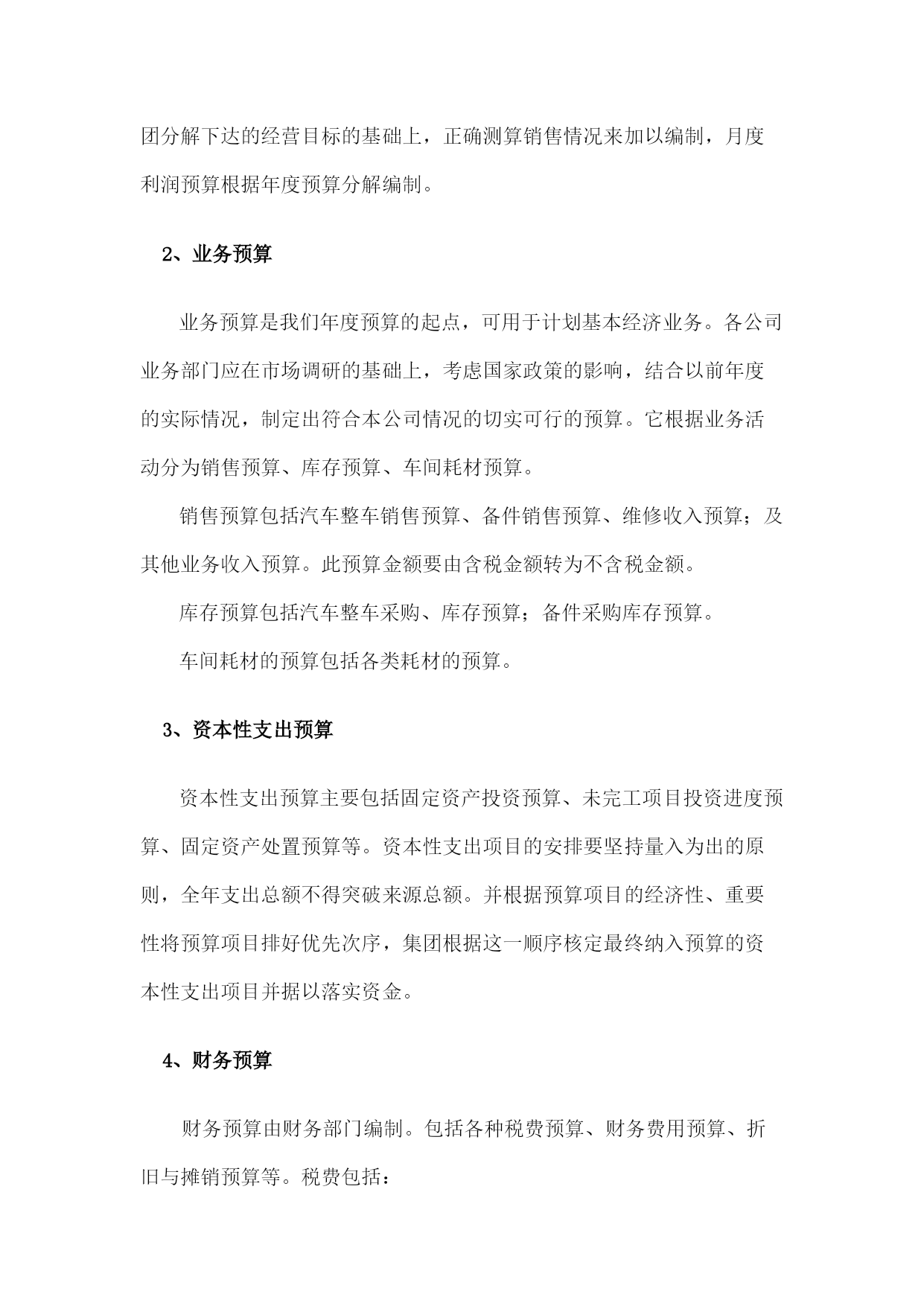文件编码(GHTU-UITID-GGBKT-POIU-WUUI-8968)4S店预算管理规定2005年预算管理制度(乘用车)目录2005年预算管理系统实现集团整体预算体系建立、预算样表和预算项目的下发、各单位预算编制、预算执行与控制、预算调整、预算执行上报、预算分析全过程管理。以此形成对管理层、上级管理者对下级管理者进行业绩评价和提供激励政策的依据和约束行为的重要手段。2005年预算管理系统的主要特点表现为:(1)预算管理以销售预算为龙头,为提高经济效益创造了条件;(2)预算管理以成本费用控制为重点,为提高经济效益奠定基础;(3)预算管理以资金平衡为准绳,为提高经济效益提供保证。一、预算管理基本内容预算是为确保集团战略目标实现的组织手段。2005年的预算包括业务预算、资本性支出预算、财务预算、费用预算、汇总预算等。支持从销售计划→采购计划→投资计划→费用计划→损益计划的全面的预算编制过程。1、利润预算(损益预算)利润预算包括销售收入、销售成本、税金及附加、营业费用、管理费用、财务费用预算等。要求根据资产经营管理考核目标,在确保完成集团分解下达的经营目标的基础上,正确测算销售情况来加以编制,月度利润预算根据年度预算分解编制。2、业务预算业务预算是我们年度预算的起点,可用于计划基本经济业务。各公司业务部门应在市场调研的基础上,考虑国家政策的影响,结合以前年度的实际情况,制定出符合本公司情况的切实可行的预算。它根据业务活动分为销售预算、库存预算、车间耗材预算。销售预算包括汽车整车销售预算、备件销售预算、维修收入预算;及其他业务收入预算。此预算金额要由含税金额转为不含税金额。库存预算包括汽车整车采购、库存预算;备件采购库存预算。车间耗材的预算包括各类耗材的预算。3、资本性支出预算资本性支出预算主要包括固定资产投资预算、未完工项目投资进度预算、固定资产处置预算等。资本性支出项目的安排要坚持量入为出的原则,全年支出总额不得突破来源总额。并根据预算项目的经济性、重要性将预算项目排好优先次序,集团根据这一顺序核定最终纳入预算的资本性支出项目并据以落实资金。4、财务预算财务预算由财务部门编制。包括各种税费预算、财务费用预算、折旧与摊销预算等。税费包括:1、价外税增值税2、计入成本的税金及附加3、计入费用的税费4、所得税;财务费用包括贷款利息支出、应付票据利息、手续费等;折旧与摊销包括固定资产折旧、低值易耗品摊销、待摊费用摊销、开办费及无形资产摊销等。5、费用预算费用预算按部门分类,分:总经理室、人事行政部、财务部、销售部、售后服务部、市场部。汇总了25个费用项目,细化到64个明细项目。各部门根据费用项目列支本部门的费用计划,各单位财务部将各部门费用预算汇总归入到营业费用、管理费用中去。经理室、人事行政部、财务部费用列入管理费用,其余部门的费用列入经营费用中。二、预算编制的方式1、各子公司是利润中心各子公司是经营机构,将其视为一个利润中心,在进行预算管理时,以利润、资金平衡为准绳。2、年度预算目标各子公司把集团年度预算目标作为预算的基础,结合以往年度经营状况和国家整体经济形势制定各自的年度预算目标,并将其分解到各责任中心,确保目标实现。3、预算编制过程预算编制自上而下、自下而上、上下结合。集团汇总预算指标与董事会制定的年度目标相比较,经过多次循环,反复修订,确定年度预算,预算一旦确定,就是硬性的。编制的重点是销售预算。预算科目与会计核算科目一致,各项标准依据集团规章制度。三、职责分工1、预算管理委员会预算管理委员会是集团预算的最高管理机构,董事长任主任。在委员会下设预算领导小组和工作小组:领导小组由执行总裁、各位副总裁组成;工作小组由集团财务部、商用车运营信息部、乘用车运营信息部、商贸等部门相关人员组成,财务副总裁牵头组织日常业务工作;集团财务部是本程序的归口管理部门,协助预算管理委员会完成公司年度财务预算的编制执行情况及预算调整,确保公司总体经营目标实现;2、利润中心预算分工各子公司负责本公司预算管理,总经理总体指挥,对各项指标进行审核,并对预算指标负责。(1)总经理室负责本室的市内交通费、差旅费、手机费、业务招待费、培训费、会务费、咨询费、等费用预算;并对预算数据负责。(2)人事行政部负责公司的工资及附加、职工保险金、劳动保护费(含员工工作服费)、培训费、网络使用费、办公设备维修费、福利费、公司的车辆使用费、电话费、办公费、等费用的预算;负责本部门的市内交通费、差旅费、手机费、业务招待费、培训费、会务费、咨询费等费用预算;并对预算数据负责。(3)财务部负责公司的财务费用、各项税金及附加、开办费、固定资产折旧以及年度资本性支出预算;负责本部门的市内交通费、差旅费、手机费、业务招待费、培训费、会务费、咨询费、等费用预算;并对预算数据负责。(4)销