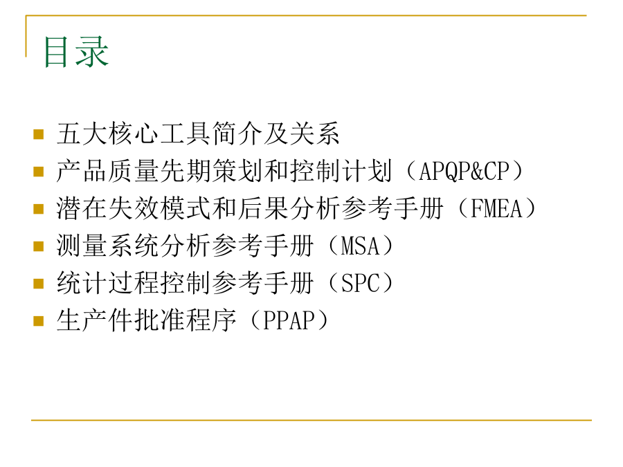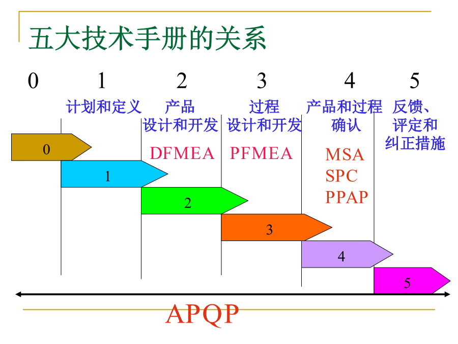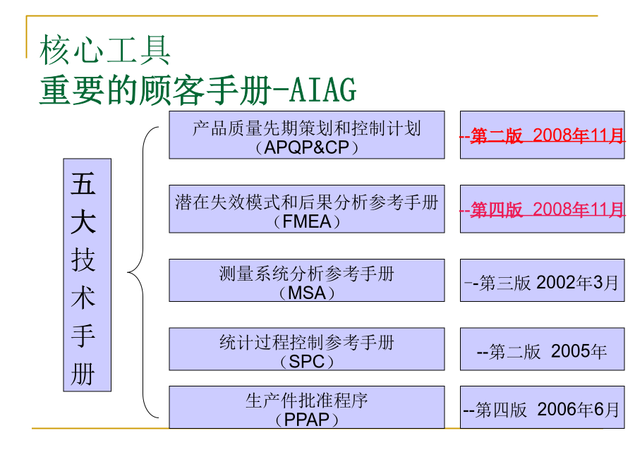 五大工具培训教材此文档后面有赠送常用PPT图标,方便大家修订排版编辑目录核心工具重要的顾客手册-AIAG五大技术手册的关系潜在失效模式与影响分析PotentialFailureModeandEffectsAnalysisFMEA什么是FMEA?FMEA的目的FMEA的种类PFMEA过程失效模式及效应分析PFMEA的输出FMEA表格讲解测量系统分析MeasurementSystemAnalysisMSA测量系统分析MSA定义对于大多数测量过程而言,总测量变差通常被描述为正态分布,正态概率被设想成为测量系统分析的标准方法。位置变差(准确度)一个表示准确的通用概念,它涉及一个或多个测量结果的平均值与一个参考值之间的一致的程度。测量过程必须处于统计控制状态,否则过程的准确度毫无意义。宽度变差(精密度)传统上,精密度描述了测量系统在操作范围(大小、量程和时间)内分辨力、灵敏度和重复性的最终影响。精密度最常用于描述测量范围内重复测量的预期变差,测量范围也许是大小或时间。偏倚对同样零件的同样特性,真值(基准值)和观测到的测量平均值的差值。测量系统的系统误差的测量。稳定性或称漂移,是测量系统在某一阶段时间内,测量同一基准或零件的单一特性时获得的测量总变差。换句话说,稳定性就是偏倚随时间的变化。线性在设备的预期操作(测量)范围内偏倚的不同被称为线性。线性可以被认为是关于偏倚大小的变化。重复性传统上,将重复性看作“评价人内”变异。它是由一个评价人,采用同一种测量仪器,多次测量同一零件的同一特性时获得的测量变差。它是设备本身固有的变差或性能。重复性一般指仪器的变差(EV)。事实上,重复性是从规定的测量条件下连续试验得到的普通原因(随机误差)变差。再现性传统上,把再现性看作“评价人之间”的变异。定义为由不同的评价人,采用相同的测量仪器,测量同一零件的同一特性时测量平均值的变差。通常指AV——评价人变差。量具重复性和再现性(R&R)的可接受性准则:重复性和再现性的接受准则统计过程控制StatisticalProcessControlSPC1、什么是SPCSPC的作用SPC常用术语解释名称变差的普通原因和特殊原因普通原因:是指过程在受控的状态下,出现的具有稳定的且可重复的分布过程的变差的原因。普通原因表现为一个稳定系统的偶然原因。只有过程变差的普通原因存在且不改变时,过程的输出才可以预测。特殊原因:(通常也叫可查明原因)是指造成不是始终作用于过程的变差的原因,即当它们出现时将造成(整个)过程的分布改变。只有特殊原因被查出且采取措施,否则它们将继续不可预测的影响过程的输出。每件产品的尺寸与别的都不同范围范围范围范围但它们形成一个模型,若稳定,可以描述为一个分布范围范围范围分布可以通过以下因素来加以区分位置分布宽度形状或这些因素的组合如果仅存在变差的普通原因,目标值线随着时间的推移,过程的输出形成一个稳定的分布并可预测。预测时间范围目标值线如果存在变差的特殊原因,随着时间的推预测移,过程的输出不稳定。时间范围过程控制受控(消除了特殊原因)时间范围不受控(存在特殊原因)过程能力受控且有能力符合规范(普通原因造成的变差已减少)规范下限规范上限时间范围受控但没有能力符合规范(普通原因造成的变差太大)管制图类型计量型数据控制图计数型数据控制图生产件批准程序ProductionPartApprovalProcessPPAP目的PPAP的提交1PPAP提交资料详细说明:2工程更改文件(如果有)在产品、零件和工装上已做了更改,但设计记录尚未体现。无论是否顾客设计的产品,若有工程(产品设计)更改,必须获得授权的工程更改文件。3顾客工程批准(如果需要)当设计记录有规定时,无论顾客设计的或自行设计的产品。具有顾客产品工程批准的证据。4DFMEA针对有设计职责的组织。初次确定产品的特殊特性。散装材料,当材料要求检查表中有规定要求时,要在D-FMEA前准备一份设计矩阵表。5过程流程图从进货到存储、发运,产品的全过程。描绘整个过程步骤、顺序。对于共性零件,可采用通用的流程图。可采用自己的格式,除非顾客要求。对于散装材料,对应于过程流程描述。6PFMEA采用AIAG《FMEA》参考手册。分析特性失效对后续过程、装配、最终用户、政府法规、安全等的影响和严重程度。进一步确定产品和过程的特殊特性。从人、机、料、法、环方面寻找根本原因、机理。尽量采取防错措施。一族相似零件和材料制造过程可采用共同的FMEA。散装材料,有关严重度、发生频度、和不可探测度的评分系统,。7尺寸检验结果按设计记录和控制计划进行尺寸验证。针对不同的生产过程、加工单元、生产线、冲模、铸模、工装或模型要分别取样检验验证。对所有产品尺寸特性检验-即全尺寸检验。对所有零件做唯一标识,对应尺寸检验结果。将其中之一做为标准样件,对应