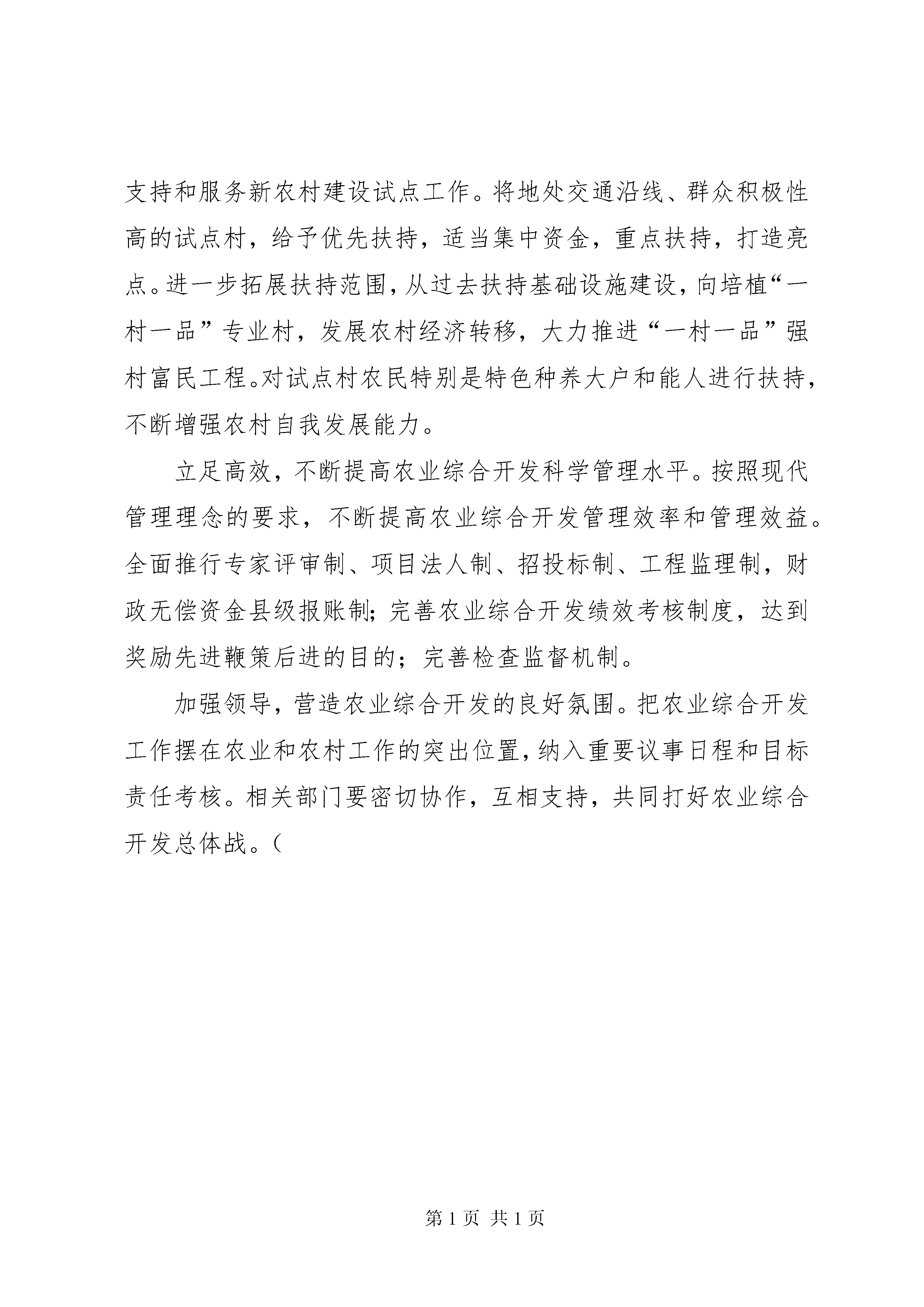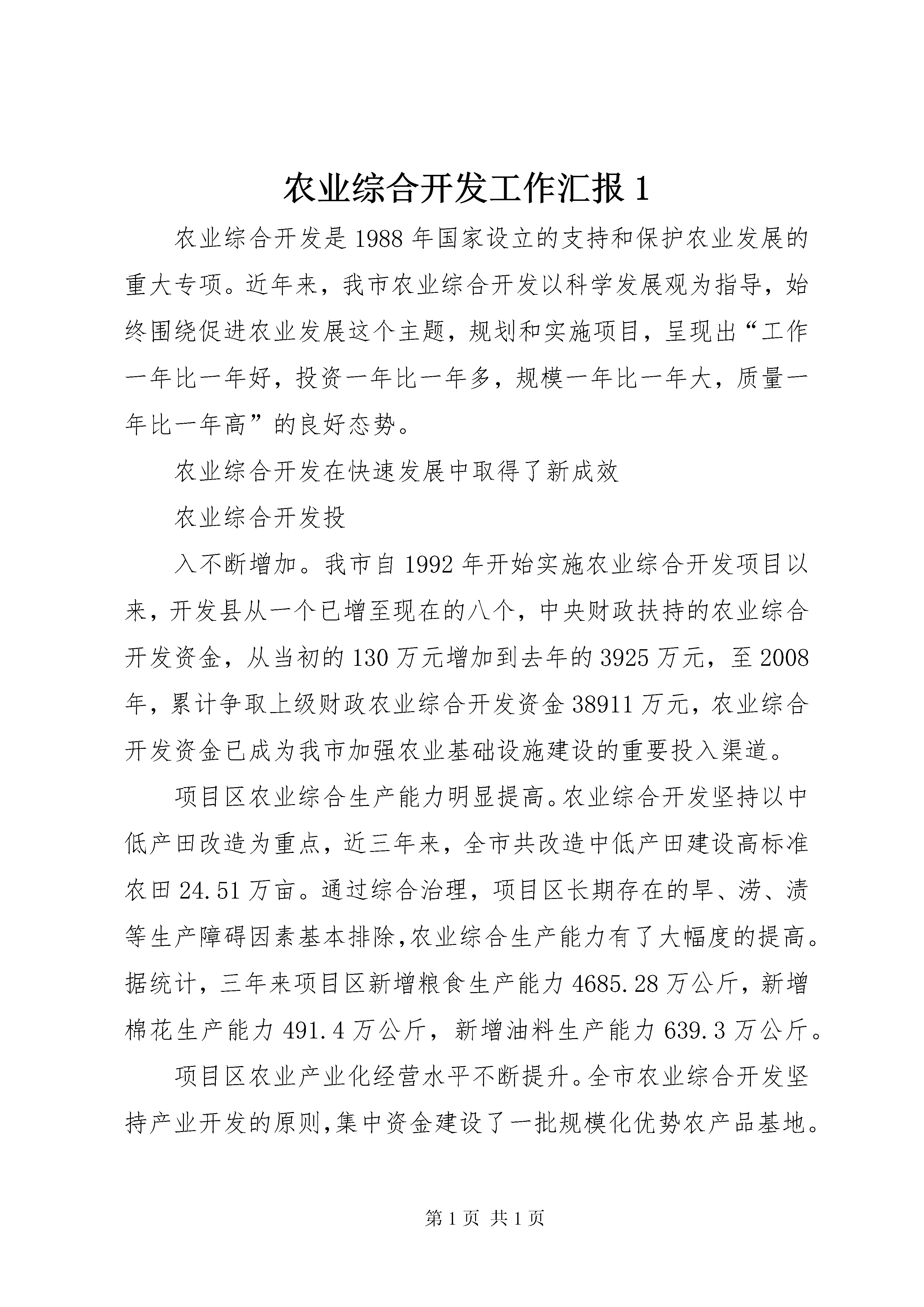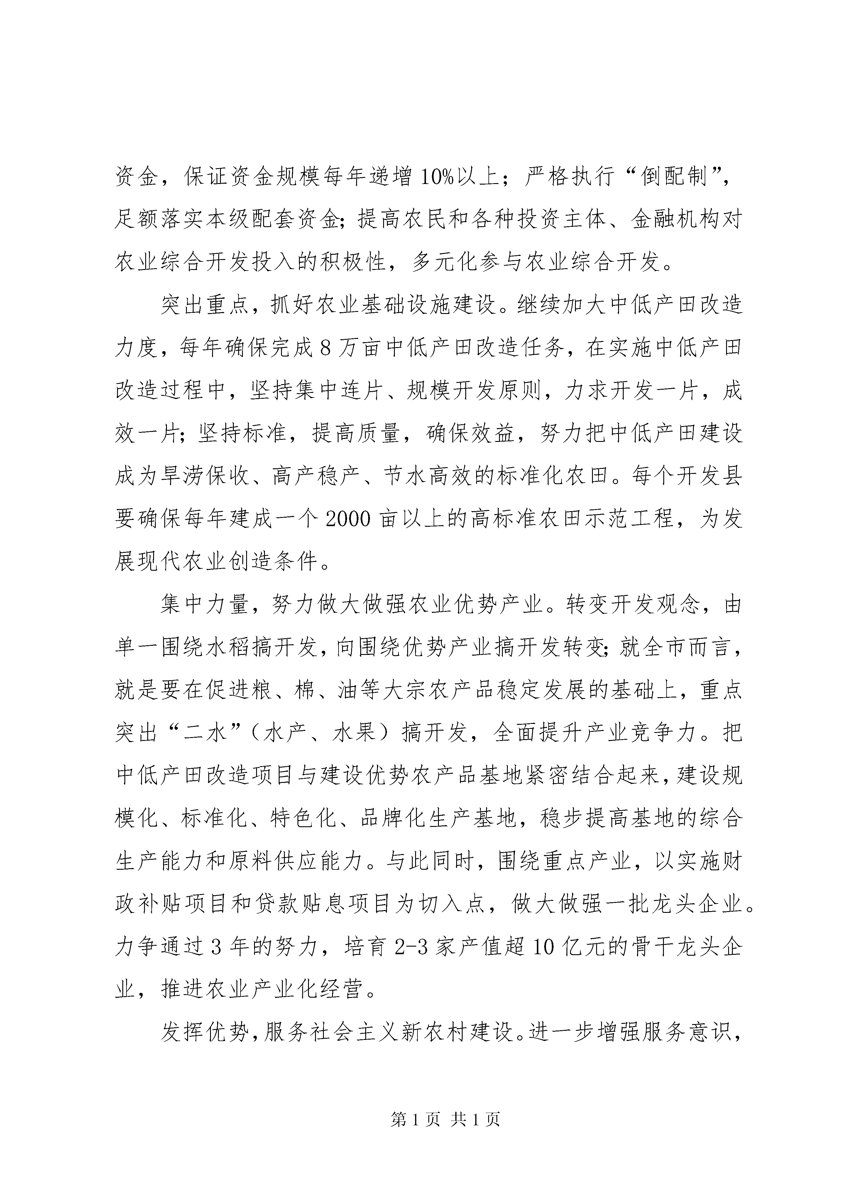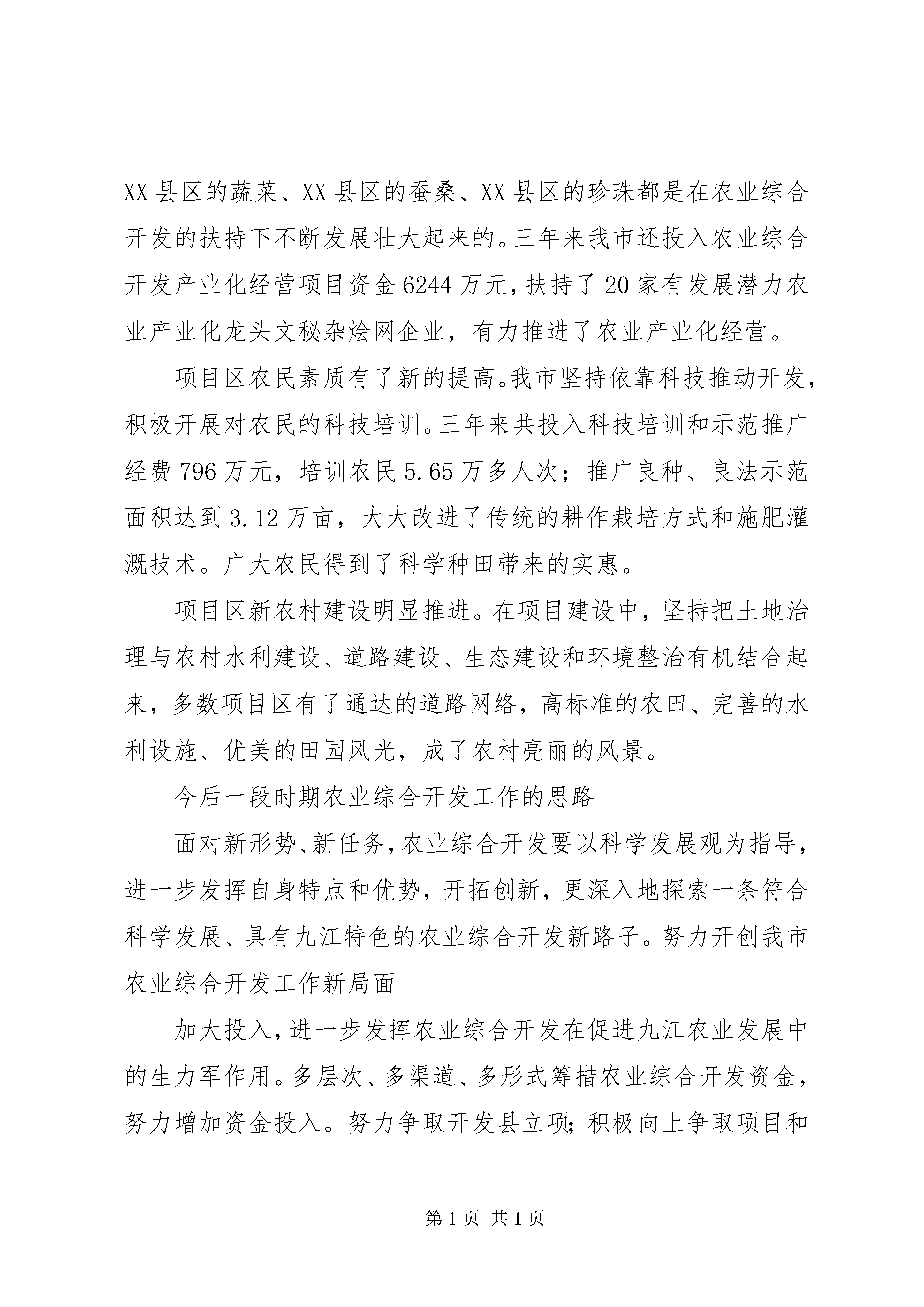 农业综合开发工作汇报1农业综合开发是1988年国家设立的支持和保护农业发展的重大专项。近年来,我市农业综合开发以科学发展观为指导,始终围绕促进农业发展这个主题,规划和实施项目,呈现出“工作一年比一年好,投资一年比一年多,规模一年比一年大,质量一年比一年高”的良好态势。农业综合开发在快速发展中取得了新成效农业综合开发投入不断增加。我市自1992年开始实施农业综合开发项目以来,开发县从一个已增至现在的八个,中央财政扶持的农业综合开发资金,从当初的130万元增加到去年的3925万元,至2008年,累计争取上级财政农业综合开发资金38911万元,农业综合开发资金已成为我市加强农业基础设施建设的重要投入渠道。项目区农业综合生产能力明显提高。农业综合开发坚持以中低产田改造为重点,近三年来,全市共改造中低产田建设高标准农田24.51万亩。通过综合治理,项目区长期存在的旱、涝、渍等生产障碍因素基本排除,农业综合生产能力有了大幅度的提高。据统计,三年来项目区新增粮食生产能力4685.28万公斤,新增棉花生产能力491.4万公斤,新增油料生产能力639.3万公斤。项目区农业产业化经营水平不断提升。全市农业综合开发坚持产业开发的原则,集中资金建设了一批规模化优势农产品基地。XX县区的蔬菜、XX县区的蚕桑、XX县区的珍珠都是在农业综合开发的扶持下不断发展壮大起来的。三年来我市还投入农业综合开发产业化经营项目资金6244万元,扶持了20家有发展潜力农业产业化龙头文秘杂烩网企业,有力推进了农业产业化经营。项目区农民素质有了新的提高。我市坚持依靠科技推动开发,积极开展对农民的科技培训。三年来共投入科技培训和示范推广经费796万元,培训农民5.65万多人次;推广良种、良法示范面积达到3.12万亩,大大改进了传统的耕作栽培方式和施肥灌溉技术。广大农民得到了科学种田带来的实惠。项目区新农村建设明显推进。在项目建设中,坚持把土地治理与农村水利建设、道路建设、生态建设和环境整治有机结合起来,多数项目区有了通达的道路网络,高标准的农田、完善的水利设施、优美的田园风光,成了农村亮丽的风景。今后一段时期农业综合开发工作的思路面对新形势、新任务,农业综合开发要以科学发展观为指导,进一步发挥自身特点和优势,开拓创新,更深入地探索一条符合科学发展、具有九江特色的农业综合开发新路子。努力开创我市农业综合开发工作新局面加大投入,进一步发挥农业综合开发在促进九江农业发展中的生力军作用。多层次、多渠道、多形式筹措农业综合开发资金,努力增加资金投入。努力争取开发县立项;积极向上争取项目和资金,保证资金规模每年递增10%以上;严格执行“倒配制”,足额落实本级配套资金;提高农民和各种投资主体、金融机构对农业综合开发投入的积极性,多元化参与农业综合开发。突出重点,抓好农业基础设施建设。继续加大中低产田改造力度,每年确保完成8万亩中低产田改造任务,在实施中低产田改造过程中,坚持集中连片、规模开发原则,力求开发一片,成效一片;坚持标准,提高质量,确保效益,努力把中低产田建设成为旱涝保收、高产稳产、节水高效的标准化农田。每个开发县要确保每年建成一个2000亩以上的高标准农田示范工程,为发展现代农业创造条件。集中力量,努力做大做强农业优势产业。转变开发观念,由单一围绕水稻搞开发,向围绕优势产业搞开发转变;就全市而言,就是要在促进粮、棉、油等大宗农产品稳定发展的基础上,重点突出“二水”(水产、水果)搞开发,全面提升产业竞争力。把中低产田改造项目与建设优势农产品基地紧密结合起来,建设规模化、标准化、特色化、品牌化生产基地,稳步提高基地的综合生产能力和原料供应能力。与此同时,围绕重点产业,以实施财政补贴项目和贷款贴息项目为切入点,做大做强一批龙头企业。力争通过3年的努力,培育2-3家产值超10亿元的骨干龙头企业,推进农业产业化经营。发挥优势,服务社会主义新农村建设。进一步增强服务意识,支持和服务新农村建设试点工作。将地处交通沿线、群众积极性高的试点村,给予优先扶持,适当集中资金,重点扶持,打造亮点。进一步拓展扶持范围,从过去扶持基础设施建设,向培植“一村一品”专业村,发展农村经济转移,大力推进“一村一品”强村富民工程。对试点村农民特别是特色种养大户和能人进行扶持,不断增强农村自我发展能力。立足高效,不断提高农业综合开发科学管理水平。按照现代管理理念的要求,不断提高农业综合开发管理效率和管理效益。全面推行专家评审制、项目法人制、招投标制、工程监理制,财政无偿资金县级报账制;完善农业综合开发绩效考核制度,达到奖励先进鞭策后进的目的;完善检查监督机制。加强领导,营造农业综合开发的良好氛围。把农业综合开发工作摆在农业和农村工作的突出位置,纳入重要议事日程和目标责任考核。相关部门要密切协作,