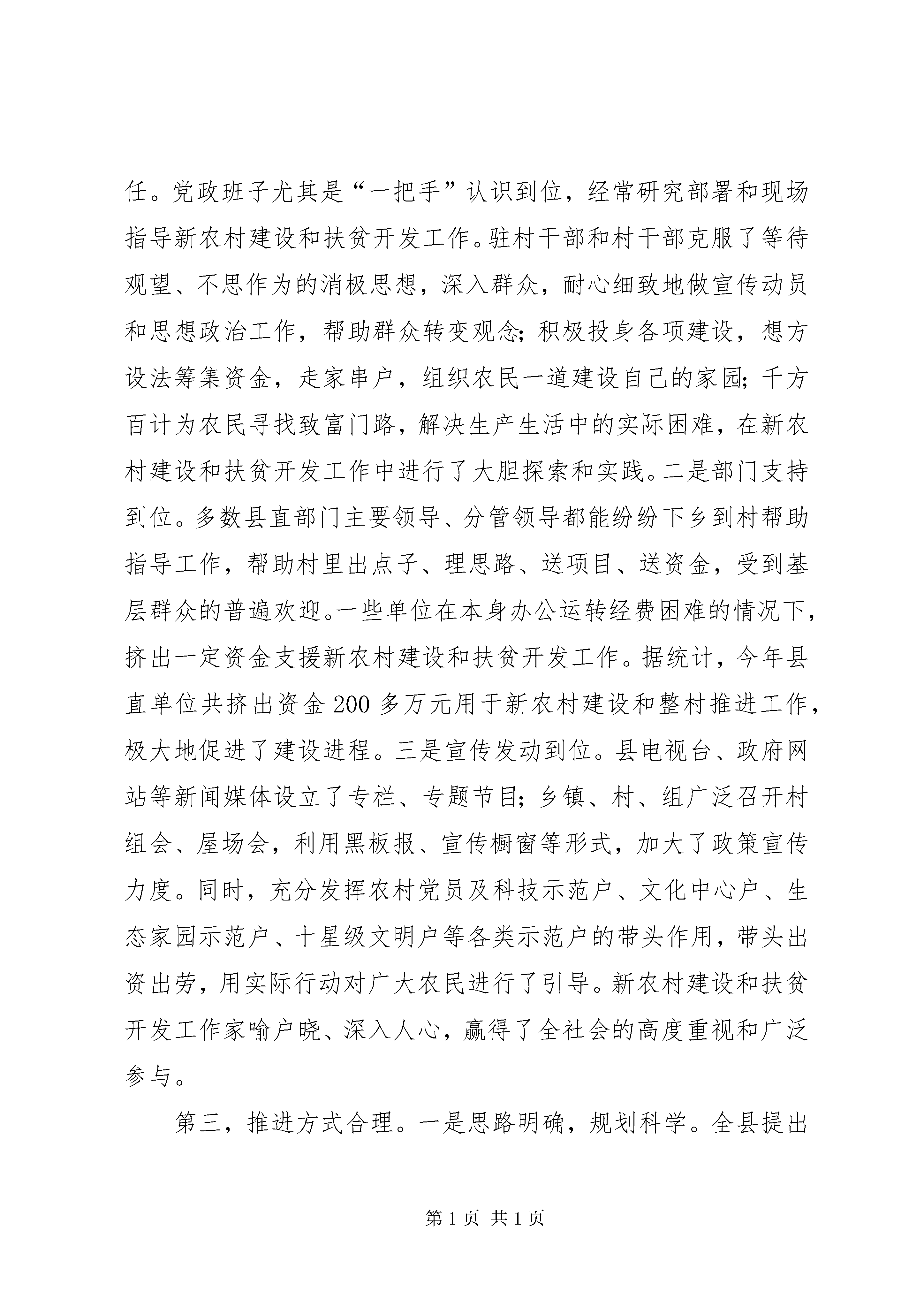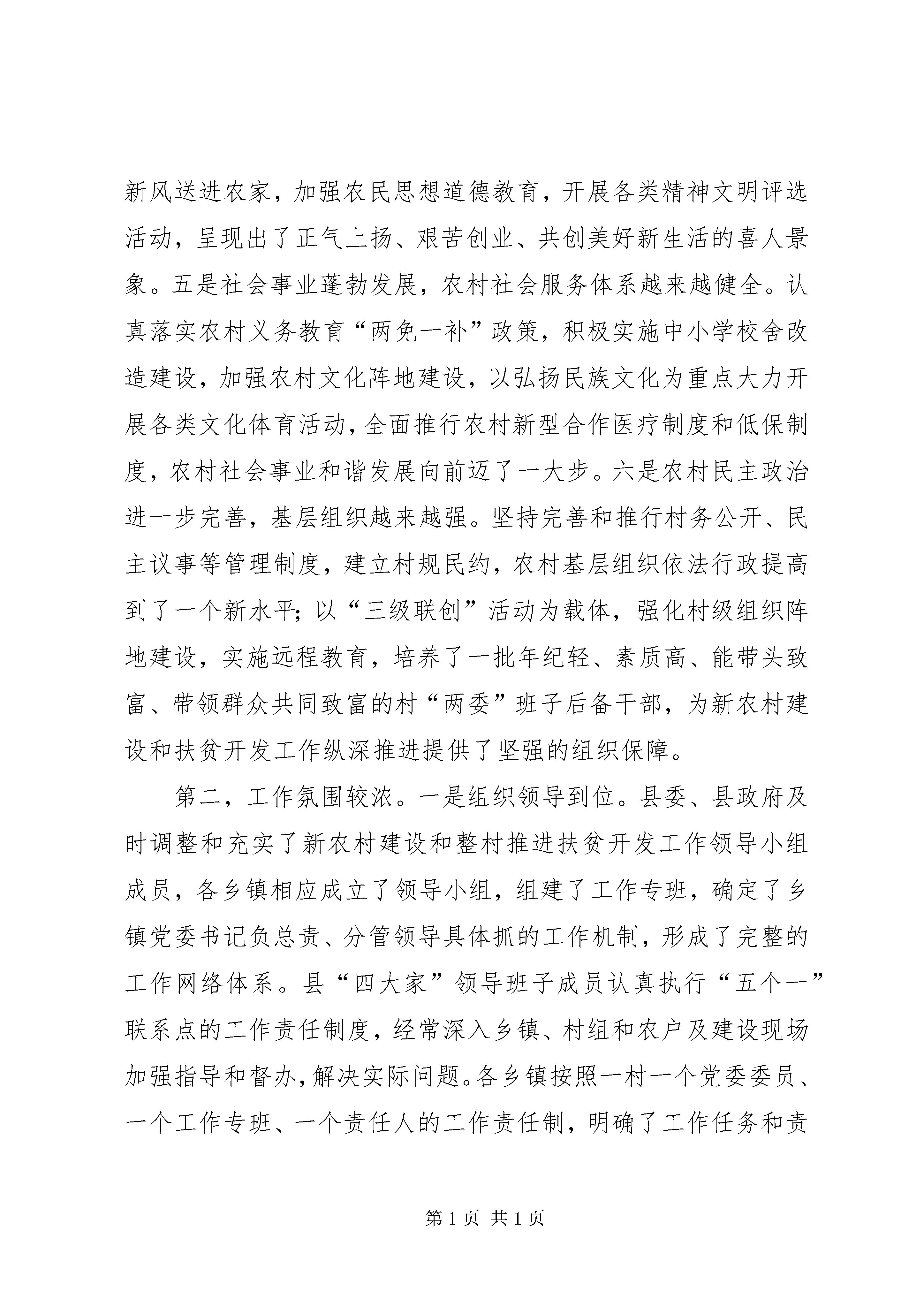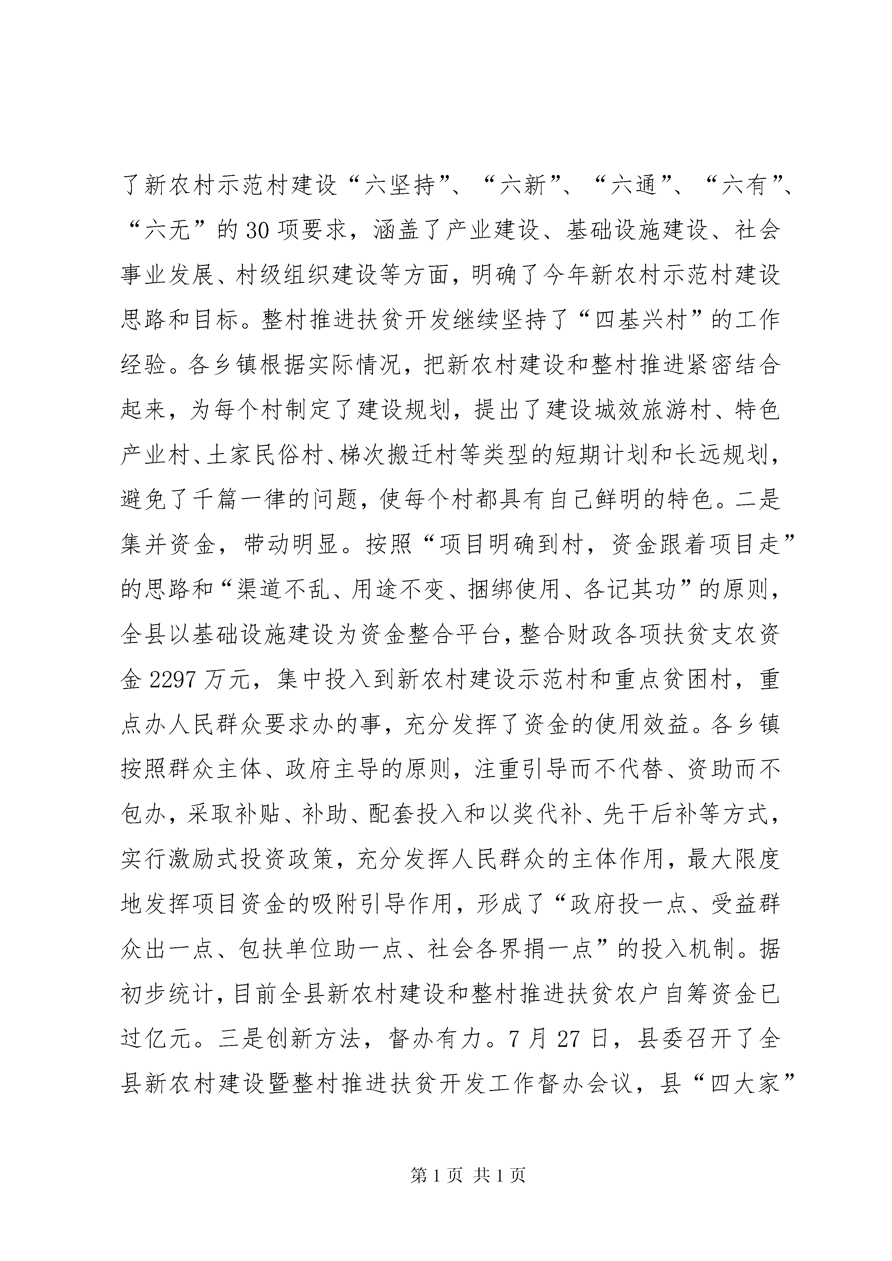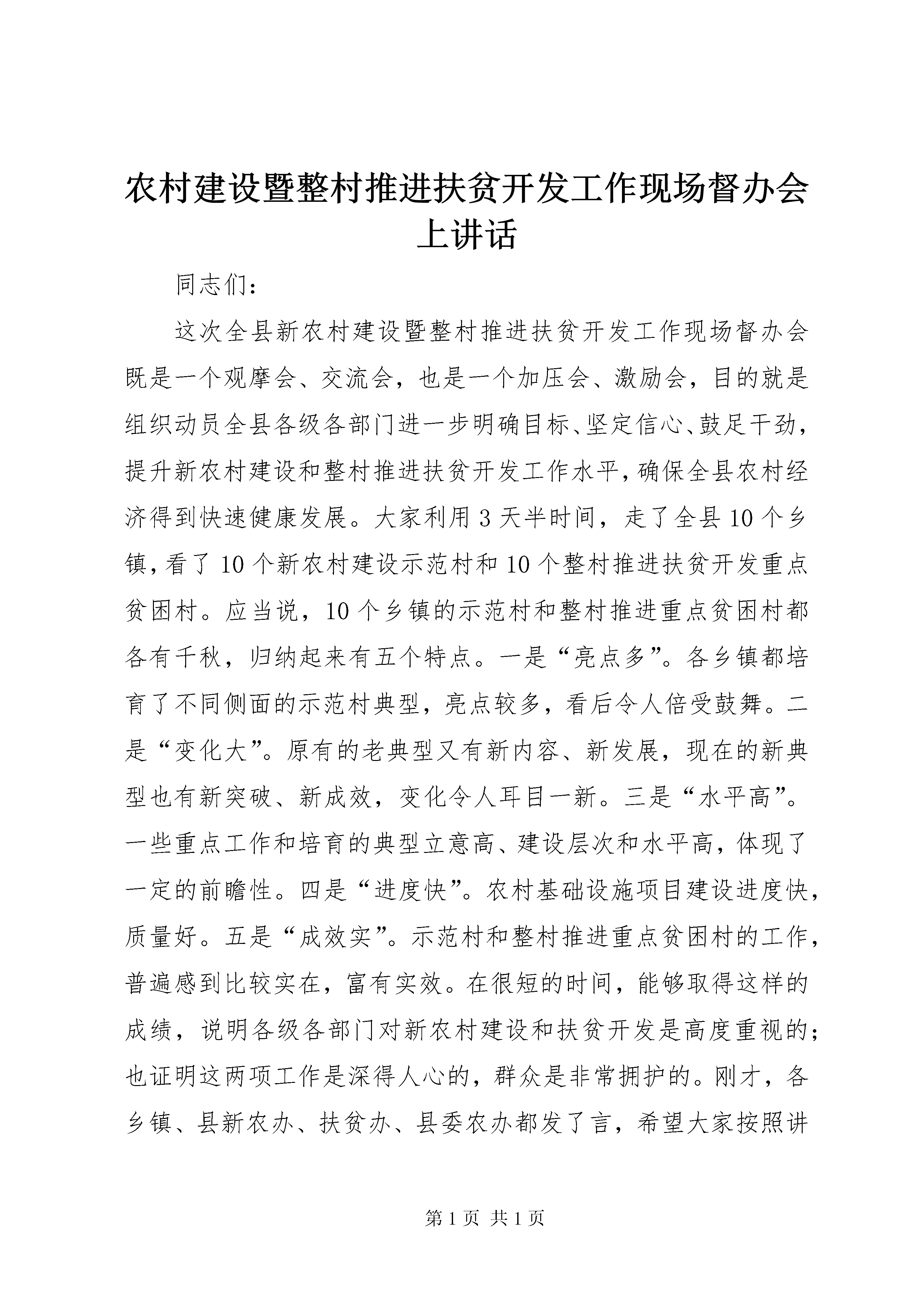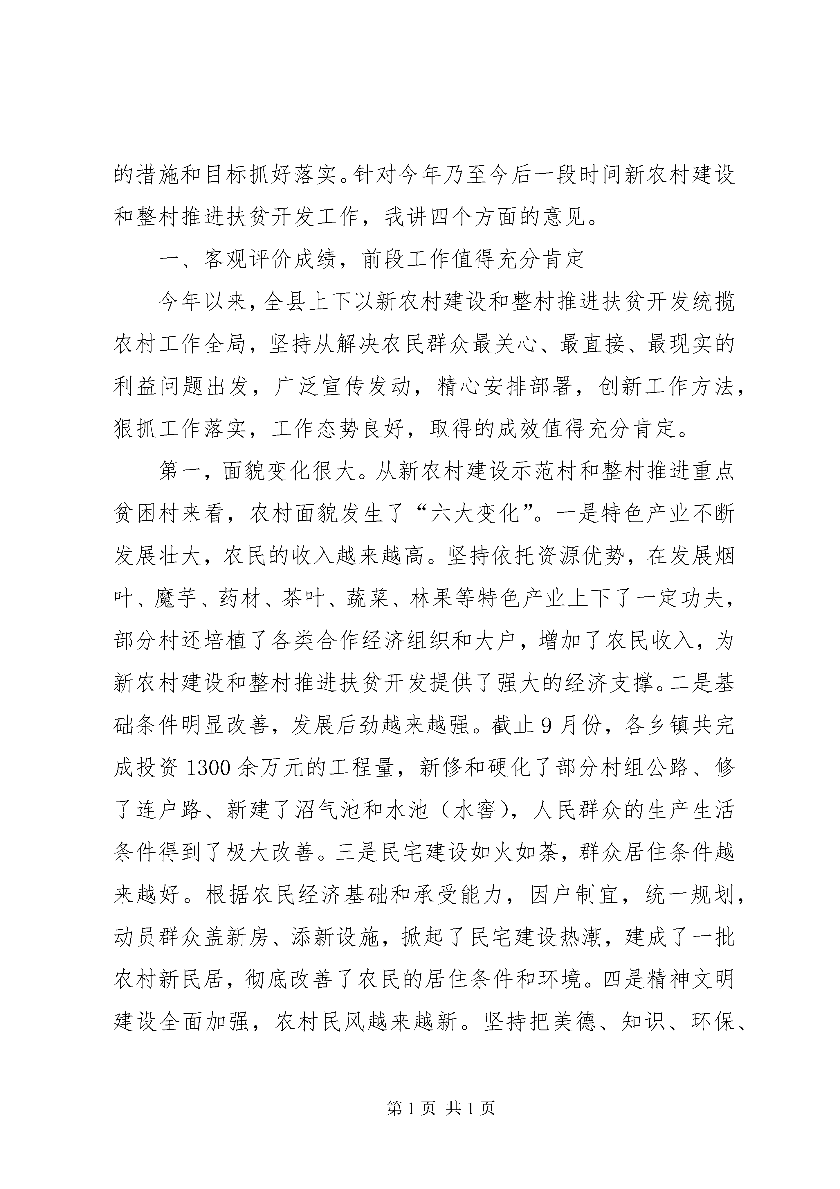 农村建设暨整村推进扶贫开发工作现场督办会上讲话同志们:这次全县新农村建设暨整村推进扶贫开发工作现场督办会既是一个观摩会、交流会,也是一个加压会、激励会,目的就是组织动员全县各级各部门进一步明确目标、坚定信心、鼓足干劲,提升新农村建设和整村推进扶贫开发工作水平,确保全县农村经济得到快速健康发展。大家利用3天半时间,走了全县10个乡镇,看了10个新农村建设示范村和10个整村推进扶贫开发重点贫困村。应当说,10个乡镇的示范村和整村推进重点贫困村都各有千秋,归纳起来有五个特点。一是“亮点多”。各乡镇都培育了不同侧面的示范村典型,亮点较多,看后令人倍受鼓舞。二是“变化大”。原有的老典型又有新内容、新发展,现在的新典型也有新突破、新成效,变化令人耳目一新。三是“水平高”。一些重点工作和培育的典型立意高、建设层次和水平高,体现了一定的前瞻性。四是“进度快”。农村基础设施项目建设进度快,质量好。五是“成效实”。示范村和整村推进重点贫困村的工作,普遍感到比较实在,富有实效。在很短的时间,能够取得这样的成绩,说明各级各部门对新农村建设和扶贫开发是高度重视的;也证明这两项工作是深得人心的,群众是非常拥护的。刚才,各乡镇、县新农办、扶贫办、县委农办都发了言,希望大家按照讲的措施和目标抓好落实。针对今年乃至今后一段时间新农村建设和整村推进扶贫开发工作,我讲四个方面的意见。一、客观评价成绩,前段工作值得充分肯定今年以来,全县上下以新农村建设和整村推进扶贫开发统揽农村工作全局,坚持从解决农民群众最关心、最直接、最现实的利益问题出发,广泛宣传发动,精心安排部署,创新工作方法,狠抓工作落实,工作态势良好,取得的成效值得充分肯定。第一,面貌变化很大。从新农村建设示范村和整村推进重点贫困村来看,农村面貌发生了“六大变化”。一是特色产业不断发展壮大,农民的收入越来越高。坚持依托资源优势,在发展烟叶、魔芋、药材、茶叶、蔬菜、林果等特色产业上下了一定功夫,部分村还培植了各类合作经济组织和大户,增加了农民收入,为新农村建设和整村推进扶贫开发提供了强大的经济支撑。二是基础条件明显改善,发展后劲越来越强。截止9月份,各乡镇共完成投资1300余万元的工程量,新修和硬化了部分村组公路、修了连户路、新建了沼气池和水池(水窖),人民群众的生产生活条件得到了极大改善。三是民宅建设如火如荼,群众居住条件越来越好。根据农民经济基础和承受能力,因户制宜,统一规划,动员群众盖新房、添新设施,掀起了民宅建设热潮,建成了一批农村新民居,彻底改善了农民的居住条件和环境。四是精神文明建设全面加强,农村民风越来越新。坚持把美德、知识、环保、新风送进农家,加强农民思想道德教育,开展各类精神文明评选活动,呈现出了正气上扬、艰苦创业、共创美好新生活的喜人景象。五是社会事业蓬勃发展,农村社会服务体系越来越健全。认真落实农村义务教育“两免一补”政策,积极实施中小学校舍改造建设,加强农村文化阵地建设,以弘扬民族文化为重点大力开展各类文化体育活动,全面推行农村新型合作医疗制度和低保制度,农村社会事业和谐发展向前迈了一大步。六是农村民主政治进一步完善,基层组织越来越强。坚持完善和推行村务公开、民主议事等管理制度,建立村规民约,农村基层组织依法行政提高到了一个新水平;以“三级联创”活动为载体,强化村级组织阵地建设,实施远程教育,培养了一批年纪轻、素质高、能带头致富、带领群众共同致富的村“两委”班子后备干部,为新农村建设和扶贫开发工作纵深推进提供了坚强的组织保障。第二,工作氛围较浓。一是组织领导到位。县委、县政府及时调整和充实了新农村建设和整村推进扶贫开发工作领导小组成员,各乡镇相应成立了领导小组,组建了工作专班,确定了乡镇党委书记负总责、分管领导具体抓的工作机制,形成了完整的工作网络体系。县“四大家”领导班子成员认真执行“五个一”联系点的工作责任制度,经常深入乡镇、村组和农户及建设现场加强指导和督办,解决实际问题。各乡镇按照一村一个党委委员、一个工作专班、一个责任人的工作责任制,明确了工作任务和责任。党政班子尤其是“一把手”认识到位,经常研究部署和现场指导新农村建设和扶贫开发工作。驻村干部和村干部克服了等待观望、不思作为的消极思想,深入群众,耐心细致地做宣传动员和思想政治工作,帮助群众转变观念;积极投身各项建设,想方设法筹集资金,走家串户,组织农民一道建设自己的家园;千方百计为农民寻找致富门路,解决生产生活中的实际困难,在新农村建设和扶贫开发工作中进行了大胆探索和实践。二是部门支持到位。多数县直部门主要领导、分管领导都能纷纷下乡到村帮助指导工作,帮助村里出点子、理思路、送项目、送资金,受到基层群众的普遍欢迎。一些单位在本身办公运转经费困难的情况下,挤出一定资金支援新农村建设和扶贫开发工作。据统计