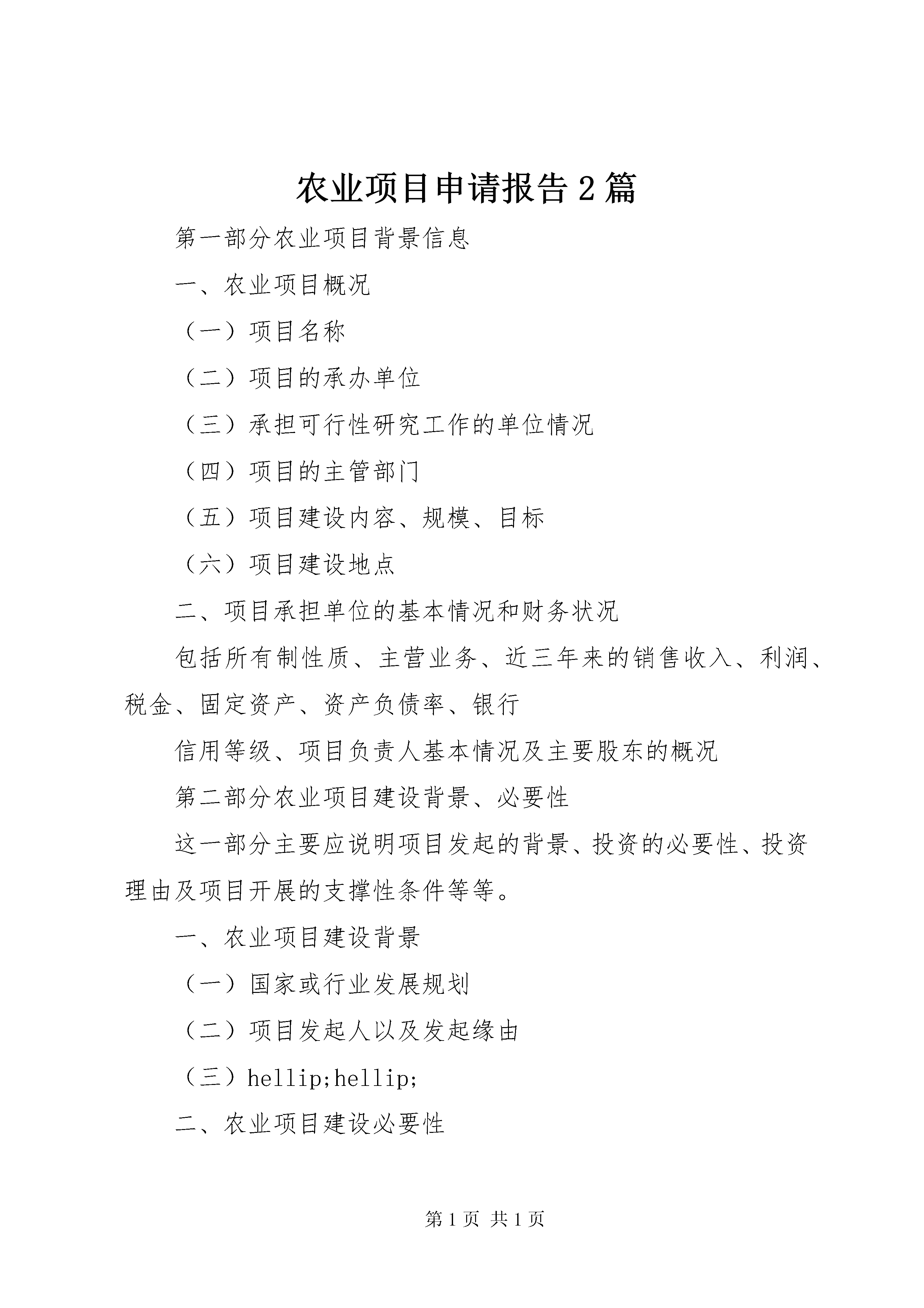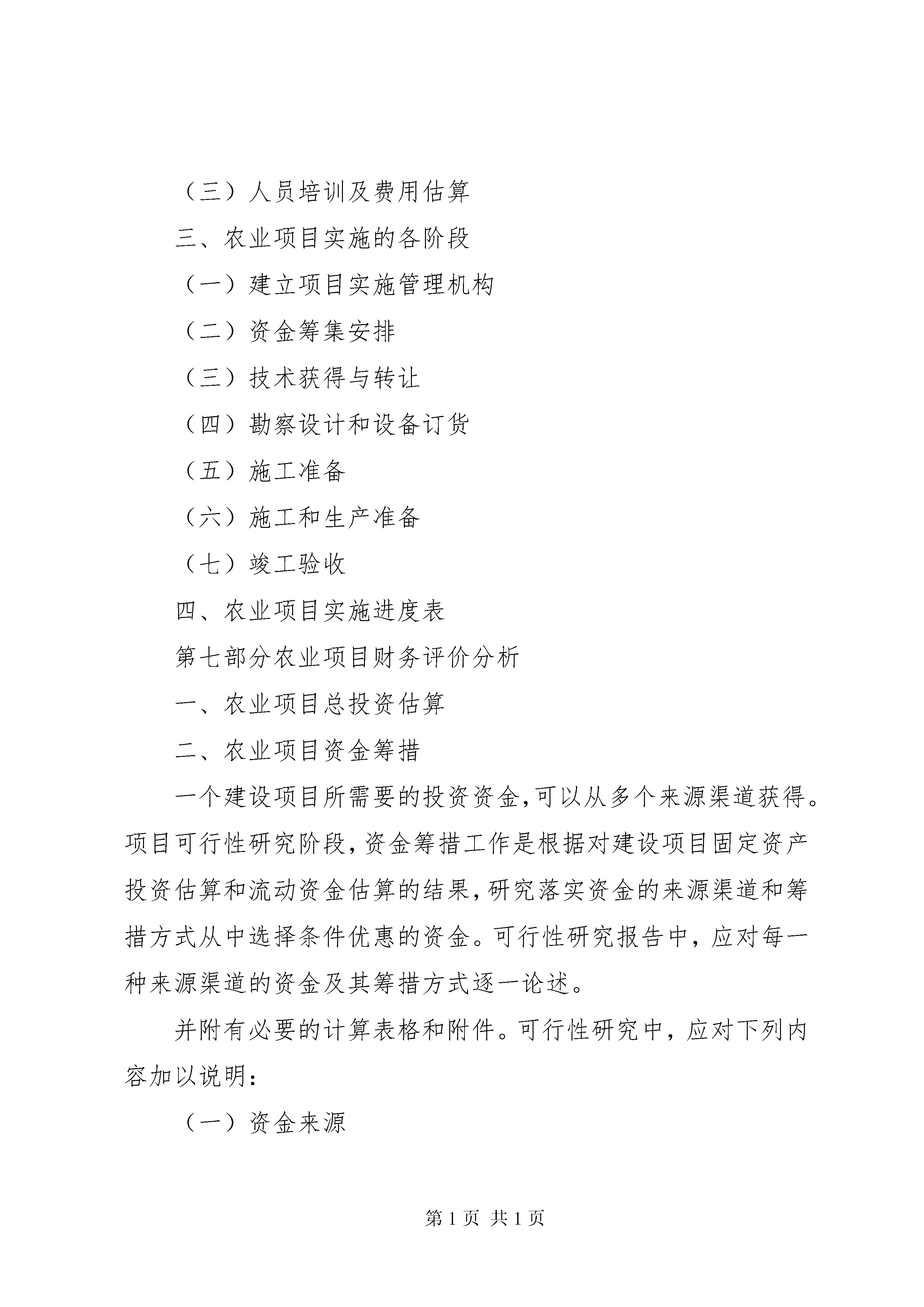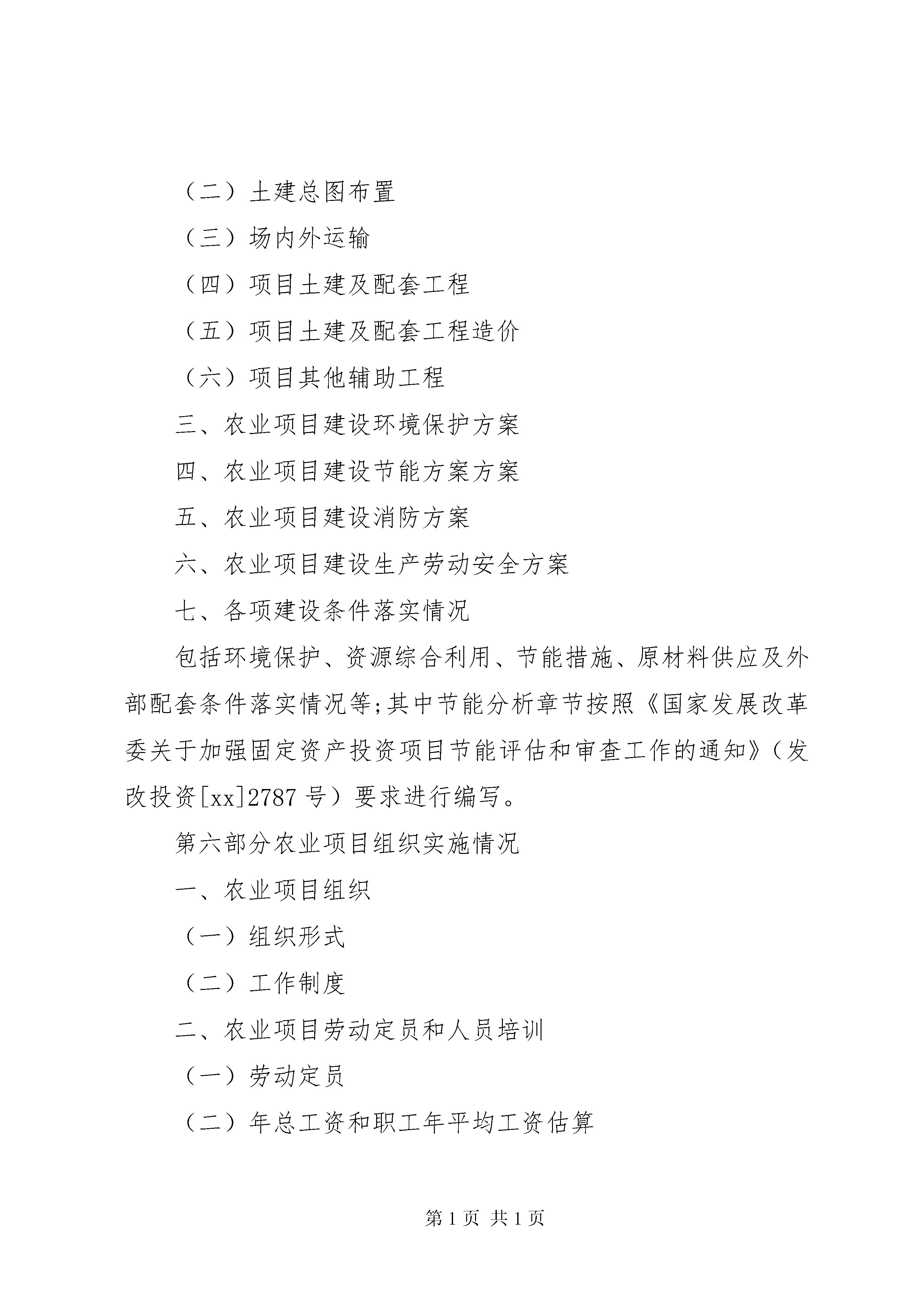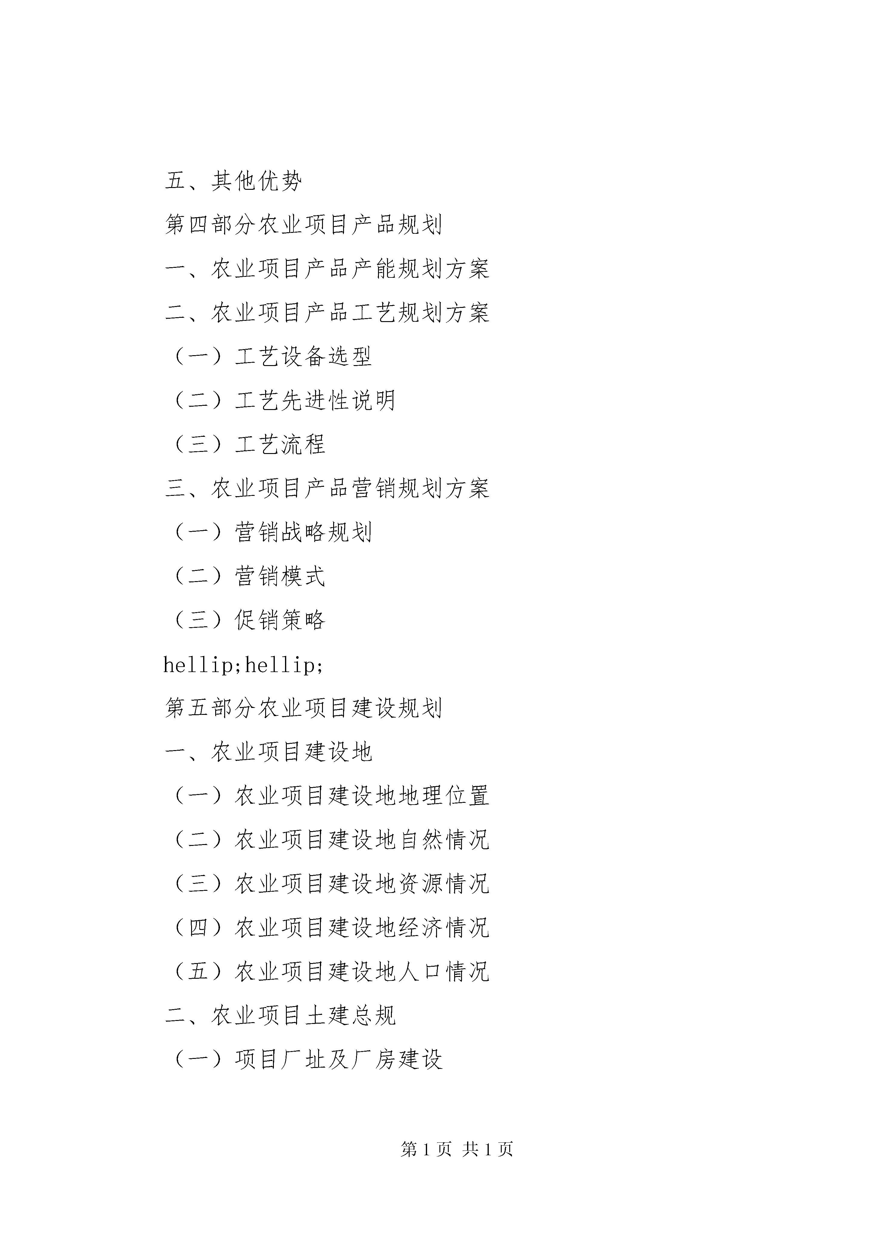 农业项目申请报告2篇第一部分农业项目背景信息一、农业项目概况(一)项目名称(二)项目的承办单位(三)承担可行性研究工作的单位情况(四)项目的主管部门(五)项目建设内容、规模、目标(六)项目建设地点二、项目承担单位的基本情况和财务状况包括所有制性质、主营业务、近三年来的销售收入、利润、税金、固定资产、资产负债率、银行信用等级、项目负责人基本情况及主要股东的概况第二部分农业项目建设背景、必要性这一部分主要应说明项目发起的背景、投资的必要性、投资理由及项目开展的支撑性条件等等。一、农业项目建设背景(一)国家或行业发展规划(二)项目发起人以及发起缘由(三)hellip;hellip;二、农业项目建设必要性国内外现状和技术发展趋势,对产业发展的作用与影响,产业关联度分析,市场分析;(一)hellip;hellip;(二)hellip;hellip;(三)hellip;hellip;(四)hellip;hellip;三、农业项目建设可行性(一)经济可行性(二)政策可行性(三)技术可行性(四)模式可行性(五)组织和人力资源可行性第三部分农业项目优势一、组织优势二、技术优势涉及成果来源及知识产权情况、已完成的研究开发工作及中试情况和鉴定年限、技术或工艺特点以及与现有技术或工艺比较所具有的优势、该项技术的突破对行业技术进步的重要意义和作用等。三、市场优势四、模式优势五、其他优势第四部分农业项目产品规划一、农业项目产品产能规划方案二、农业项目产品工艺规划方案(一)工艺设备选型(二)工艺先进性说明(三)工艺流程三、农业项目产品营销规划方案(一)营销战略规划(二)营销模式(三)促销策略hellip;hellip;第五部分农业项目建设规划一、农业项目建设地(一)农业项目建设地地理位置(二)农业项目建设地自然情况(三)农业项目建设地资源情况(四)农业项目建设地经济情况(五)农业项目建设地人口情况二、农业项目土建总规(一)项目厂址及厂房建设(二)土建总图布置(三)场内外运输(四)项目土建及配套工程(五)项目土建及配套工程造价(六)项目其他辅助工程三、农业项目建设环境保护方案四、农业项目建设节能方案方案五、农业项目建设消防方案六、农业项目建设生产劳动安全方案七、各项建设条件落实情况包括环境保护、资源综合利用、节能措施、原材料供应及外部配套条件落实情况等;其中节能分析章节按照《国家发展改革委关于加强固定资产投资项目节能评估和审查工作的通知》(发改投资[xx]2787号)要求进行编写。第六部分农业项目组织实施情况一、农业项目组织(一)组织形式(二)工作制度二、农业项目劳动定员和人员培训(一)劳动定员(二)年总工资和职工年平均工资估算(三)人员培训及费用估算三、农业项目实施的各阶段(一)建立项目实施管理机构(二)资金筹集安排(三)技术获得与转让(四)勘察设计和设备订货(五)施工准备(六)施工和生产准备(七)竣工验收四、农业项目实施进度表第七部分农业项目财务评价分析一、农业项目总投资估算二、农业项目资金筹措一个建设项目所需要的投资资金,可以从多个来源渠道获得。项目可行性研究阶段,资金筹措工作是根据对建设项目固定资产投资估算和流动资金估算的结果,研究落实资金的来源渠道和筹措方式从中选择条件优惠的资金。可行性研究报告中,应对每一种来源渠道的资金及其筹措方式逐一论述。并附有必要的计算表格和附件。可行性研究中,应对下列内容加以说明:(一)资金来源(二)项目筹资方案三、农业项目投资使用计划(一)投资使用计划(二)借款偿还计划四、项目财务评价说明amp;财务测算假定(一)计算依据及相关说明(二)项目测算基本设定五、农业项目总成本费用估算(一)直接成本(二)工资及福利费用(三)折旧及摊销(四)工资及福利费用(五)修理费(六)财务费用(七)其他费用(八)财务费用(九)总成本费用六、销售收入、销售税金及附加和增值税估算(一)销售收入(二)销售税金及附加(三)增值税(四)销售收入、销售税金及附加和增值税估算七、损益及利润分配估算八、现金流估算(一)项目投资现金流估算(二)项目资本金现金流估算九、不确定性分析在对建设项目进行评价时,所采用的数据多数来自预测和估算。由于资料和信息的有限性,将来的实际情况可能与此有出入,这对项目投资决策会带来风险。为避免或尽可能减少风险,就要分析不确定性因素对项目经济评价指标的影响,以确定项目的可靠性,这就是不确定性分析。根据分析内容和侧重面不同,不确定性分析可分为盈亏平衡分析、敏感性分析和概率分析。在可行性研究中,一般要进行的盈亏平衡平分析、敏感性分配和概率分析,可视项目情况而定。(一)盈亏平衡分析(二)敏感性分析第八部分农业项目财务效益、经济和社会效益评价一、财务效益评价内部收益率、投资利润率、投资回收期、贷款偿还期等指标的计算