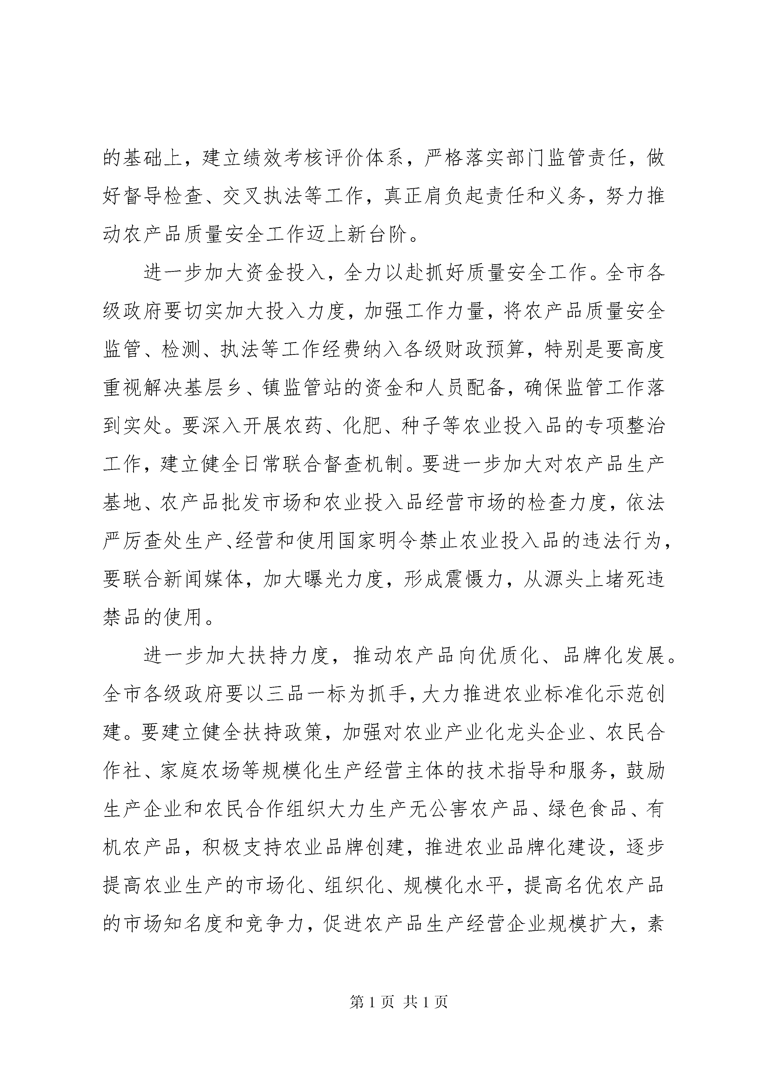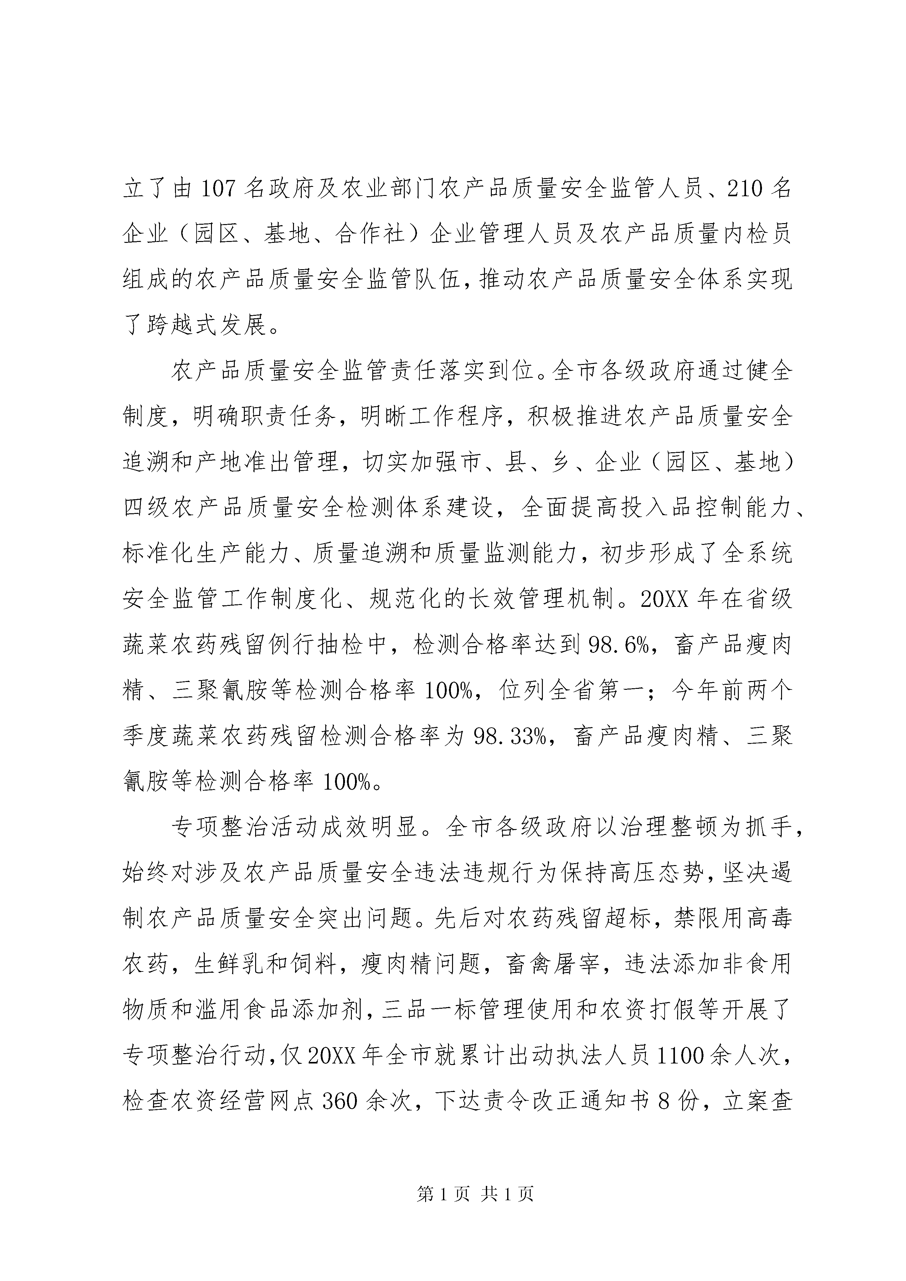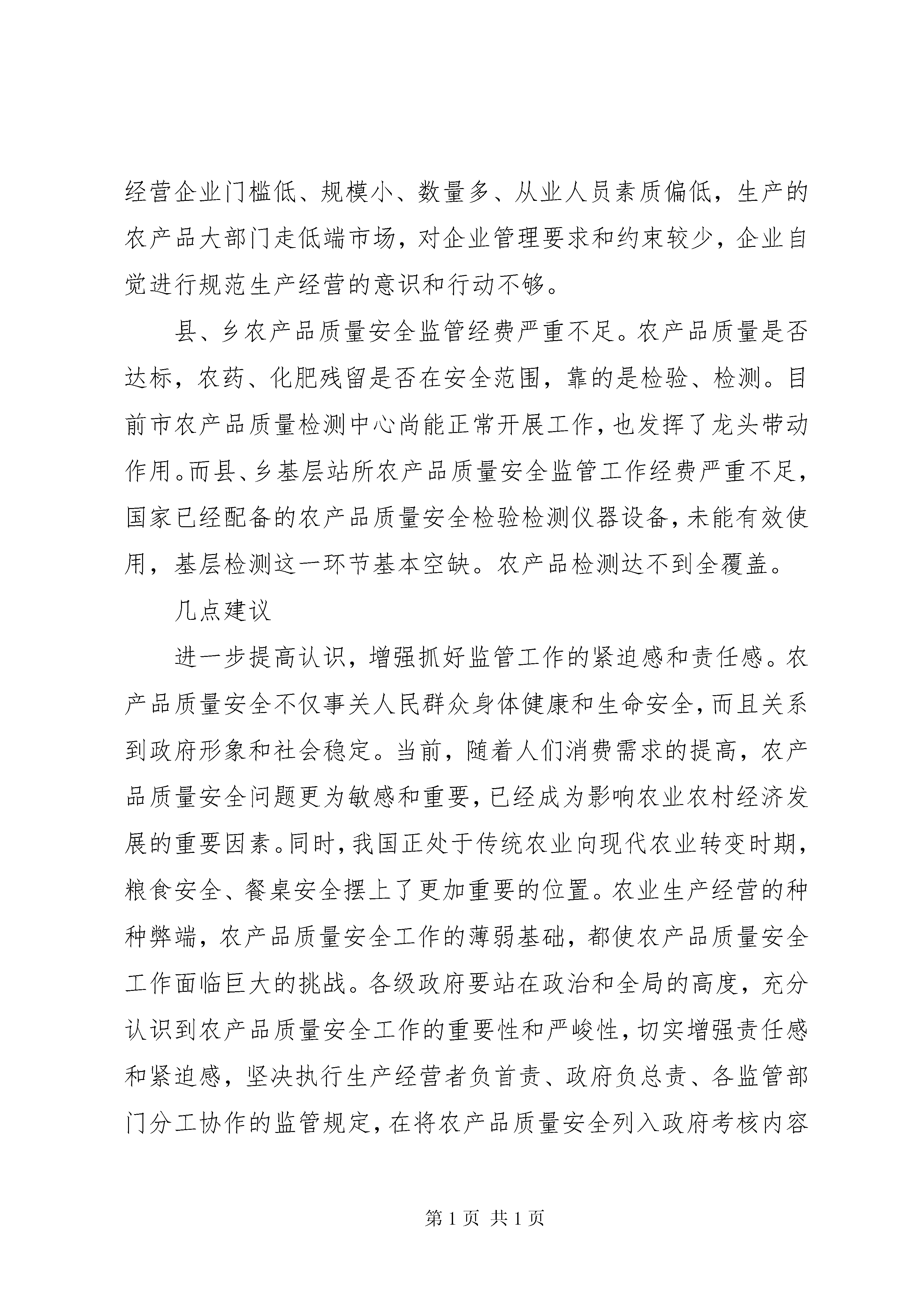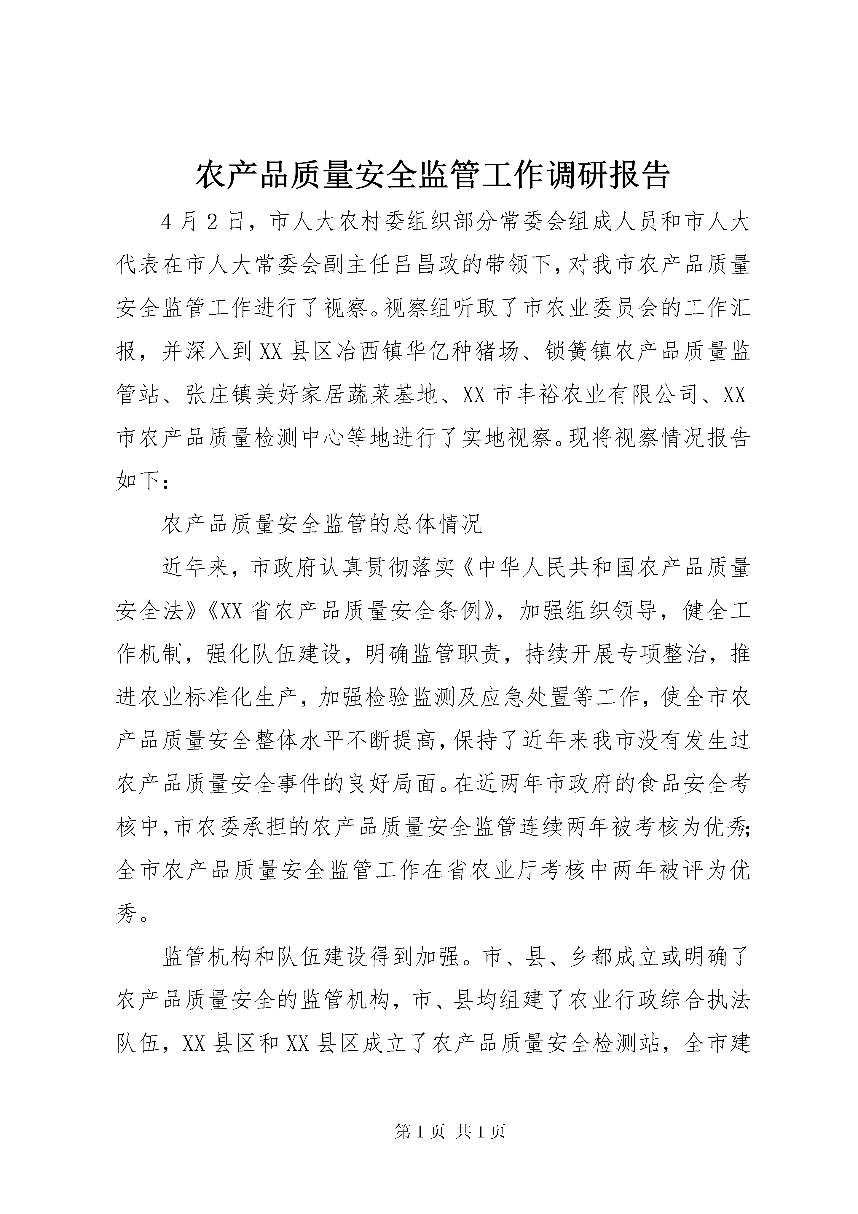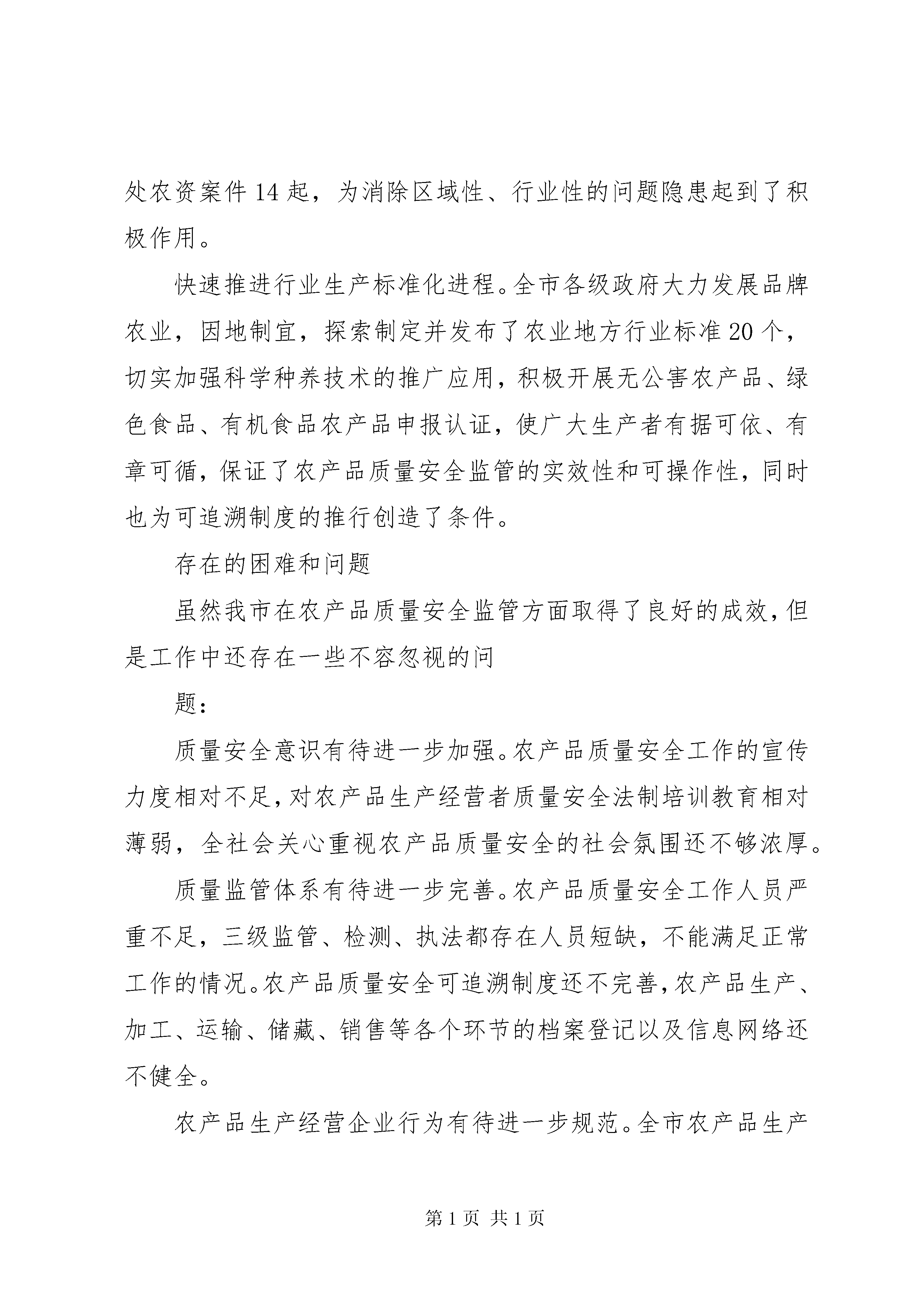 农产品质量安全监管工作调研报告4月2日,市人大农村委组织部分常委会组成人员和市人大代表在市人大常委会副主任吕昌政的带领下,对我市农产品质量安全监管工作进行了视察。视察组听取了市农业委员会的工作汇报,并深入到XX县区冶西镇华亿种猪场、锁簧镇农产品质量监管站、张庄镇美好家居蔬菜基地、XX市丰裕农业有限公司、XX市农产品质量检测中心等地进行了实地视察。现将视察情况报告如下:农产品质量安全监管的总体情况近年来,市政府认真贯彻落实《中华人民共和国农产品质量安全法》《XX省农产品质量安全条例》,加强组织领导,健全工作机制,强化队伍建设,明确监管职责,持续开展专项整治,推进农业标准化生产,加强检验监测及应急处置等工作,使全市农产品质量安全整体水平不断提高,保持了近年来我市没有发生过农产品质量安全事件的良好局面。在近两年市政府的食品安全考核中,市农委承担的农产品质量安全监管连续两年被考核为优秀;全市农产品质量安全监管工作在省农业厅考核中两年被评为优秀。监管机构和队伍建设得到加强。市、县、乡都成立或明确了农产品质量安全的监管机构,市、县均组建了农业行政综合执法队伍,XX县区和XX县区成立了农产品质量安全检测站,全市建立了由107名政府及农业部门农产品质量安全监管人员、210名企业(园区、基地、合作社)企业管理人员及农产品质量内检员组成的农产品质量安全监管队伍,推动农产品质量安全体系实现了跨越式发展。农产品质量安全监管责任落实到位。全市各级政府通过健全制度,明确职责任务,明晰工作程序,积极推进农产品质量安全追溯和产地准出管理,切实加强市、县、乡、企业(园区、基地)四级农产品质量安全检测体系建设,全面提高投入品控制能力、标准化生产能力、质量追溯和质量监测能力,初步形成了全系统安全监管工作制度化、规范化的长效管理机制。20XX年在省级蔬菜农药残留例行抽检中,检测合格率达到98.6%,畜产品瘦肉精、三聚氰胺等检测合格率100%,位列全省第一;今年前两个季度蔬菜农药残留检测合格率为98.33%,畜产品瘦肉精、三聚氰胺等检测合格率100%。专项整治活动成效明显。全市各级政府以治理整顿为抓手,始终对涉及农产品质量安全违法违规行为保持高压态势,坚决遏制农产品质量安全突出问题。先后对农药残留超标,禁限用高毒农药,生鲜乳和饲料,瘦肉精问题,畜禽屠宰,违法添加非食用物质和滥用食品添加剂,三品一标管理使用和农资打假等开展了专项整治行动,仅20XX年全市就累计出动执法人员1100余人次,检查农资经营网点360余次,下达责令改正通知书8份,立案查处农资案件14起,为消除区域性、行业性的问题隐患起到了积极作用。快速推进行业生产标准化进程。全市各级政府大力发展品牌农业,因地制宜,探索制定并发布了农业地方行业标准20个,切实加强科学种养技术的推广应用,积极开展无公害农产品、绿色食品、有机食品农产品申报认证,使广大生产者有据可依、有章可循,保证了农产品质量安全监管的实效性和可操作性,同时也为可追溯制度的推行创造了条件。存在的困难和问题虽然我市在农产品质量安全监管方面取得了良好的成效,但是工作中还存在一些不容忽视的问题:质量安全意识有待进一步加强。农产品质量安全工作的宣传力度相对不足,对农产品生产经营者质量安全法制培训教育相对薄弱,全社会关心重视农产品质量安全的社会氛围还不够浓厚。质量监管体系有待进一步完善。农产品质量安全工作人员严重不足,三级监管、检测、执法都存在人员短缺,不能满足正常工作的情况。农产品质量安全可追溯制度还不完善,农产品生产、加工、运输、储藏、销售等各个环节的档案登记以及信息网络还不健全。农产品生产经营企业行为有待进一步规范。全市农产品生产经营企业门槛低、规模小、数量多、从业人员素质偏低,生产的农产品大部门走低端市场,对企业管理要求和约束较少,企业自觉进行规范生产经营的意识和行动不够。县、乡农产品质量安全监管经费严重不足。农产品质量是否达标,农药、化肥残留是否在安全范围,靠的是检验、检测。目前市农产品质量检测中心尚能正常开展工作,也发挥了龙头带动作用。而县、乡基层站所农产品质量安全监管工作经费严重不足,国家已经配备的农产品质量安全检验检测仪器设备,未能有效使用,基层检测这一环节基本空缺。农产品检测达不到全覆盖。几点建议进一步提高认识,增强抓好监管工作的紧迫感和责任感。农产品质量安全不仅事关人民群众身体健康和生命安全,而且关系到政府形象和社会稳定。当前,随着人们消费需求的提高,农产品质量安全问题更为敏感和重要,已经成为影响农业农村经济发展的重要因素。同时,我国正处于传统农业向现代农业转变时期,粮食安全、餐桌安全摆上了更加重要的位置。农业生产经营的种种弊端,农产品质量安全工作的薄弱基础,都使农产品质量安全工作面临巨大的挑战。各级政府要站在政治