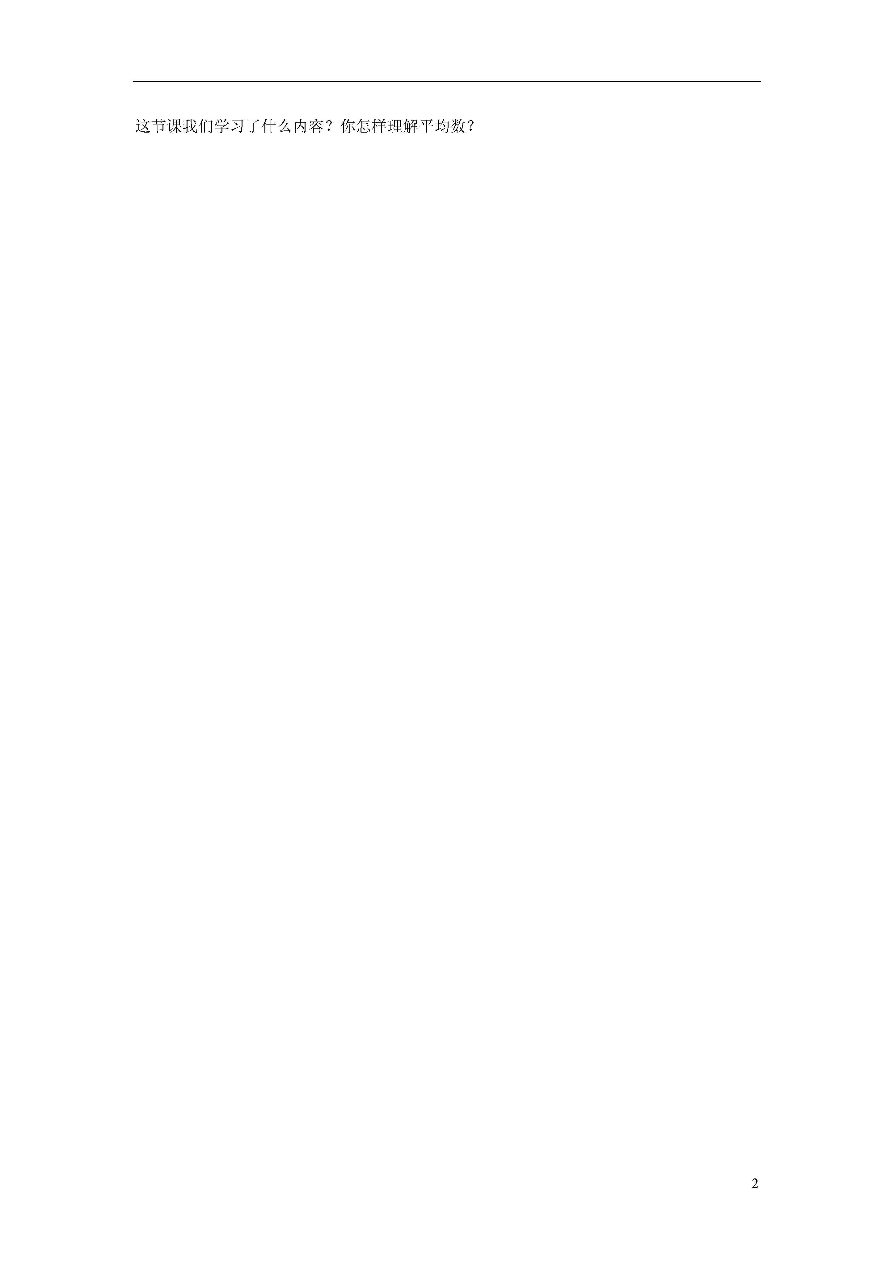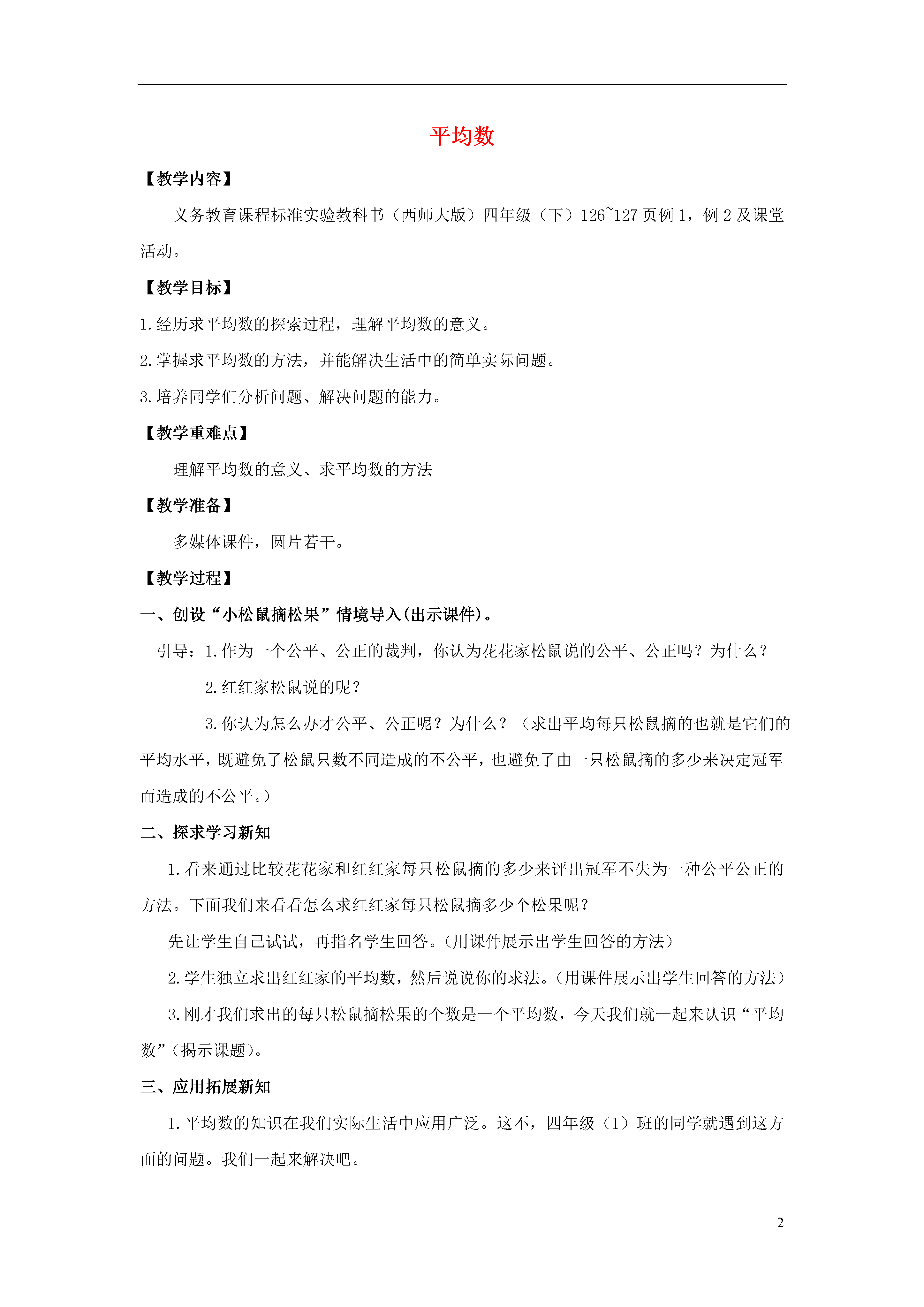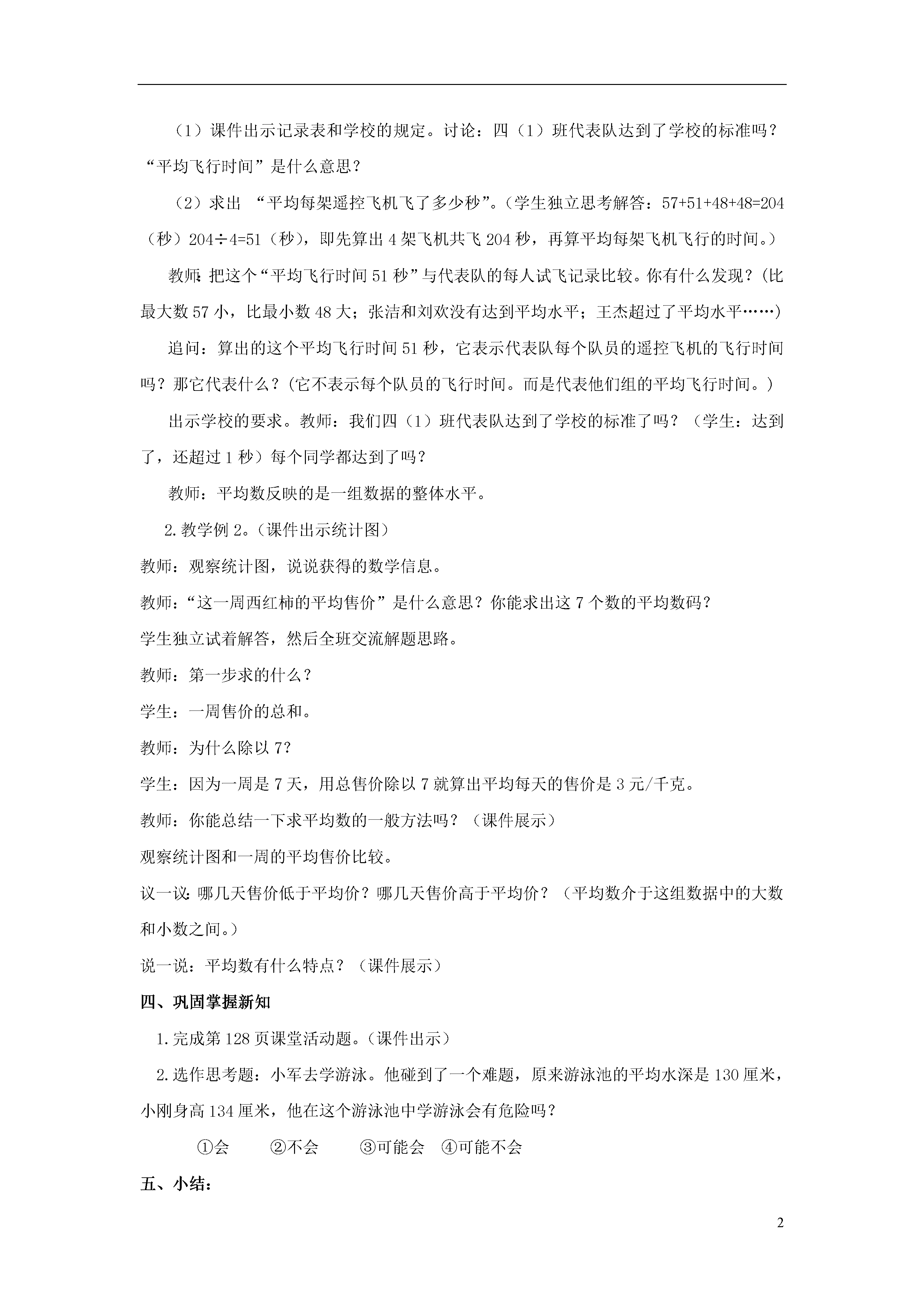 2平均数【教学内容】义务教育课程标准实验教科书(西师大版)四年级(下)126~127页例1,例2及课堂活动。【教学目标】1.经历求平均数的探索过程,理解平均数的意义。2.掌握求平均数的方法,并能解决生活中的简单实际问题。3.培养同学们分析问题、解决问题的能力。【教学重难点】理解平均数的意义、求平均数的方法【教学准备】多媒体课件,圆片若干。【教学过程】一、创设“小松鼠摘松果”情境导入(出示课件)。引导:1.作为一个公平、公正的裁判,你认为花花家松鼠说的公平、公正吗?为什么?2.红红家松鼠说的呢?3.你认为怎么办才公平、公正呢?为什么?(求出平均每只松鼠摘的也就是它们的平均水平,既避免了松鼠只数不同造成的不公平,也避免了由一只松鼠摘的多少来决定冠军而造成的不公平。)二、探求学习新知1.看来通过比较花花家和红红家每只松鼠摘的多少来评出冠军不失为一种公平公正的方法。下面我们来看看怎么求红红家每只松鼠摘多少个松果呢?先让学生自己试试,再指名学生回答。(用课件展示出学生回答的方法)2.学生独立求出红红家的平均数,然后说说你的求法。(用课件展示出学生回答的方法)3.刚才我们求出的每只松鼠摘松果的个数是一个平均数,今天我们就一起来认识“平均数”(揭示课题)。三、应用拓展新知1.平均数的知识在我们实际生活中应用广泛。这不,四年级(1)班的同学就遇到这方面的问题。我们一起来解决吧。(1)课件出示记录表和学校的规定。讨论:四(1)班代表队达到了学校的标准吗?“平均飞行时间”是什么意思?(2)求出“平均每架遥控飞机飞了多少秒”。(学生独立思考解答:57+51+48+48=204(秒)204÷4=51(秒),即先算出4架飞机共飞204秒,再算平均每架飞机飞行的时间。)教师:把这个“平均飞行时间51秒”与代表队的每人试飞记录比较。你有什么发现?(比最大数57小,比最小数48大;张洁和刘欢没有达到平均水平;王杰超过了平均水平……)追问:算出的这个平均飞行时间51秒,它表示代表队每个队员的遥控飞机的飞行时间吗?那它代表什么?(它不表示每个队员的飞行时间。而是代表他们组的平均飞行时间。)出示学校的要求。教师:我们四(1)班代表队达到了学校的标准了吗?(学生:达到了,还超过1秒)每个同学都达到了吗?教师:平均数反映的是一组数据的整体水平。2.教学例2。(课件出示统计图)教师:观察统计图,说说获得的数学信息。教师:“这一周西红柿的平均售价”是什么意思?你能求出这7个数的平均数码?学生独立试着解答,然后全班交流解题思路。教师:第一步求的什么?学生:一周售价的总和。教师:为什么除以7?学生:因为一周是7天,用总售价除以7就算出平均每天的售价是3元/千克。教师:你能总结一下求平均数的一般方法吗?(课件展示)观察统计图和一周的平均售价比较。议一议:哪几天售价低于平均价?哪几天售价高于平均价?(平均数介于这组数据中的大数和小数之间。)说一说:平均数有什么特点?(课件展示)四、巩固掌握新知1.完成课堂活动题。(课件出示)2.选作思考题:小军去学游泳。他碰到了一个难题,原来游泳池的平均水深是130厘米,小刚身高134厘米,他在这个游泳池中学游泳会有危险吗?①会②不会③可能会④可能不会五、小结:这节课我们学习了什么内容?你怎样理解平均数?