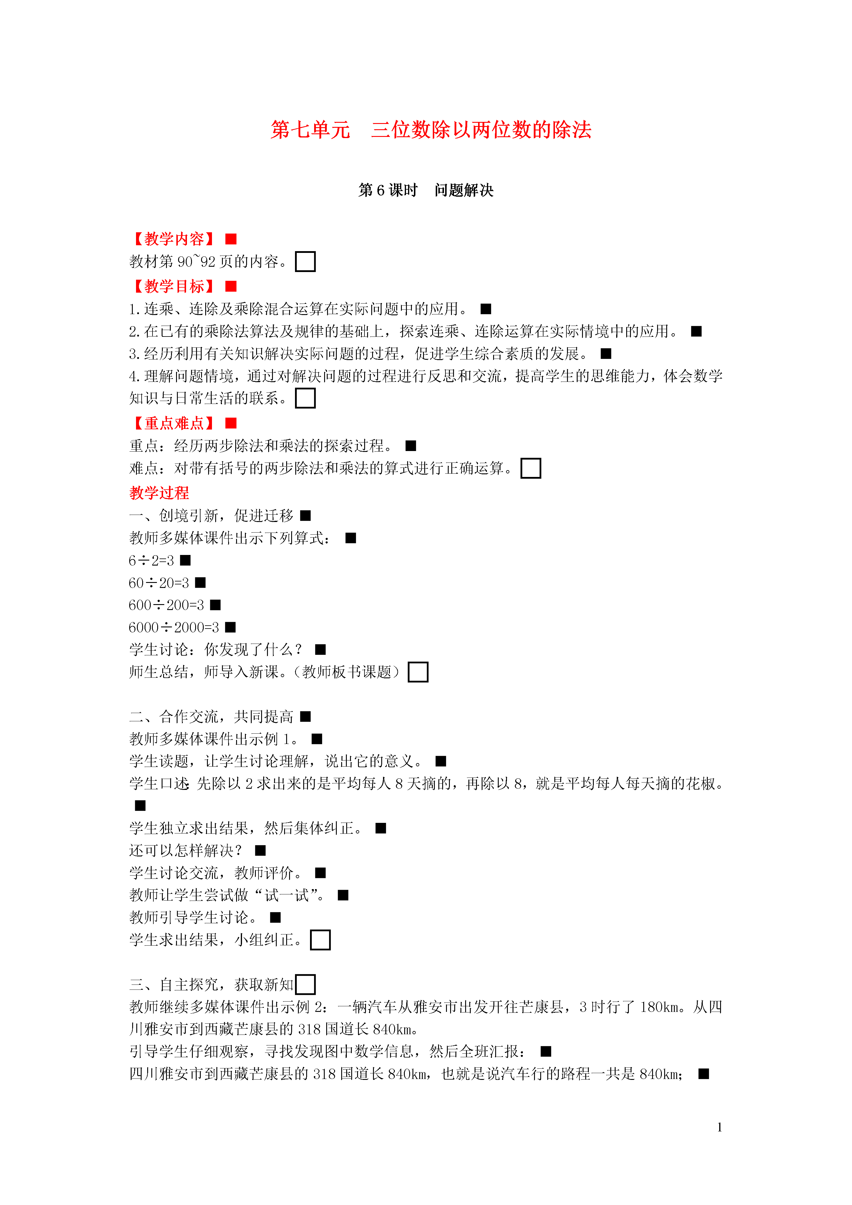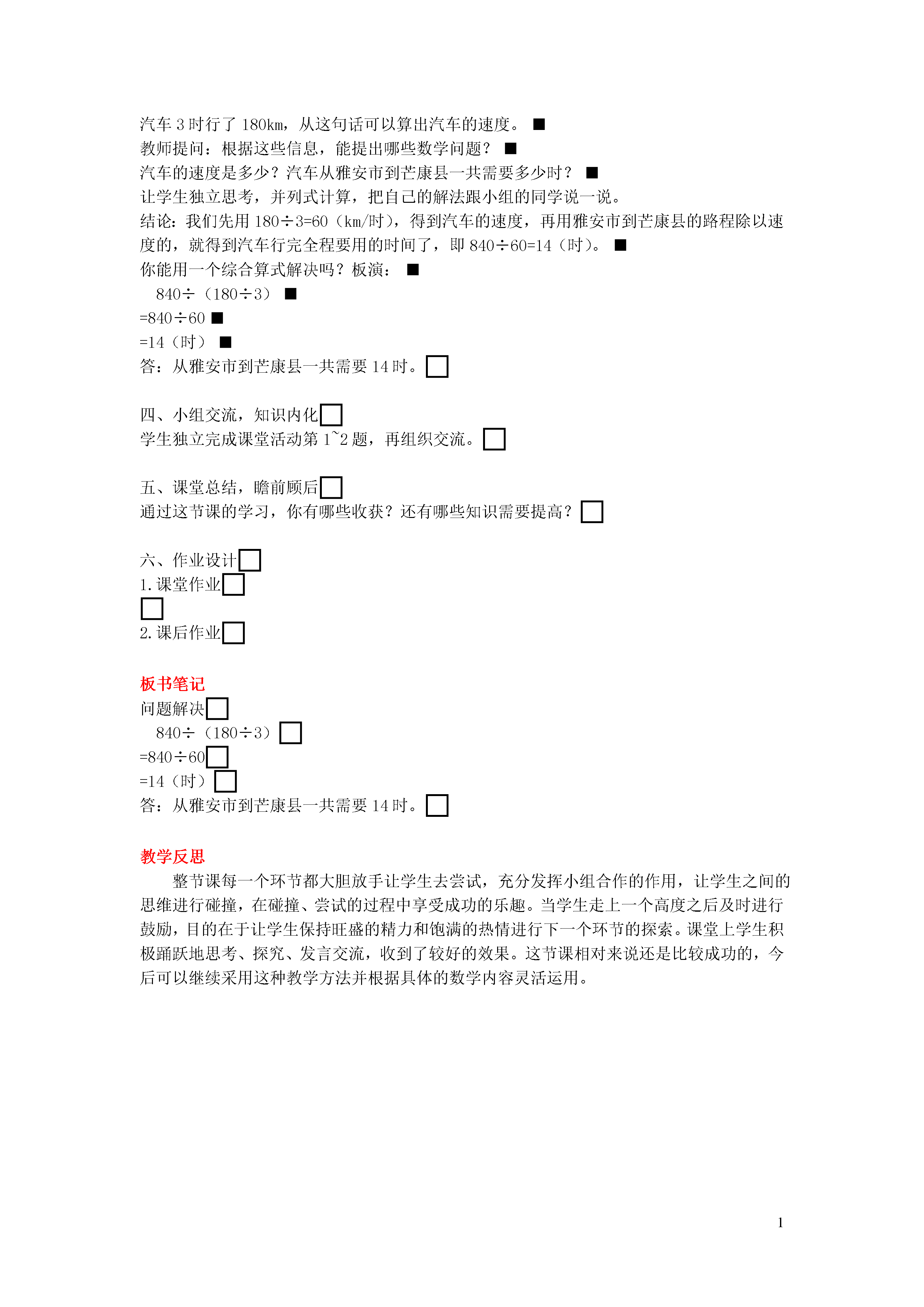 1第七单元三位数除以两位数的除法第6课时问题解决【教学内容】教材第90~92页的内容。【教学目标】1.连乘、连除及乘除混合运算在实际问题中的应用。2.在已有的乘除法算法及规律的基础上,探索连乘、连除运算在实际情境中的应用。3.经历利用有关知识解决实际问题的过程,促进学生综合素质的发展。4.理解问题情境,通过对解决问题的过程进行反思和交流,提高学生的思维能力,体会数学知识与日常生活的联系。【重点难点】重点:经历两步除法和乘法的探索过程。难点:对带有括号的两步除法和乘法的算式进行正确运算。教学过程一、创境引新,促进迁移教师多媒体课件出示下列算式:6÷2=360÷20=3600÷200=36000÷2000=3学生讨论:你发现了什么?师生总结,师导入新课。(教师板书课题)二、合作交流,共同提高教师多媒体课件出示例1。学生读题,让学生讨论理解,说出它的意义。学生口述:先除以2求出来的是平均每人8天摘的,再除以8,就是平均每人每天摘的花椒。学生独立求出结果,然后集体纠正。还可以怎样解决?学生讨论交流,教师评价。教师让学生尝试做“试一试”。教师引导学生讨论。学生求出结果,小组纠正。三、自主探究,获取新知教师继续多媒体课件出示例2:一辆汽车从雅安市出发开往芒康县,3时行了180km。从四川雅安市到西藏芒康县的318国道长840km。引导学生仔细观察,寻找发现图中数学信息,然后全班汇报:四川雅安市到西藏芒康县的318国道长840km,也就是说汽车行的路程一共是840km;汽车3时行了180km,从这句话可以算出汽车的速度。教师提问:根据这些信息,能提出哪些数学问题?汽车的速度是多少?汽车从雅安市到芒康县一共需要多少时?让学生独立思考,并列式计算,把自己的解法跟小组的同学说一说。结论:我们先用180÷3=60(km/时),得到汽车的速度,再用雅安市到芒康县的路程除以速度的,就得到汽车行完全程要用的时间了,即840÷60=14(时)。你能用一个综合算式解决吗?板演:840÷(180÷3)=840÷60=14(时)答:从雅安市到芒康县一共需要14时。四、小组交流,知识内化学生独立完成课堂活动第1~2题,再组织交流。五、课堂总结,瞻前顾后通过这节课的学习,你有哪些收获?还有哪些知识需要提高?六、作业设计1.课堂作业2.课后作业板书笔记问题解决840÷(180÷3)=840÷60=14(时)答:从雅安市到芒康县一共需要14时。教学反思整节课每一个环节都大胆放手让学生去尝试,充分发挥小组合作的作用,让学生之间的思维进行碰撞,在碰撞、尝试的过程中享受成功的乐趣。当学生走上一个高度之后及时进行鼓励,目的在于让学生保持旺盛的精力和饱满的热情进行下一个环节的探索。课堂上学生积极踊跃地思考、探究、发言交流,收到了较好的效果。这节课相对来说还是比较成功的,今后可以继续采用这种教学方法并根据具体的数学内容灵活运用。