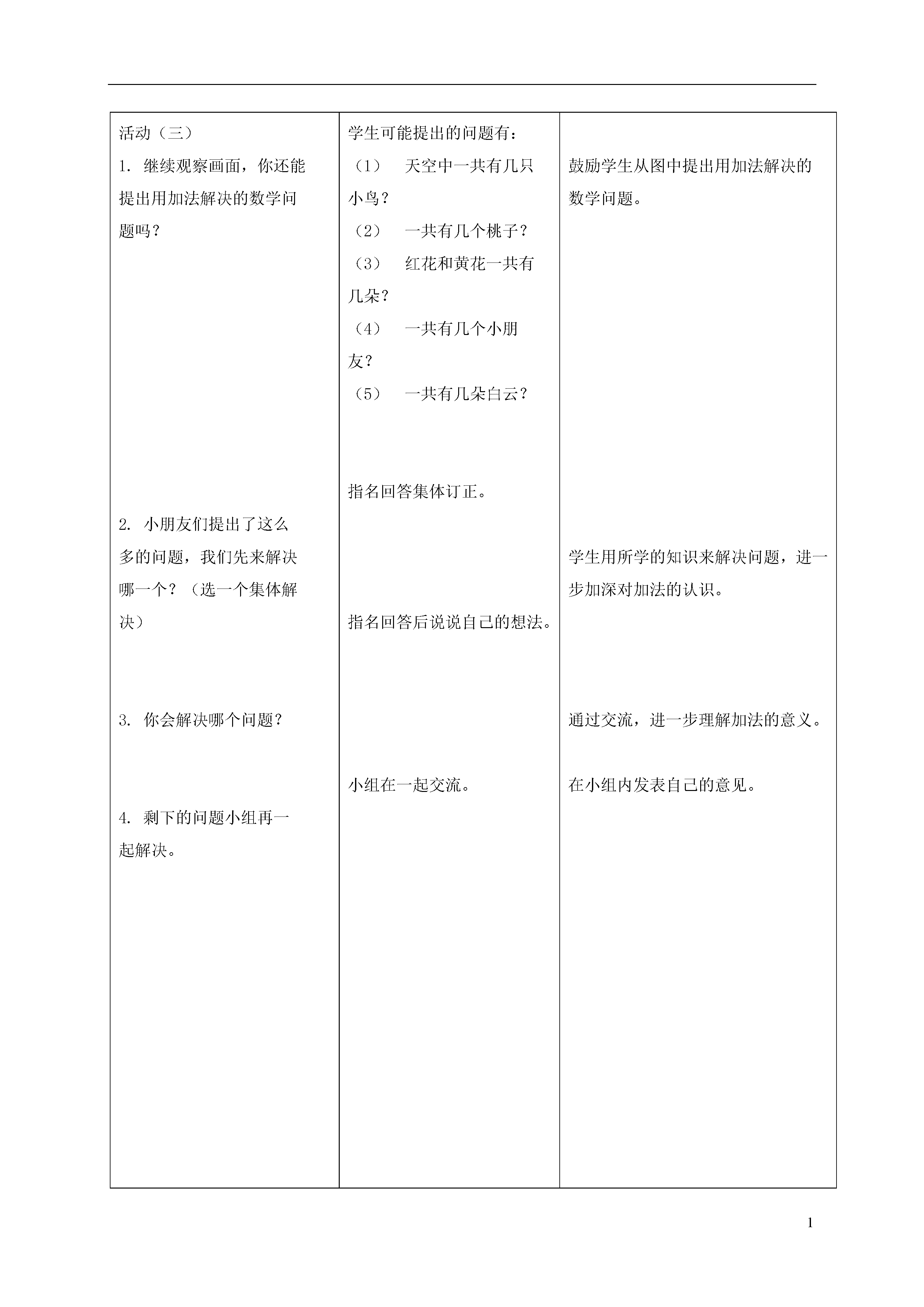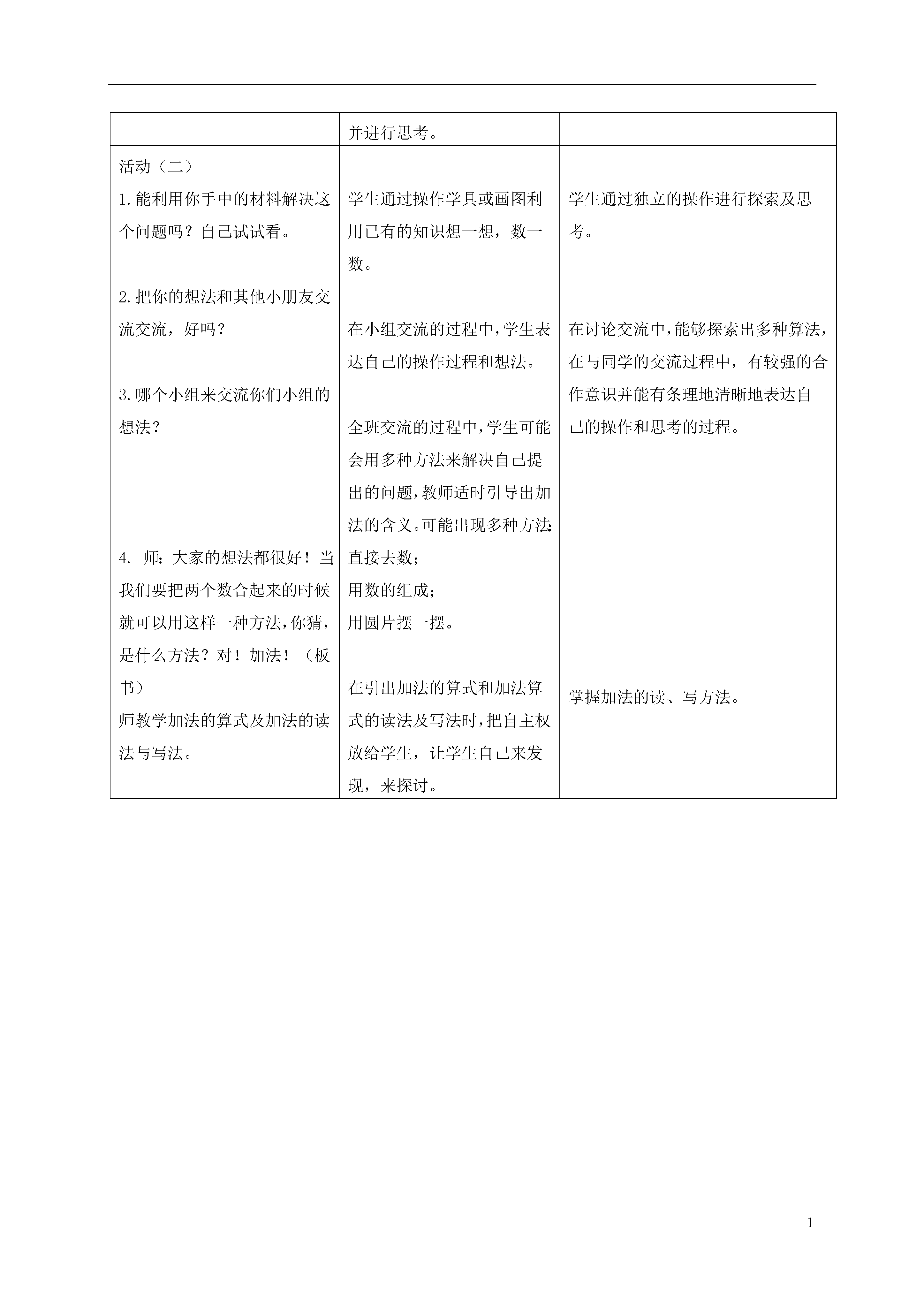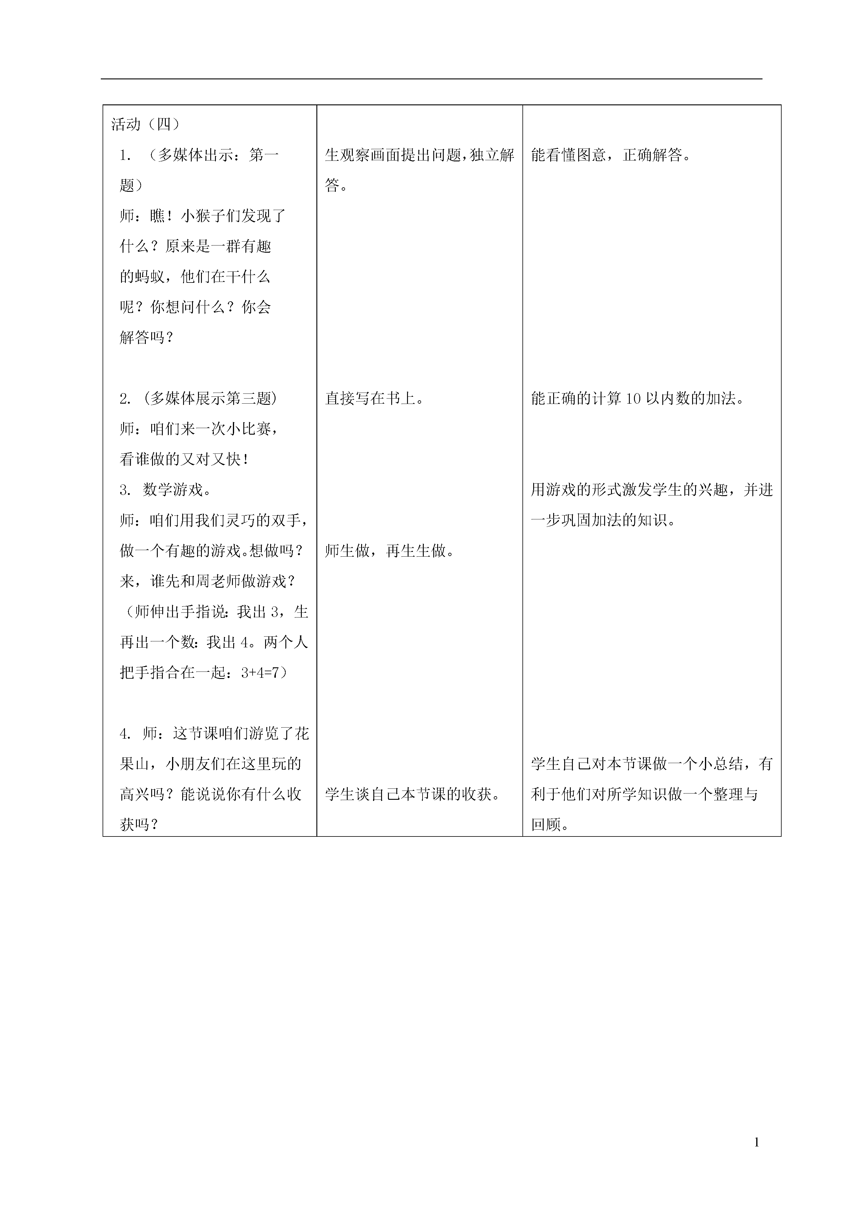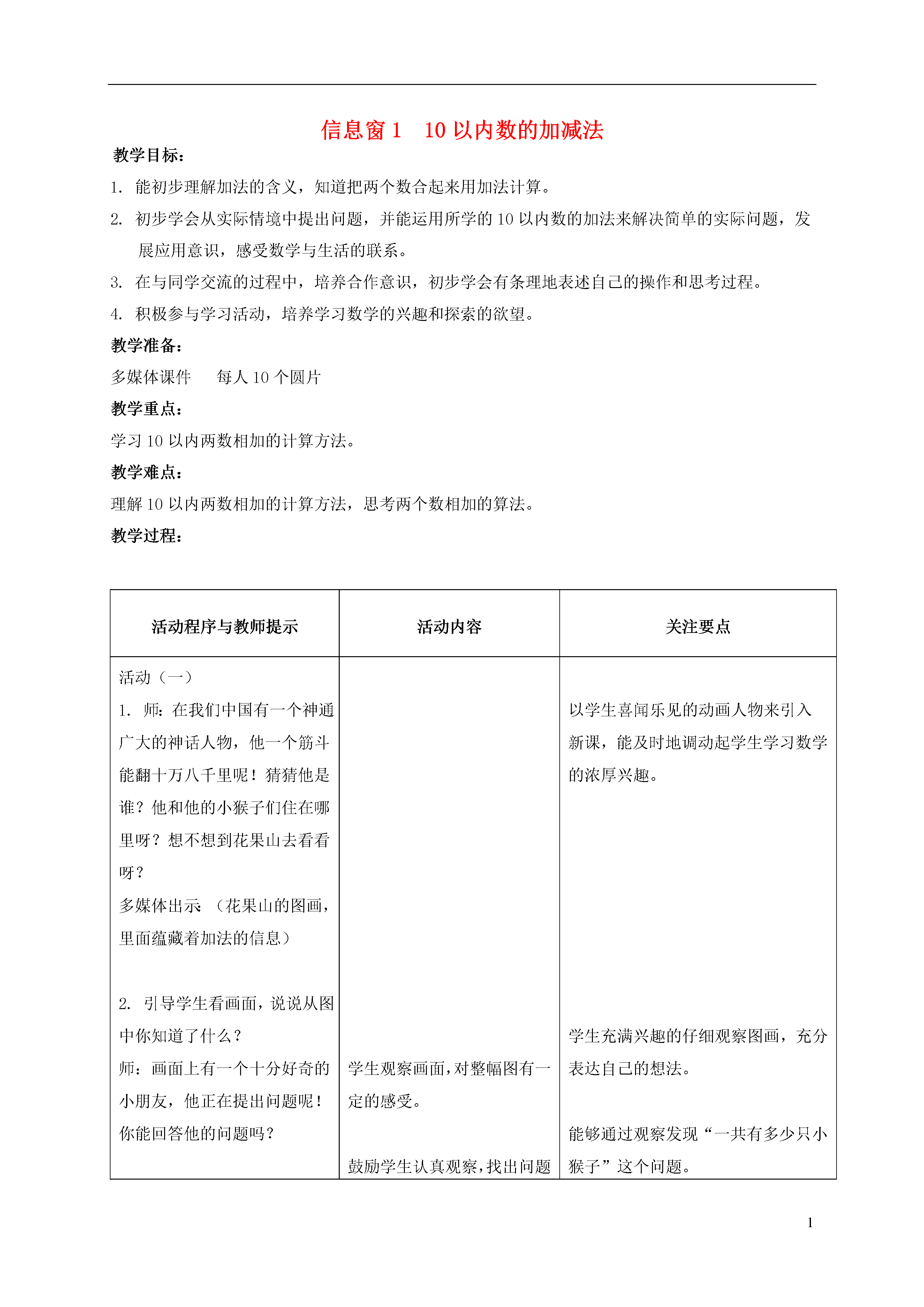 1信息窗110以内数的加减法教学目标:1.能初步理解加法的含义,知道把两个数合起来用加法计算。2.初步学会从实际情境中提出问题,并能运用所学的10以内数的加法来解决简单的实际问题,发展应用意识,感受数学与生活的联系。3.在与同学交流的过程中,培养合作意识,初步学会有条理地表述自己的操作和思考过程。4.积极参与学习活动,培养学习数学的兴趣和探索的欲望。教学准备:多媒体课件每人10个圆片教学重点:学习10以内两数相加的计算方法。教学难点:理解10以内两数相加的计算方法,思考两个数相加的算法。教学过程:活动程序与教师提示活动内容关注要点活动(一)1.师:在我们中国有一个神通广大的神话人物,他一个筋斗能翻十万八千里呢!猜猜他是谁?他和他的小猴子们住在哪里呀?想不想到花果山去看看呀?多媒体出示:(花果山的图画,里面蕴藏着加法的信息)2.引导学生看画面,说说从图中你知道了什么?师:画面上有一个十分好奇的小朋友,他正在提出问题呢!你能回答他的问题吗?学生观察画面,对整幅图有一定的感受。鼓励学生认真观察,找出问题并进行思考。以学生喜闻乐见的动画人物来引入新课,能及时地调动起学生学习数学的浓厚兴趣。学生充满兴趣的仔细观察图画,充分表达自己的想法。能够通过观察发现“一共有多少只小猴子”这个问题。活动(二)1.能利用你手中的材料解决这个问题吗?自己试试看。2.把你的想法和其他小朋友交流交流,好吗?3.哪个小组来交流你们小组的想法?4.师:大家的想法都很好!当我们要把两个数合起来的时候就可以用这样一种方法,你猜,是什么方法?对!加法!(板书)师教学加法的算式及加法的读法与写法。学生通过操作学具或画图利用已有的知识想一想,数一数。在小组交流的过程中,学生表达自己的操作过程和想法。全班交流的过程中,学生可能会用多种方法来解决自己提出的问题,教师适时引导出加法的含义。可能出现多种方法:直接去数;用数的组成;用圆片摆一摆。在引出加法的算式和加法算式的读法及写法时,把自主权放给学生,让学生自己来发现,来探讨。学生通过独立的操作进行探索及思考。在讨论交流中,能够探索出多种算法,在与同学的交流过程中,有较强的合作意识并能有条理地清晰地表达自己的操作和思考的过程。掌握加法的读、写方法。活动(三)1.继续观察画面,你还能提出用加法解决的数学问题吗?2.小朋友们提出了这么多的问题,我们先来解决哪一个?(选一个集体解决)3.你会解决哪个问题?4.剩下的问题小组再一起解决。学生可能提出的问题有:(1)天空中一共有几只小鸟?(2)一共有几个桃子?(3)红花和黄花一共有几朵?(4)一共有几个小朋友?(5)一共有几朵白云?指名回答集体订正。指名回答后说说自己的想法。小组在一起交流。鼓励学生从图中提出用加法解决的数学问题。学生用所学的知识来解决问题,进一步加深对加法的认识。通过交流,进一步理解加法的意义。在小组内发表自己的意见。活动(四)1.(多媒体出示:第一题)师:瞧!小猴子们发现了什么?原来是一群有趣的蚂蚁,他们在干什么呢?你想问什么?你会解答吗?2.(多媒体展示第三题)师:咱们来一次小比赛,看谁做的又对又快!3.数学游戏。师:咱们用我们灵巧的双手,做一个有趣的游戏。想做吗?来,谁先和周老师做游戏?(师伸出手指说:我出3,生再出一个数:我出4。两个人把手指合在一起:3+4=7)4.师:这节课咱们游览了花果山,小朋友们在这里玩的高兴吗?能说说你有什么收获吗?生观察画面提出问题,独立解答。直接写在书上。师生做,再生生做。学生谈自己本节课的收获。能看懂图意,正确解答。能正确的计算10以内数的加法。用游戏的形式激发学生的兴趣,并进一步巩固加法的知识。学生自己对本节课做一个小总结,有利于他们对所学知识做一个整理与回顾。