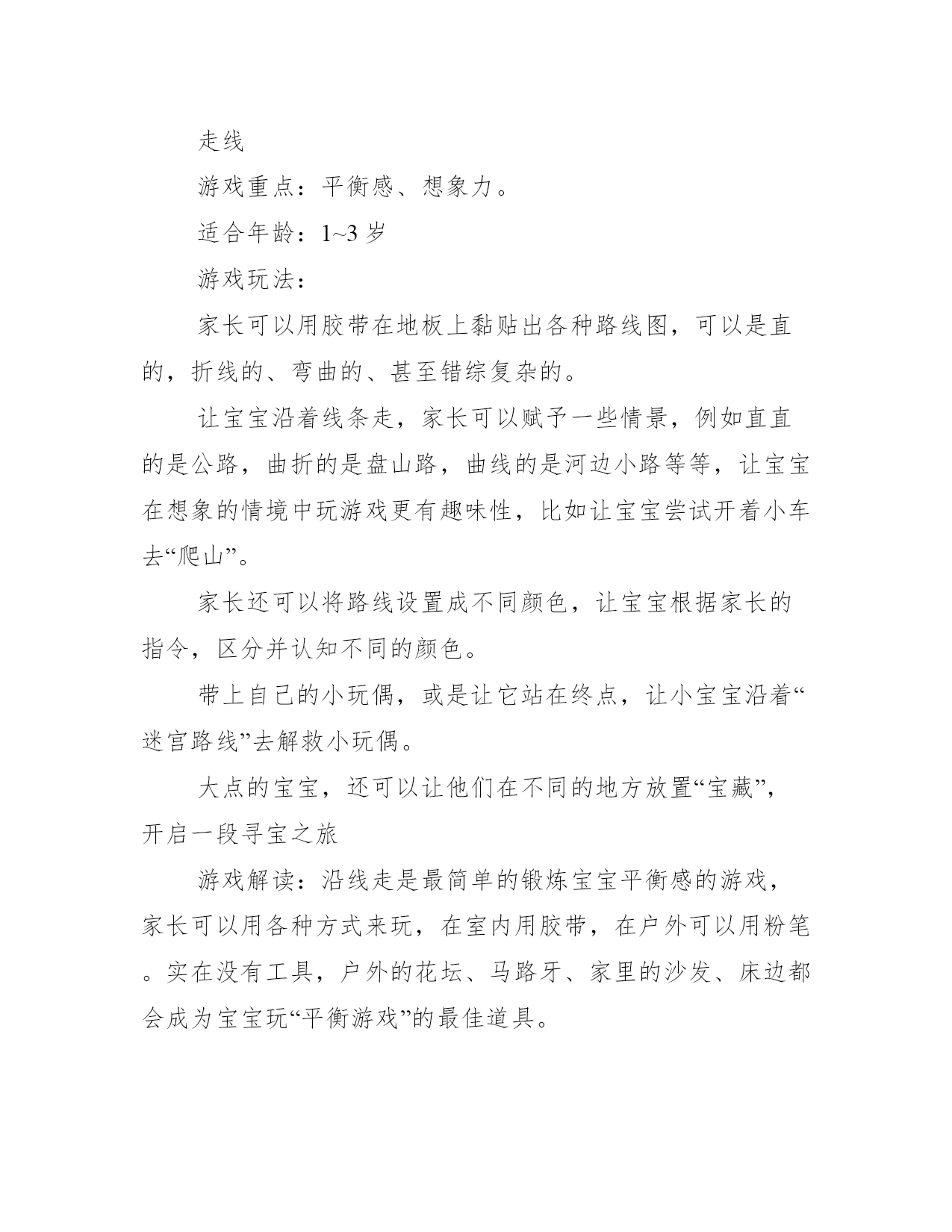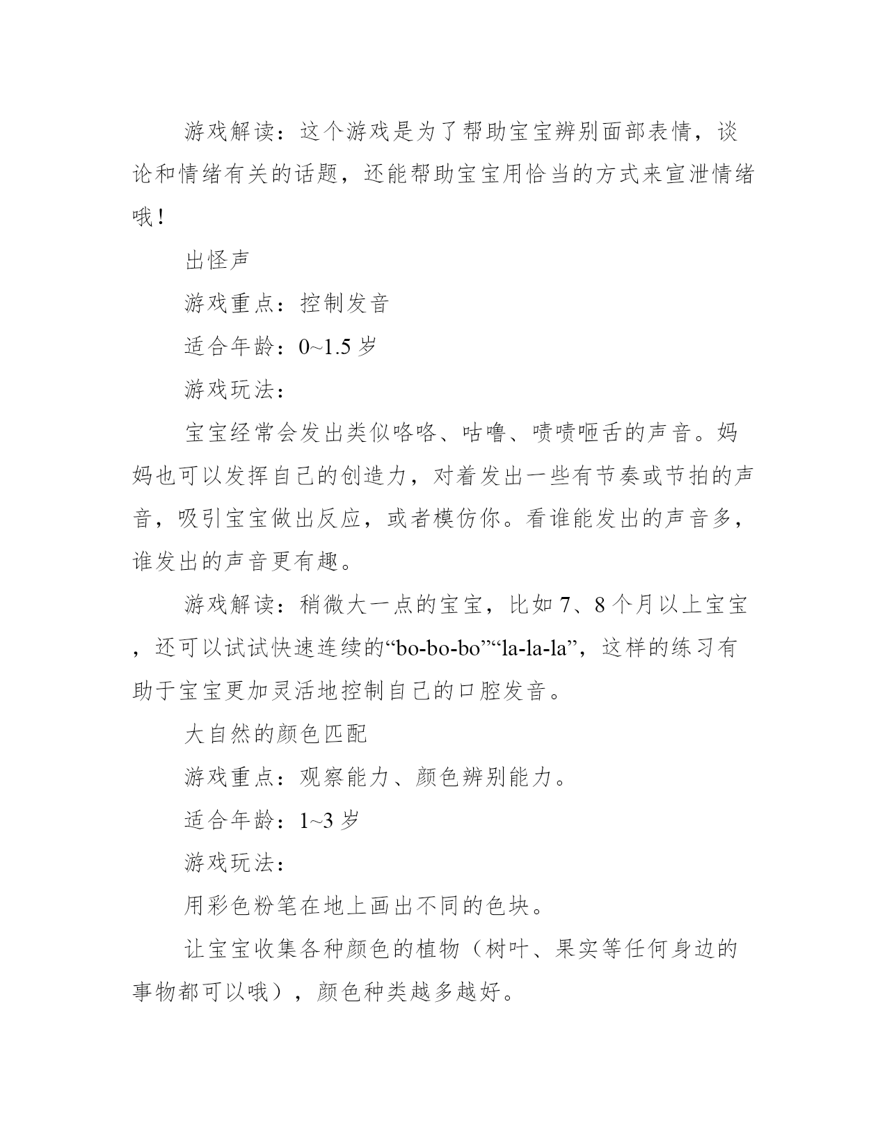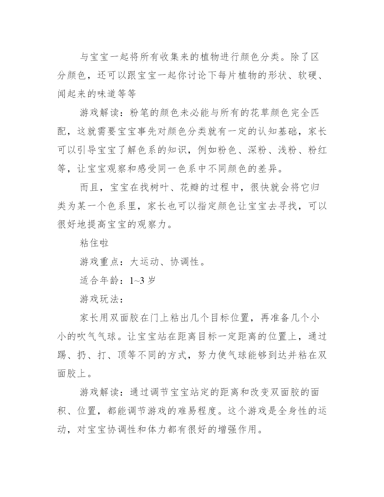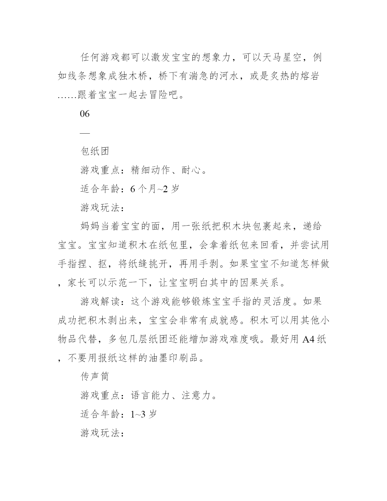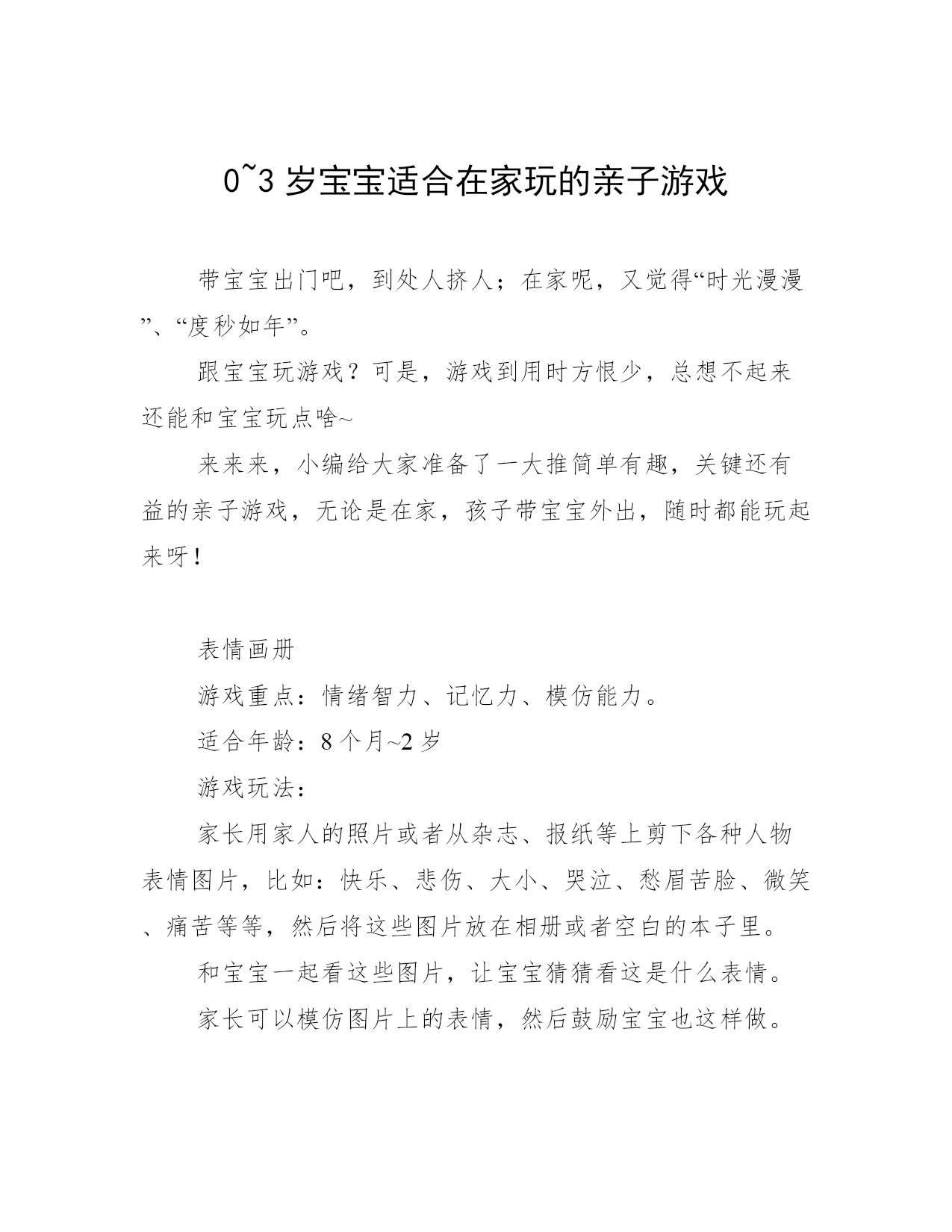 0~3岁宝宝适合在家玩的亲子游戏带宝宝出门吧,到处人挤人;在家呢,又觉得“时光漫漫”、“度秒如年”。跟宝宝玩游戏?可是,游戏到用时方恨少,总想不起来还能和宝宝玩点啥~来来来,小编给大家准备了一大推简单有趣,关键还有益的亲子游戏,无论是在家,孩子带宝宝外出,随时都能玩起来呀!表情画册游戏重点:情绪智力、记忆力、模仿能力。适合年龄:8个月~2岁游戏玩法:家长用家人的照片或者从杂志、报纸等上剪下各种人物表情图片,比如:快乐、悲伤、大小、哭泣、愁眉苦脸、微笑、痛苦等等,然后将这些图片放在相册或者空白的本子里。和宝宝一起看这些图片,让宝宝猜猜看这是什么表情。家长可以模仿图片上的表情,然后鼓励宝宝也这样做。游戏解读:这个游戏是为了帮助宝宝辨别面部表情,谈论和情绪有关的话题,还能帮助宝宝用恰当的方式来宣泄情绪哦!出怪声游戏重点:控制发音适合年龄:0~1.5岁游戏玩法:宝宝经常会发出类似咯咯、咕噜、啧啧咂舌的声音。妈妈也可以发挥自己的创造力,对着发出一些有节奏或节拍的声音,吸引宝宝做出反应,或者模仿你。看谁能发出的声音多,谁发出的声音更有趣。游戏解读:稍微大一点的宝宝,比如7、8个月以上宝宝,还可以试试快速连续的“bo-bo-bo”“la-la-la”,这样的练习有助于宝宝更加灵活地控制自己的口腔发音。大自然的颜色匹配游戏重点:观察能力、颜色辨别能力。适合年龄:1~3岁游戏玩法:用彩色粉笔在地上画出不同的色块。让宝宝收集各种颜色的植物(树叶、果实等任何身边的事物都可以哦),颜色种类越多越好。与宝宝一起将所有收集来的植物进行颜色分类。除了区分颜色,还可以跟宝宝一起你讨论下每片植物的形状、软硬、闻起来的味道等等游戏解读:粉笔的颜色未必能与所有的花草颜色完全匹配,这就需要宝宝事先对颜色分类就有一定的认知基础,家长可以引导宝宝了解色系的知识,例如粉色、深粉、浅粉、粉红等,让宝宝观察和感受同一色系中不同颜色的差异。而且,宝宝在找树叶、花瓣的过程中,很快就会将它归类为某一个色系里,家长也可以指定颜色让宝宝去寻找,可以很好地提高宝宝的观察力。粘住啦游戏重点:大运动、协调性。适合年龄:1~3岁游戏玩法:家长用双面胶在门上粘出几个目标位置,再准备几个小小的吹气气球。让宝宝站在距离目标一定距离的位置上,通过踢、扔、打、顶等不同的方式,努力使气球能够到达并粘在双面胶上。游戏解读:通过调节宝宝站定的距离和改变双面胶的面积、位置,都能调节游戏的难易程度。这个游戏是全身性的运动,对宝宝协调性和体力都有很好的增强作用。走线游戏重点:平衡感、想象力。适合年龄:1~3岁游戏玩法:家长可以用胶带在地板上黏贴出各种路线图,可以是直的,折线的、弯曲的、甚至错综复杂的。让宝宝沿着线条走,家长可以赋予一些情景,例如直直的是公路,曲折的是盘山路,曲线的是河边小路等等,让宝宝在想象的情境中玩游戏更有趣味性,比如让宝宝尝试开着小车去“爬山”。家长还可以将路线设置成不同颜色,让宝宝根据家长的指令,区分并认知不同的颜色。带上自己的小玩偶,或是让它站在终点,让小宝宝沿着“迷宫路线”去解救小玩偶。大点的宝宝,还可以让他们在不同的地方放置“宝藏”,开启一段寻宝之旅游戏解读:沿线走是最简单的锻炼宝宝平衡感的游戏,家长可以用各种方式来玩,在室内用胶带,在户外可以用粉笔。实在没有工具,户外的花坛、马路牙、家里的沙发、床边都会成为宝宝玩“平衡游戏”的最佳道具。任何游戏都可以激发宝宝的想象力,可以天马星空,例如线条想象成独木桥,桥下有湍急的河水,或是炙热的熔岩……跟着宝宝一起去冒险吧。06—包纸团游戏重点:精细动作、耐心。适合年龄:6个月~2岁游戏玩法:妈妈当着宝宝的面,用一张纸把积木块包裹起来,递给宝宝。宝宝知道积木在纸包里,会拿着纸包来回看,并尝试用手指捏、抠,将纸缝挑开,再用手剥。如果宝宝不知道怎样做,家长可以示范一下,让宝宝明白其中的因果关系。游戏解读:这个游戏能够锻炼宝宝手指的灵活度。如果成功把积木剥出来,宝宝会非常有成就感。积木可以用其他小物品代替,多包几层纸团还能增加游戏难度哦。最好用A4纸,不要用报纸这样的油墨印刷品。传声筒游戏重点:语言能力、注意力。适合年龄:1~3岁游戏玩法:让宝宝传话。比如,让他对爸爸说:“妈妈说,报纸在书桌上。”再让他对妈妈说:“爸爸说,知道了,谢谢!”参与的家庭成员越多越好,在游戏中,要让宝宝觉得他在家人的沟通中不可或缺,激发宝宝对游戏的高度关注。传话的内容从简单到复杂,从单句到两三句,循序渐进。游戏解读:这个游戏可以提高宝宝的听觉、注意力,同时在游戏过程中,他也会慢慢理解家长的语言,对宝宝的语言能力也是非常好的训练。给小动物们洗澡游戏重点:认知学习能力、语言能力、精细动作、自理能力。适合年龄:1~3岁游戏玩法:建议在浴室里玩这个游戏,铺好防滑垫,如果在其他房间玩的话,