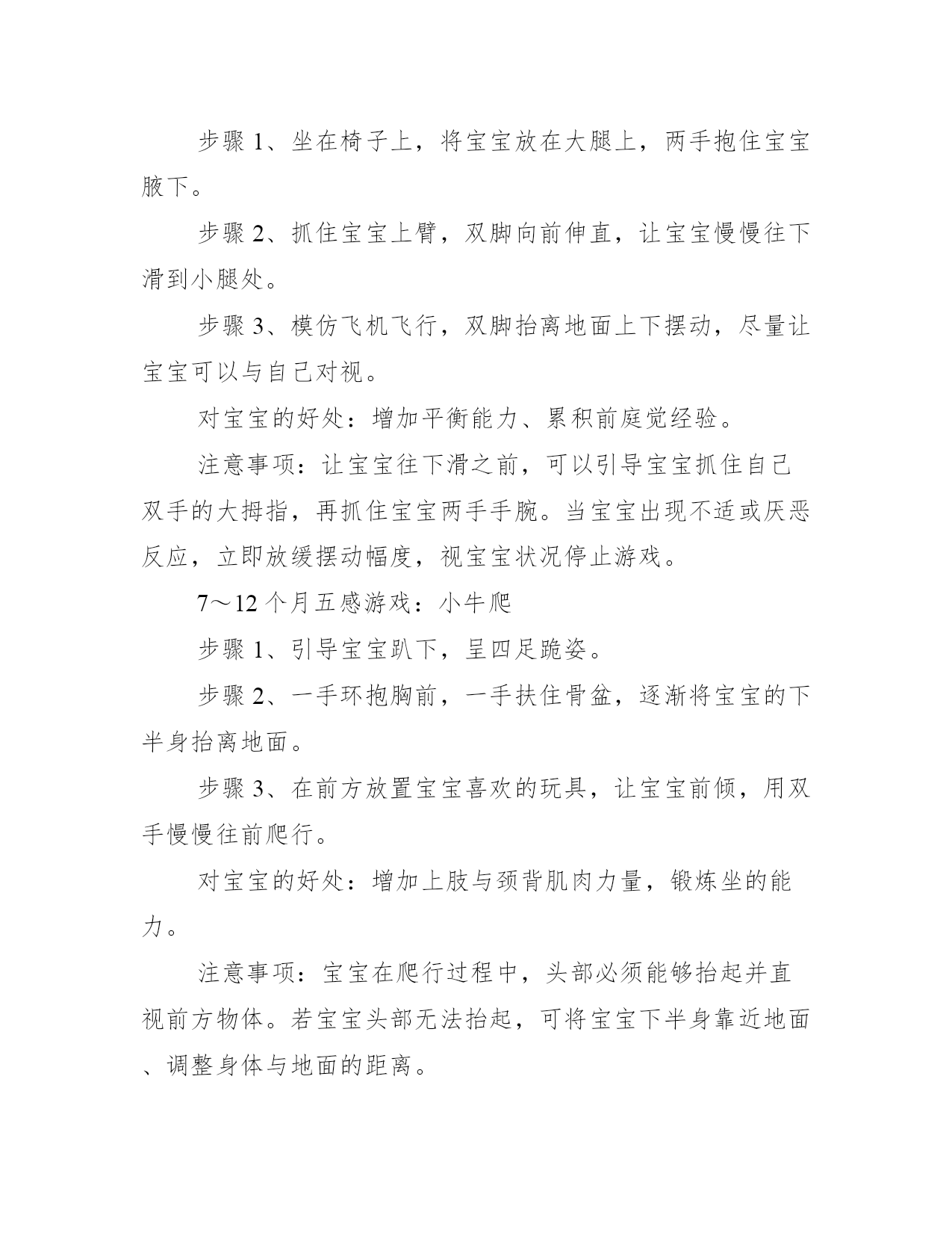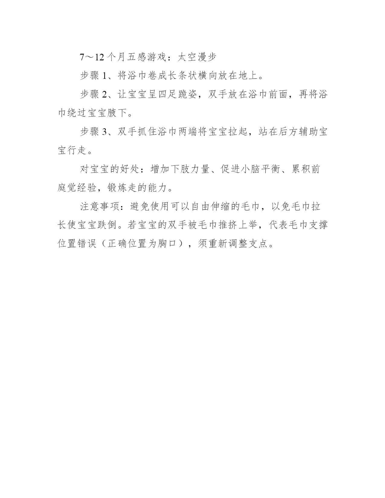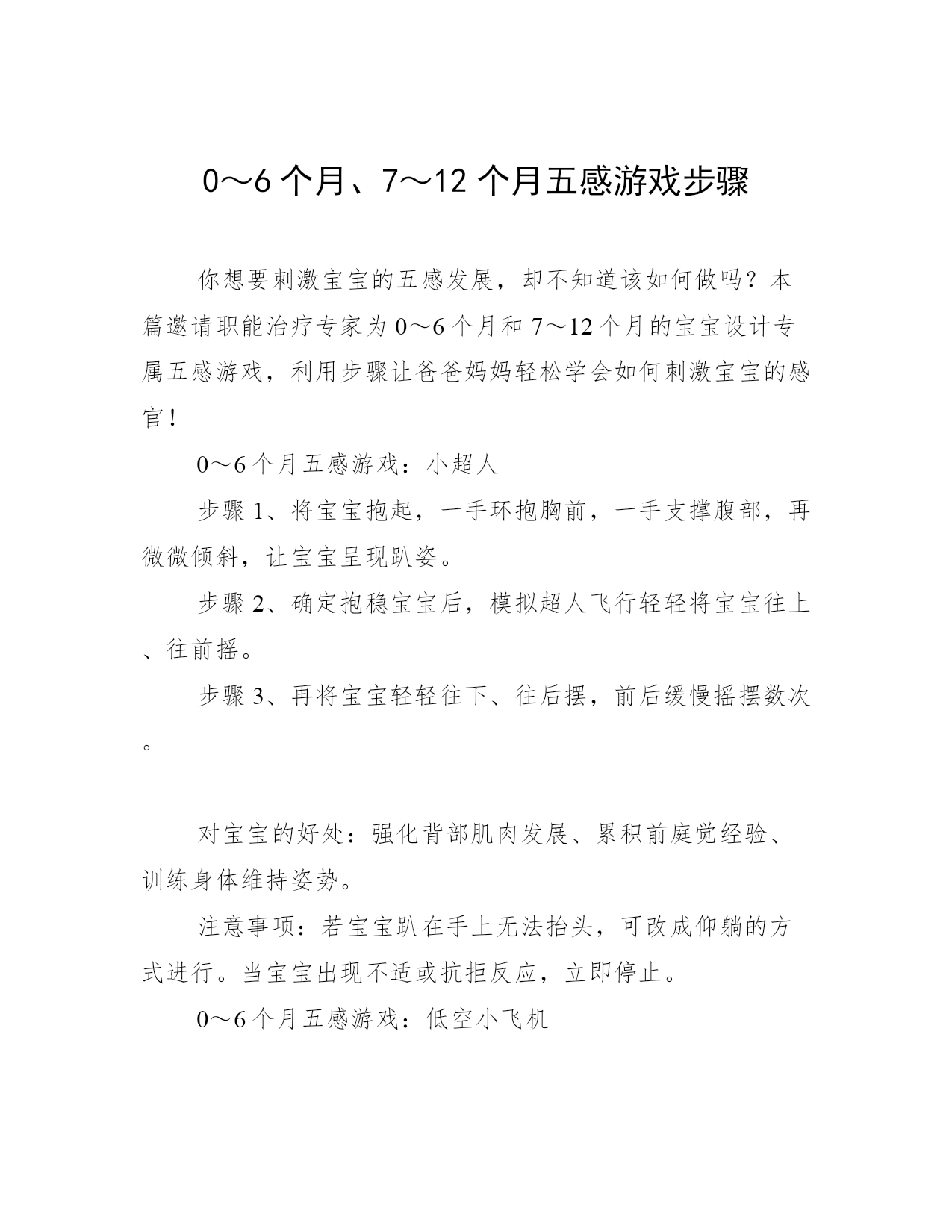0~6个月、7~12个月五感游戏步骤你想要刺激宝宝的五感发展,却不知道该如何做吗?本篇邀请职能治疗专家为0~6个月和7~12个月的宝宝设计专属五感游戏,利用步骤让爸爸妈妈轻松学会如何刺激宝宝的感官!0~6个月五感游戏:小超人步骤1、将宝宝抱起,一手环抱胸前,一手支撑腹部,再微微倾斜,让宝宝呈现趴姿。步骤2、确定抱稳宝宝后,模拟超人飞行轻轻将宝宝往上、往前摇。步骤3、再将宝宝轻轻往下、往后摆,前后缓慢摇摆数次。对宝宝的好处:强化背部肌肉发展、累积前庭觉经验、训练身体维持姿势。注意事项:若宝宝趴在手上无法抬头,可改成仰躺的方式进行。当宝宝出现不适或抗拒反应,立即停止。0~6个月五感游戏:低空小飞机步骤1、坐在椅子上,将宝宝放在大腿上,两手抱住宝宝腋下。步骤2、抓住宝宝上臂,双脚向前伸直,让宝宝慢慢往下滑到小腿处。步骤3、模仿飞机飞行,双脚抬离地面上下摆动,尽量让宝宝可以与自己对视。对宝宝的好处:增加平衡能力、累积前庭觉经验。注意事项:让宝宝往下滑之前,可以引导宝宝抓住自己双手的大拇指,再抓住宝宝两手手腕。当宝宝出现不适或厌恶反应,立即放缓摆动幅度,视宝宝状况停止游戏。7~12个月五感游戏:小牛爬步骤1、引导宝宝趴下,呈四足跪姿。步骤2、一手环抱胸前,一手扶住骨盆,逐渐将宝宝的下半身抬离地面。步骤3、在前方放置宝宝喜欢的玩具,让宝宝前倾,用双手慢慢往前爬行。对宝宝的好处:增加上肢与颈背肌肉力量,锻炼坐的能力。注意事项:宝宝在爬行过程中,头部必须能够抬起并直视前方物体。若宝宝头部无法抬起,可将宝宝下半身靠近地面、调整身体与地面的距离。7~12个月五感游戏:太空漫步步骤1、将浴巾卷成长条状横向放在地上。步骤2、让宝宝呈四足跪姿,双手放在浴巾前面,再将浴巾绕过宝宝腋下。步骤3、双手抓住浴巾两端将宝宝拉起,站在后方辅助宝宝行走。对宝宝的好处:增加下肢力量、促进小脑平衡、累积前庭觉经验,锻炼走的能力。注意事项:避免使用可以自由伸缩的毛巾,以免毛巾拉长使宝宝跌倒。若宝宝的双手被毛巾推挤上举,代表毛巾支撑位置错误(正确位置为胸口),须重新调整支点。