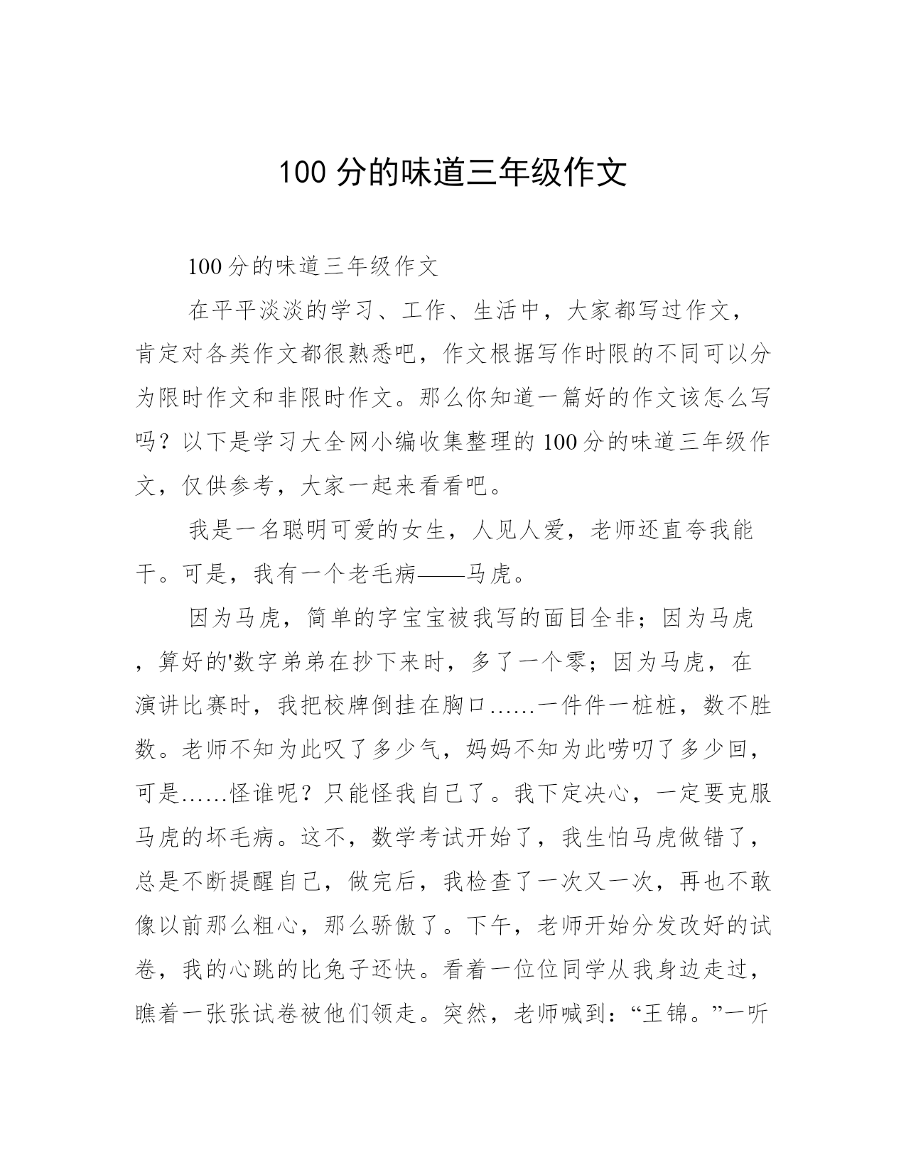 100分的味道三年级作文100分的味道三年级作文在平平淡淡的学习、工作、生活中,大家都写过作文,肯定对各类作文都很熟悉吧,作文根据写作时限的不同可以分为限时作文和非限时作文。那么你知道一篇好的作文该怎么写吗?以下是学习大全网小编收集整理的100分的味道三年级作文,仅供参考,大家一起来看看吧。我是一名聪明可爱的女生,人见人爱,老师还直夸我能干。可是,我有一个老毛病——马虎。因为马虎,简单的字宝宝被我写的面目全非;因为马虎,算好的'数字弟弟在抄下来时,多了一个零;因为马虎,在演讲比赛时,我把校牌倒挂在胸口……一件件一桩桩,数不胜数。老师不知为此叹了多少气,妈妈不知为此唠叨了多少回,可是……怪谁呢?只能怪我自己了。我下定决心,一定要克服马虎的坏毛病。这不,数学考试开始了,我生怕马虎做错了,总是不断提醒自己,做完后,我检查了一次又一次,再也不敢像以前那么粗心,那么骄傲了。下午,老师开始分发改好的试卷,我的心跳的比兔子还快。看着一位位同学从我身边走过,瞧着一张张试卷被他们领走。突然,老师喊到:“王锦。”一听到自己的名字,我的心一紧,“100分。”真的吗?不是我听错了吧?我终于得100分啦!我迫不及待地走上讲台,抬头看见陈老师的脸上露出了少有的微笑并听着老师的表扬,我开心地笑了,心想:"嗨!100分的感觉真好!"爱上100分的味道。努力,努力,继续努力,再也不做马虎鬼。