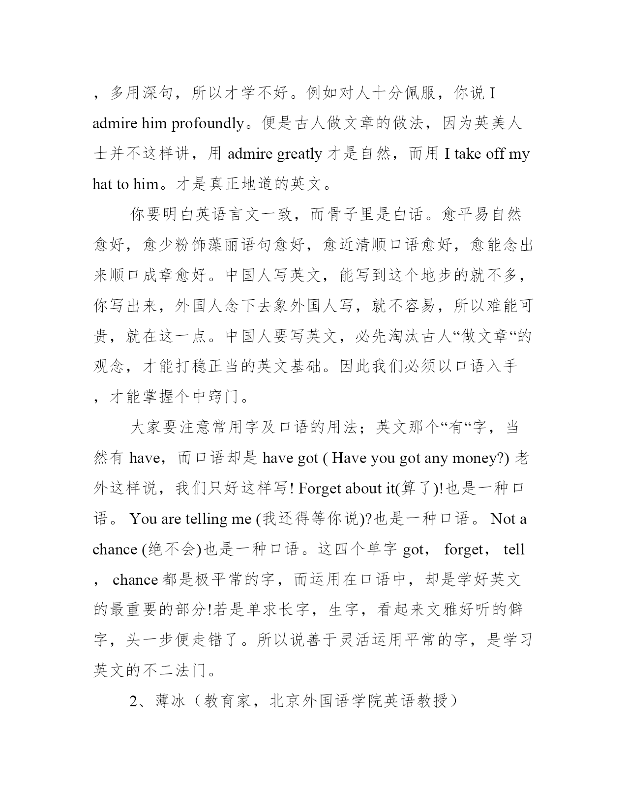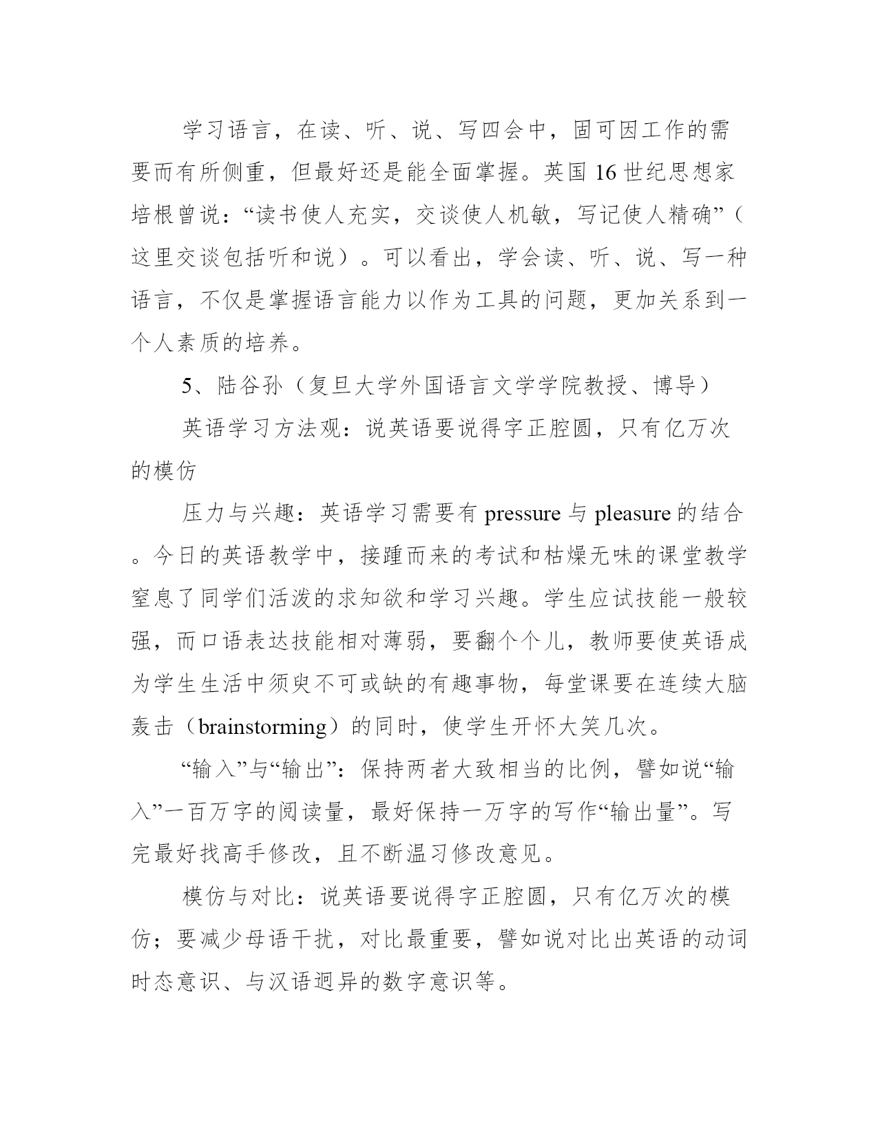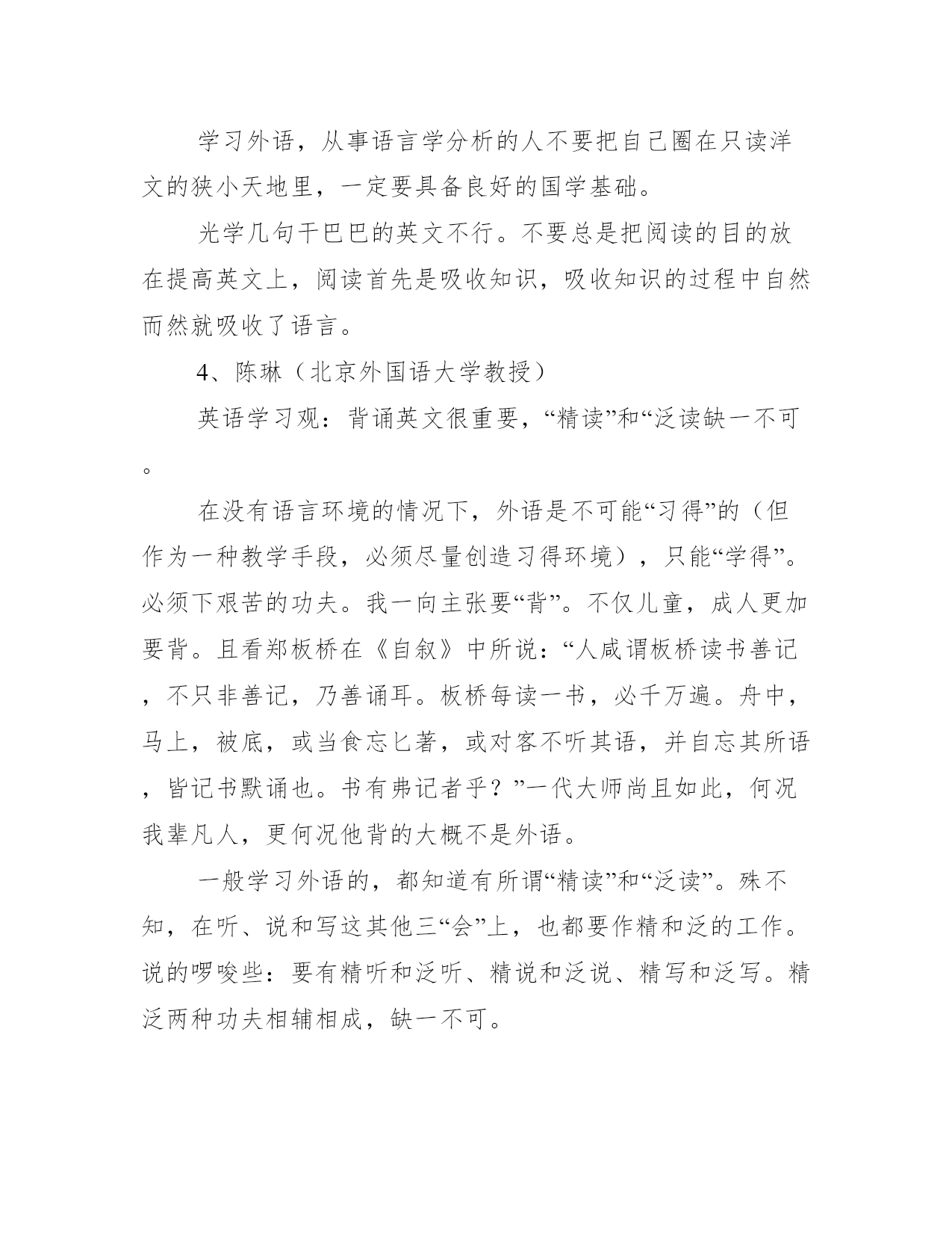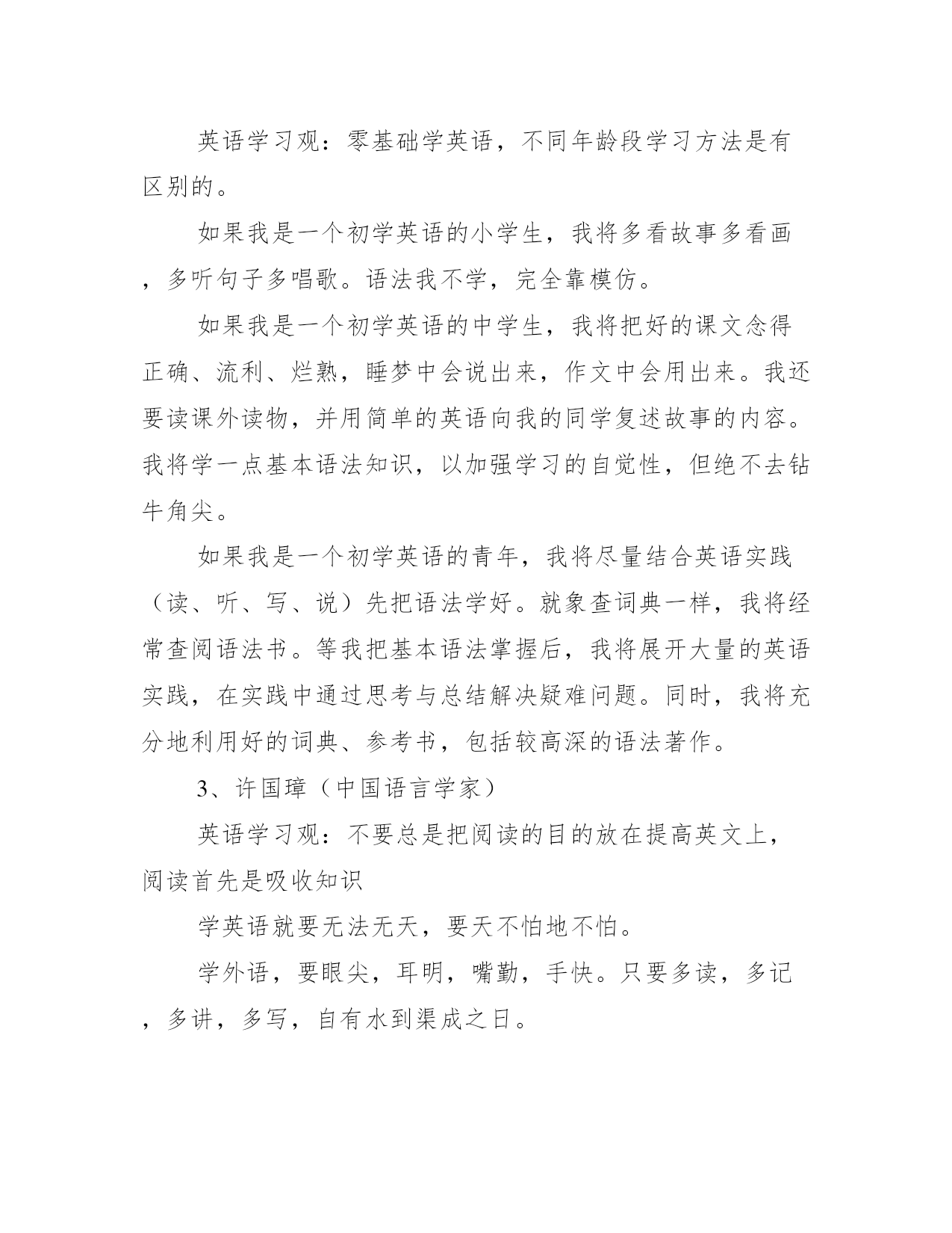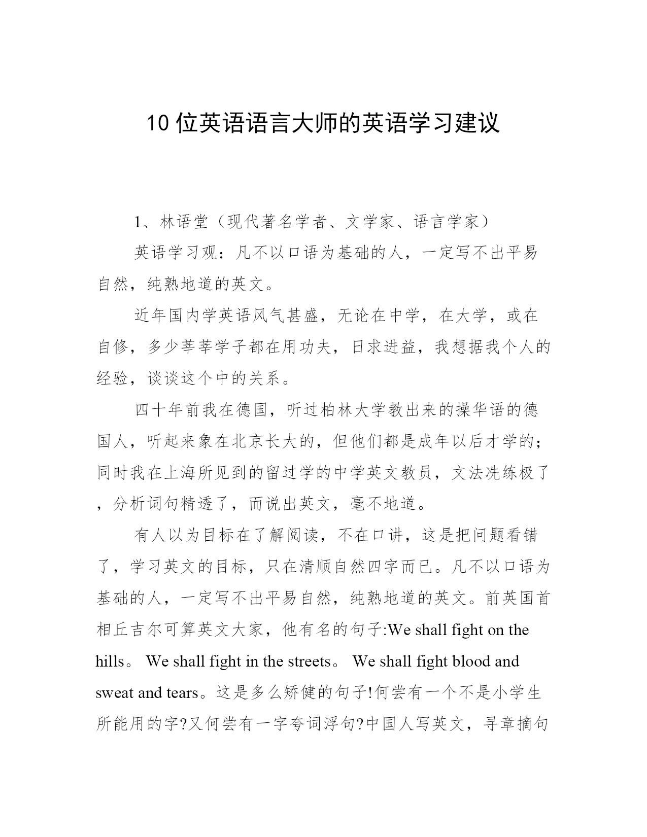 10位英语语言大师的英语学习建议1、林语堂(现代著名学者、文学家、语言学家)英语学习观:凡不以口语为基础的人,一定写不出平易自然,纯熟地道的英文。近年国内学英语风气甚盛,无论在中学,在大学,或在自修,多少莘莘学子都在用功夫,日求进益,我想据我个人的经验,谈谈这个中的关系。四十年前我在德国,听过柏林大学教出来的操华语的德国人,听起来象在北京长大的,但他们都是成年以后才学的;同时我在上海所见到的留过学的中学英文教员,文法冼练极了,分析词句精透了,而说出英文,毫不地道。有人以为目标在了解阅读,不在口讲,这是把问题看错了,学习英文的目标,只在清顺自然四字而已。凡不以口语为基础的人,一定写不出平易自然,纯熟地道的英文。前英国首相丘吉尔可算英文大家,他有名的句子:Weshallfightonthehills。Weshallfightinthestreets。Weshallfightbloodandsweatandtears。这是多么矫健的句子!何尝有一个不是小学生所能用的字?又何尝有一字夸词浮句?中国人写英文,寻章摘句,多用深句,所以才学不好。例如对人十分佩服,你说Iadmirehimprofoundly。便是古人做文章的做法,因为英美人士并不这样讲,用admiregreatly才是自然,而用Itakeoffmyhattohim。才是真正地道的英文。你要明白英语言文一致,而骨子里是白话。愈平易自然愈好,愈少粉饰藻丽语句愈好,愈近清顺口语愈好,愈能念出来顺口成章愈好。中国人写英文,能写到这个地步的就不多,你写出来,外国人念下去象外国人写,就不容易,所以难能可贵,就在这一点。中国人要写英文,必先淘汰古人“做文章“的观念,才能打稳正当的英文基础。因此我们必须以口语入手,才能掌握个中窍门。大家要注意常用字及口语的用法;英文那个“有“字,当然有have,而口语却是havegot(Haveyougotanymoney?)老外这样说,我们只好这样写!Forgetaboutit(算了)!也是一种口语。Youaretellingme(我还得等你说)?也是一种口语。Notachance(绝不会)也是一种口语。这四个单字got,forget,tell,chance都是极平常的字,而运用在口语中,却是学好英文的最重要的部分!若是单求长字,生字,看起来文雅好听的僻字,头一步便走错了。所以说善于灵活运用平常的字,是学习英文的不二法门。2、薄冰(教育家,北京外国语学院英语教授)英语学习观:零基础学英语,不同年龄段学习方法是有区别的。如果我是一个初学英语的小学生,我将多看故事多看画,多听句子多唱歌。语法我不学,完全靠模仿。如果我是一个初学英语的中学生,我将把好的课文念得正确、流利、烂熟,睡梦中会说出来,作文中会用出来。我还要读课外读物,并用简单的英语向我的同学复述故事的内容。我将学一点基本语法知识,以加强学习的自觉性,但绝不去钻牛角尖。如果我是一个初学英语的青年,我将尽量结合英语实践(读、听、写、说)先把语法学好。就象查词典一样,我将经常查阅语法书。等我把基本语法掌握后,我将展开大量的英语实践,在实践中通过思考与总结解决疑难问题。同时,我将充分地利用好的词典、参考书,包括较高深的语法著作。3、许国璋(中国语言学家)英语学习观:不要总是把阅读的目的放在提高英文上,阅读首先是吸收知识学英语就要无法无天,要天不怕地不怕。学外语,要眼尖,耳明,嘴勤,手快。只要多读,多记,多讲,多写,自有水到渠成之日。学习外语,从事语言学分析的人不要把自己圈在只读洋文的狭小天地里,一定要具备良好的国学基础。光学几句干巴巴的英文不行。不要总是把阅读的目的放在提高英文上,阅读首先是吸收知识,吸收知识的过程中自然而然就吸收了语言。4、陈琳(北京外国语大学教授)英语学习观:背诵英文很重要,“精读”和“泛读缺一不可。在没有语言环境的情况下,外语是不可能“习得”的(但作为一种教学手段,必须尽量创造习得环境),只能“学得”。必须下艰苦的功夫。我一向主张要“背”。不仅儿童,成人更加要背。且看郑板桥在《自叙》中所说:“人咸谓板桥读书善记,不只非善记,乃善诵耳。板桥每读一书,必千万遍。舟中,马上,被底,或当食忘匕著,或对客不听其语,并自忘其所语,皆记书默诵也。书有弗记者乎?”一代大师尚且如此,何况我辈凡人,更何况他背的大概不是外语。一般学习外语的,都知道有所谓“精读”和“泛读”。殊不知,在听、说和写这其他三“会”上,也都要作精和泛的工作。说的啰唆些:要有精听和泛听、精说和泛说、精写和泛写。精泛两种功夫相辅相成,缺一不可。学习语言,在读、听、说、写四会中,固可因工作的需要而有所侧重,但最好还是能全面掌握。英国16世纪思想家培根曾说:“读书使人充实,交谈使人机敏,写记使人精确”(这里交谈包括听和说)。可以看出,学会读、
