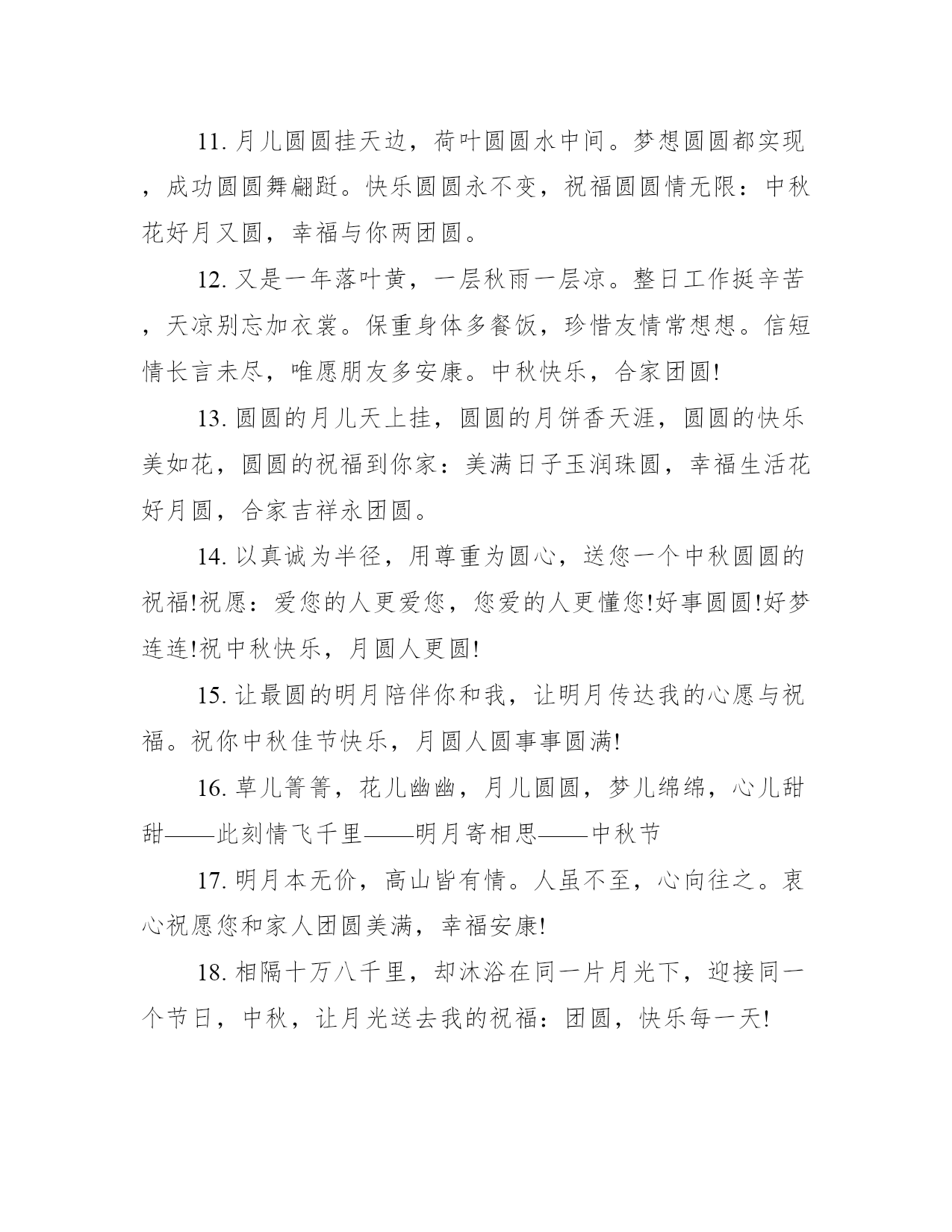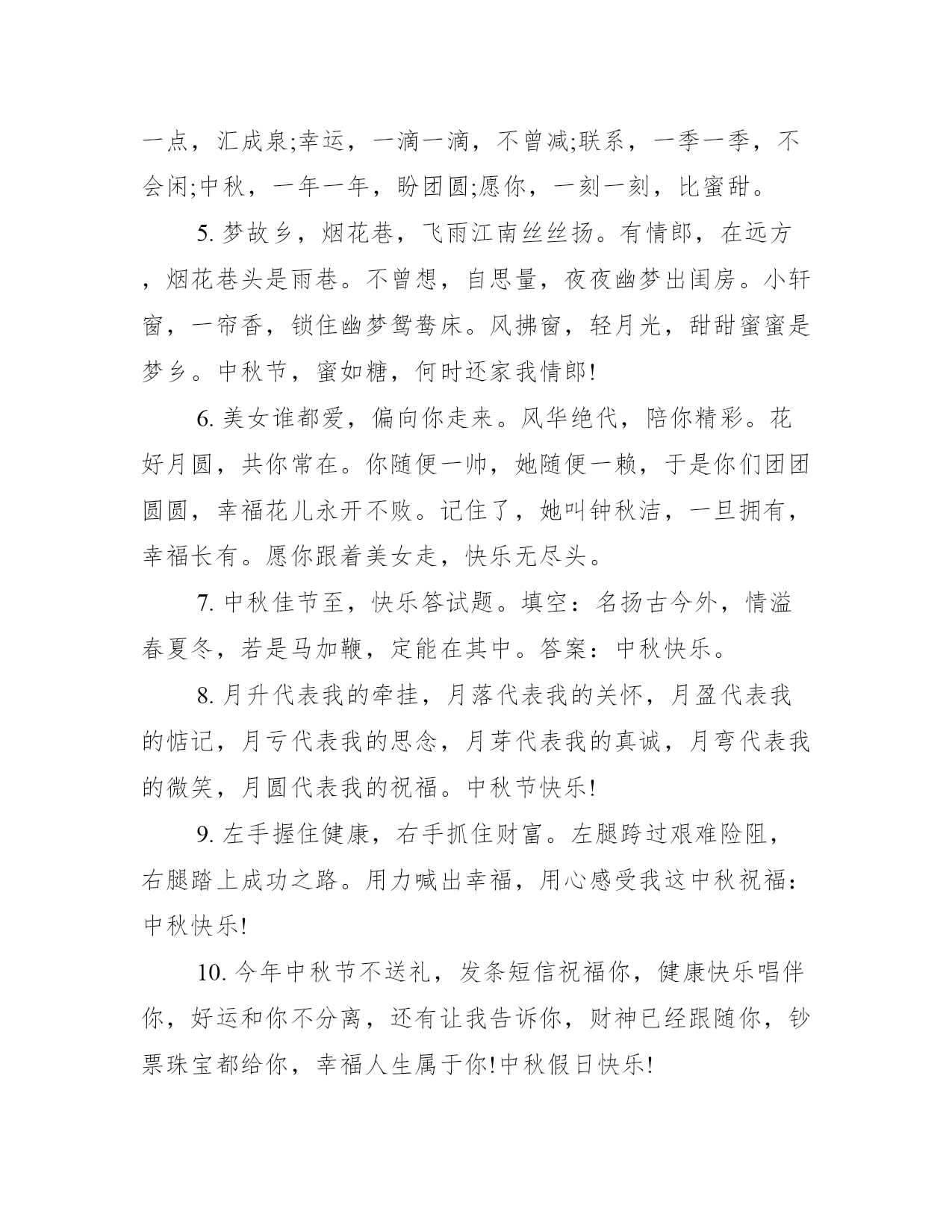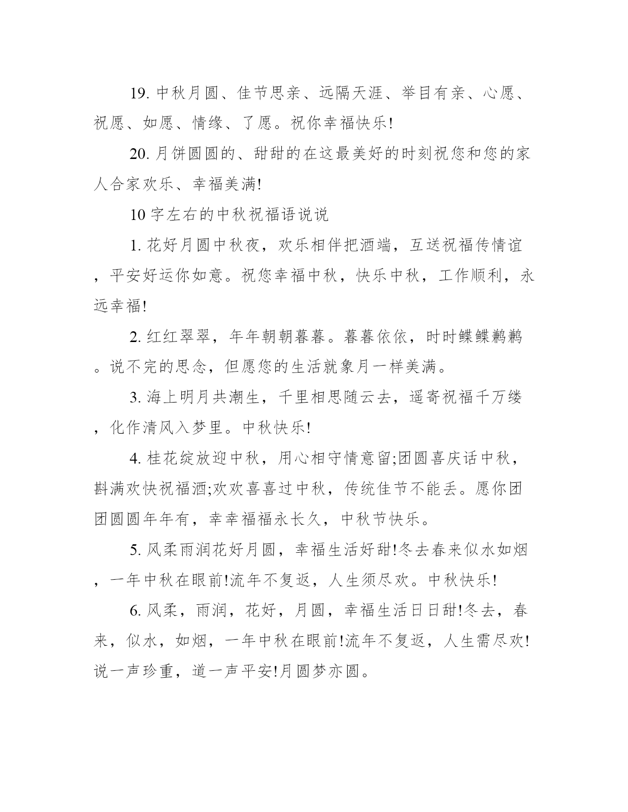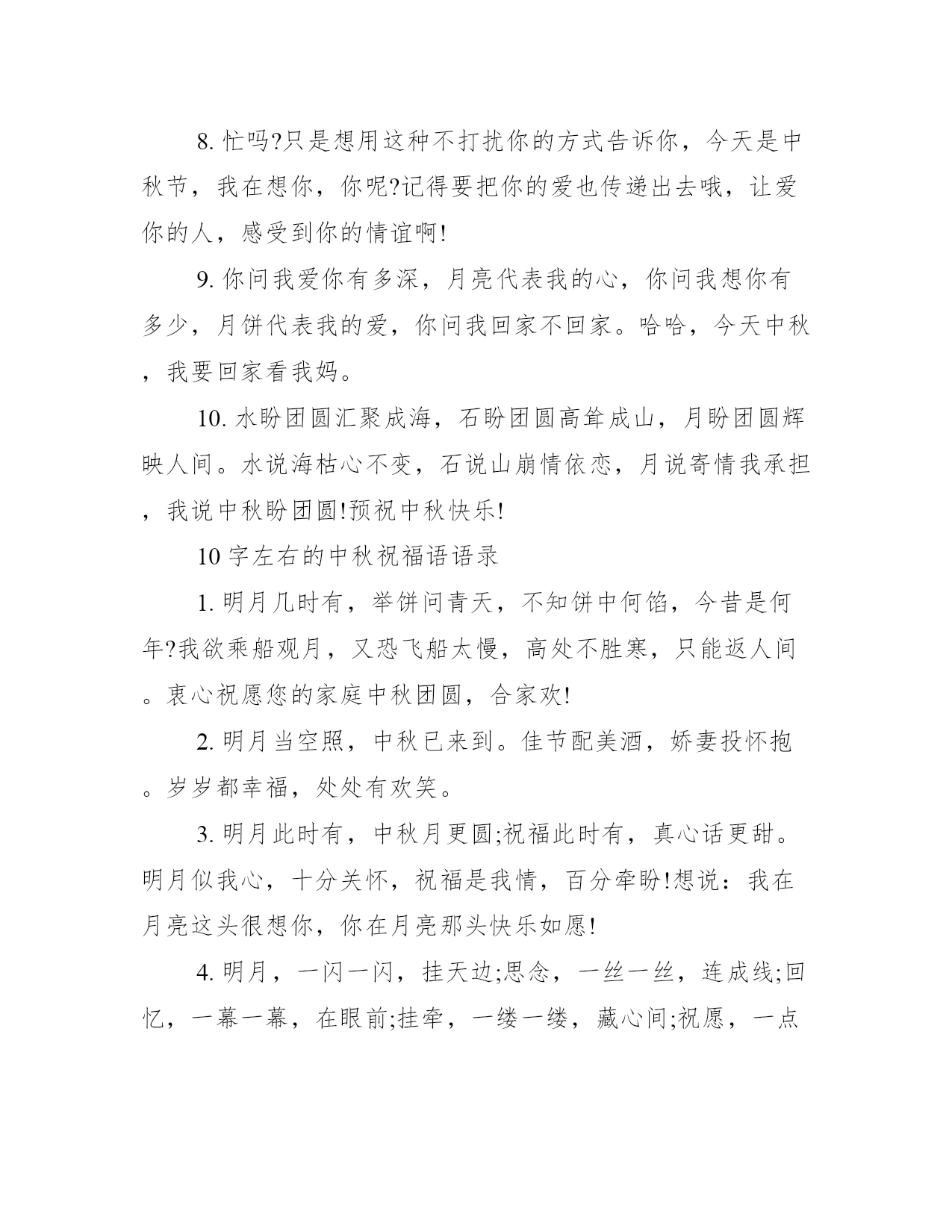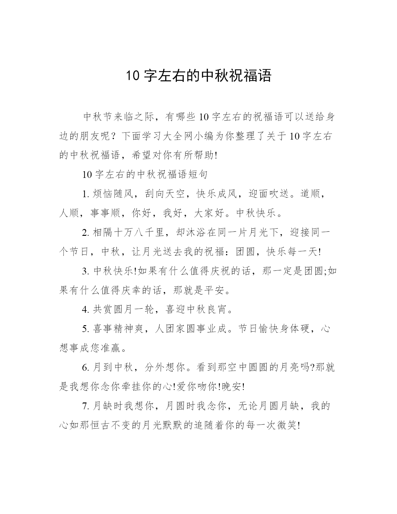 10字左右的中秋祝福语中秋节来临之际,有哪些10字左右的祝福语可以送给身边的朋友呢?下面学习大全网小编为你整理了关于10字左右的中秋祝福语,希望对你有所帮助!10字左右的中秋祝福语短句1.烦恼随风,刮向天空,快乐成风,迎面吹送。道顺,人顺,事事顺,你好,我好,大家好。中秋快乐。2.相隔十万八千里,却沐浴在同一片月光下,迎接同一个节日,中秋,让月光送去我的祝福:团圆,快乐每一天!3.中秋快乐!如果有什么值得庆祝的话,那一定是团圆;如果有什么值得庆幸的话,那就是平安。4.共赏圆月一轮,喜迎中秋良宵。5.喜事精神爽,人团家圆事业成。节日愉快身体硬,心想事成您准赢。6.月到中秋,分外想你。看到那空中圆圆的月亮吗?那就是我想你念你牵挂你的心!爱你吻你!晚安!7.月缺时我想你,月圆时我念你,无论月圆月缺,我的心如那恒古不变的月光默默的追随着你的每一次微笑!8.忙吗?只是想用这种不打扰你的方式告诉你,今天是中秋节,我在想你,你呢?记得要把你的爱也传递出去哦,让爱你的人,感受到你的情谊啊!9.你问我爱你有多深,月亮代表我的心,你问我想你有多少,月饼代表我的爱,你问我回家不回家。哈哈,今天中秋,我要回家看我妈。10.水盼团圆汇聚成海,石盼团圆高耸成山,月盼团圆辉映人间。水说海枯心不变,石说山崩情依恋,月说寄情我承担,我说中秋盼团圆!预祝中秋快乐!10字左右的中秋祝福语语录1.明月几时有,举饼问青天,不知饼中何馅,今昔是何年?我欲乘船观月,又恐飞船太慢,高处不胜寒,只能返人间。衷心祝愿您的家庭中秋团圆,合家欢!2.明月当空照,中秋已来到。佳节配美酒,娇妻投怀抱。岁岁都幸福,处处有欢笑。3.明月此时有,中秋月更圆;祝福此时有,真心话更甜。明月似我心,十分关怀,祝福是我情,百分牵盼!想说:我在月亮这头很想你,你在月亮那头快乐如愿!4.明月,一闪一闪,挂天边;思念,一丝一丝,连成线;回忆,一幕一幕,在眼前;挂牵,一缕一缕,藏心间;祝愿,一点一点,汇成泉;幸运,一滴一滴,不曾减;联系,一季一季,不会闲;中秋,一年一年,盼团圆;愿你,一刻一刻,比蜜甜。5.梦故乡,烟花巷,飞雨江南丝丝扬。有情郎,在远方,烟花巷头是雨巷。不曾想,自思量,夜夜幽梦出闺房。小轩窗,一帘香,锁住幽梦鸳鸯床。风拂窗,轻月光,甜甜蜜蜜是梦乡。中秋节,蜜如糖,何时还家我情郎!6.美女谁都爱,偏向你走来。风华绝代,陪你精彩。花好月圆,共你常在。你随便一帅,她随便一赖,于是你们团团圆圆,幸福花儿永开不败。记住了,她叫钟秋洁,一旦拥有,幸福长有。愿你跟着美女走,快乐无尽头。7.中秋佳节至,快乐答试题。填空:名扬古今外,情溢春夏冬,若是马加鞭,定能在其中。答案:中秋快乐。8.月升代表我的牵挂,月落代表我的关怀,月盈代表我的惦记,月亏代表我的思念,月芽代表我的真诚,月弯代表我的微笑,月圆代表我的祝福。中秋节快乐!9.左手握住健康,右手抓住财富。左腿跨过艰难险阻,右腿踏上成功之路。用力喊出幸福,用心感受我这中秋祝福:中秋快乐!10.今年中秋节不送礼,发条短信祝福你,健康快乐唱伴你,好运和你不分离,还有让我告诉你,财神已经跟随你,钞票珠宝都给你,幸福人生属于你!中秋假日快乐!11.月儿圆圆挂天边,荷叶圆圆水中间。梦想圆圆都实现,成功圆圆舞翩跹。快乐圆圆永不变,祝福圆圆情无限:中秋花好月又圆,幸福与你两团圆。12.又是一年落叶黄,一层秋雨一层凉。整日工作挺辛苦,天凉别忘加衣裳。保重身体多餐饭,珍惜友情常想想。信短情长言未尽,唯愿朋友多安康。中秋快乐,合家团圆!13.圆圆的月儿天上挂,圆圆的月饼香天涯,圆圆的快乐美如花,圆圆的祝福到你家:美满日子玉润珠圆,幸福生活花好月圆,合家吉祥永团圆。14.以真诚为半径,用尊重为圆心,送您一个中秋圆圆的祝福!祝愿:爱您的人更爱您,您爱的人更懂您!好事圆圆!好梦连连!祝中秋快乐,月圆人更圆!15.让最圆的明月陪伴你和我,让明月传达我的心愿与祝福。祝你中秋佳节快乐,月圆人圆事事圆满!16.草儿箐箐,花儿幽幽,月儿圆圆,梦儿绵绵,心儿甜甜——此刻情飞千里——明月寄相思——中秋节17.明月本无价,高山皆有情。人虽不至,心向往之。衷心祝愿您和家人团圆美满,幸福安康!18.相隔十万八千里,却沐浴在同一片月光下,迎接同一个节日,中秋,让月光送去我的祝福:团圆,快乐每一天!19.中秋月圆、佳节思亲、远隔天涯、举目有亲、心愿、祝愿、如愿、情缘、了愿。祝你幸福快乐!20.月饼圆圆的、甜甜的在这最美好的时刻祝您和您的家人合家欢乐、幸福美满!10字左右的中秋祝福语说说1.花好月圆中秋夜,欢乐相伴把酒端,互送祝福传情谊,平安好运你如意。祝您幸福中秋,快乐中秋,工作顺利,永远幸福!2.红红翠翠,年年朝朝暮暮。暮暮依依,时时鲽鲽鹣鹣。说不完的思念,但愿您的生活就象月一样美满。3.海上明月共潮生,千