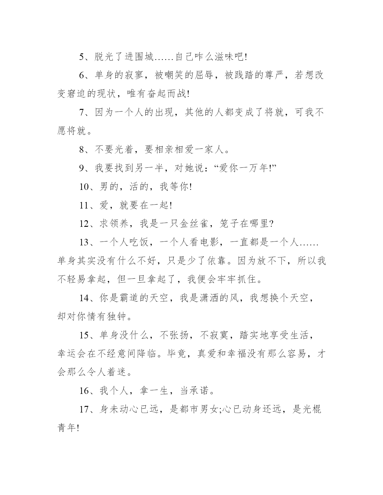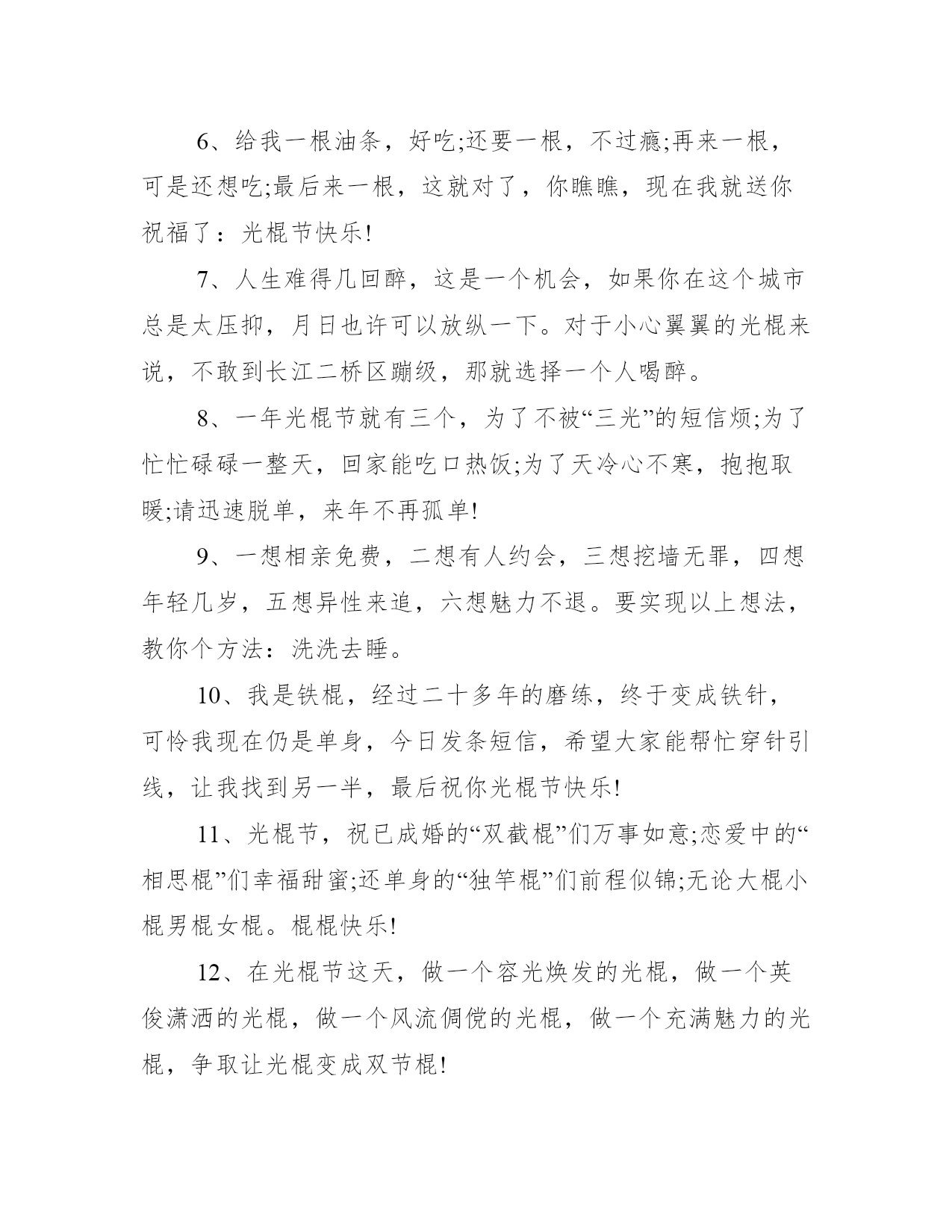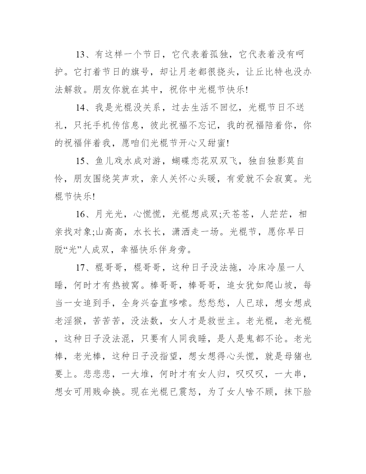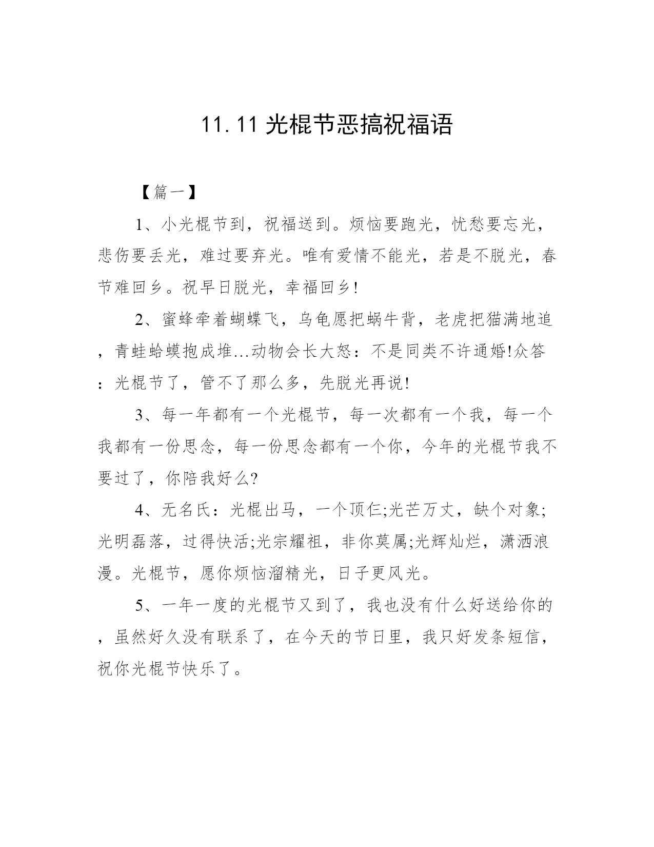 11.11光棍节恶搞祝福语【篇一】1、小光棍节到,祝福送到。烦恼要跑光,忧愁要忘光,悲伤要丢光,难过要弃光。唯有爱情不能光,若是不脱光,春节难回乡。祝早日脱光,幸福回乡!2、蜜蜂牵着蝴蝶飞,乌龟愿把蜗牛背,老虎把猫满地追,青蛙蛤蟆抱成堆…动物会长大怒:不是同类不许通婚!众答:光棍节了,管不了那么多,先脱光再说!3、每一年都有一个光棍节,每一次都有一个我,每一个我都有一份思念,每一份思念都有一个你,今年的光棍节我不要过了,你陪我好么?4、无名氏:光棍出马,一个顶仨;光芒万丈,缺个对象;光明磊落,过得快活;光宗耀祖,非你莫属;光辉灿烂,潇洒浪漫。光棍节,愿你烦恼溜精光,日子更风光。5、一年一度的光棍节又到了,我也没有什么好送给你的,虽然好久没有联系了,在今天的节日里,我只好发条短信,祝你光棍节快乐了。6、给我一根油条,好吃;还要一根,不过瘾;再来一根,可是还想吃;最后来一根,这就对了,你瞧瞧,现在我就送你祝福了:光棍节快乐!7、人生难得几回醉,这是一个机会,如果你在这个城市总是太压抑,月日也许可以放纵一下。对于小心翼翼的光棍来说,不敢到长江二桥区蹦级,那就选择一个人喝醉。8、一年光棍节就有三个,为了不被“三光”的短信烦;为了忙忙碌碌一整天,回家能吃口热饭;为了天冷心不寒,抱抱取暖;请迅速脱单,来年不再孤单!9、一想相亲免费,二想有人约会,三想挖墙无罪,四想年轻几岁,五想异性来追,六想魅力不退。要实现以上想法,教你个方法:洗洗去睡。10、我是铁棍,经过二十多年的磨练,终于变成铁针,可怜我现在仍是单身,今日发条短信,希望大家能帮忙穿针引线,让我找到另一半,最后祝你光棍节快乐!11、光棍节,祝已成婚的“双截棍”们万事如意;恋爱中的“相思棍”们幸福甜蜜;还单身的“独竿棍”们前程似锦;无论大棍小棍男棍女棍。棍棍快乐!12、在光棍节这天,做一个容光焕发的光棍,做一个英俊潇洒的光棍,做一个风流倜傥的光棍,做一个充满魅力的光棍,争取让光棍变成双节棍!13、有这样一个节日,它代表着孤独,它代表着没有呵护。它打着节日的旗号,却让月老都很挠头,让丘比特也没办法解救。朋友你就在其中,祝你中光棍节快乐!14、我是光棍没关系,过去生活不回忆,光棍节日不送礼,只托手机传信息,彼此祝福不忘记,我的祝福陪着你,你的祝福伴着我,愿咱们光棍节开心又甜蜜!15、鱼儿戏水成对游,蝴碟恋花双双飞,独自独影莫自怜,朋友围绕笑声欢,亲人关怀心头暖,有爱就不会寂寞。光棍节快乐!16、月光光,心慌慌,光棍想成双;天苍苍,人茫茫,相亲找对象;山高高,水长长,潇洒走一场。光棍节,愿你早日脱“光”人成双,幸福快乐伴身旁。17、棍哥哥,棍哥哥,这种日子没法拖,冷床冷屋一人睡,何时才有热被窝。棒哥哥,棒哥哥,追女犹如爬山坡,每当一女追到手,全身兴奋直哆嗦。愁愁愁,人已球,想女想成老淫猴,苦苦苦,没法数,女人才是救世主。老光棍,老光棍,这种日子没法混,只要有人同我睡,是人是鬼都不论。老光棒,老光棒,这种日子没指望,想女想得心头慌,就是母猪也要上。悲悲悲,一大堆,何时才有女人归,叹叹叹,一大串,想女可用贱命换。现在光棍已震怒,为了女人啥不顾,抹下脸皮猛追女,脸上当有黑麻布。追女到手唱山歌,从此有了热被窝,美女无数钱又多,幸福生活乐呵呵!18、作为普通朋友的你们,假如他跟你有点小摩擦,你就不管三七二十一直接朝他喊:“你居然不敢做我男朋友!?”让他措不着头脑之余你再改口说:“不好意思,说错了,我是说你居然敢跟我吵?!”19、之前几天的工作聚着,等到光棍节那天,把自己埋在文件堆里,对同事们谈论光棍节的事情显得无暇顾及。中午午休不能休息,晚上留下来加班,让繁忙的工作彻底麻痹自己那颗孤独的心。这样努力,被单身老板看在眼里,说不定另有收获。20、光棍节其实是光棍们脱光的一个机会,与其躲避或者自得其乐,不如充分利用机会大胆出击,在光棍节和光棍生涯说拜拜,这种光棍昂扬向上积极进取的人生态度值得学习啊。【篇二】1、老婆孩子热炕头,不再光着喽!2、如果可以的话,我只愿你一人的逗逼!3、期待幸福,一生一世一双人。4、我一生中最幸运的两件事:一件是时间终于将我对你的爱消耗殆尽,另一件是很久很久以前的某一天,遇见你。5、脱光了进围城……自己咋么滋味吧!6、单身的寂寥,被嘲笑的屈辱,被践踏的尊严,若想改变窘迫的现状,唯有奋起而战!7、因为一个人的出现,其他的人都变成了将就,可我不愿将就。8、不要光着,要相亲相爱一家人。9、我要找到另一半,对她说:“爱你一万年!”10、男的,活的,我等你!11、爱,就要在一起!12、求领养,我是一只金丝雀,笼子在哪里?13、一个人吃饭,一个人看电影,一直都是一个人……单身其实没有什么不好,只是少了依靠。因为放不下,所以我不轻易拿起,但一旦拿起了,我便会牢牢抓住。14、你是霸道的天空,我是潇洒