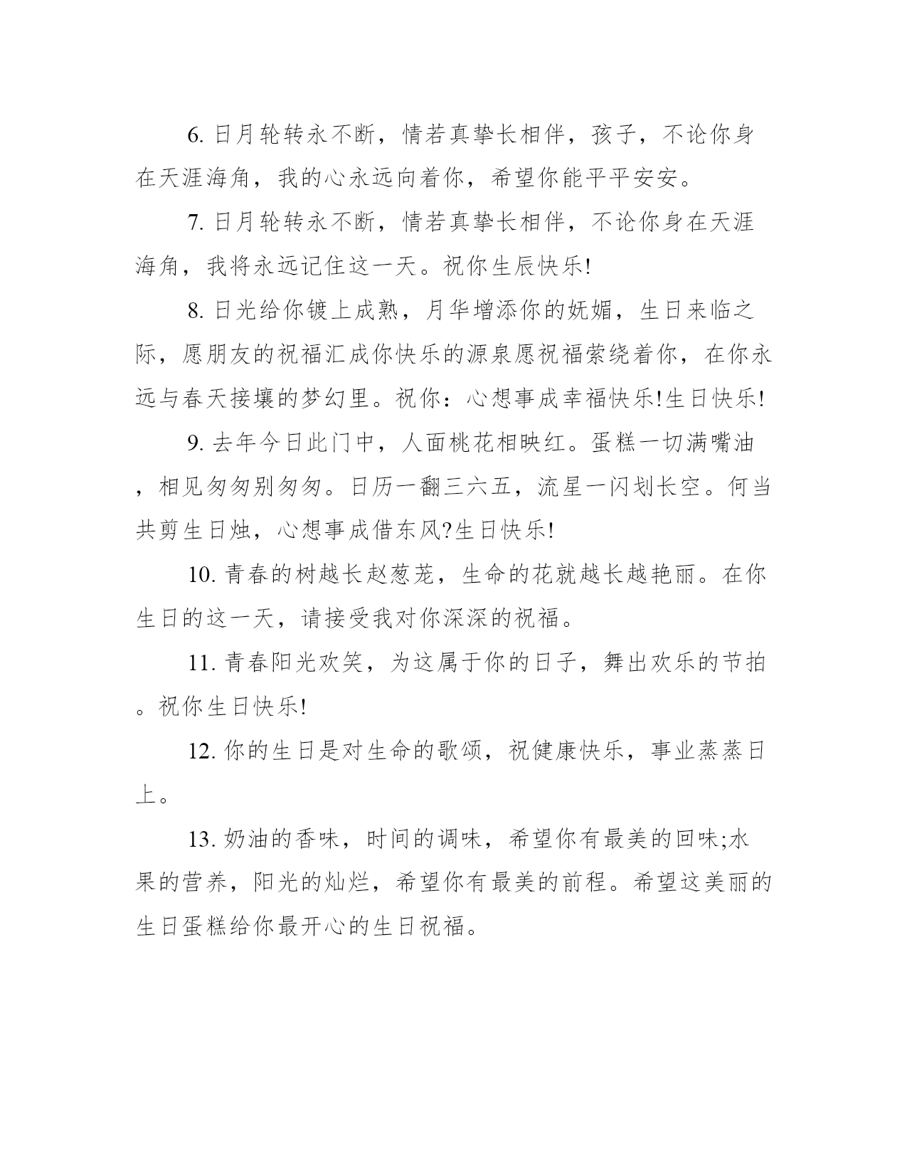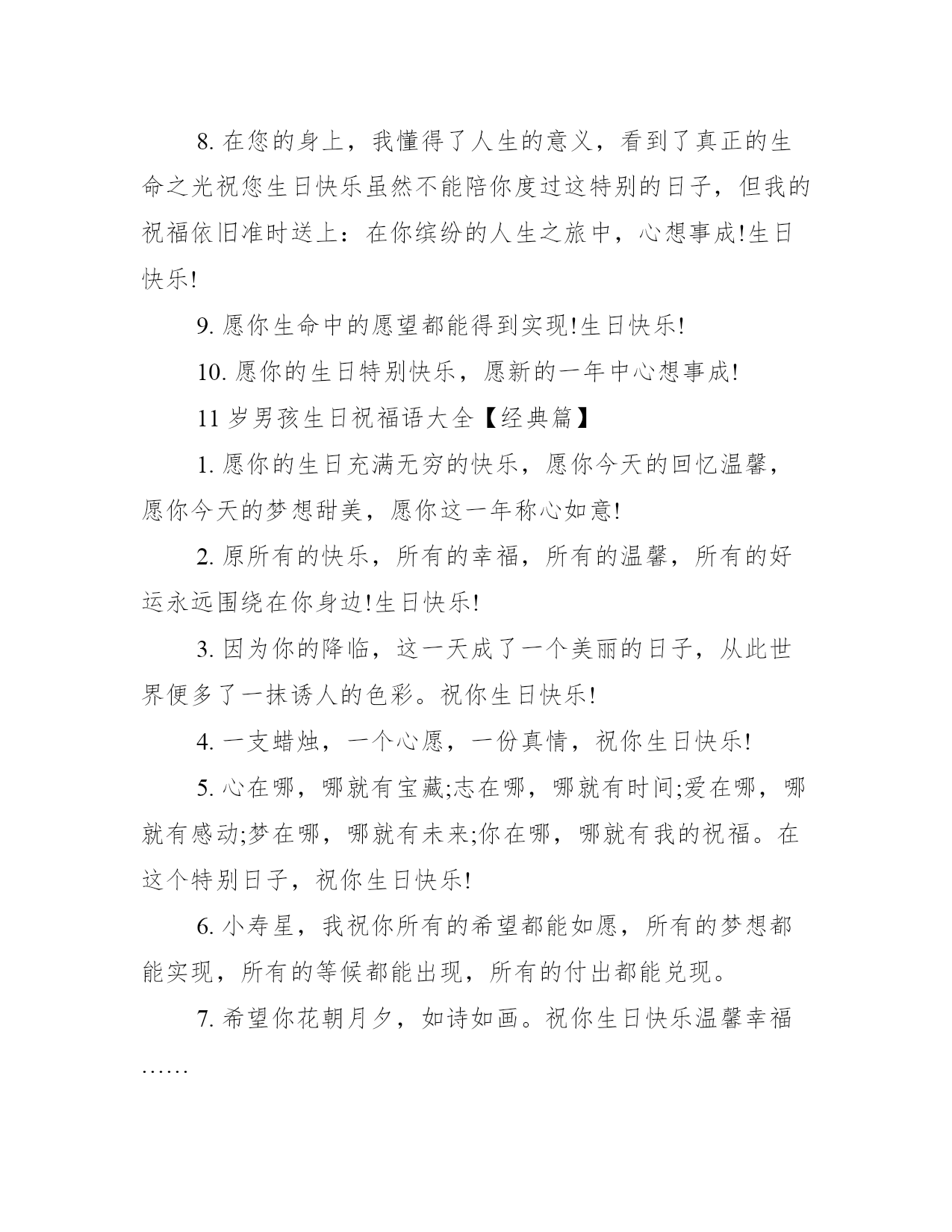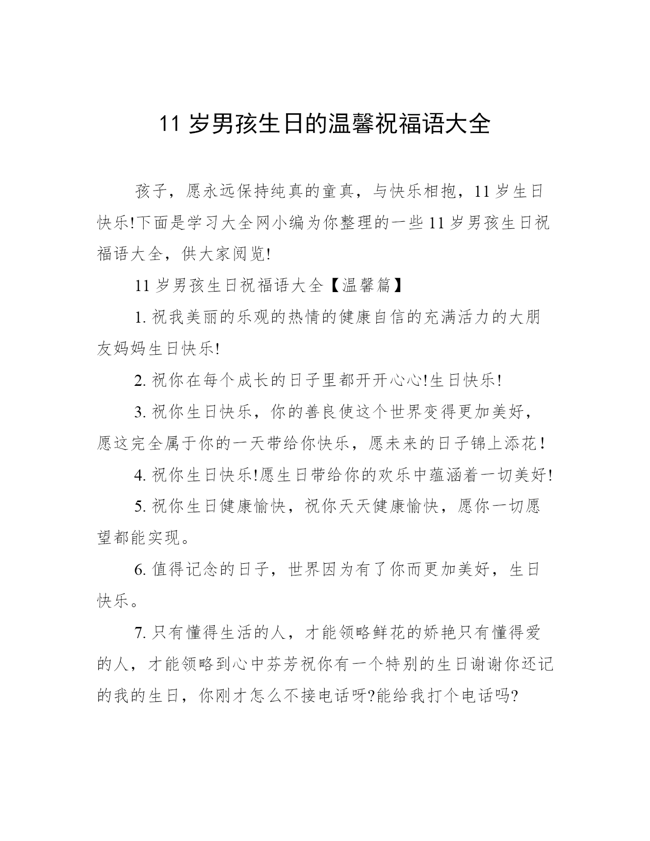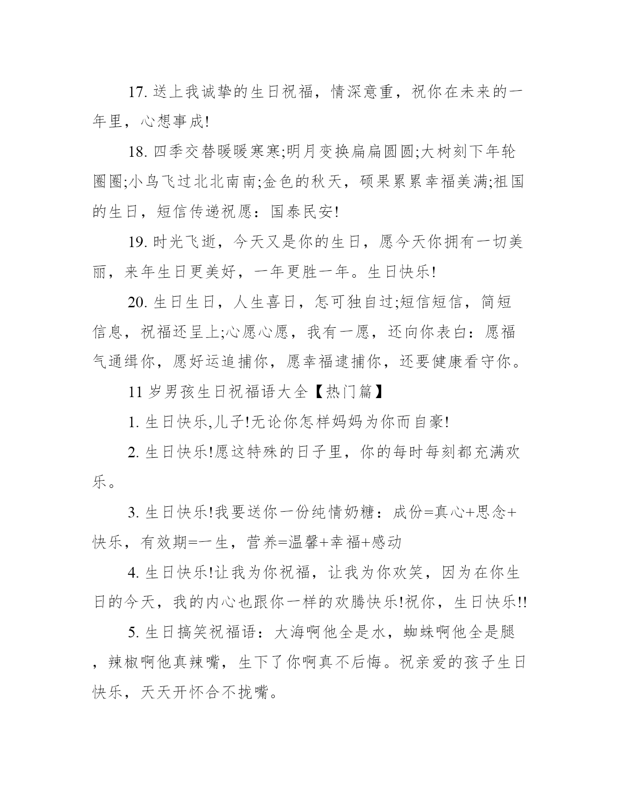 11岁男孩生日的温馨祝福语大全孩子,愿永远保持纯真的童真,与快乐相抱,11岁生日快乐!下面是学习大全网小编为你整理的一些11岁男孩生日祝福语大全,供大家阅览!11岁男孩生日祝福语大全【温馨篇】1.祝我美丽的乐观的热情的健康自信的充满活力的大朋友妈妈生日快乐!2.祝你在每个成长的日子里都开开心心!生日快乐!3.祝你生日快乐,你的善良使这个世界变得更加美好,愿这完全属于你的一天带给你快乐,愿未来的日子锦上添花!4.祝你生日快乐!愿生日带给你的欢乐中蕴涵着一切美好!5.祝你生日健康愉快,祝你天天健康愉快,愿你一切愿望都能实现。6.值得记念的日子,世界因为有了你而更加美好,生日快乐。7.只有懂得生活的人,才能领略鲜花的娇艳只有懂得爱的人,才能领略到心中芬芳祝你有一个特别的生日谢谢你还记的我的生日,你刚才怎么不接电话呀?能给我打个电话吗?8.在您的身上,我懂得了人生的意义,看到了真正的生命之光祝您生日快乐虽然不能陪你度过这特别的日子,但我的祝福依旧准时送上:在你缤纷的人生之旅中,心想事成!生日快乐!9.愿你生命中的愿望都能得到实现!生日快乐!10.愿你的生日特别快乐,愿新的一年中心想事成!11岁男孩生日祝福语大全【经典篇】1.愿你的生日充满无穷的快乐,愿你今天的回忆温馨,愿你今天的梦想甜美,愿你这一年称心如意!2.原所有的快乐,所有的幸福,所有的温馨,所有的好运永远围绕在你身边!生日快乐!3.因为你的降临,这一天成了一个美丽的日子,从此世界便多了一抹诱人的色彩。祝你生日快乐!4.一支蜡烛,一个心愿,一份真情,祝你生日快乐!5.心在哪,哪就有宝藏;志在哪,哪就有时间;爱在哪,哪就有感动;梦在哪,哪就有未来;你在哪,哪就有我的祝福。在这个特别日子,祝你生日快乐!6.小寿星,我祝你所有的希望都能如愿,所有的梦想都能实现,所有的等候都能出现,所有的付出都能兑现。7.希望你花朝月夕,如诗如画。祝你生日快乐温馨幸福……8.无论如何,只要你幸福,能干,妈妈也会幸福的。生日快乐,妈妈爱你9.无论何时,你的生日我都会铭记于心;无论何地,我都会给你送去朵玫瑰,因为这是我一生一世的心愿,送上真心地祝福,祝你生日快乐!10.我愈想愈看得清:不可能有谁的女儿像你一样姣美一样甜蜜一样贴心!11.我为你收集了大自然所有的美,放在你生日的烛台上。将能说的话都藏在花蕾里,让它成为待放的秘密。12.我虽然不能陪你度过今天这个特别的日子,在遥远的这边,我一样祝福你生日快乐!13.我认为健康和快乐是人生最重要的两件东西,真诚的祝愿健康和快乐永远伴随你,生日快乐!14.我认为健康和快乐是人生最重要的两件东西,如果它们可以转让,我愿意把我的那一份都给你!生日快乐!?15.太阳当空照,小鸟齐欢笑。清风送清凉,雨露来热闹。齐把祝福报,你的生日到。幸福甜蜜随,从此烦恼消,天天乐逍遥。生日快乐笑,开心永到老。16.太多惊喜,太多努力,太多辛苦,太多回忆,都源自可爱的小家伙。一周岁了,祝你家宝贝生日快乐,健康幸福无忧无虑的成长。大人们辛苦啦!17.送上我诚挚的生日祝福,情深意重,祝你在未来的一年里,心想事成!18.四季交替暖暖寒寒;明月变换扁扁圆圆;大树刻下年轮圈圈;小鸟飞过北北南南;金色的秋天,硕果累累幸福美满;祖国的生日,短信传递祝愿:国泰民安!19.时光飞逝,今天又是你的生日,愿今天你拥有一切美丽,来年生日更美好,一年更胜一年。生日快乐!20.生日生日,人生喜日,怎可独自过;短信短信,简短信息,祝福还呈上;心愿心愿,我有一愿,还向你表白:愿福气通缉你,愿好运追捕你,愿幸福逮捕你,还要健康看守你。11岁男孩生日祝福语大全【热门篇】1.生日快乐,儿子!无论你怎样妈妈为你而自豪!2.生日快乐!愿这特殊的日子里,你的每时每刻都充满欢乐。3.生日快乐!我要送你一份纯情奶糖:成份=真心+思念+快乐,有效期=一生,营养=温馨+幸福+感动4.生日快乐!让我为你祝福,让我为你欢笑,因为在你生日的今天,我的内心也跟你一样的欢腾快乐!祝你,生日快乐!!5.生日搞笑祝福语:大海啊他全是水,蜘蛛啊他全是腿,辣椒啊他真辣嘴,生下了你啊真不后悔。祝亲爱的孩子生日快乐,天天开怀合不拢嘴。6.日月轮转永不断,情若真挚长相伴,孩子,不论你身在天涯海角,我的心永远向着你,希望你能平平安安。7.日月轮转永不断,情若真挚长相伴,不论你身在天涯海角,我将永远记住这一天。祝你生辰快乐!8.日光给你镀上成熟,月华增添你的妩媚,生日来临之际,愿朋友的祝福汇成你快乐的源泉愿祝福萦绕着你,在你永远与春天接壤的梦幻里。祝你:心想事成幸福快乐!生日快乐!9.去年今日此门中,人面桃花相映红。蛋糕一切满嘴油,相见匆匆别匆匆。日历一翻三六五,流星一闪划长空。何当共剪生日烛,心想事成借东风?生日快乐!10.青春的树越长赵葱茏,生命的花就越长越艳丽。