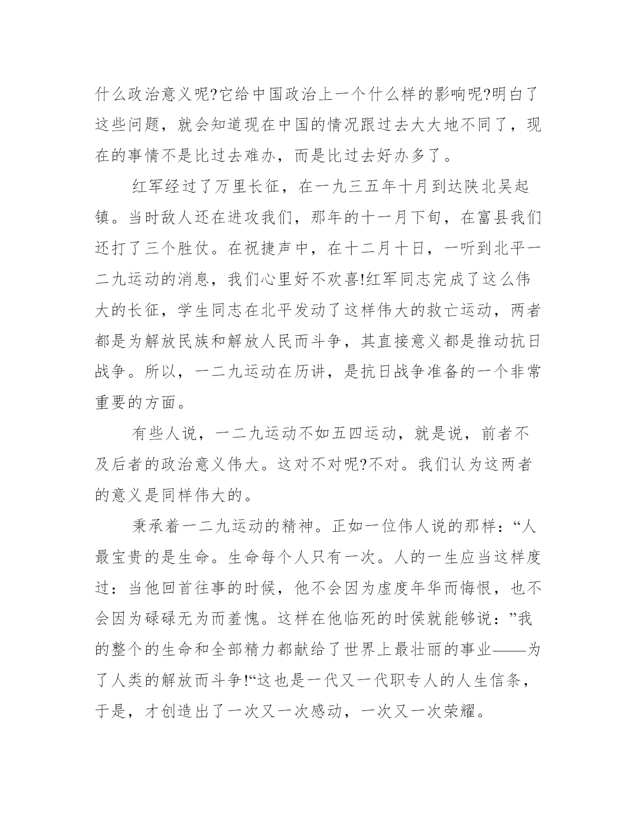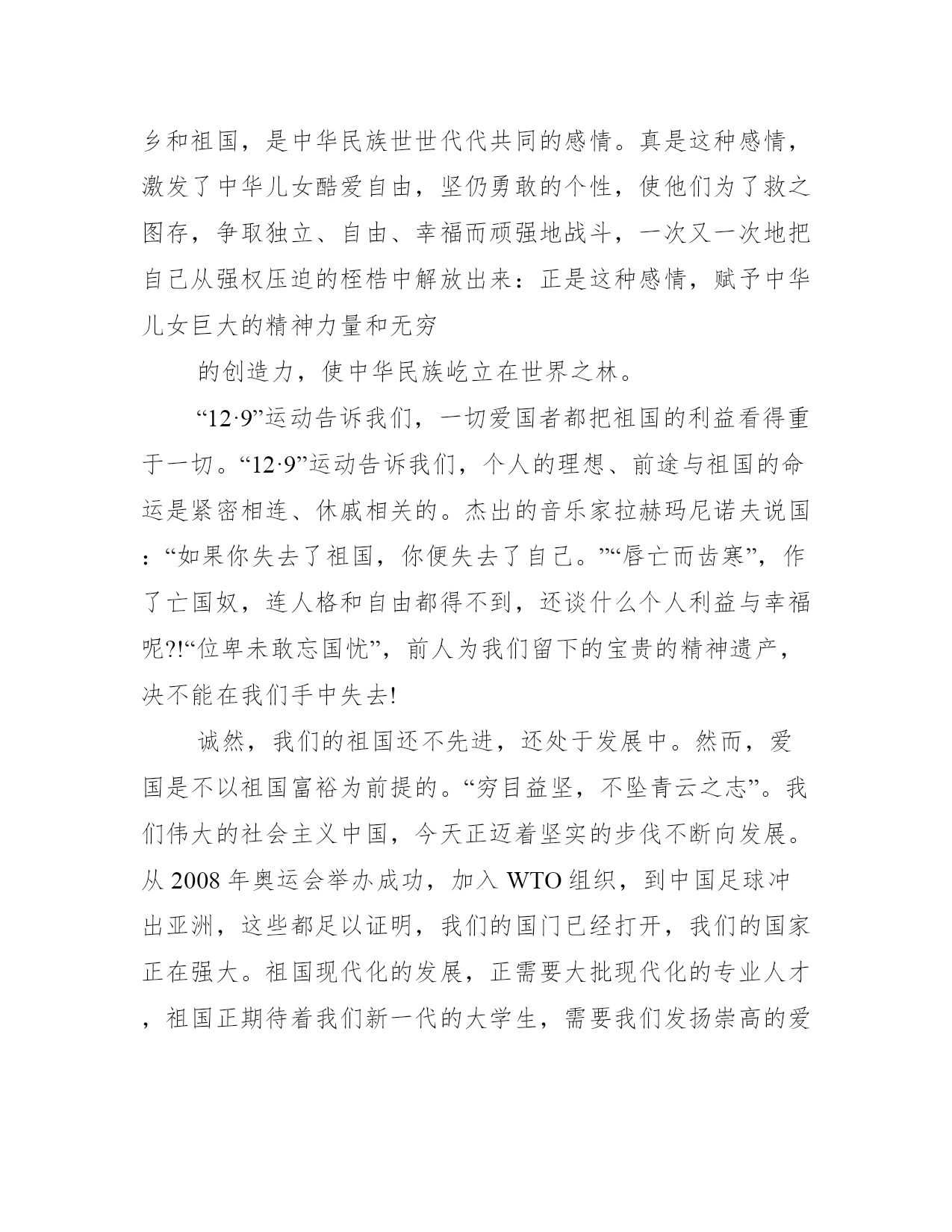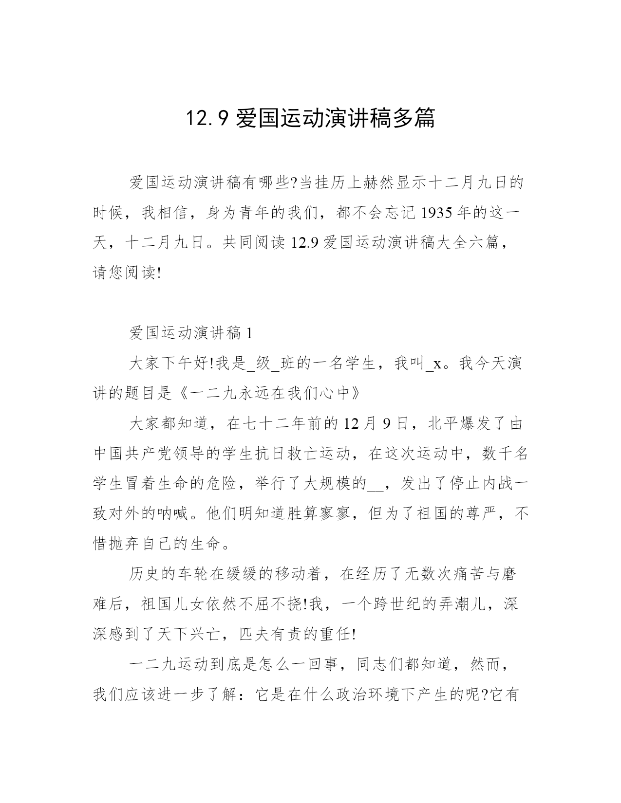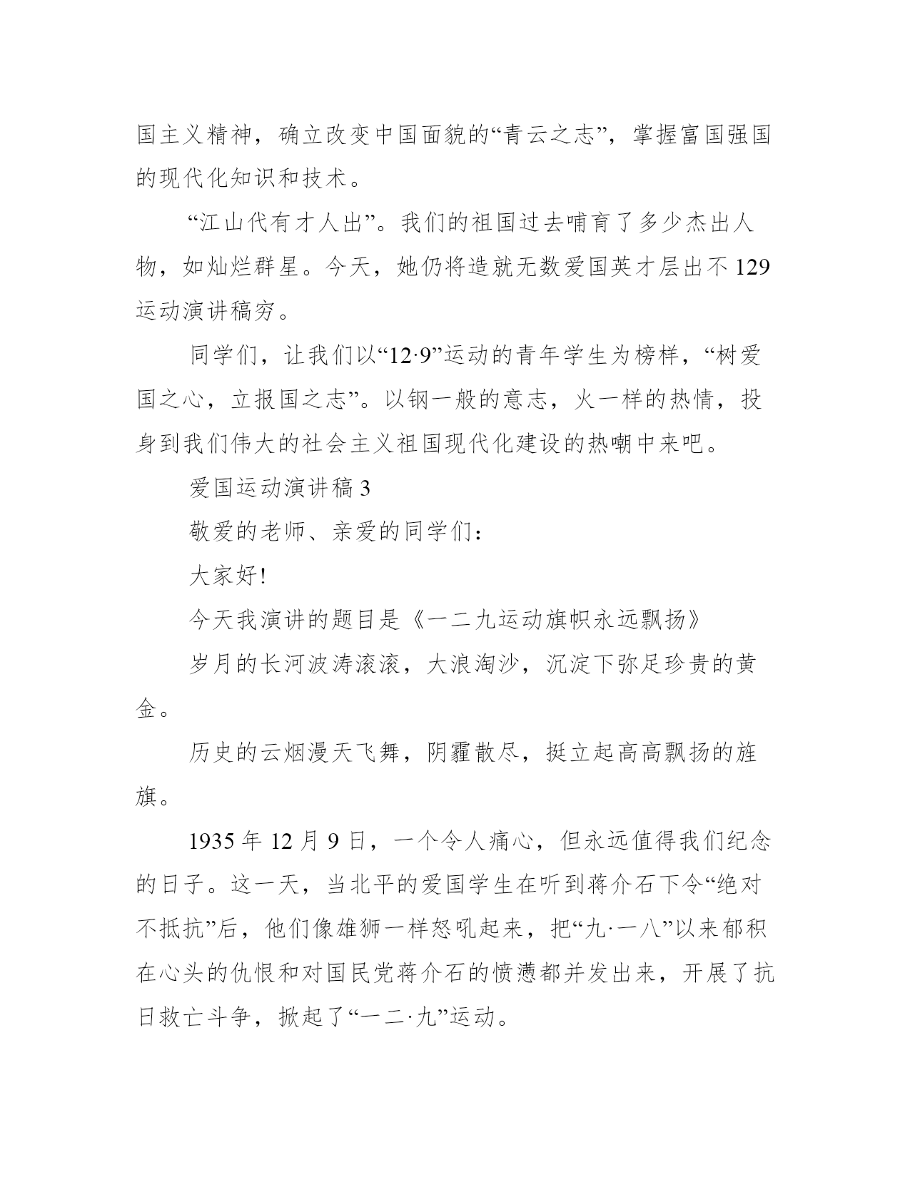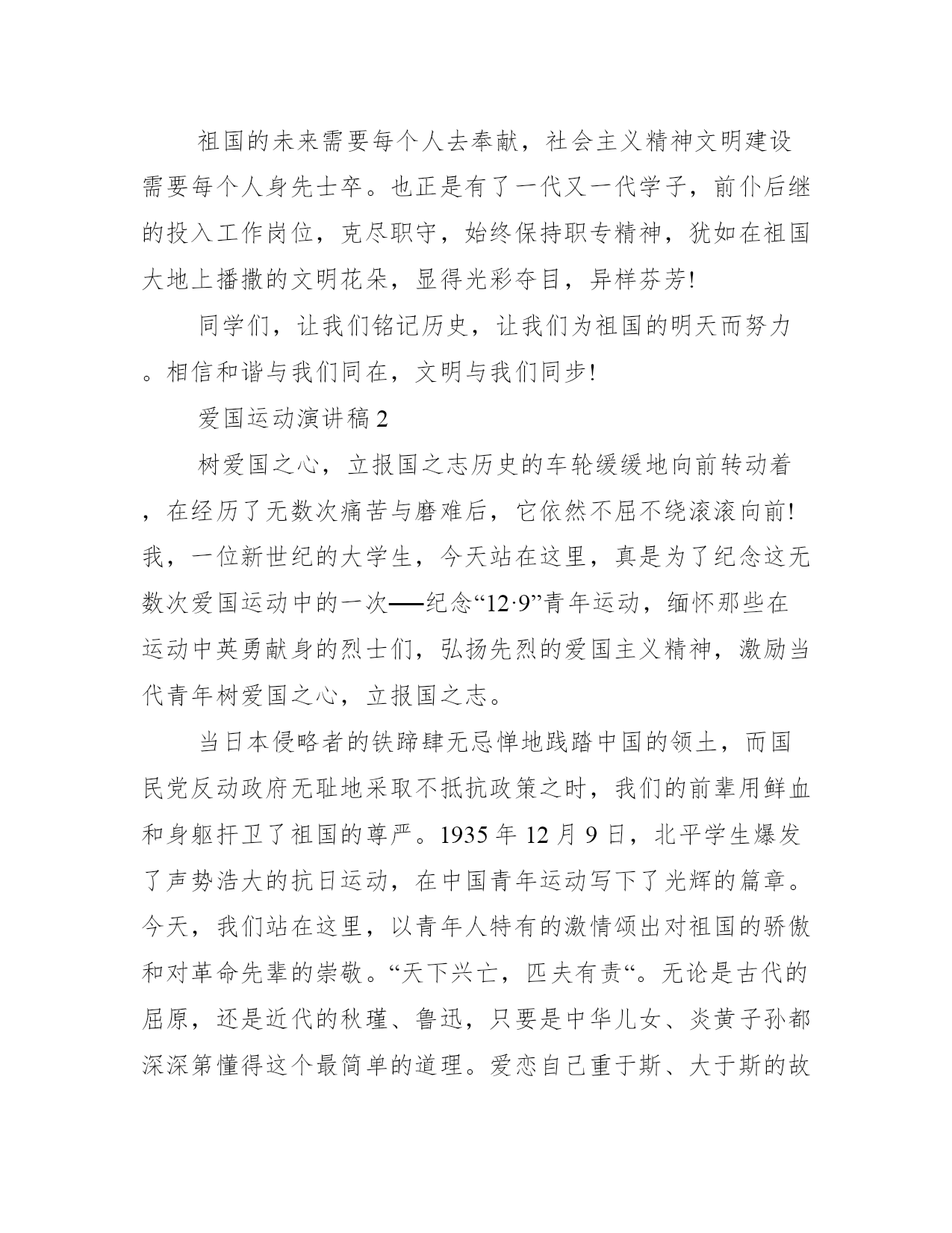 12.9爱国运动演讲稿多篇爱国运动演讲稿有哪些?当挂历上赫然显示十二月九日的时候,我相信,身为青年的我们,都不会忘记1935年的这一天,十二月九日。共同阅读12.9爱国运动演讲稿大全六篇,请您阅读!爱国运动演讲稿1大家下午好!我是_级_班的一名学生,我叫_x。我今天演讲的题目是《一二九永远在我们心中》大家都知道,在七十二年前的12月9日,北平爆发了由中国共产党领导的学生抗日救亡运动,在这次运动中,数千名学生冒着生命的危险,举行了大规模的__,发出了停止内战一致对外的呐喊。他们明知道胜算寥寥,但为了祖国的尊严,不惜抛弃自己的生命。历史的车轮在缓缓的移动着,在经历了无数次痛苦与磨难后,祖国儿女依然不屈不挠!我,一个跨世纪的弄潮儿,深深感到了天下兴亡,匹夫有责的重任!一二九运动到底是怎么一回事,同志们都知道,然而,我们应该进一步了解:它是在什么政治环境下产生的呢?它有什么政治意义呢?它给中国政治上一个什么样的影响呢?明白了这些问题,就会知道现在中国的情况跟过去大大地不同了,现在的事情不是比过去难办,而是比过去好办多了。红军经过了万里长征,在一九三五年十月到达陕北吴起镇。当时敌人还在进攻我们,那年的十一月下旬,在富县我们还打了三个胜仗。在祝捷声中,在十二月十日,一听到北平一二九运动的消息,我们心里好不欢喜!红军同志完成了这么伟大的长征,学生同志在北平发动了这样伟大的救亡运动,两者都是为解放民族和解放人民而斗争,其直接意义都是推动抗日战争。所以,一二九运动在历讲,是抗日战争准备的一个非常重要的方面。有些人说,一二九运动不如五四运动,就是说,前者不及后者的政治意义伟大。这对不对呢?不对。我们认为这两者的意义是同样伟大的。秉承着一二九运动的精神。正如一位伟人说的那样:“人最宝贵的是生命。生命每个人只有一次。人的一生应当这样度过:当他回首往事的时候,他不会因为虚度年华而悔恨,也不会因为碌碌无为而羞愧。这样在他临死的时侯就能够说:”我的整个的生命和全部精力都献给了世界上最壮丽的事业——为了人类的解放而斗争!“这也是一代又一代职专人的人生信条,于是,才创造出了一次又一次感动,一次又一次荣耀。祖国的未来需要每个人去奉献,社会主义精神文明建设需要每个人身先士卒。也正是有了一代又一代学子,前仆后继的投入工作岗位,克尽职守,始终保持职专精神,犹如在祖国大地上播撒的文明花朵,显得光彩夺目,异样芬芳!同学们,让我们铭记历史,让我们为祖国的明天而努力。相信和谐与我们同在,文明与我们同步!爱国运动演讲稿2树爱国之心,立报国之志历史的车轮缓缓地向前转动着,在经历了无数次痛苦与磨难后,它依然不屈不绕滚滚向前!我,一位新世纪的大学生,今天站在这里,真是为了纪念这无数次爱国运动中的一次──纪念“12·9”青年运动,缅怀那些在运动中英勇献身的烈士们,弘扬先烈的爱国主义精神,激励当代青年树爱国之心,立报国之志。当日本侵略者的铁蹄肆无忌惮地践踏中国的领土,而国民党反动政府无耻地采取不抵抗政策之时,我们的前辈用鲜血和身躯扞卫了祖国的尊严。1935年12月9日,北平学生爆发了声势浩大的抗日运动,在中国青年运动写下了光辉的篇章。今天,我们站在这里,以青年人特有的激情颂出对祖国的骄傲和对革命先辈的崇敬。“天下兴亡,匹夫有责“。无论是古代的屈原,还是近代的秋瑾、鲁迅,只要是中华儿女、炎黄子孙都深深第懂得这个最简单的道理。爱恋自己重于斯、大于斯的故乡和祖国,是中华民族世世代代共同的感情。真是这种感情,激发了中华儿女酷爱自由,坚仍勇敢的个性,使他们为了救之图存,争取独立、自由、幸福而顽强地战斗,一次又一次地把自己从强权压迫的桎梏中解放出来:正是这种感情,赋予中华儿女巨大的精神力量和无穷的创造力,使中华民族屹立在世界之林。“12·9”运动告诉我们,一切爱国者都把祖国的利益看得重于一切。“12·9”运动告诉我们,个人的理想、前途与祖国的命运是紧密相连、休戚相关的。杰出的音乐家拉赫玛尼诺夫说国:“如果你失去了祖国,你便失去了自己。”“唇亡而齿寒”,作了亡国奴,连人格和自由都得不到,还谈什么个人利益与幸福呢?!“位卑未敢忘国忧”,前人为我们留下的宝贵的精神遗产,决不能在我们手中失去!诚然,我们的祖国还不先进,还处于发展中。然而,爱国是不以祖国富裕为前提的。“穷目益坚,不坠青云之志”。我们伟大的社会主义中国,今天正迈着坚实的步伐不断向发展。从2008年奥运会举办成功,加入WTO组织,到中国足球冲出亚洲,这些都足以证明,我们的国门已经打开,我们的国家正在强大。祖国现代化的发展,正需要大批现代化的专业人才,祖国正期待着我们新一代的大学生,需要我们发扬崇高的爱国主义精神,确立改变中国面貌的“青云之志”,掌握富国强国的现代化知识和技术。“江山代有才人出”。我们的祖国过去哺育了多少杰出人物,如灿烂群星。今天,