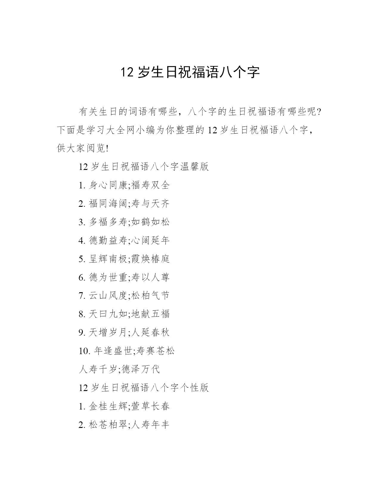 12岁生日祝福语八个字有关生日的词语有哪些,八个字的生日祝福语有哪些呢?下面是学习大全网小编为你整理的12岁生日祝福语八个字,供大家阅览!12岁生日祝福语八个字温馨版1.身心同康;福寿双全2.福同海阔;寿与天齐3.多福多寿;如鹤如松4.德勤益寿;心阔延年5.呈辉南极;霞焕椿庭6.德为世重;寿以人尊7.云山风度;松柏气节8.天曰九如;地献五福9.天增岁月;人延春秋10.年逢盛世;寿赛苍松人寿千岁;德泽万代12岁生日祝福语八个字个性版1.金桂生辉;萱草长春2.松苍柏翠;人寿年丰3.德高延年;心宽增寿4.天护寿者;地佑善人5.天地同寿;日月齐光6.松龄岁月;鹤舞春秋7.人逢盛世;寿越遐龄8.蝉鸣高柳;鹤栖长松9.呈辉南极;霞焕椿庭10.德为世重;寿以人尊11.福如东海;寿比南山12.福同海阔;寿与天齐13.立功立德;寿国寿民14.名高北斗;寿以人樽15.人增高寿;天转阳和16.松苍柏翠;人寿年丰12岁生日祝福语八个字最受欢迎版1.幸逢盛世;乐享遐龄2.樽开北海;曲奏南薰3.春云霭瑞;宝婺腾辉4.慈母温柔;宜家受福5.辉腾福婺;香发琪花6.仁慈殷实;获寿保年7.禧延萱阁;觞晋椒樽8.秀添慈竹;荣耀萱花9.萱荣堂北;婺焕弧南10.萱堂日永;兰阁风薰11.福禄欢喜;长生无极12.如松如鹤;多寿多福13.颐性养寿;屡获喜祥14.年年今日;岁岁今朝