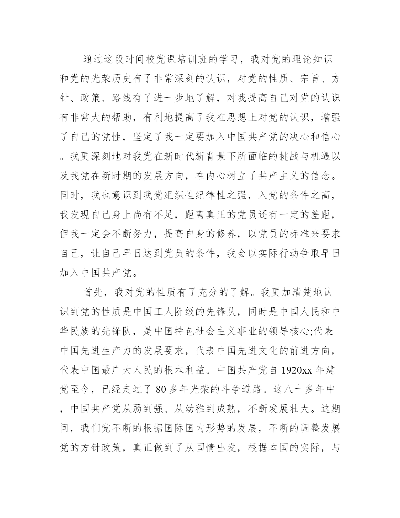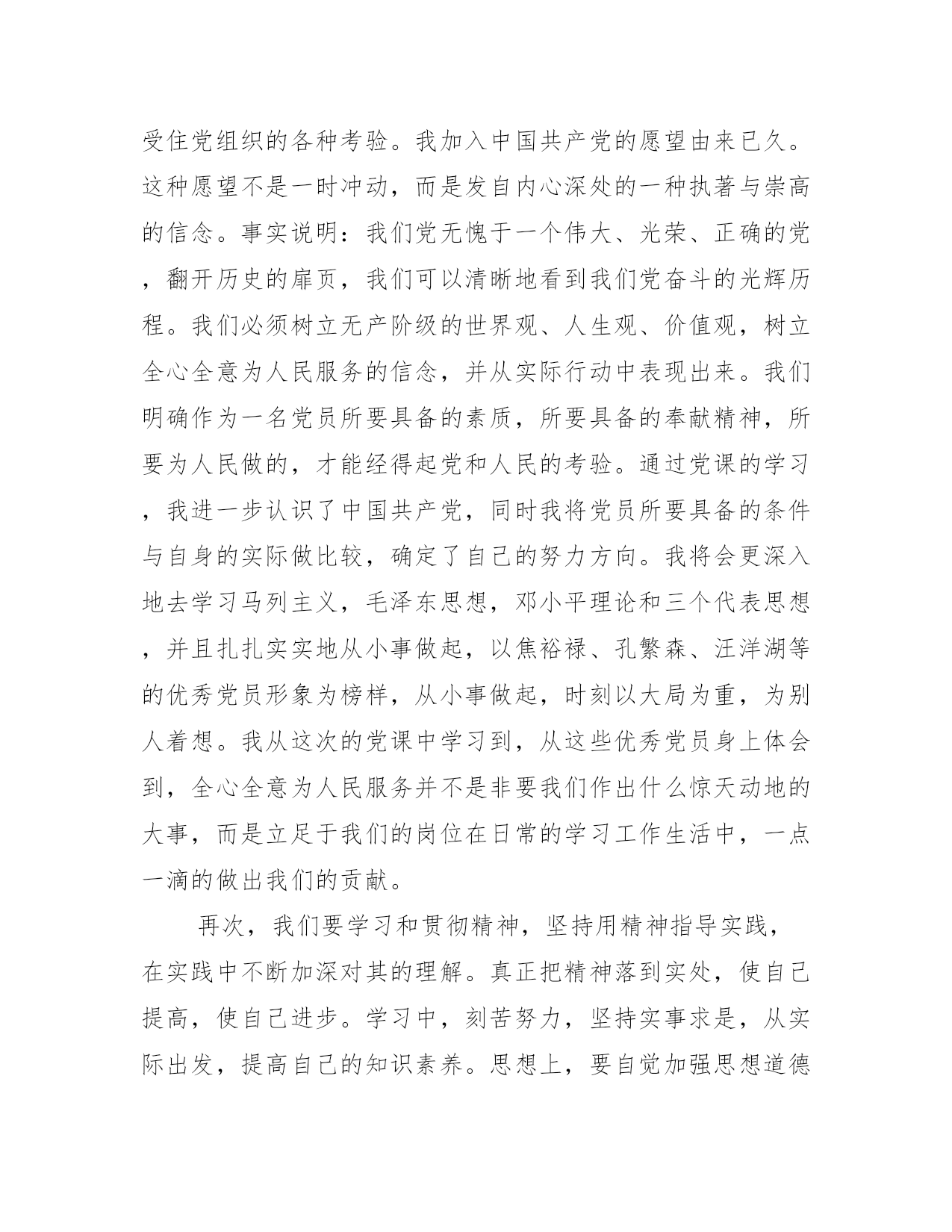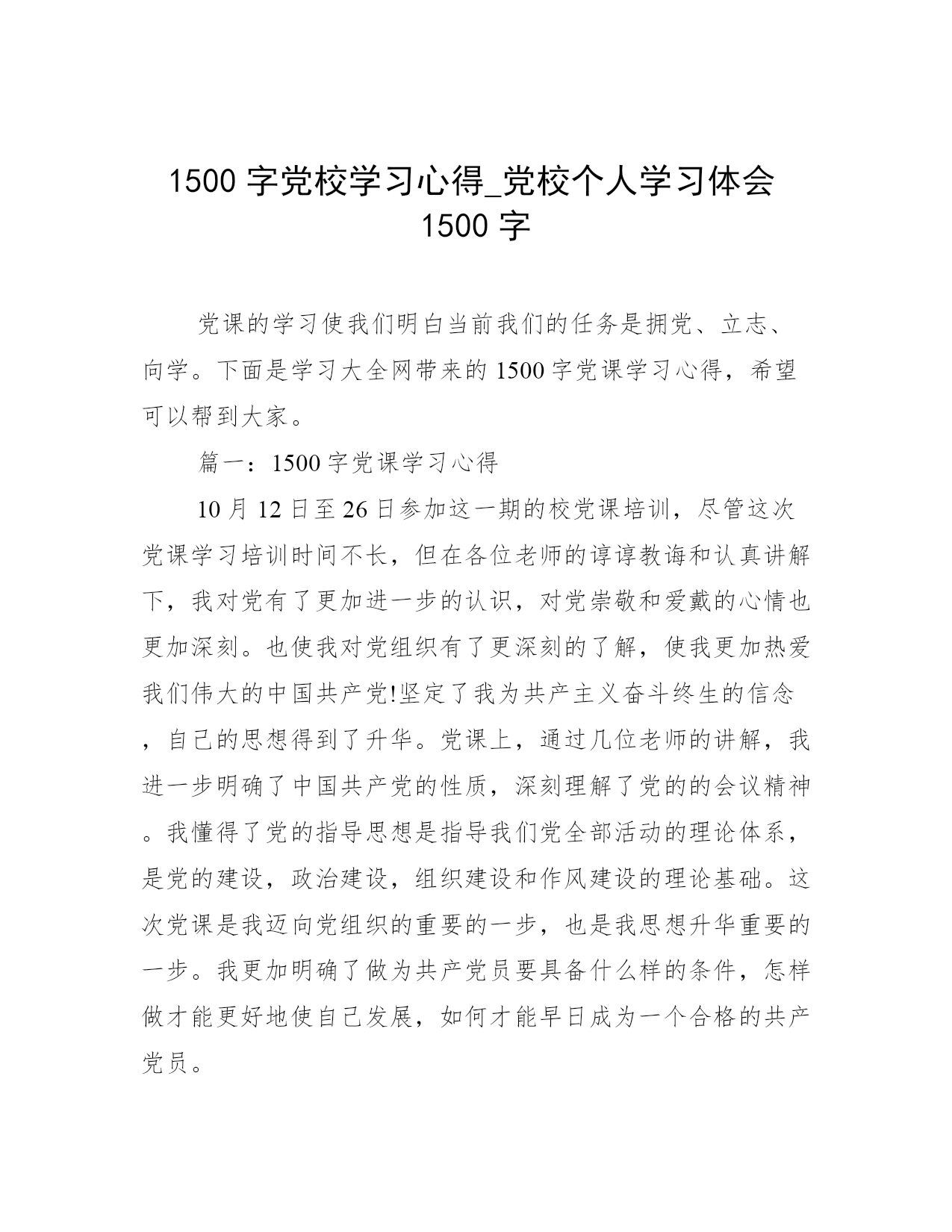 1500字党校学习心得_党校个人学习体会1500字党课的学习使我们明白当前我们的任务是拥党、立志、向学。下面是学习大全网带来的1500字党课学习心得,希望可以帮到大家。篇一:1500字党课学习心得10月12日至26日参加这一期的校党课培训,尽管这次党课学习培训时间不长,但在各位老师的谆谆教诲和认真讲解下,我对党有了更加进一步的认识,对党崇敬和爱戴的心情也更加深刻。也使我对党组织有了更深刻的了解,使我更加热爱我们伟大的中国共产党!坚定了我为共产主义奋斗终生的信念,自己的思想得到了升华。党课上,通过几位老师的讲解,我进一步明确了中国共产党的性质,深刻理解了党的的会议精神。我懂得了党的指导思想是指导我们党全部活动的理论体系,是党的建设,政治建设,组织建设和作风建设的理论基础。这次党课是我迈向党组织的重要的一步,也是我思想升华重要的一步。我更加明确了做为共产党员要具备什么样的条件,怎样做才能更好地使自己发展,如何才能早日成为一个合格的共产党员。通过这段时间校党课培训班的学习,我对党的理论知识和党的光荣历史有了非常深刻的认识,对党的性质、宗旨、方针、政策、路线有了进一步地了解,对我提高自己对党的认识有非常大的帮助,有利地提高了我在思想上对党的认识,增强了自己的党性,坚定了我一定要加入中国共产党的决心和信心。我更深刻地对我党在新时代新背景下所面临的挑战与机遇以及我党在新时期的发展方向,在内心树立了共产主义的信念。同时,我也意识到我党组织性纪律性之强,入党的条件之高,我发现自己身上尚有不足,距离真正的党员还有一定的差距,但我一定会不断努力,提高自身的修养,以党员的标准来要求自己,让自己早日达到党员的条件,我会以实际行动争取早日加入中国共产党。首先,我对党的性质有了充分的了解。我更加清楚地认识到党的性质是中国工人阶级的先锋队,同时是中国人民和中华民族的先锋队,是中国特色社会主义事业的领导核心;代表中国先进生产力的发展要求,代表中国先进文化的前进方向,代表中国最广大人民的根本利益。中国共产党自1920xx年建党至今,已经走过了80多年光荣的斗争道路。这八十多年中,中国共产党从弱到强、从幼稚到成熟,不断发展壮大。这期间,我们党不断的根据国际国内形势的发展,不断的调整发展党的方针政策,真正做到了从国情出发,根据本国的实际,与时俱进。正是因为如此,党才能在不同的历史时期做出正确的选择,带领全国各族人民战胜一个又一个的困难,从一个胜利走向另一个胜利。党的辉煌历史,是中国共产党为民族解放和人民幸福,前赴后继,英勇奋斗的历史;是马克思主义普遍原理同中国革命和建设的具体实践相结合的历史;是坚持真理,修正错误,战胜一切困难,不断发展壮大的历史。中国共产党是马克思列宁主义同中国工人运动相结合的产物。它以中国工人阶级为基础,集中体现了中国工人阶级的特性。它同大工业生产相联系,是先进生产力的代表。在同资产阶级作斗争的过程中锤炼了高度的团结互助精神和严格的组织纪律性,它是历史上最先进、最革命和具有远大前途的阶级。毛泽东思想是马克思列宁主义在中国的运用和发展,是被实践证明了的关于中国革命的正确的理论原则和经验总结,是中国共产党集体智慧的结晶。邓小平理论把马克思主义同当代中国实践和时代特征结合起来,是毛泽东思想的继承和发展,是当代中国的马克思主义。而“三个代表”重要思想是对马列主义、毛泽东思想、邓小平理论的继承和发扬,反映了当代世界和中国的发展变化对党和国家工作的新要求。其次,通过学习也让我端正了入党动机。正确的动机是正确行动的精神力量,只有树立为了献身共产主义事业,为了更好地为人民服务的入党动机,才能在任何时候、任何场合经受住党组织的各种考验。我加入中国共产党的愿望由来已久。这种愿望不是一时冲动,而是发自内心深处的一种执著与崇高的信念。事实说明:我们党无愧于一个伟大、光荣、正确的党,翻开历史的扉页,我们可以清晰地看到我们党奋斗的光辉历程。我们必须树立无产阶级的世界观、人生观、价值观,树立全心全意为人民服务的信念,并从实际行动中表现出来。我们明确作为一名党员所要具备的素质,所要具备的奉献精神,所要为人民做的,才能经得起党和人民的考验。通过党课的学习,我进一步认识了中国共产党,同时我将党员所要具备的条件与自身的实际做比较,确定了自己的努力方向。我将会更深入地去学习马列主义,毛泽东思想,邓小平理论和三个代表思想,并且扎扎实实地从小事做起,以焦裕禄、孔繁森、汪洋湖等的优秀党员形象为榜样,从小事做起,时刻以大局为重,为别人着想。我从这次的党课中学习到,从这些优秀党员身上体会到,全心全意为人民服务并不是非要我们作出什么惊天动地的大事,而是立足于我们的岗位在日常的学习工作生活中,一点一滴的做出我们的贡献。再次,我们要学习和贯彻精神,坚持用精神指导实践,在实践中不断加深对其的理解。真正