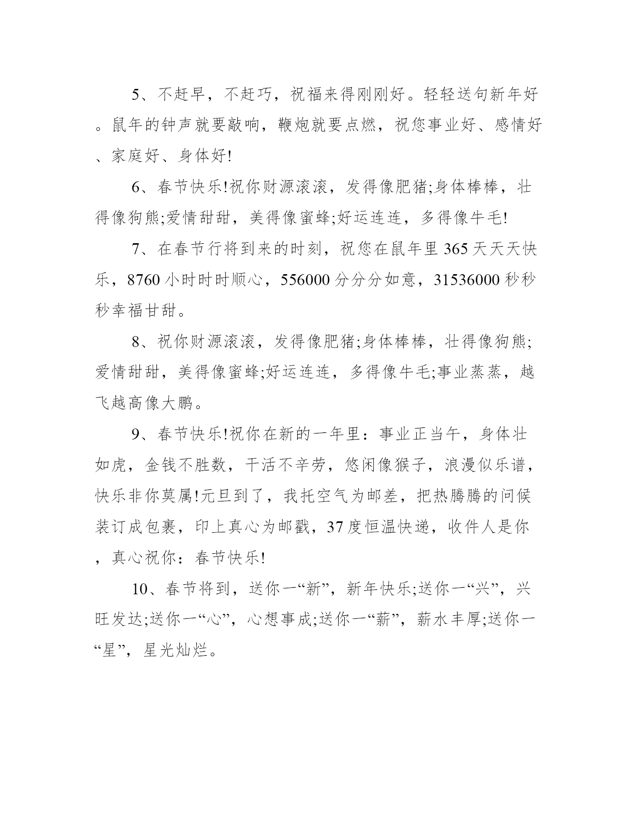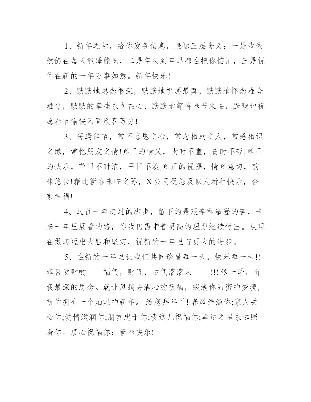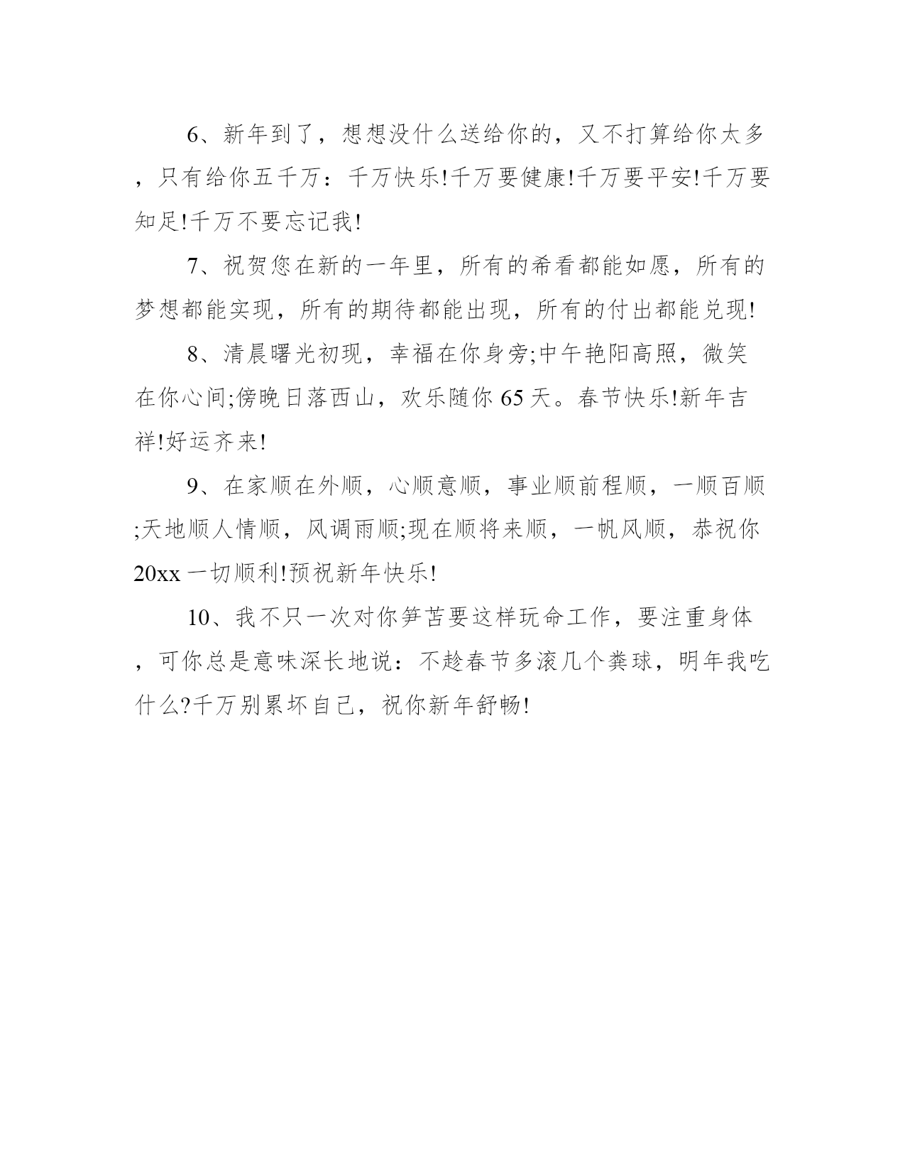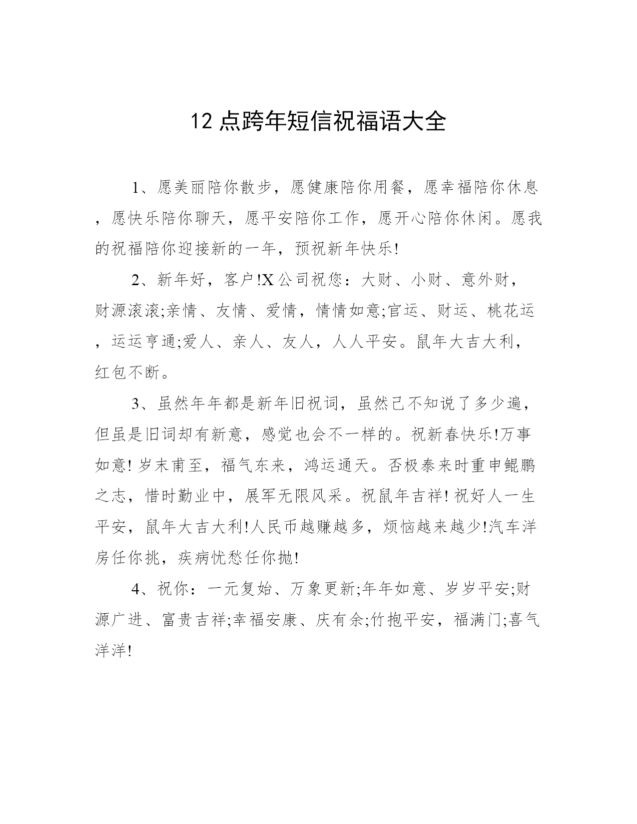 12点跨年短信祝福语大全1、愿美丽陪你散步,愿健康陪你用餐,愿幸福陪你休息,愿快乐陪你聊天,愿平安陪你工作,愿开心陪你休闲。愿我的祝福陪你迎接新的一年,预祝新年快乐!2、新年好,客户!X公司祝您:大财、小财、意外财,财源滚滚;亲情、友情、爱情,情情如意;官运、财运、桃花运,运运亨通;爱人、亲人、友人,人人平安。鼠年大吉大利,红包不断。3、虽然年年都是新年旧祝词,虽然己不知说了多少遍,但虽是旧词却有新意,感觉也会不一样的。祝新春快乐!万事如意!岁末甫至,福气东来,鸿运通天。否极泰来时重申鲲鹏之志,惜时勤业中,展军无限风采。祝鼠年吉祥!祝好人一生平安,鼠年大吉大利!人民币越赚越多,烦恼越来越少!汽车洋房任你挑,疾病忧愁任你抛!4、祝你:一元复始、万象更新;年年如意、岁岁平安;财源广进、富贵吉祥;幸福安康、庆有余;竹抱平安,福满门;喜气洋洋!5、不赶早,不赶巧,祝福来得刚刚好。轻轻送句新年好。鼠年的钟声就要敲响,鞭炮就要点燃,祝您事业好、感情好、家庭好、身体好!6、春节快乐!祝你财源滚滚,发得像肥猪;身体棒棒,壮得像狗熊;爱情甜甜,美得像蜜蜂;好运连连,多得像牛毛!7、在春节行将到来的时刻,祝您在鼠年里365天天天快乐,8760小时时时顺心,556000分分分如意,31536000秒秒秒幸福甘甜。8、祝你财源滚滚,发得像肥猪;身体棒棒,壮得像狗熊;爱情甜甜,美得像蜜蜂;好运连连,多得像牛毛;事业蒸蒸,越飞越高像大鹏。9、春节快乐!祝你在新的一年里:事业正当午,身体壮如虎,金钱不胜数,干活不辛劳,悠闲像猴子,浪漫似乐谱,快乐非你莫属!元旦到了,我托空气为邮差,把热腾腾的问候装订成包裹,印上真心为邮戳,37度恒温快递,收件人是你,真心祝你:春节快乐!10、春节将到,送你一“新”,新年快乐;送你一“兴”,兴旺发达;送你一“心”,心想事成;送你一“薪”,薪水丰厚;送你一“星”,星光灿烂。1、新年之际,给你发条信息,表达三层含义:一是我依然健在每天能睡能吃,二是年头到年尾都在把你惦记,三是祝你在新的一年万事如意。新年快乐!2、默默地思念很深,默默地祝愿最真,默默地怀念难舍难分,默默的牵挂永久在心,默默地等待春节来临,默默地祝愿春节愉快团圆欣喜万分!3、每逢佳节,常怀感恩之心,常念相助之人,常感相识之缘,常忆朋友之情!真正的情义,贵时不重,贫时不轻;真正的快乐,节日不时浓,平日不淡;真正的祝福,情真意切,韵味悠长!藉此新春来临之际,X公司祝您及家人新年快乐,合家幸福!4、过往一年走过的脚步,留下的是艰辛和攀登的苦,未来一年里展看的路,你我仍需带着更高的理想继续付出。从现在做起迈出大胆和坚定,祝新的一年里有更大的进步。5、在新的一年里让我们共同珍惜每一天,快乐每一天!!恭喜发财哟——福气,财气,运气滚滚来——!!!这一季,有我最深的思念。就让风捎去满心的祝福,缀满你甜蜜的梦境,祝你拥有一个灿烂的新年。给您拜年了!春风洋溢你;家人关心你;爱情滋润你;朋友忠于你;我这儿祝福你;幸运之星永远照着你。衷心祝福你:新春快乐!6、新年到了,想想没什么送给你的,又不打算给你太多,只有给你五千万:千万快乐!千万要健康!千万要平安!千万要知足!千万不要忘记我!7、祝贺您在新的一年里,所有的希看都能如愿,所有的梦想都能实现,所有的期待都能出现,所有的付出都能兑现!8、清晨曙光初现,幸福在你身旁;中午艳阳高照,微笑在你心间;傍晚日落西山,欢乐随你65天。春节快乐!新年吉祥!好运齐来!9、在家顺在外顺,心顺意顺,事业顺前程顺,一顺百顺;天地顺人情顺,风调雨顺;现在顺将来顺,一帆风顺,恭祝你20xx一切顺利!预祝新年快乐!10、我不只一次对你笋苫要这样玩命工作,要注重身体,可你总是意味深长地说:不趁春节多滚几个粪球,明年我吃什么?千万别累坏自己,祝你新年舒畅!