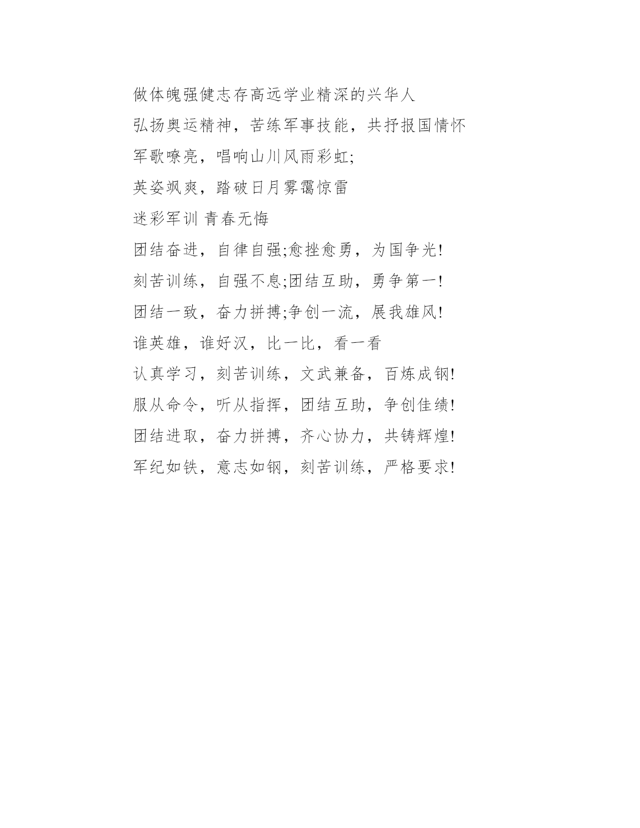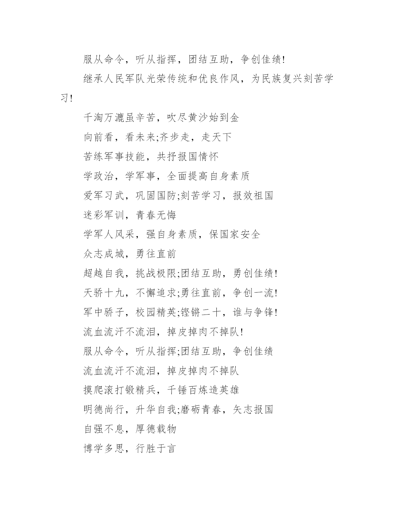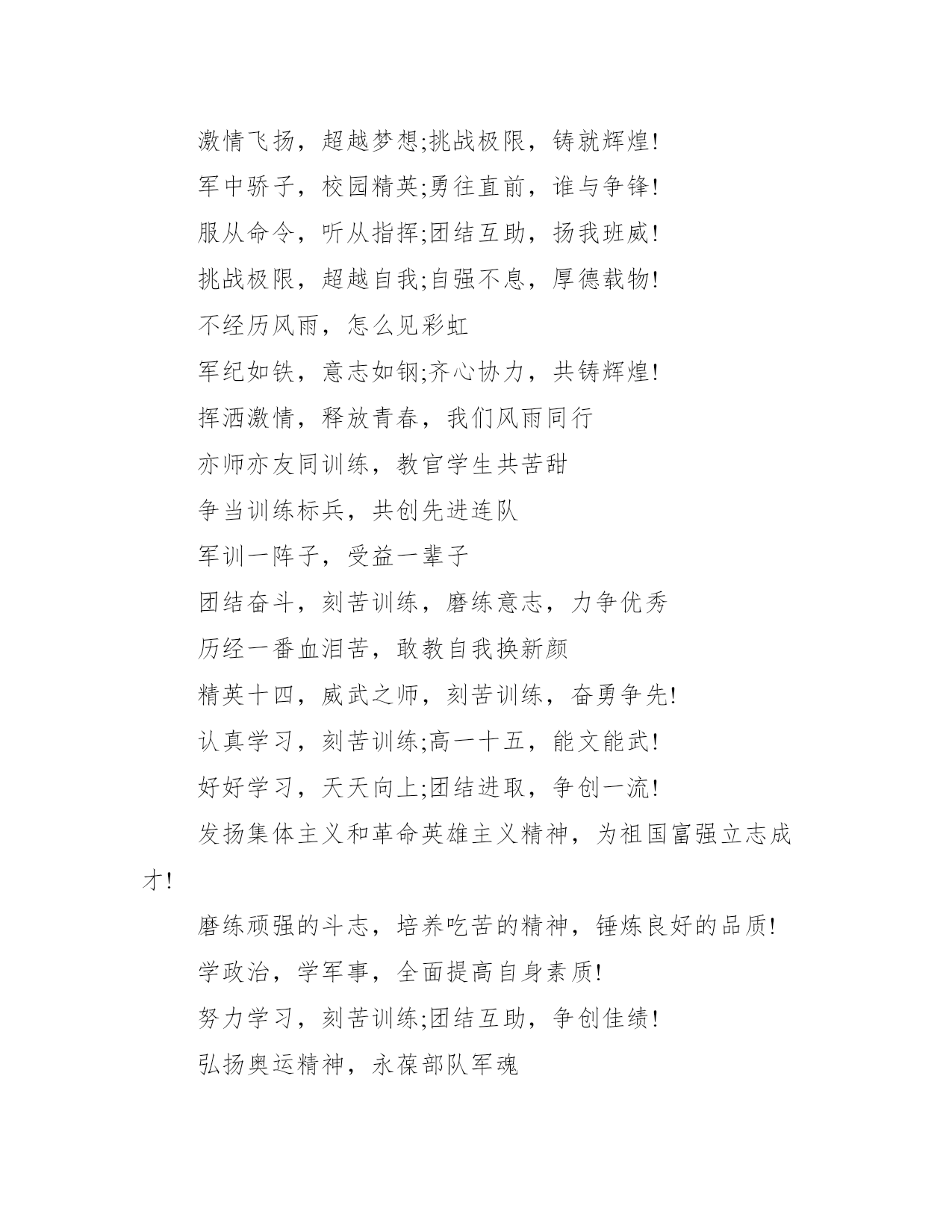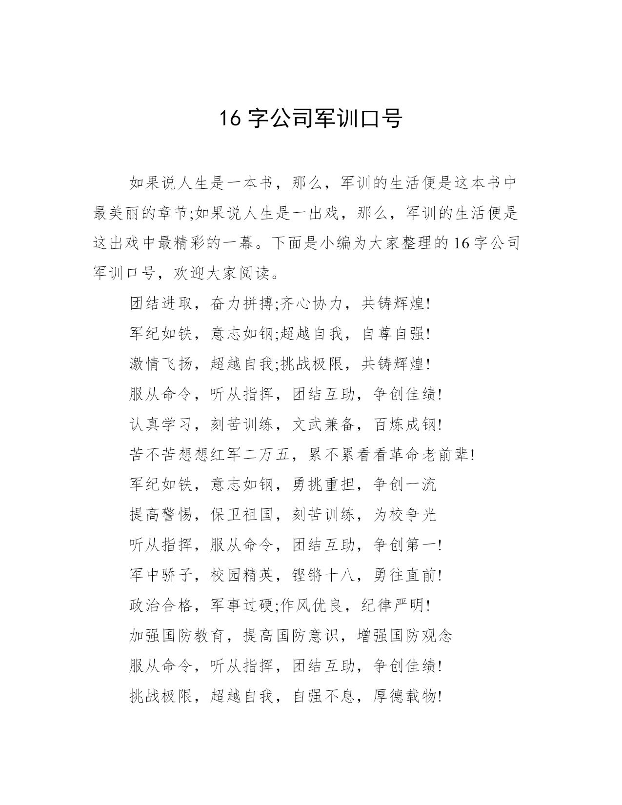 16字公司军训口号如果说人生是一本书,那么,军训的生活便是这本书中最美丽的章节;如果说人生是一出戏,那么,军训的生活便是这出戏中最精彩的一幕。下面是小编为大家整理的16字公司军训口号,欢迎大家阅读。团结进取,奋力拼搏;齐心协力,共铸辉煌!军纪如铁,意志如钢;超越自我,自尊自强!激情飞扬,超越自我;挑战极限,共铸辉煌!服从命令,听从指挥,团结互助,争创佳绩!认真学习,刻苦训练,文武兼备,百炼成钢!苦不苦想想红军二万五,累不累看看革命老前辈!军纪如铁,意志如钢,勇挑重担,争创一流提高警惕,保卫祖国,刻苦训练,为校争光听从指挥,服从命令,团结互助,争创第一!军中骄子,校园精英,铿锵十八,勇往直前!政治合格,军事过硬;作风优良,纪律严明!加强国防教育,提高国防意识,增强国防观念服从命令,听从指挥,团结互助,争创佳绩!挑战极限,超越自我,自强不息,厚德载物!服从命令,听从指挥,团结互助,争创佳绩!继承人民军队光荣传统和优良作风,为民族复兴刻苦学习!千淘万漉虽辛苦,吹尽黄沙始到金向前看,看未来;齐步走,走天下苦练军事技能,共抒报国情怀学政治,学军事,全面提高自身素质爱军习武,巩固国防;刻苦学习,报效祖国迷彩军训,青春无悔学军人风采,强自身素质,保国家安全众志成城,勇往直前超越自我,挑战极限;团结互助,勇创佳绩!天骄十九,不懈追求;勇往直前,争创一流!军中骄子,校园精英;铿锵二十,谁与争锋!流血流汗不流泪,掉皮掉肉不掉队!服从命令,听从指挥;团结互助,争创佳绩流血流汗不流泪,掉皮掉肉不掉队摸爬滚打锻精兵,千锤百炼造英雄明德尚行,升华自我;磨砺青春,矢志报国自强不息,厚德载物博学多思,行胜于言激情飞扬,超越梦想;挑战极限,铸就辉煌!军中骄子,校园精英;勇往直前,谁与争锋!服从命令,听从指挥;团结互助,扬我班威!挑战极限,超越自我;自强不息,厚德载物!不经历风雨,怎么见彩虹军纪如铁,意志如钢;齐心协力,共铸辉煌!挥洒激情,释放青春,我们风雨同行亦师亦友同训练,教官学生共苦甜争当训练标兵,共创先进连队军训一阵子,受益一辈子团结奋斗,刻苦训练,磨练意志,力争优秀历经一番血泪苦,敢教自我换新颜精英十四,威武之师,刻苦训练,奋勇争先!认真学习,刻苦训练;高一十五,能文能武!好好学习,天天向上;团结进取,争创一流!发扬集体主义和革命英雄主义精神,为祖国富强立志成才!磨练顽强的斗志,培养吃苦的精神,锤炼良好的品质!学政治,学军事,全面提高自身素质!努力学习,刻苦训练;团结互助,争创佳绩!弘扬奥运精神,永葆部队军魂做体魄强健志存高远学业精深的兴华人弘扬奥运精神,苦练军事技能,共抒报国情怀军歌嘹亮,唱响山川风雨彩虹;英姿飒爽,踏破日月雾霭惊雷迷彩军训青春无悔团结奋进,自律自强;愈挫愈勇,为国争光!刻苦训练,自强不息;团结互助,勇争第一!团结一致,奋力拼搏;争创一流,展我雄风!谁英雄,谁好汉,比一比,看一看认真学习,刻苦训练,文武兼备,百炼成钢!服从命令,听从指挥,团结互助,争创佳绩!团结进取,奋力拼搏,齐心协力,共铸辉煌!军纪如铁,意志如钢,刻苦训练,严格要求!