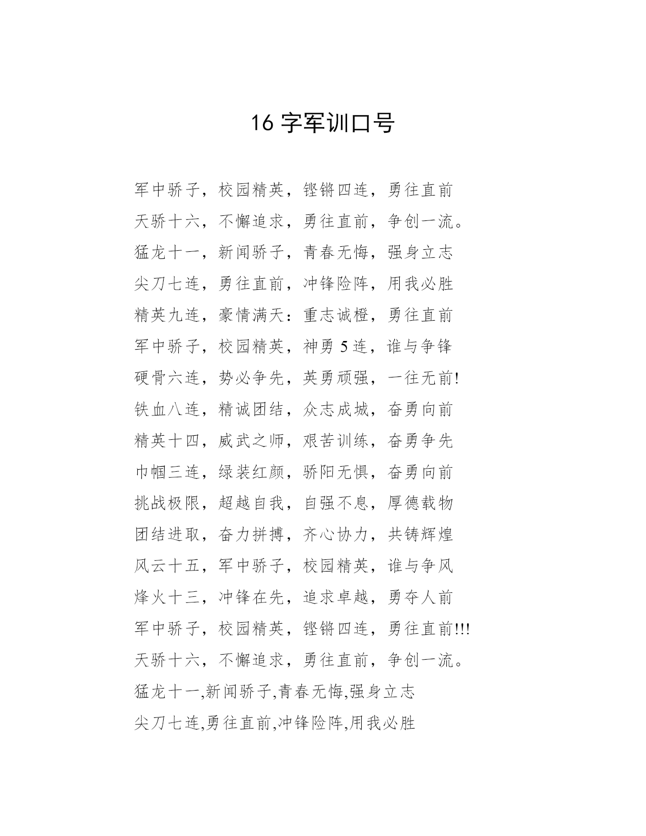 16字军训口号军中骄子,校园精英,铿锵四连,勇往直前天骄十六,不懈追求,勇往直前,争创一流。猛龙十一,新闻骄子,青春无悔,强身立志尖刀七连,勇往直前,冲锋险阵,用我必胜精英九连,豪情满天:重志诚橙,勇往直前军中骄子,校园精英,神勇5连,谁与争锋硬骨六连,势必争先,英勇顽强,一往无前!铁血八连,精诚团结,众志成城,奋勇向前精英十四,威武之师,艰苦训练,奋勇争先巾帼三连,绿装红颜,骄阳无惧,奋勇向前挑战极限,超越自我,自强不息,厚德载物团结进取,奋力拼搏,齐心协力,共铸辉煌风云十五,军中骄子,校园精英,谁与争风烽火十三,冲锋在先,追求卓越,勇夺人前军中骄子,校园精英,铿锵四连,勇往直前!!!天骄十六,不懈追求,勇往直前,争创一流。猛龙十一,新闻骄子,青春无悔,强身立志尖刀七连,勇往直前,冲锋险阵,用我必胜精英九连,豪情满天:重志诚橙,勇往直前军中骄子,校园精英,神勇5连,谁与争锋看我十七,文武双全,经邦济世,一往无前飞豹十二,律韵风流,气有浩然,奋勇向前服从命令,听从指挥,团结互助,争创佳绩。认真学习,刻苦训练,文武兼备,百炼成钢军纪如铁,意志如钢,刻苦训练,严格要求听从指挥,服从命令,团结互助,争创第一大一n班,豪气冲天,文韬武略,奋勇向前龙腾虎跃,雷霆万钧,无与伦比,万众一心放马金鞍,勇冠江山,风云变幻,唯我n班提高警惕,保卫祖国,刻苦训练,为校争光明德尚行,矢志报国,磨砺青春,升华自我。军纪如铁,意志如钢,勇挑重担,力创一流。军鹰十连,翱翔九天,搏风抗雨,共创辉煌