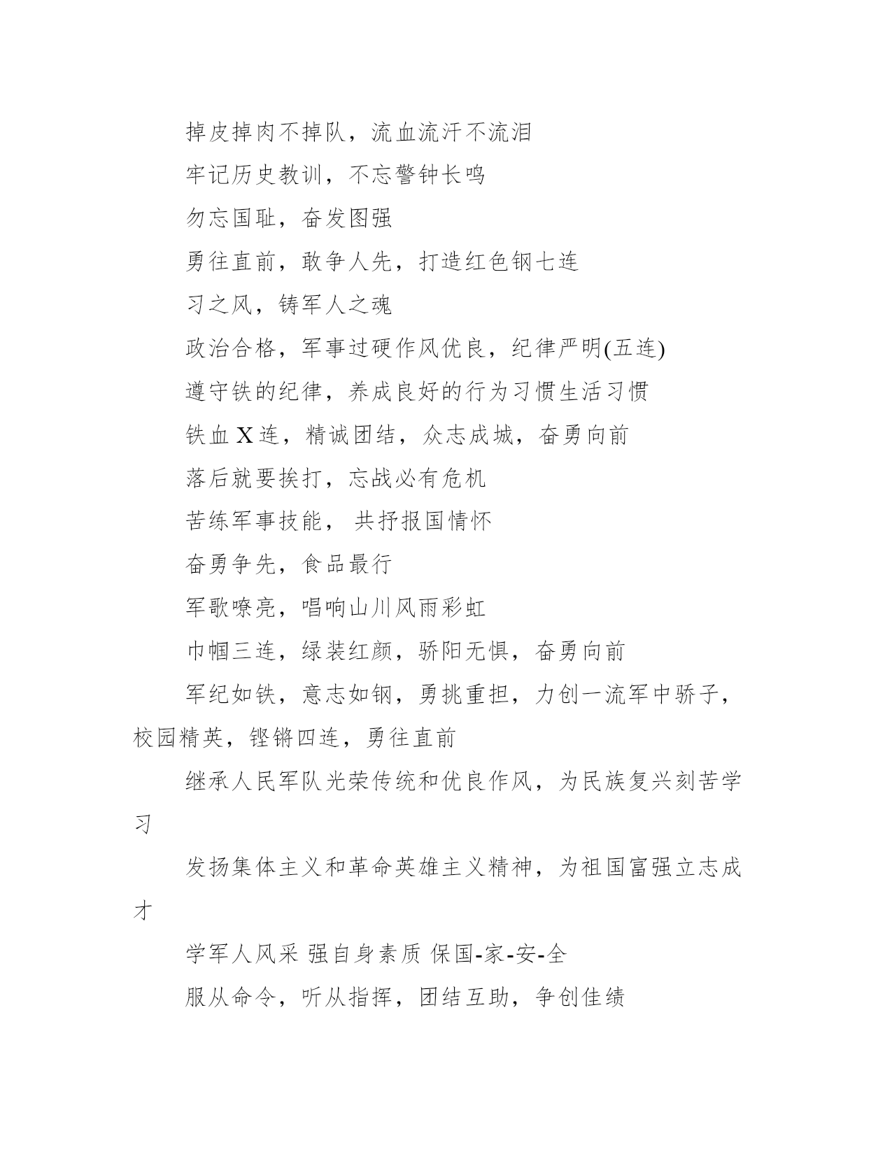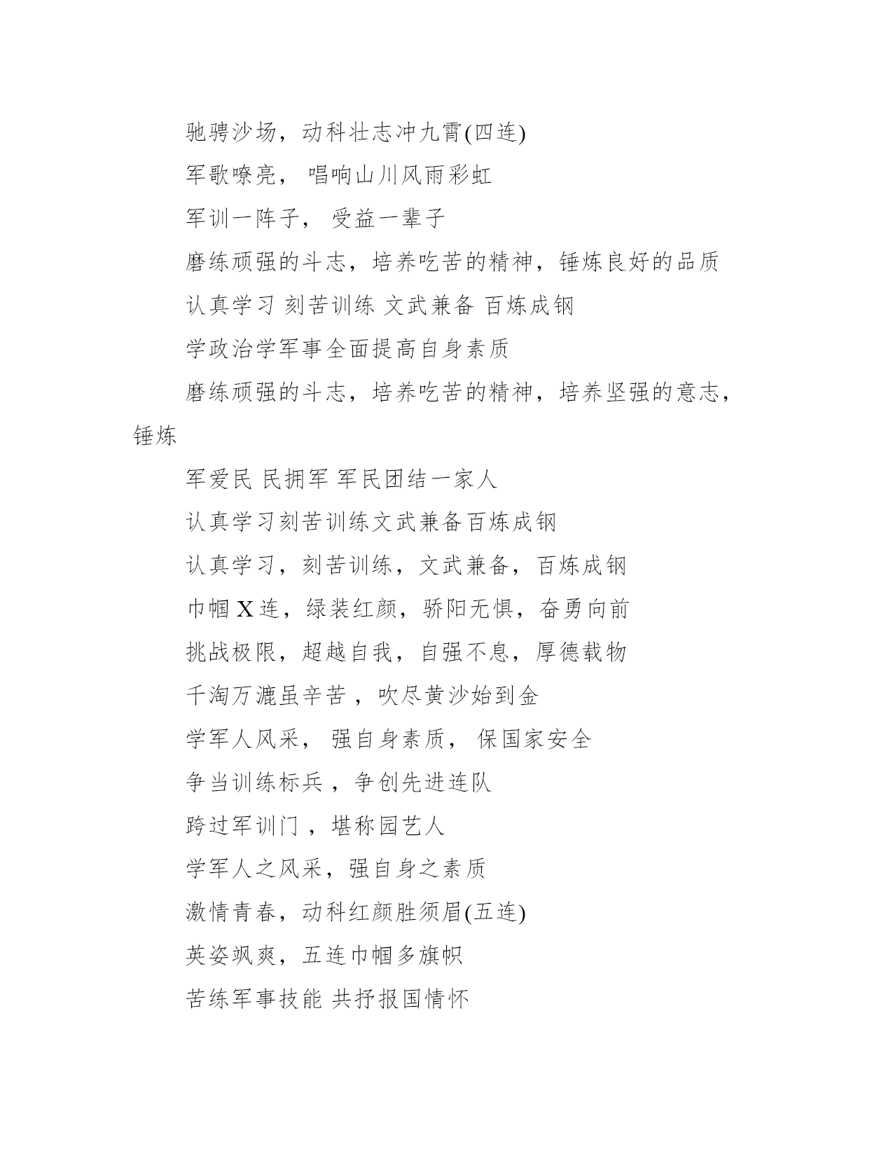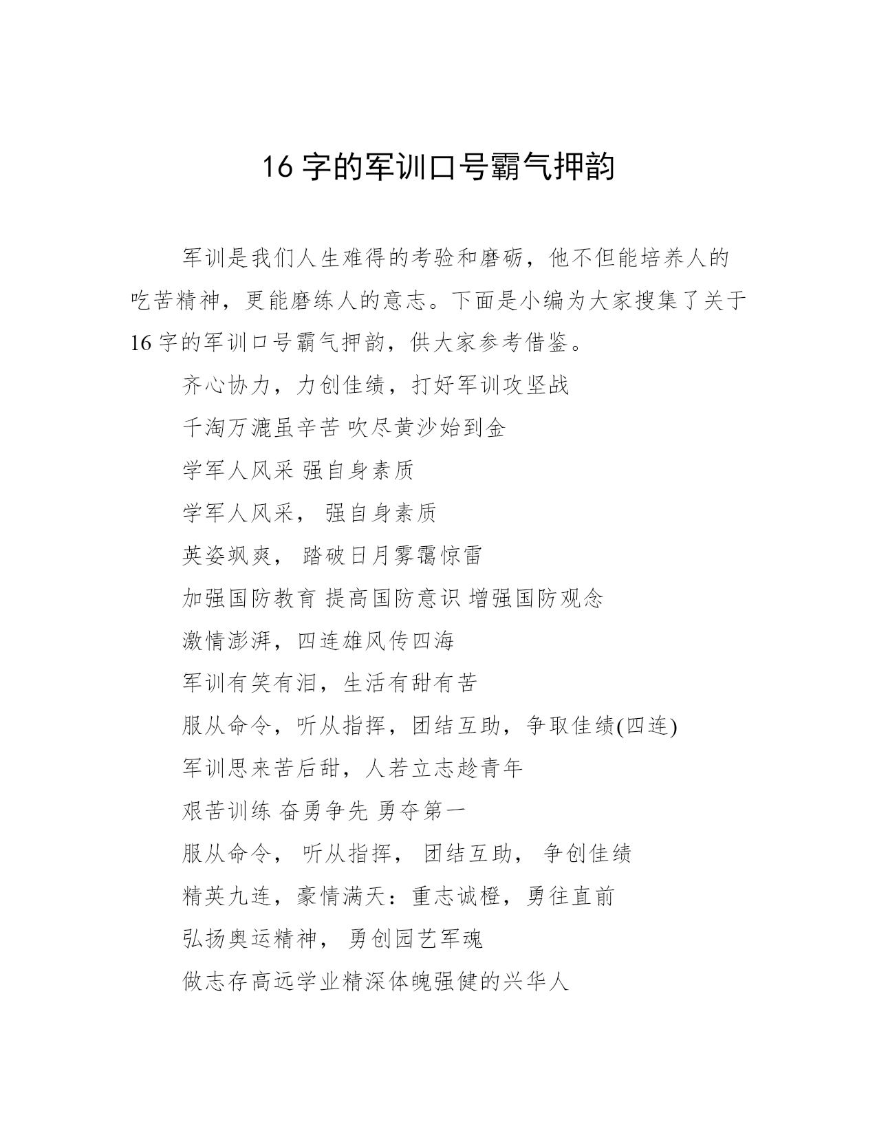 16字的军训口号霸气押韵军训是我们人生难得的考验和磨砺,他不但能培养人的吃苦精神,更能磨练人的意志。下面是小编为大家搜集了关于16字的军训口号霸气押韵,供大家参考借鉴。齐心协力,力创佳绩,打好军训攻坚战千淘万漉虽辛苦吹尽黄沙始到金学军人风采强自身素质学军人风采,强自身素质英姿飒爽,踏破日月雾霭惊雷加强国防教育提高国防意识增强国防观念激情澎湃,四连雄风传四海军训有笑有泪,生活有甜有苦服从命令,听从指挥,团结互助,争取佳绩(四连)军训思来苦后甜,人若立志趁青年艰苦训练奋勇争先勇夺第一服从命令,听从指挥,团结互助,争创佳绩精英九连,豪情满天:重志诚橙,勇往直前弘扬奥运精神,勇创园艺军魂做志存高远学业精深体魄强健的兴华人掉皮掉肉不掉队,流血流汗不流泪牢记历史教训,不忘警钟长鸣勿忘国耻,奋发图强勇往直前,敢争人先,打造红色钢七连习之风,铸军人之魂政治合格,军事过硬作风优良,纪律严明(五连)遵守铁的纪律,养成良好的行为习惯生活习惯铁血X连,精诚团结,众志成城,奋勇向前落后就要挨打,忘战必有危机苦练军事技能,共抒报国情怀奋勇争先,食品最行军歌嘹亮,唱响山川风雨彩虹巾帼三连,绿装红颜,骄阳无惧,奋勇向前军纪如铁,意志如钢,勇挑重担,力创一流军中骄子,校园精英,铿锵四连,勇往直前继承人民军队光荣传统和优良作风,为民族复兴刻苦学习发扬集体主义和革命英雄主义精神,为祖国富强立志成才学军人风采强自身素质保国-家-安-全服从命令,听从指挥,团结互助,争创佳绩驰骋沙场,动科壮志冲九霄(四连)军歌嘹亮,唱响山川风雨彩虹军训一阵子,受益一辈子磨练顽强的斗志,培养吃苦的精神,锤炼良好的品质认真学习刻苦训练文武兼备百炼成钢学政治学军事全面提高自身素质磨练顽强的斗志,培养吃苦的精神,培养坚强的意志,锤炼军爱民民拥军军民团结一家人认真学习刻苦训练文武兼备百炼成钢认真学习,刻苦训练,文武兼备,百炼成钢巾帼X连,绿装红颜,骄阳无惧,奋勇向前挑战极限,超越自我,自强不息,厚德载物千淘万漉虽辛苦,吹尽黄沙始到金学军人风采,强自身素质,保国家安全争当训练标兵,争创先进连队跨过军训门,堪称园艺人学军人之风采,强自身之素质激情青春,动科红颜胜须眉(五连)英姿飒爽,五连巾帼多旗帜苦练军事技能共抒报国情怀少小立志报国,长大踊跃参军向前看,看未来齐步走,走天下依法接受国防教育是全体公民的权利和义务动科雄风,所向披靡敢打必胜,豪气冲天历经一番风雨,敢教自我换新颜