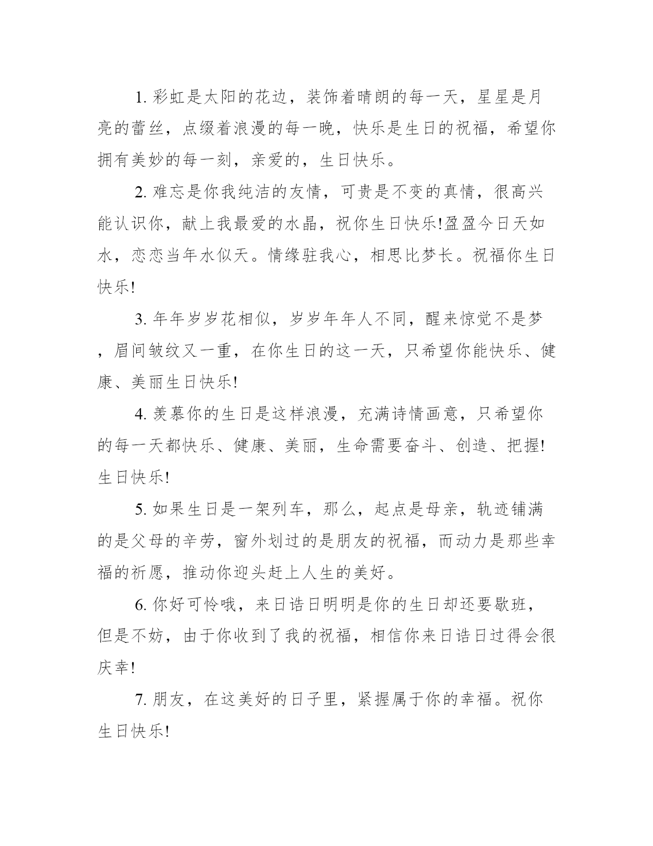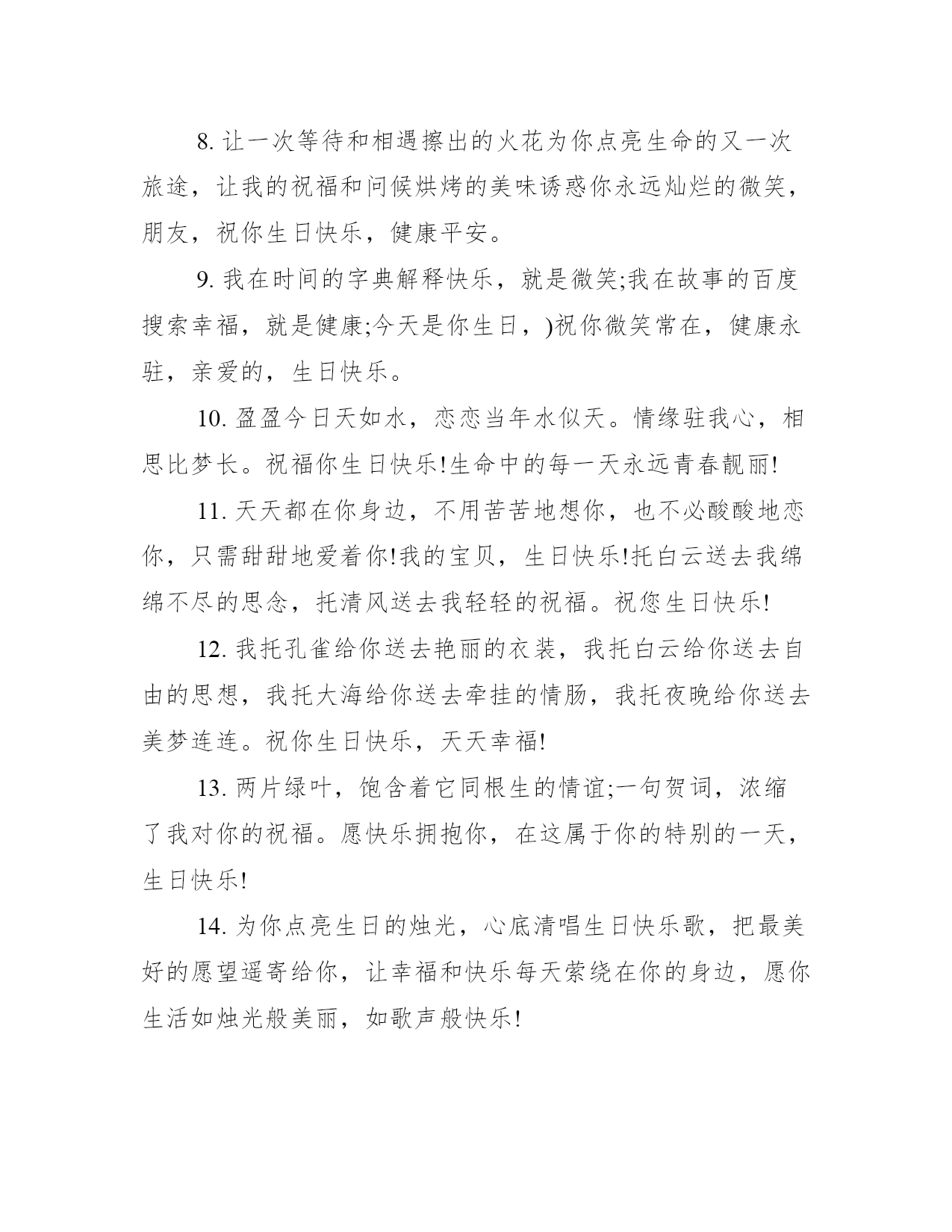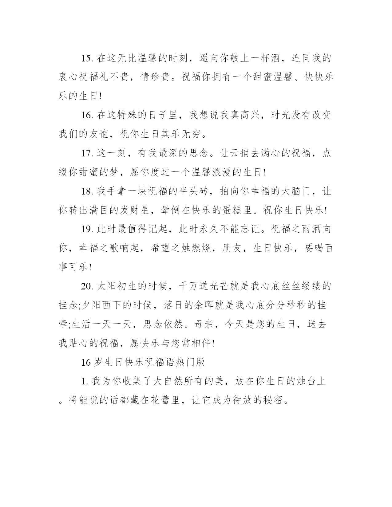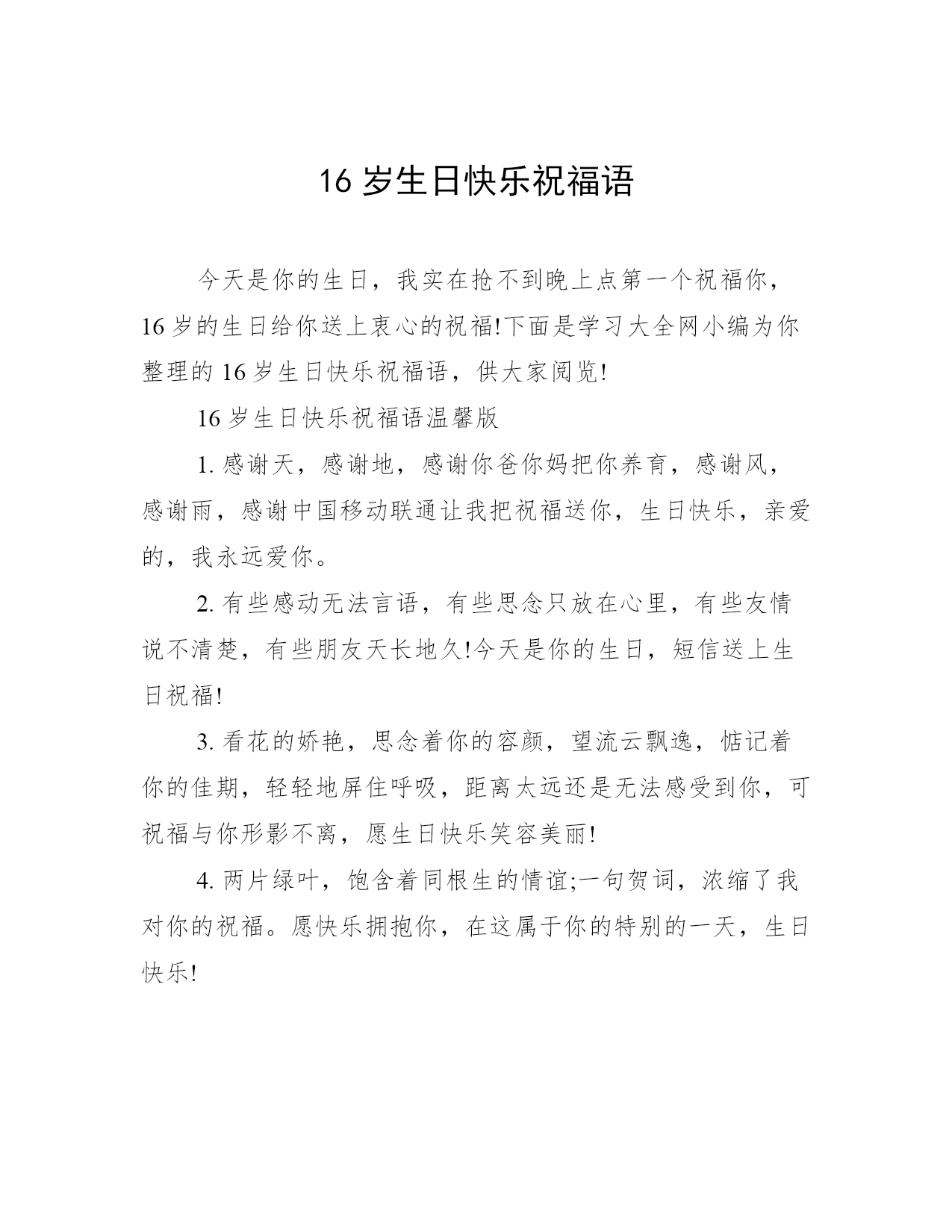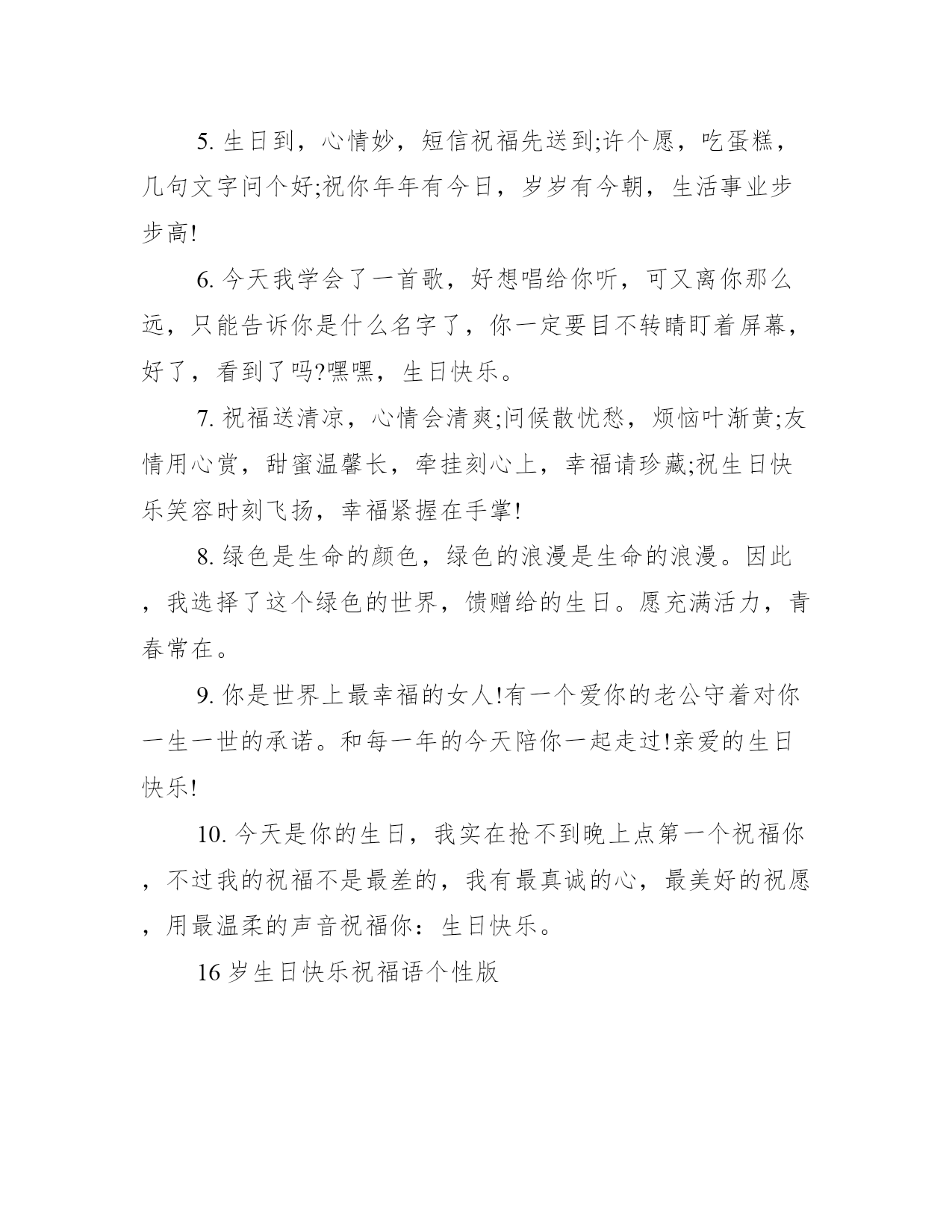 16岁生日快乐祝福语今天是你的生日,我实在抢不到晚上点第一个祝福你,16岁的生日给你送上衷心的祝福!下面是学习大全网小编为你整理的16岁生日快乐祝福语,供大家阅览!16岁生日快乐祝福语温馨版1.感谢天,感谢地,感谢你爸你妈把你养育,感谢风,感谢雨,感谢中国移动联通让我把祝福送你,生日快乐,亲爱的,我永远爱你。2.有些感动无法言语,有些思念只放在心里,有些友情说不清楚,有些朋友天长地久!今天是你的生日,短信送上生日祝福!3.看花的娇艳,思念着你的容颜,望流云飘逸,惦记着你的佳期,轻轻地屏住呼吸,距离太远还是无法感受到你,可祝福与你形影不离,愿生日快乐笑容美丽!4.两片绿叶,饱含着同根生的情谊;一句贺词,浓缩了我对你的祝福。愿快乐拥抱你,在这属于你的特别的一天,生日快乐!5.生日到,心情妙,短信祝福先送到;许个愿,吃蛋糕,几句文字问个好;祝你年年有今日,岁岁有今朝,生活事业步步高!6.今天我学会了一首歌,好想唱给你听,可又离你那么远,只能告诉你是什么名字了,你一定要目不转睛盯着屏幕,好了,看到了吗?嘿嘿,生日快乐。7.祝福送清凉,心情会清爽;问候散忧愁,烦恼叶渐黄;友情用心赏,甜蜜温馨长,牵挂刻心上,幸福请珍藏;祝生日快乐笑容时刻飞扬,幸福紧握在手掌!8.绿色是生命的颜色,绿色的浪漫是生命的浪漫。因此,我选择了这个绿色的世界,馈赠给的生日。愿充满活力,青春常在。9.你是世界上最幸福的女人!有一个爱你的老公守着对你一生一世的承诺。和每一年的今天陪你一起走过!亲爱的生日快乐!10.今天是你的生日,我实在抢不到晚上点第一个祝福你,不过我的祝福不是最差的,我有最真诚的心,最美好的祝愿,用最温柔的声音祝福你:生日快乐。16岁生日快乐祝福语个性版1.彩虹是太阳的花边,装饰着晴朗的每一天,星星是月亮的蕾丝,点缀着浪漫的每一晚,快乐是生日的祝福,希望你拥有美妙的每一刻,亲爱的,生日快乐。2.难忘是你我纯洁的友情,可贵是不变的真情,很高兴能认识你,献上我最爱的水晶,祝你生日快乐!盈盈今日天如水,恋恋当年水似天。情缘驻我心,相思比梦长。祝福你生日快乐!3.年年岁岁花相似,岁岁年年人不同,醒来惊觉不是梦,眉间皱纹又一重,在你生日的这一天,只希望你能快乐、健康、美丽生日快乐!4.羡慕你的生日是这样浪漫,充满诗情画意,只希望你的每一天都快乐、健康、美丽,生命需要奋斗、创造、把握!生日快乐!5.如果生日是一架列车,那么,起点是母亲,轨迹铺满的是父母的辛劳,窗外划过的是朋友的祝福,而动力是那些幸福的祈愿,推动你迎头赶上人生的美好。6.你好可怜哦,来日诰日明明是你的生日却还要歇班,但是不妨,由于你收到了我的祝福,相信你来日诰日过得会很庆幸!7.朋友,在这美好的日子里,紧握属于你的幸福。祝你生日快乐!8.让一次等待和相遇擦出的火花为你点亮生命的又一次旅途,让我的祝福和问候烘烤的美味诱惑你永远灿烂的微笑,朋友,祝你生日快乐,健康平安。9.我在时间的字典解释快乐,就是微笑;我在故事的百度搜索幸福,就是健康;今天是你生日,)祝你微笑常在,健康永驻,亲爱的,生日快乐。10.盈盈今日天如水,恋恋当年水似天。情缘驻我心,相思比梦长。祝福你生日快乐!生命中的每一天永远青春靓丽!11.天天都在你身边,不用苦苦地想你,也不必酸酸地恋你,只需甜甜地爱着你!我的宝贝,生日快乐!托白云送去我绵绵不尽的思念,托清风送去我轻轻的祝福。祝您生日快乐!12.我托孔雀给你送去艳丽的衣装,我托白云给你送去自由的思想,我托大海给你送去牵挂的情肠,我托夜晚给你送去美梦连连。祝你生日快乐,天天幸福!13.两片绿叶,饱含着它同根生的情谊;一句贺词,浓缩了我对你的祝福。愿快乐拥抱你,在这属于你的特别的一天,生日快乐!14.为你点亮生日的烛光,心底清唱生日快乐歌,把最美好的愿望遥寄给你,让幸福和快乐每天萦绕在你的身边,愿你生活如烛光般美丽,如歌声般快乐!15.在这无比温馨的时刻,遥向你敬上一杯酒,连同我的衷心祝福礼不贵,情珍贵。祝福你拥有一个甜蜜温馨、快快乐乐的生日!16.在这特殊的日子里,我想说我真高兴,时光没有改变我们的友谊,祝你生日其乐无穷。17.这一刻,有我最深的思念。让云捎去满心的祝福,点缀你甜蜜的梦,愿你度过一个温馨浪漫的生日!18.我手拿一块祝福的半头砖,拍向你幸福的大脑门,让你转出满目的发财星,晕倒在快乐的蛋糕里。祝你生日快乐!19.此时最值得记起,此时永久不能忘记。祝福之雨洒向你,幸福之歌响起,希望之烛燃烧,朋友,生日快乐,要喝百事可乐!20.太阳初生的时候,千万道光芒就是我心底丝丝缕缕的挂念;夕阳西下的时候,落日的余晖就是我心底分分秒秒的挂牵;生活一天一天,思念依然。母亲,今天是您的生日,送去我贴心的祝福,愿快乐与您常相伴!16岁生日快乐祝福语热门版1.我为你收集了大自然所有的美,放在你生日