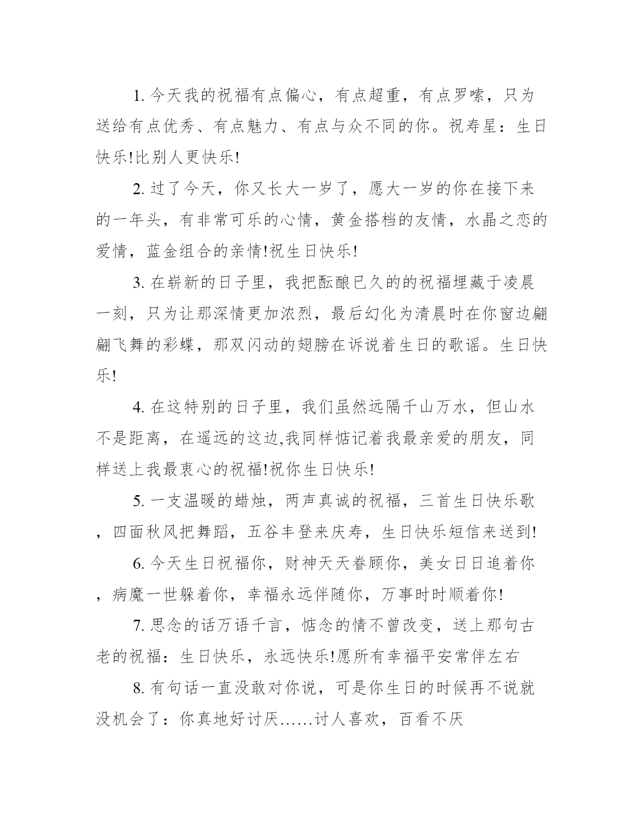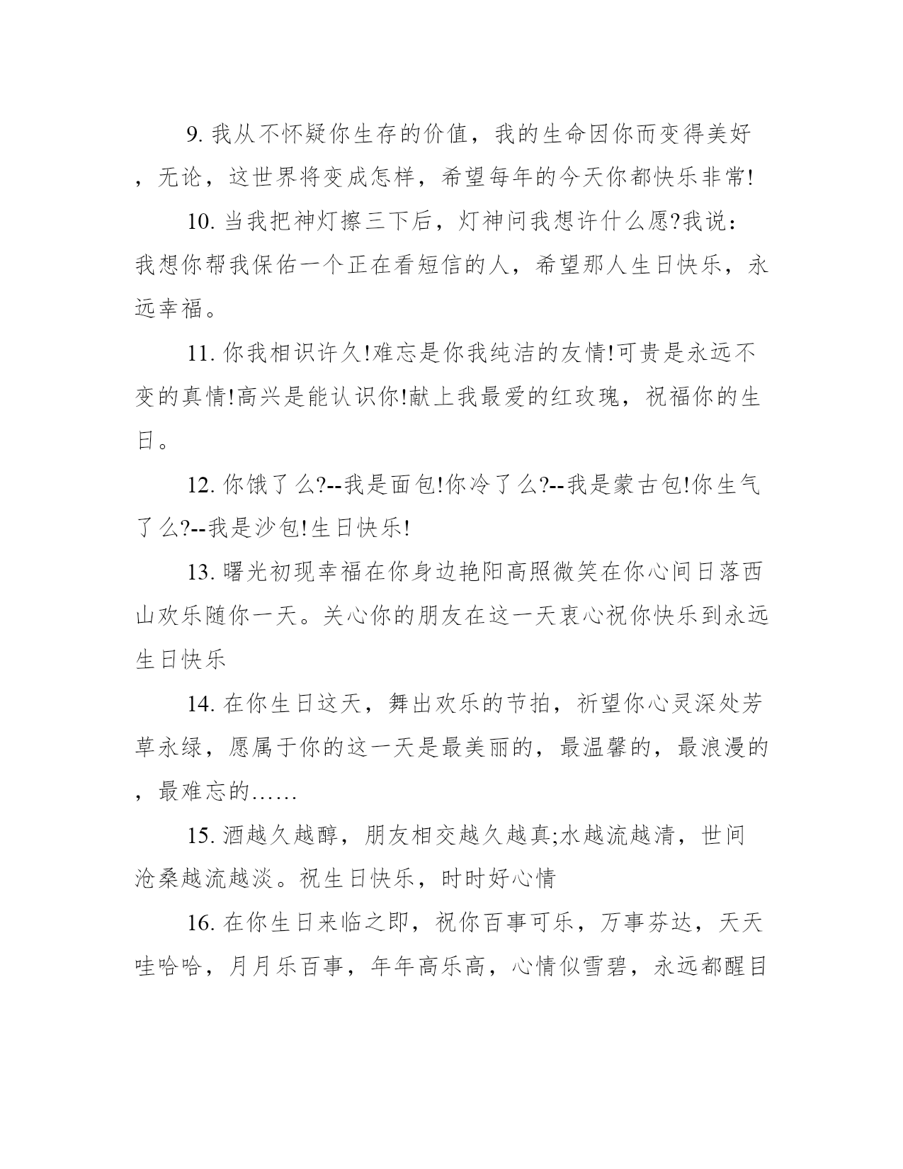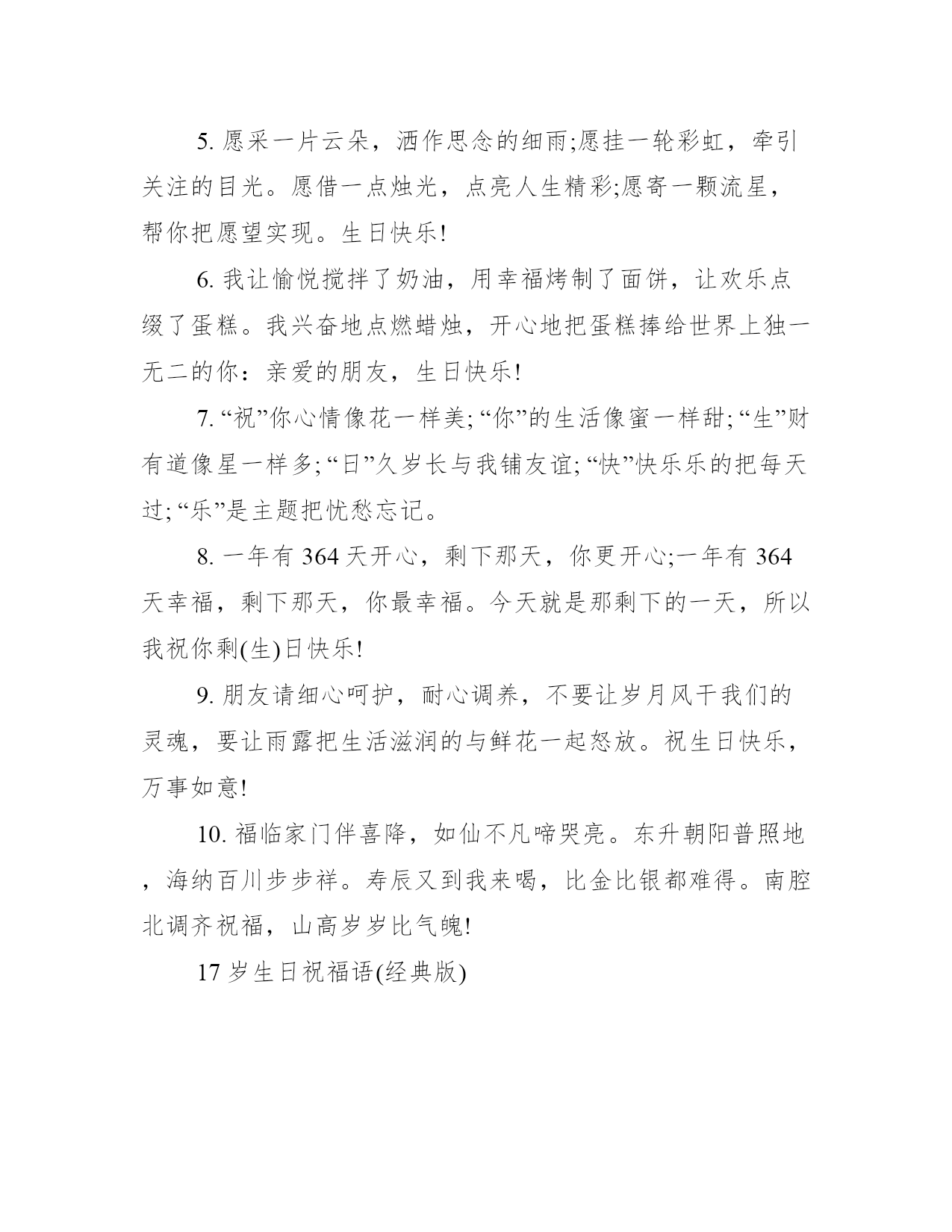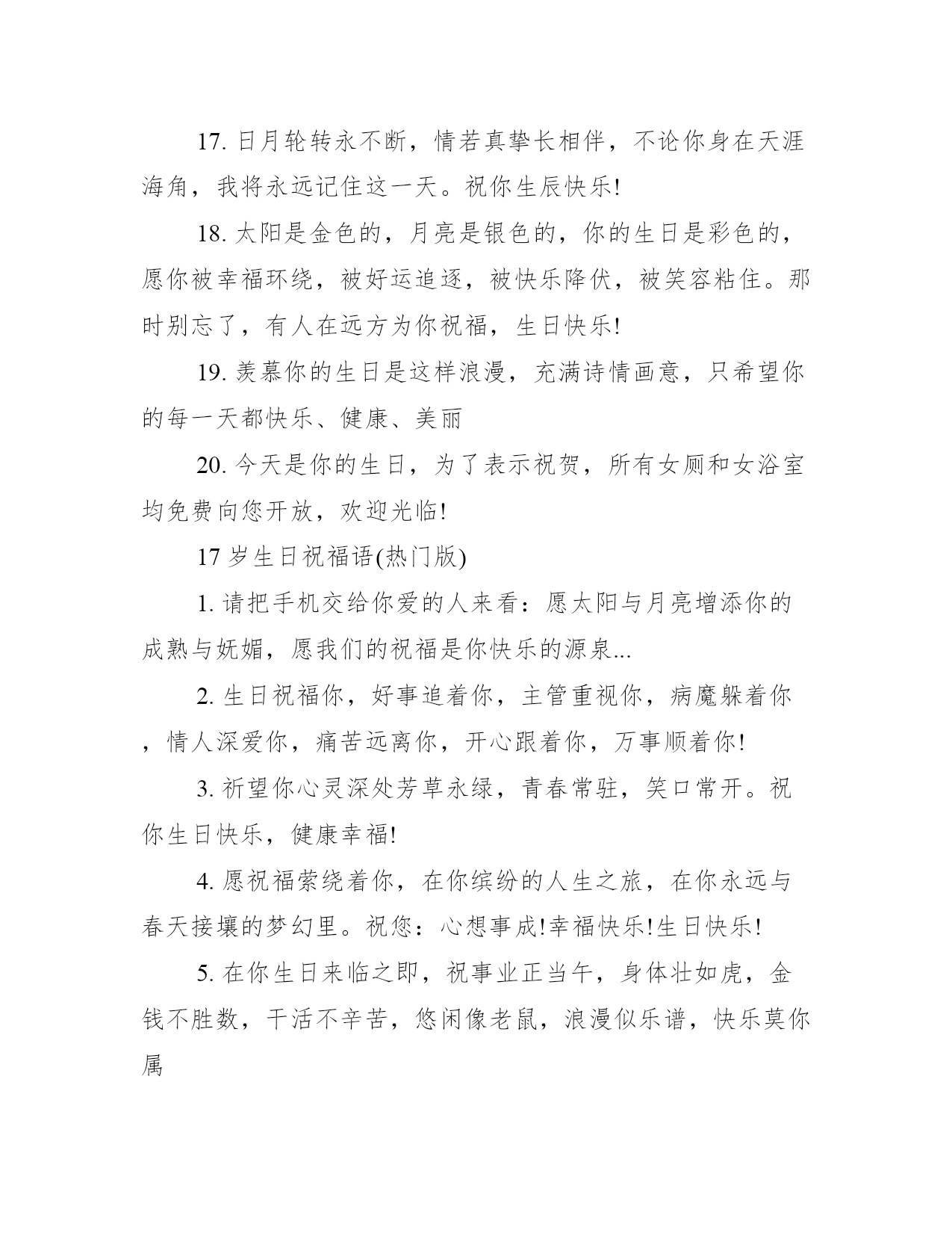 17岁祝福语大全_17岁生日祝福语17岁是充满活力的年纪,在17岁生日来临时,适合送上怎样的祝福语呢?下面学习大全网小编为你分享17岁生日祝福语,希望对你有所帮助!17岁生日祝福语(20xx最新版)1.当流星划过流彩,当烛火洋溢喜庆,当蛋糕分享甜蜜,在你人生的节点,我祈求四季留住青春,岁月留住永恒,汗水留住欢笑,生活留住从容。生日快乐!2.欢乐时唱唱跳跳,快乐时幸福叫叫,开心时嘻嘻笑笑,生日时蛋糕咬咬,许愿时要闭上眼并想着我,快吹灭烛光,你一定会心想事成,祝你生日快乐!3.在这一年中特别的日子,你注定被我想起。日子一天一天溜走,生日一年一年度过,愿将一份宁静和喜悦悄悄带给你,愿你所有的梦想成真。生日快乐!4.闪闪的烛光点燃心愿,淡淡的快乐轻轻的歌,今日是幸福的时光,最不平凡的日子,希望你能够开心.愿甜甜的蛋糕甜蜜你的梦,祝你生日快乐!5.愿采一片云朵,洒作思念的细雨;愿挂一轮彩虹,牵引关注的目光。愿借一点烛光,点亮人生精彩;愿寄一颗流星,帮你把愿望实现。生日快乐!6.我让愉悦搅拌了奶油,用幸福烤制了面饼,让欢乐点缀了蛋糕。我兴奋地点燃蜡烛,开心地把蛋糕捧给世界上独一无二的你:亲爱的朋友,生日快乐!7.“祝”你心情像花一样美;“你”的生活像蜜一样甜;“生”财有道像星一样多;“日”久岁长与我铺友谊;“快”快乐乐的把每天过;“乐”是主题把忧愁忘记。8.一年有364天开心,剩下那天,你更开心;一年有364天幸福,剩下那天,你最幸福。今天就是那剩下的一天,所以我祝你剩(生)日快乐!9.朋友请细心呵护,耐心调养,不要让岁月风干我们的灵魂,要让雨露把生活滋润的与鲜花一起怒放。祝生日快乐,万事如意!10.福临家门伴喜降,如仙不凡啼哭亮。东升朝阳普照地,海纳百川步步祥。寿辰又到我来喝,比金比银都难得。南腔北调齐祝福,山高岁岁比气魄!17岁生日祝福语(经典版)1.今天我的祝福有点偏心,有点超重,有点罗嗦,只为送给有点优秀、有点魅力、有点与众不同的你。祝寿星:生日快乐!比别人更快乐!2.过了今天,你又长大一岁了,愿大一岁的你在接下来的一年头,有非常可乐的心情,黄金搭档的友情,水晶之恋的爱情,蓝金组合的亲情!祝生日快乐!3.在崭新的日子里,我把酝酿已久的的祝福埋藏于凌晨一刻,只为让那深情更加浓烈,最后幻化为清晨时在你窗边翩翩飞舞的彩蝶,那双闪动的翅膀在诉说着生日的歌谣。生日快乐!4.在这特别的日子里,我们虽然远隔千山万水,但山水不是距离,在遥远的这边,我同样惦记着我最亲爱的朋友,同样送上我最衷心的祝福!祝你生日快乐!5.一支温暖的蜡烛,两声真诚的祝福,三首生日快乐歌,四面秋风把舞蹈,五谷丰登来庆寿,生日快乐短信来送到!6.今天生日祝福你,财神天天眷顾你,美女日日追着你,病魔一世躲着你,幸福永远伴随你,万事时时顺着你!7.思念的话万语千言,惦念的情不曾改变,送上那句古老的祝福:生日快乐,永远快乐!愿所有幸福平安常伴左右8.有句话一直没敢对你说,可是你生日的时候再不说就没机会了:你真地好讨厌……讨人喜欢,百看不厌9.我从不怀疑你生存的价值,我的生命因你而变得美好,无论,这世界将变成怎样,希望每年的今天你都快乐非常!10.当我把神灯擦三下后,灯神问我想许什么愿?我说:我想你帮我保佑一个正在看短信的人,希望那人生日快乐,永远幸福。11.你我相识许久!难忘是你我纯洁的友情!可贵是永远不变的真情!高兴是能认识你!献上我最爱的红玫瑰,祝福你的生日。12.你饿了么?--我是面包!你冷了么?--我是蒙古包!你生气了么?--我是沙包!生日快乐!13.曙光初现幸福在你身边艳阳高照微笑在你心间日落西山欢乐随你一天。关心你的朋友在这一天衷心祝你快乐到永远生日快乐14.在你生日这天,舞出欢乐的节拍,祈望你心灵深处芳草永绿,愿属于你的这一天是最美丽的,最温馨的,最浪漫的,最难忘的……15.酒越久越醇,朋友相交越久越真;水越流越清,世间沧桑越流越淡。祝生日快乐,时时好心情16.在你生日来临之即,祝你百事可乐,万事芬达,天天哇哈哈,月月乐百事,年年高乐高,心情似雪碧,永远都醒目17.日月轮转永不断,情若真挚长相伴,不论你身在天涯海角,我将永远记住这一天。祝你生辰快乐!18.太阳是金色的,月亮是银色的,你的生日是彩色的,愿你被幸福环绕,被好运追逐,被快乐降伏,被笑容粘住。那时别忘了,有人在远方为你祝福,生日快乐!19.羡慕你的生日是这样浪漫,充满诗情画意,只希望你的每一天都快乐、健康、美丽20.今天是你的生日,为了表示祝贺,所有女厕和女浴室均免费向您开放,欢迎光临!17岁生日祝福语(热门版)1.请把手机交给你爱的人来看:愿太阳与月亮增添你的成熟与妩媚,愿我们的祝福是你快乐的源泉...2.生日祝福你,好事追着你,主管重视你,病魔躲着你,情人深爱你,痛苦远离你,开心跟着你,万事顺着你!3.