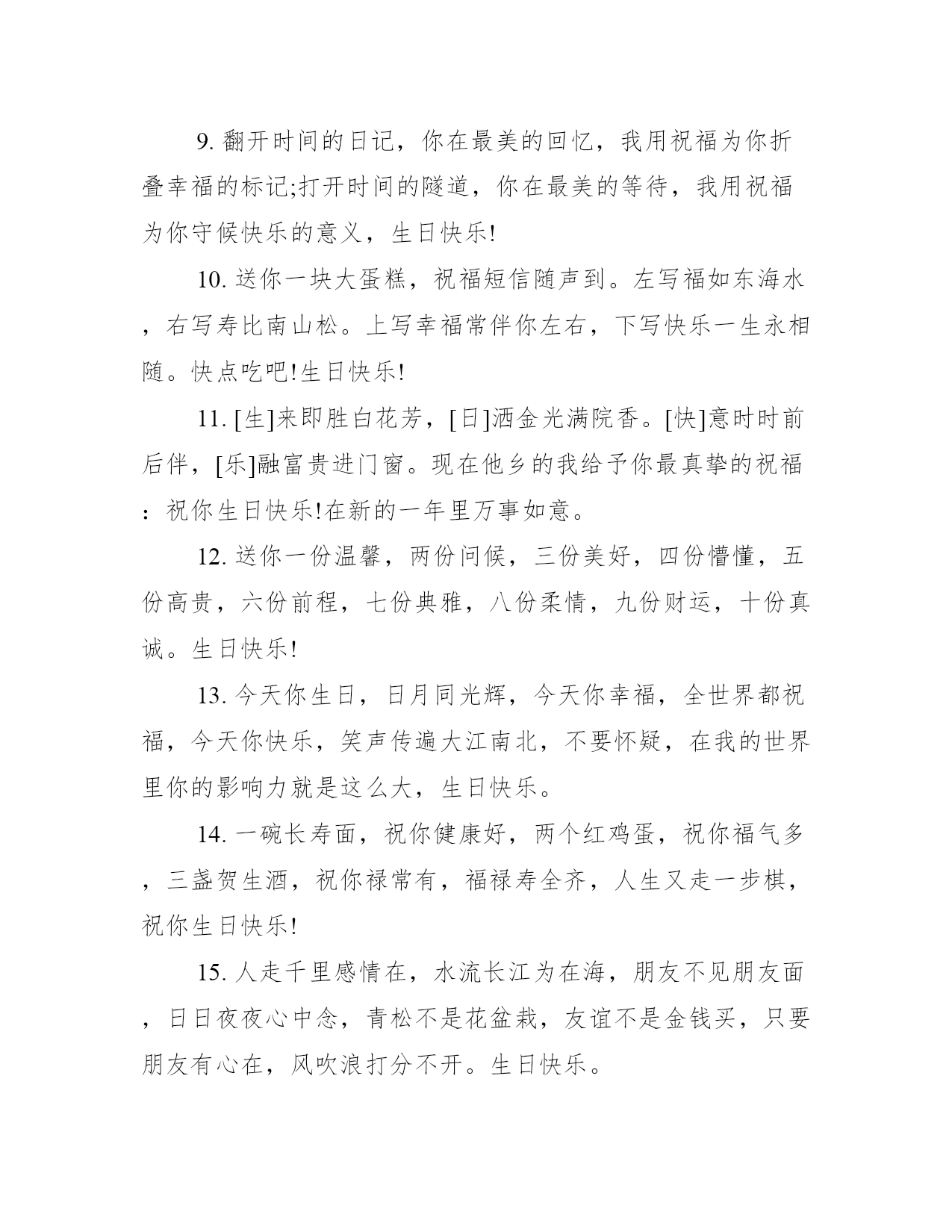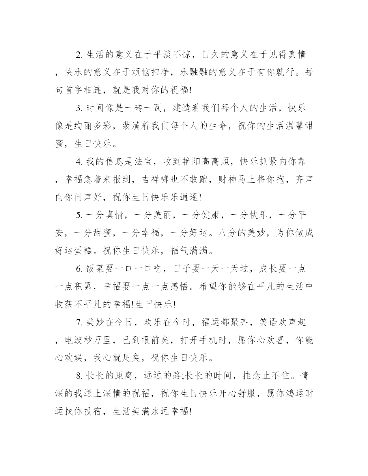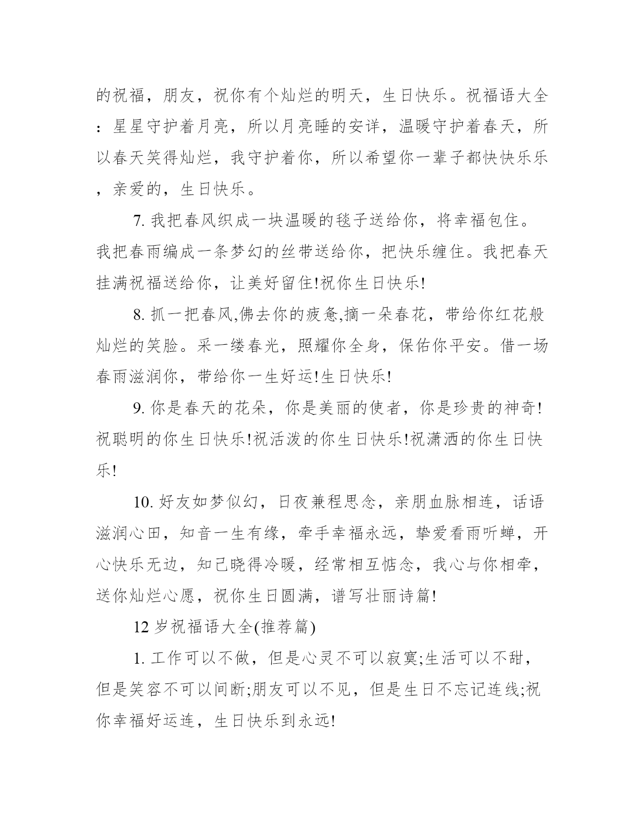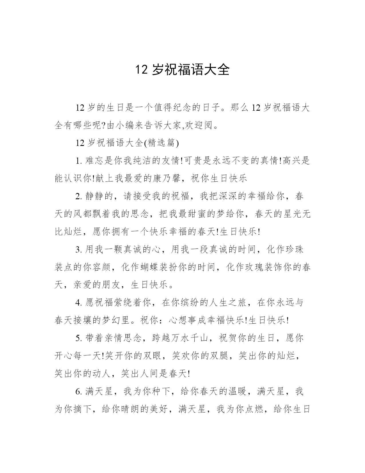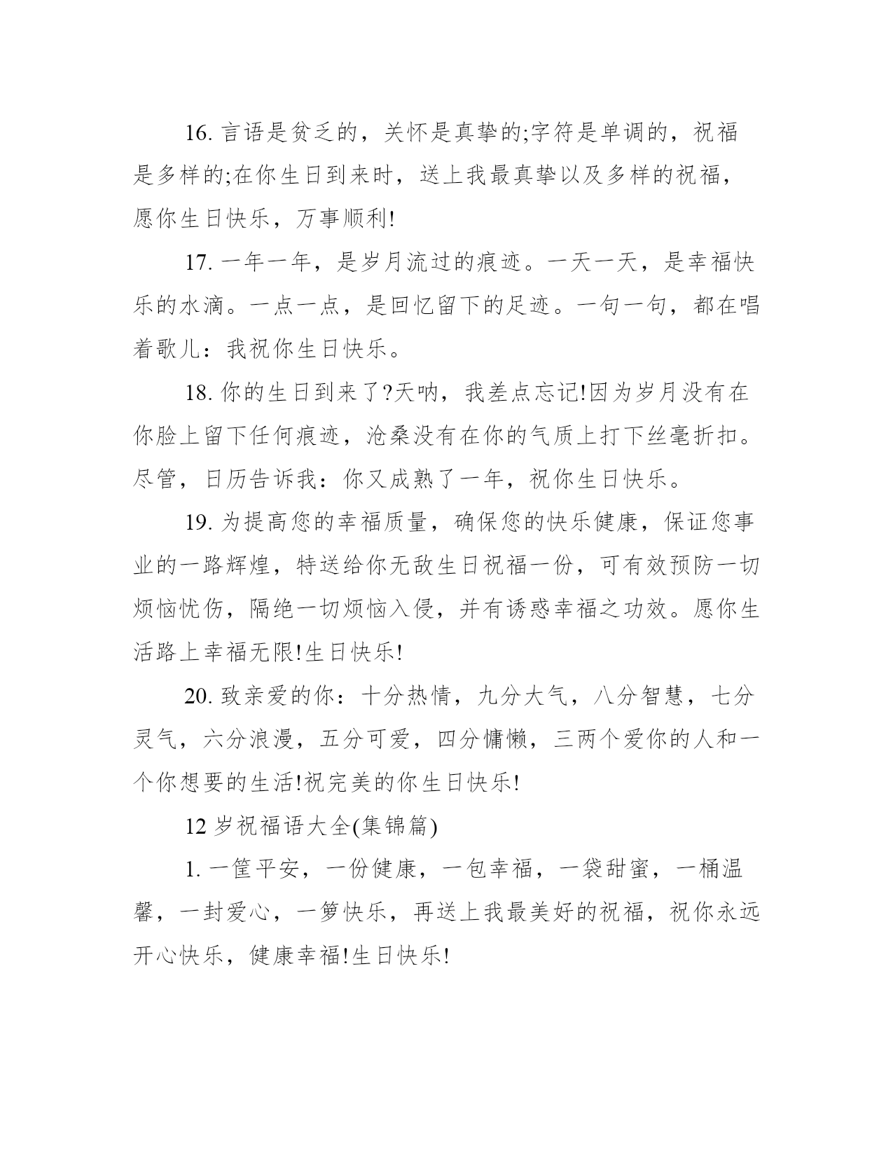 12岁祝福语大全12岁的生日是一个值得纪念的日子。那么12岁祝福语大全有哪些呢?由小编来告诉大家,欢迎阅。12岁祝福语大全(精选篇)1.难忘是你我纯洁的友情!可贵是永远不变的真情!高兴是能认识你!献上我最爱的康乃馨,祝你生日快乐2.静静的,请接受我的祝福,我把深深的幸福给你,春天的风都飘着我的思念,把我最甜蜜的梦给你,春天的星光无比灿烂,愿你拥有一个快乐幸福的春天!生日快乐!3.用我一颗真诚的心,用我一段真诚的时间,化作珍珠装点的你容颜,化作蝴蝶装扮你的时间,化作玫瑰装饰你的春天,亲爱的朋友,生日快乐。4.愿祝福萦绕着你,在你缤纷的人生之旅,在你永远与春天接壤的梦幻里。祝你:心想事成幸福快乐!生日快乐!5.带着亲情思念,跨越万水千山,祝贺你的生日,愿你开心每一天!笑开你的双眼,笑欢你的双腿,笑出你的灿烂,笑出你的动人,笑出人间是春天!6.满天星,我为你种下,给你春天的温暖,满天星,我为你摘下,给你晴朗的美好,满天星,我为你点燃,给你生日的祝福,朋友,祝你有个灿烂的明天,生日快乐。祝福语大全:星星守护着月亮,所以月亮睡的安详,温暖守护着春天,所以春天笑得灿烂,我守护着你,所以希望你一辈子都快快乐乐,亲爱的,生日快乐。7.我把春风织成一块温暖的毯子送给你,将幸福包住。我把春雨编成一条梦幻的丝带送给你,把快乐缠住。我把春天挂满祝福送给你,让美好留住!祝你生日快乐!8.抓一把春风,佛去你的疲惫,摘一朵春花,带给你红花般灿烂的笑脸。采一缕春光,照耀你全身,保佑你平安。借一场春雨滋润你,带给你一生好运!生日快乐!9.你是春天的花朵,你是美丽的使者,你是珍贵的神奇!祝聪明的你生日快乐!祝活泼的你生日快乐!祝潇洒的你生日快乐!10.好友如梦似幻,日夜兼程思念,亲朋血脉相连,话语滋润心田,知音一生有缘,牵手幸福永远,挚爱看雨听蝉,开心快乐无边,知己晓得冷暖,经常相互惦念,我心与你相牵,送你灿烂心愿,祝你生日圆满,谱写壮丽诗篇!12岁祝福语大全(推荐篇)1.工作可以不做,但是心灵不可以寂寞;生活可以不甜,但是笑容不可以间断;朋友可以不见,但是生日不忘记连线;祝你幸福好运连,生日快乐到永远!2.生活的意义在于平淡不惊,日久的意义在于见得真情,快乐的意义在于烦恼扫净,乐融融的意义在于有你就行。每句首字相连,就是我对你的祝福!3.时间像是一砖一瓦,建造着我们每个人的生活,快乐像是绚丽多彩,装潢着我们每个人的生命,祝你的生活温馨甜蜜,生日快乐。4.我的信息是法宝,收到艳阳高高照,快乐抓紧向你靠,幸福急着来报到,吉祥哪也不敢跑,财神马上将你抱,齐声向你问声好,祝你生日快乐乐逍遥!5.一分真情,一分美丽,一分健康,一分快乐,一分平安,一分甜蜜,一分幸福,一分好运。八分的美妙,为你做成好运蛋糕。祝你生日快乐,福气满满。6.饭菜要一口一口吃,日子要一天一天过,成长要一点一点积累,幸福要一点一点感悟。希望你能够在平凡的生活中收获不平凡的幸福!生日快乐!7.美妙在今日,欢乐在今时,福运都聚齐,笑语欢声起,电波秒万里,已到眼前矣,打开手机时,愿你心欢喜,你能心欢娱,我心就足矣,祝你生日快乐。8.长长的距离,远远的路;长长的时间,挂念止不住。情深的我送上深情的祝福,祝你生日快乐开心舒服,愿你鸿运财运找你投宿,生活美满永远幸福!9.翻开时间的日记,你在最美的回忆,我用祝福为你折叠幸福的标记;打开时间的隧道,你在最美的等待,我用祝福为你守候快乐的意义,生日快乐!10.送你一块大蛋糕,祝福短信随声到。左写福如东海水,右写寿比南山松。上写幸福常伴你左右,下写快乐一生永相随。快点吃吧!生日快乐!11.[生]来即胜白花芳,[日]洒金光满院香。[快]意时时前后伴,[乐]融富贵进门窗。现在他乡的我给予你最真挚的祝福:祝你生日快乐!在新的一年里万事如意。12.送你一份温馨,两份问候,三份美好,四份懵懂,五份高贵,六份前程,七份典雅,八份柔情,九份财运,十份真诚。生日快乐!13.今天你生日,日月同光辉,今天你幸福,全世界都祝福,今天你快乐,笑声传遍大江南北,不要怀疑,在我的世界里你的影响力就是这么大,生日快乐。14.一碗长寿面,祝你健康好,两个红鸡蛋,祝你福气多,三盏贺生酒,祝你禄常有,福禄寿全齐,人生又走一步棋,祝你生日快乐!15.人走千里感情在,水流长江为在海,朋友不见朋友面,日日夜夜心中念,青松不是花盆栽,友谊不是金钱买,只要朋友有心在,风吹浪打分不开。生日快乐。16.言语是贫乏的,关怀是真挚的;字符是单调的,祝福是多样的;在你生日到来时,送上我最真挚以及多样的祝福,愿你生日快乐,万事顺利!17.一年一年,是岁月流过的痕迹。一天一天,是幸福快乐的水滴。一点一点,是回忆留下的足迹。一句一句,都在唱着歌儿:我祝你生日快乐。18.你的生日到来了?天呐,我差点忘记!因为岁月没有在你脸上留下任