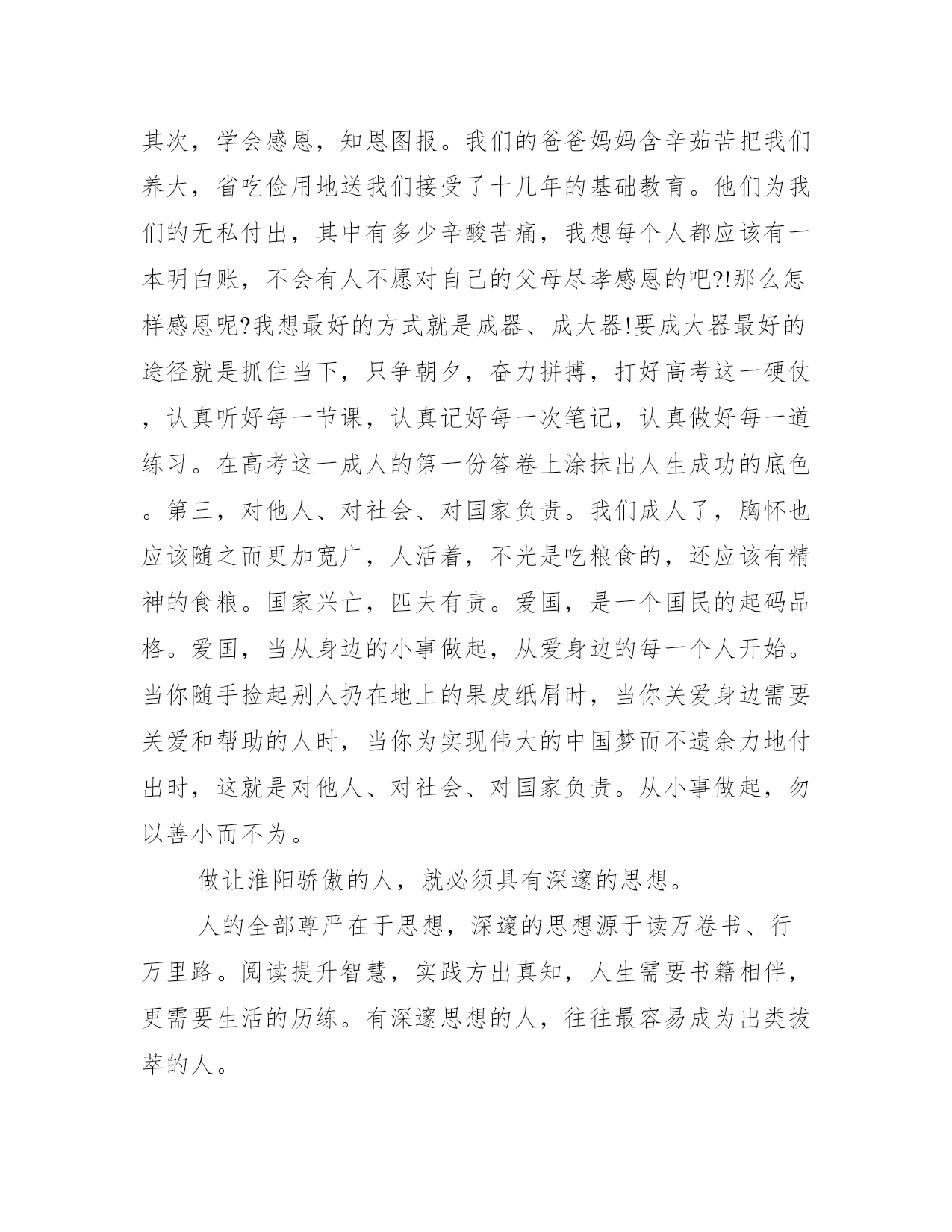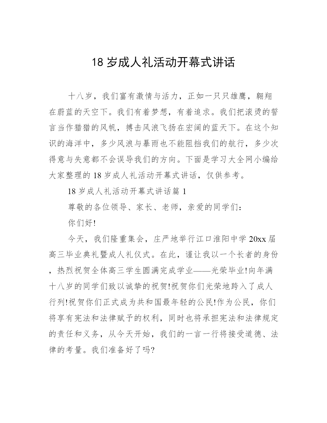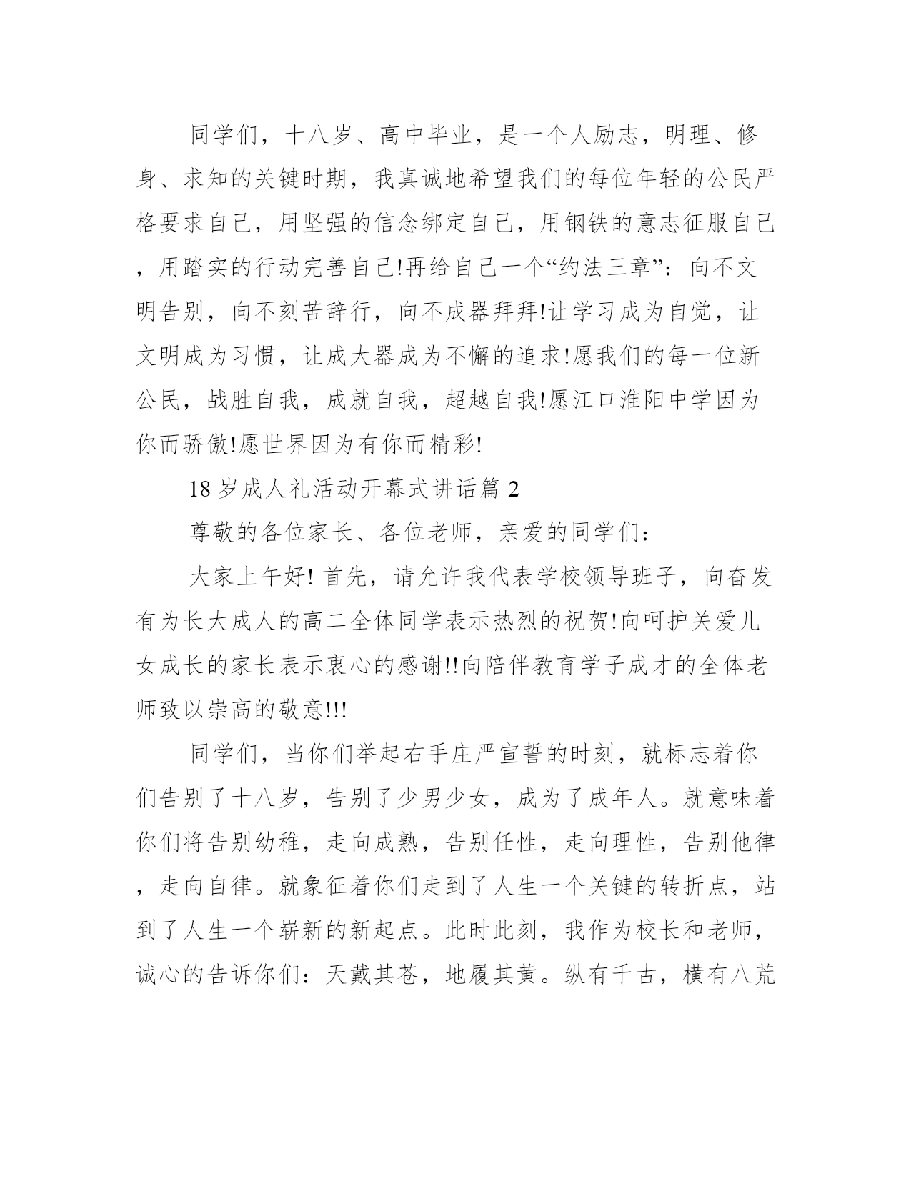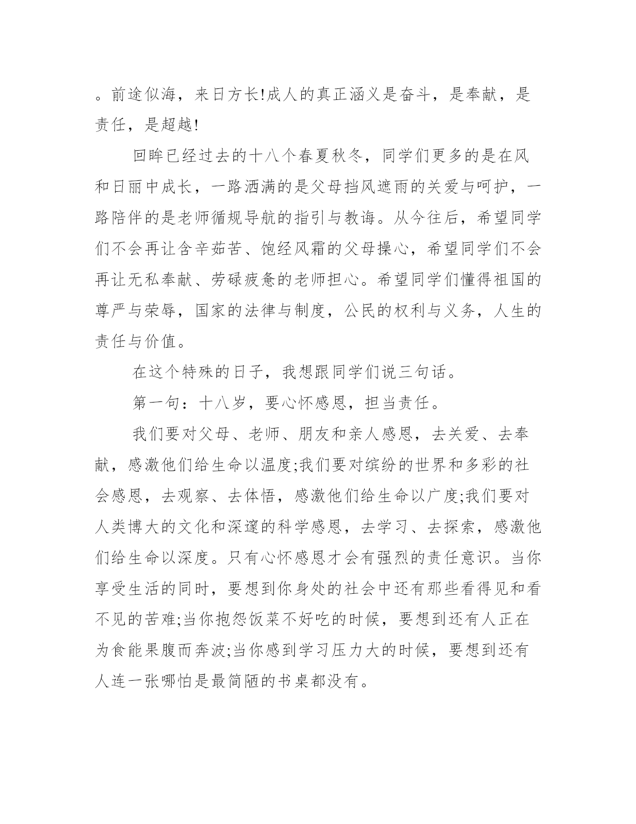 18岁成人礼活动开幕式讲话十八岁,我们富有激情与活力,正如一只只雄鹰,翱翔在蔚蓝的天空下。我们有着梦想,有着追求。我们把滚烫的誓言当作猎猎的风帆,搏击风浪飞扬在宏阔的蓝天下。在这个知识的海洋中,多少风浪与暴雨也不能阻挡我们的航行,多少次得意与失意都不会误导我们的方向。下面是学习大全网小编给大家整理的18岁成人礼活动开幕式讲话,仅供参考。18岁成人礼活动开幕式讲话篇1尊敬的各位领导、家长、老师,亲爱的同学们:你们好!今天,我们隆重集会,庄严地举行江口淮阳中学20xx届高三毕业典礼暨成人礼仪式。在此,谨让我以一个长者的身份,热烈祝贺全体高三学生圆满完成学业——光荣毕业!向年满十八岁的同学们致以诚挚的祝贺!祝贺你们光荣地跨入了成人行列!祝贺你们正式成为共和国最年轻的公民!作为公民,你们将享有宪法和法律赋予的权利,同时也将承担宪法和法律规定的责任和义务,从今天开始,我们的一言一行将接受道德、法律的考量。我们准备好了吗?同学们,作为打上了深深淮阳烙印的淮阳人,作为共和国薪火相传的接力者,我们今后应该成为怎样的人呢?我以为,做让淮阳骄傲的人——成就最美的自己,才是最好的回答。那么怎样“做让淮阳骄傲的人”呢?做让淮阳骄傲的人,就要具备淮阳精神。淮阳精神就是“满怀信心、开拓创新、诚实守信、坚忍不拔、自我超越、居安思危。”就是“和为贵、礼为先、德为本、信为道。”淮阳精神有什么特点呢?她的特点是正气、锐气、大气。立足于人世须有正气,唯有正气,方能在人生路上诚实守信、满怀信心、有一份坚守、开拓创新;立足于人世须有锐气,唯有锐气,方能坚忍不拔、永葆青春活力,胜不骄,败不馁;立足于人世,须有大气,唯有大气,方能目光远大,居安思危,不拘一时一事一己的得失,实现自我超越。做让淮阳骄傲的人,就要敢于担当。责任心,是健康人格的核心,它可以激发我们的勇气和斗志,它可以助人成就辉煌的人生。当我们举起右手庄严宣誓的时候,就意味着我们将实现从需要关怀到应当承担责任的重大转变。责任意识将时刻伴随着我们。所谓责任意识,按我的理解,首先,就是我们十八岁了,我们的一举一动、一言一行应该符合道德和法律的要求,尤其是在当今文化多元、价值多元的时代里,更需要我们修一等美德,自强不息、厚德载物。其次,学会感恩,知恩图报。我们的爸爸妈妈含辛茹苦把我们养大,省吃俭用地送我们接受了十几年的基础教育。他们为我们的无私付出,其中有多少辛酸苦痛,我想每个人都应该有一本明白账,不会有人不愿对自己的父母尽孝感恩的吧?!那么怎样感恩呢?我想最好的方式就是成器、成大器!要成大器最好的途径就是抓住当下,只争朝夕,奋力拼搏,打好高考这一硬仗,认真听好每一节课,认真记好每一次笔记,认真做好每一道练习。在高考这一成人的第一份答卷上涂抹出人生成功的底色。第三,对他人、对社会、对国家负责。我们成人了,胸怀也应该随之而更加宽广,人活着,不光是吃粮食的,还应该有精神的食粮。国家兴亡,匹夫有责。爱国,是一个国民的起码品格。爱国,当从身边的小事做起,从爱身边的每一个人开始。当你随手捡起别人扔在地上的果皮纸屑时,当你关爱身边需要关爱和帮助的人时,当你为实现伟大的中国梦而不遗余力地付出时,这就是对他人、对社会、对国家负责。从小事做起,勿以善小而不为。做让淮阳骄傲的人,就必须具有深邃的思想。人的全部尊严在于思想,深邃的思想源于读万卷书、行万里路。阅读提升智慧,实践方出真知,人生需要书籍相伴,更需要生活的历练。有深邃思想的人,往往最容易成为出类拔萃的人。同学们,十八岁、高中毕业,是一个人励志,明理、修身、求知的关键时期,我真诚地希望我们的每位年轻的公民严格要求自己,用坚强的信念绑定自己,用钢铁的意志征服自己,用踏实的行动完善自己!再给自己一个“约法三章”:向不文明告别,向不刻苦辞行,向不成器拜拜!让学习成为自觉,让文明成为习惯,让成大器成为不懈的追求!愿我们的每一位新公民,战胜自我,成就自我,超越自我!愿江口淮阳中学因为你而骄傲!愿世界因为有你而精彩!18岁成人礼活动开幕式讲话篇2尊敬的各位家长、各位老师,亲爱的同学们:大家上午好!首先,请允许我代表学校领导班子,向奋发有为长大成人的高二全体同学表示热烈的祝贺!向呵护关爱儿女成长的家长表示衷心的感谢!!向陪伴教育学子成才的全体老师致以崇高的敬意!!!同学们,当你们举起右手庄严宣誓的时刻,就标志着你们告别了十八岁,告别了少男少女,成为了成年人。就意味着你们将告别幼稚,走向成熟,告别任性,走向理性,告别他律,走向自律。就象征着你们走到了人生一个关键的转折点,站到了人生一个崭新的新起点。此时此刻,我作为校长和老师,诚心的告诉你们:天戴其苍,地履其黄。纵有千古,横有八荒。前途似海,来日方长!成人的真正涵义是奋斗,是奉献,是责任,是超越!回眸已经过去的十八个春夏秋冬,同学们更多的是在风和日丽