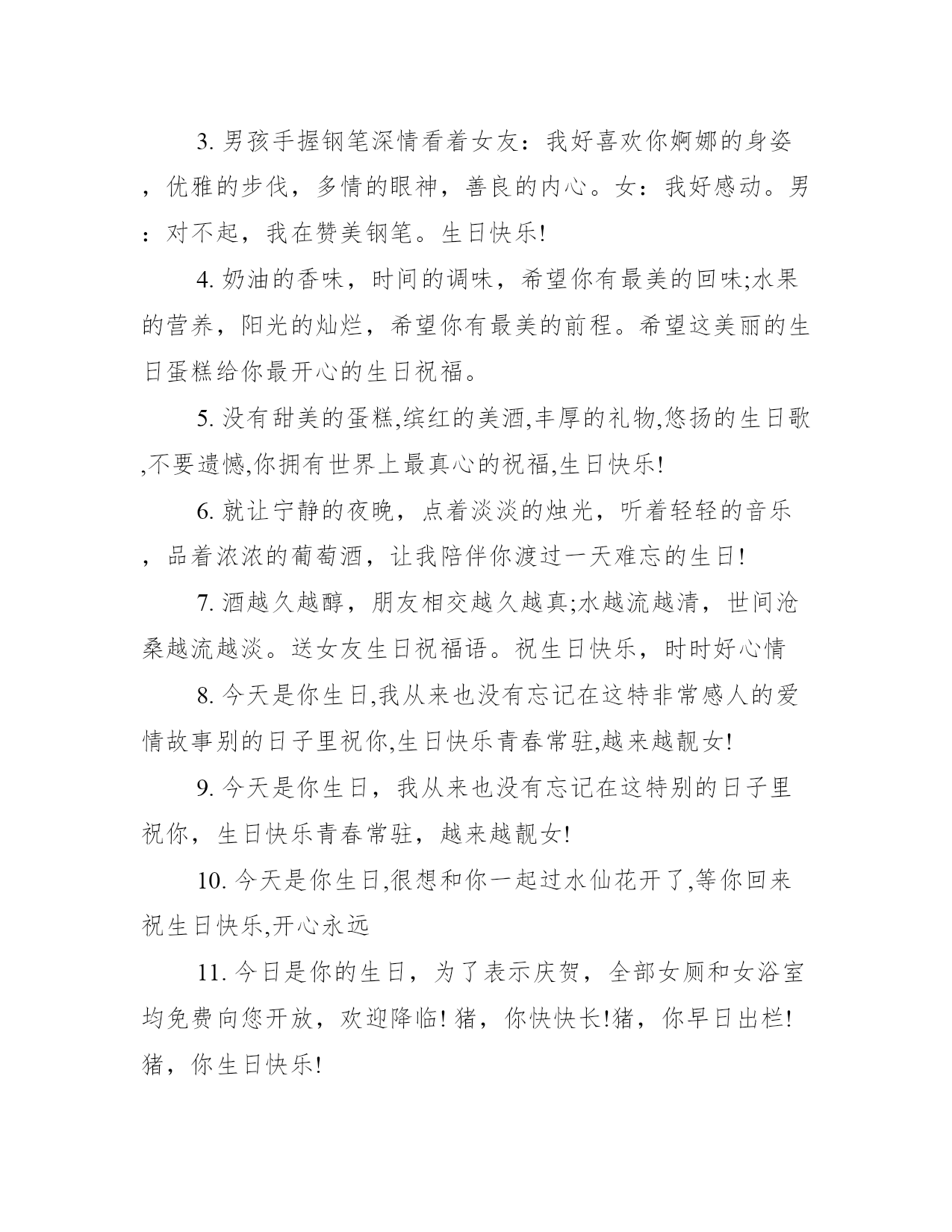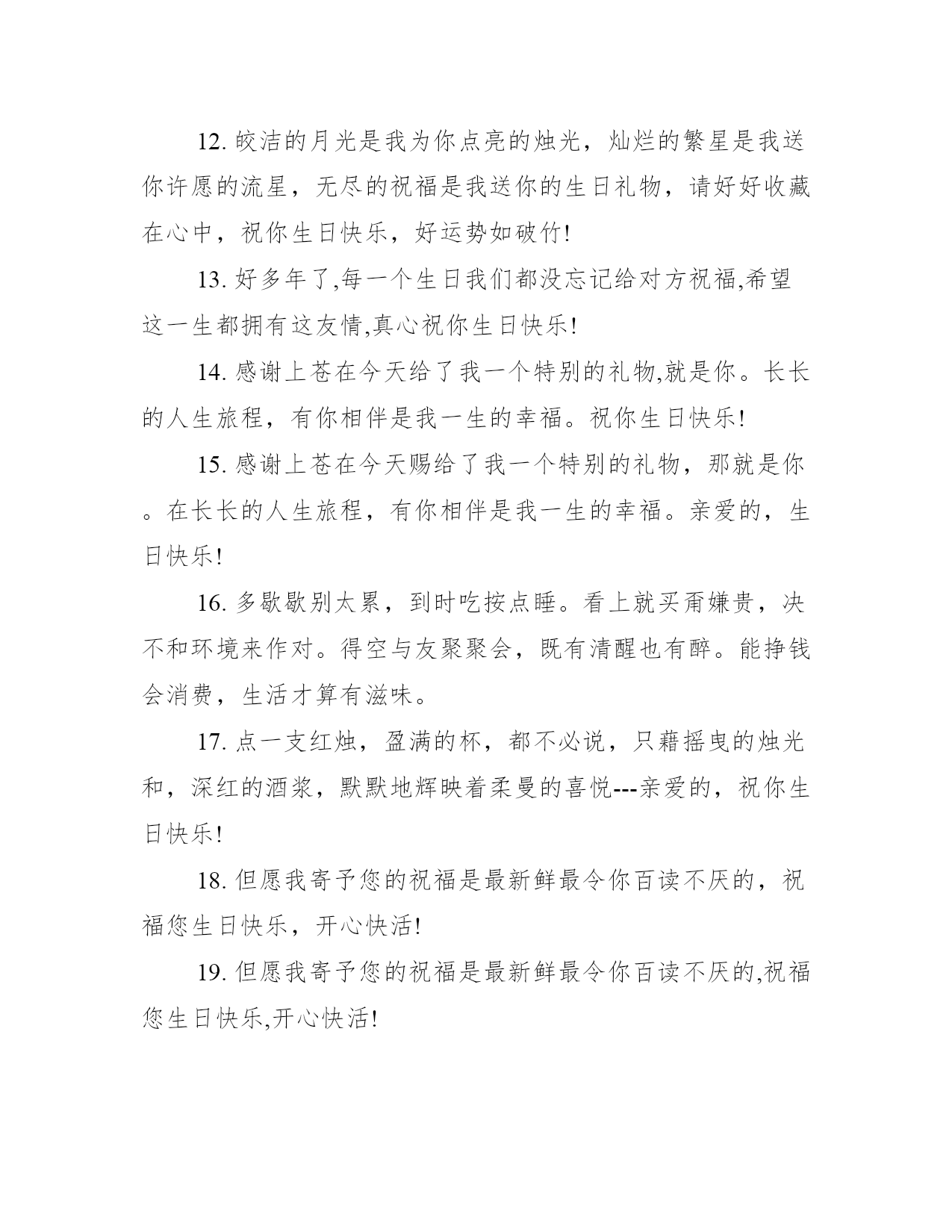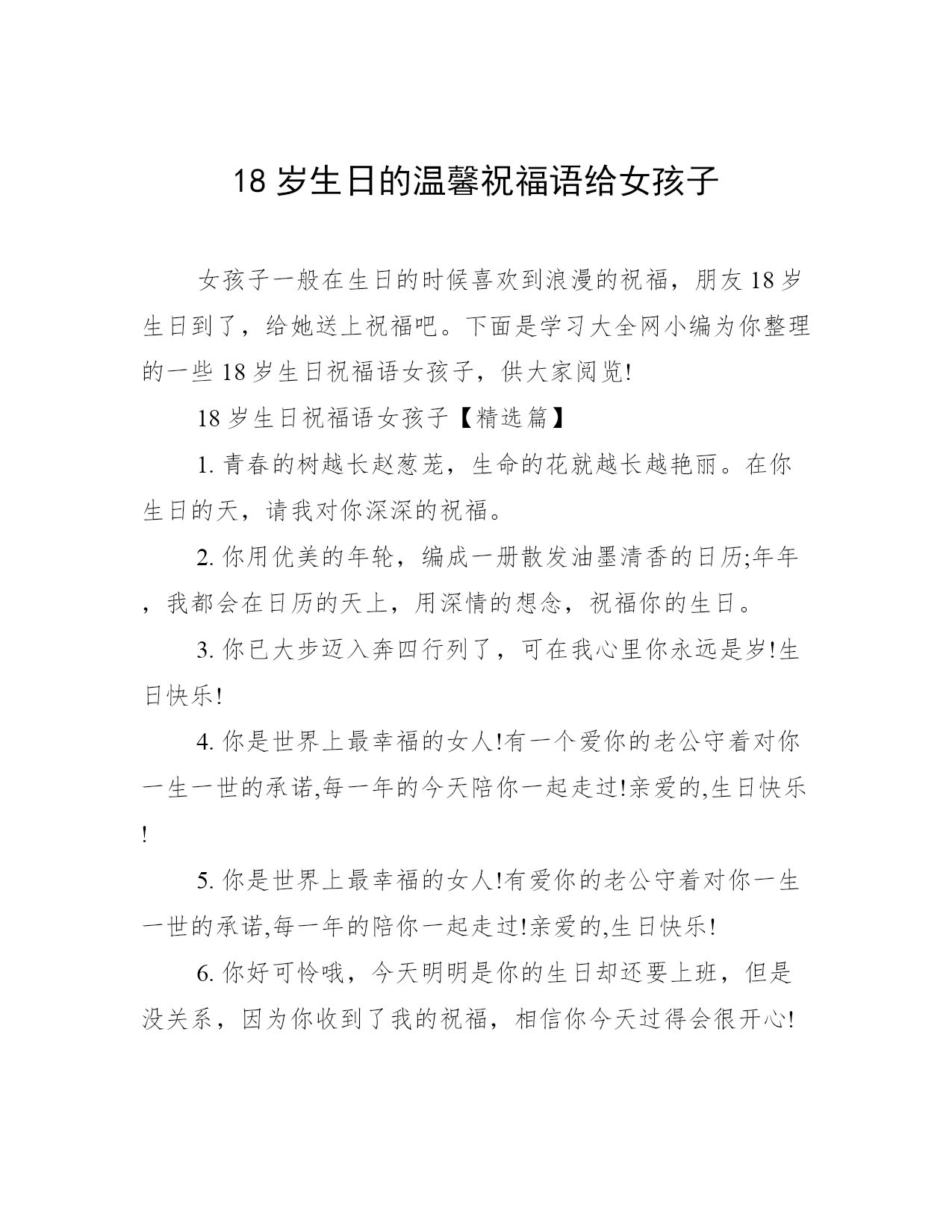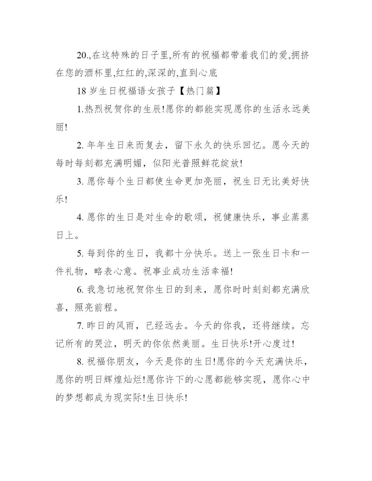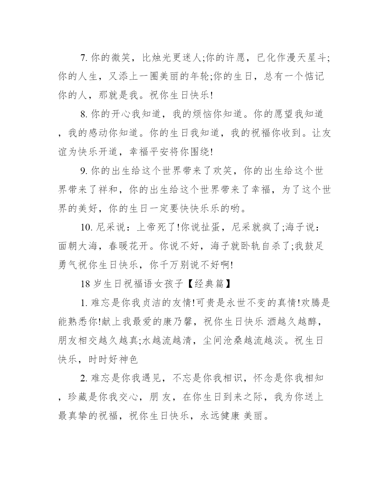 18岁生日的温馨祝福语给女孩子女孩子一般在生日的时候喜欢到浪漫的祝福,朋友18岁生日到了,给她送上祝福吧。下面是学习大全网小编为你整理的一些18岁生日祝福语女孩子,供大家阅览!18岁生日祝福语女孩子【精选篇】1.青春的树越长赵葱茏,生命的花就越长越艳丽。在你生日的天,请我对你深深的祝福。2.你用优美的年轮,编成一册散发油墨清香的日历;年年,我都会在日历的天上,用深情的想念,祝福你的生日。3.你已大步迈入奔四行列了,可在我心里你永远是岁!生日快乐!4.你是世界上最幸福的女人!有一个爱你的老公守着对你一生一世的承诺,每一年的今天陪你一起走过!亲爱的,生日快乐!5.你是世界上最幸福的女人!有爱你的老公守着对你一生一世的承诺,每一年的陪你一起走过!亲爱的,生日快乐!6.你好可怜哦,今天明明是你的生日却还要上班,但是没关系,因为你收到了我的祝福,相信你今天过得会很开心!7.你的微笑,比烛光更迷人;你的许愿,已化作漫天星斗;你的人生,又添上一圈美丽的年轮;你的生日,总有一个惦记你的人,那就是我。祝你生日快乐!8.你的开心我知道,我的烦恼你知道。你的愿望我知道,我的感动你知道。你的生日我知道,我的祝福你收到。让友谊为快乐开道,幸福平安将你围绕!9.你的出生给这个世界带来了欢笑,你的出生给这个世界带来了祥和,你的出生给这个世界带来了幸福,为了这个世界的美好,你的生日一定要快快乐乐的哟。10.尼采说:上帝死了!你说扯蛋,尼采就疯了;海子说:面朝大海,春暖花开。你说不好,海子就卧轨自杀了;我鼓足勇气祝你生日快乐,你千万别说不好啊!18岁生日祝福语女孩子【经典篇】1.难忘是你我贞洁的友情!可贵是永世不变的真情!欢腾是能熟悉你!献上我最爱的康乃馨,祝你生日快乐酒越久越醇,朋友相交越久越真;水越流越清,尘间沧桑越流越淡。祝生日快乐,时时好神色2.难忘是你我遇见,不忘是你我相识,怀念是你我相知,珍藏是你我交心,朋友,在你生日到来之际,我为你送上最真挚的祝福,祝你生日快乐,永远健康美丽。3.男孩手握钢笔深情看着女友:我好喜欢你婀娜的身姿,优雅的步伐,多情的眼神,善良的内心。女:我好感动。男:对不起,我在赞美钢笔。生日快乐!4.奶油的香味,时间的调味,希望你有最美的回味;水果的营养,阳光的灿烂,希望你有最美的前程。希望这美丽的生日蛋糕给你最开心的生日祝福。5.没有甜美的蛋糕,缤红的美酒,丰厚的礼物,悠扬的生日歌,不要遗憾,你拥有世界上最真心的祝福,生日快乐!6.就让宁静的夜晚,点着淡淡的烛光,听着轻轻的音乐,品着浓浓的葡萄酒,让我陪伴你渡过一天难忘的生日!7.酒越久越醇,朋友相交越久越真;水越流越清,世间沧桑越流越淡。送女友生日祝福语。祝生日快乐,时时好心情8.今天是你生日,我从来也没有忘记在这特非常感人的爱情故事别的日子里祝你,生日快乐青春常驻,越来越靓女!9.今天是你生日,我从来也没有忘记在这特别的日子里祝你,生日快乐青春常驻,越来越靓女!10.今天是你生日,很想和你一起过水仙花开了,等你回来祝生日快乐,开心永远11.今日是你的生日,为了表示庆贺,全部女厕和女浴室均免费向您开放,欢迎降临!猪,你快快长!猪,你早日出栏!猪,你生日快乐!12.皎洁的月光是我为你点亮的烛光,灿烂的繁星是我送你许愿的流星,无尽的祝福是我送你的生日礼物,请好好收藏在心中,祝你生日快乐,好运势如破竹!13.好多年了,每一个生日我们都没忘记给对方祝福,希望这一生都拥有这友情,真心祝你生日快乐!14.感谢上苍在今天给了我一个特别的礼物,就是你。长长的人生旅程,有你相伴是我一生的幸福。祝你生日快乐!15.感谢上苍在今天赐给了我一个特别的礼物,那就是你。在长长的人生旅程,有你相伴是我一生的幸福。亲爱的,生日快乐!16.多歇歇别太累,到时吃按点睡。看上就买甭嫌贵,决不和环境来作对。得空与友聚聚会,既有清醒也有醉。能挣钱会消费,生活才算有滋味。17.点一支红烛,盈满的杯,都不必说,只藉摇曳的烛光和,深红的酒浆,默默地辉映着柔曼的喜悦---亲爱的,祝你生日快乐!18.但愿我寄予您的祝福是最新鲜最令你百读不厌的,祝福您生日快乐,开心快活!19.但愿我寄予您的祝福是最新鲜最令你百读不厌的,祝福您生日快乐,开心快活!20.,在这特殊的日子里,所有的祝福都带着我们的爱,拥挤在您的酒杯里,红红的,深深的,直到心底18岁生日祝福语女孩子【热门篇】1.热烈祝贺你的生辰!愿你的都能实现愿你的生活永远美丽!2.年年生日来而复去,留下永久的快乐回忆。愿今天的每时每刻都充满明媚,似阳光普照鲜花绽放!3.愿你每个生日都使生命更加亮丽,祝生日无比美好快乐!4.愿你的生日是对生命的歌颂,祝健康快乐,事业蒸蒸日上。5.每到你的生日,我都十分快乐。送上一张生日卡和一件礼物,略表心意。祝事业成功生活幸福!6.我急切地祝贺你生日的