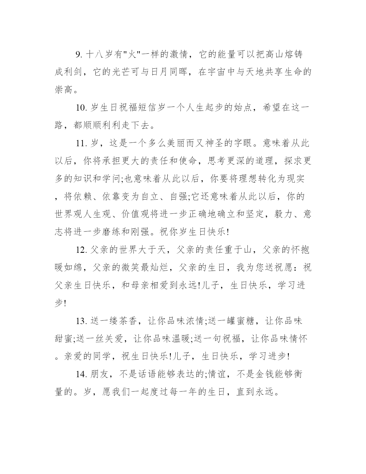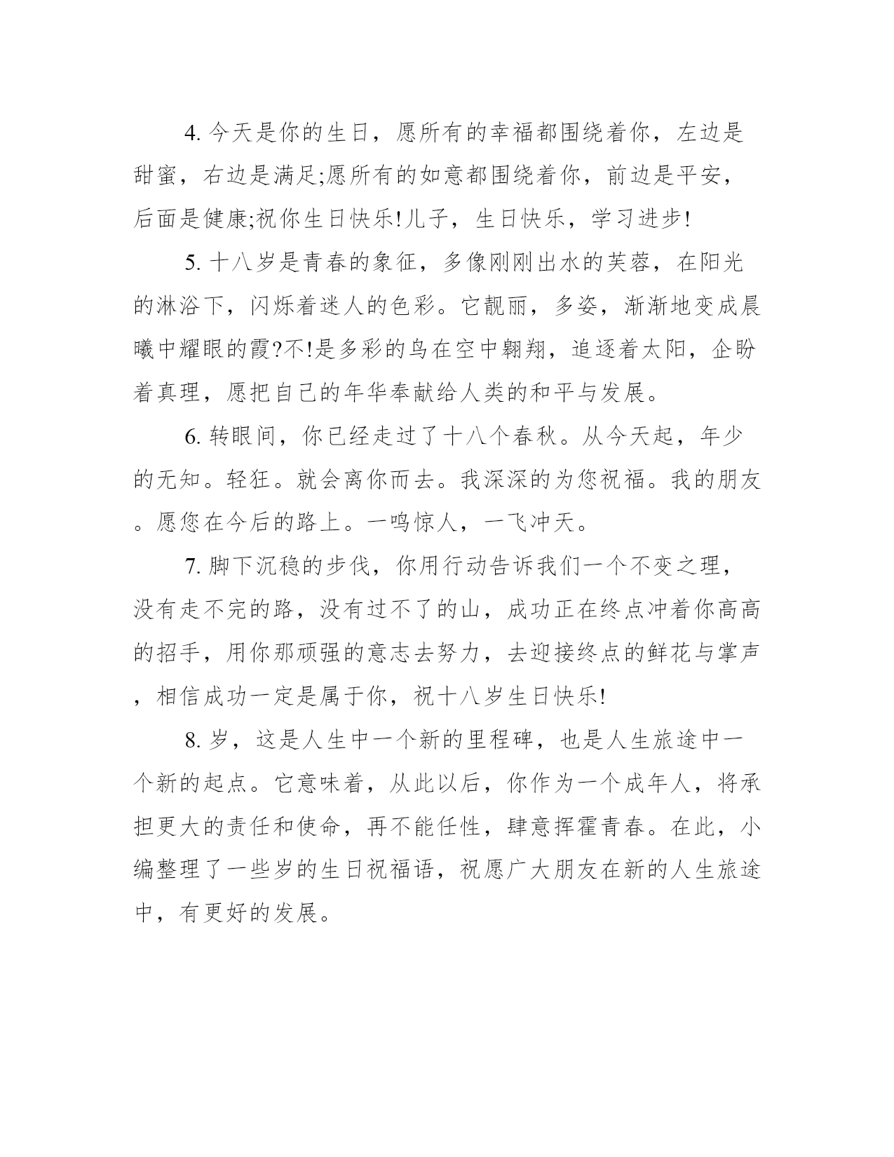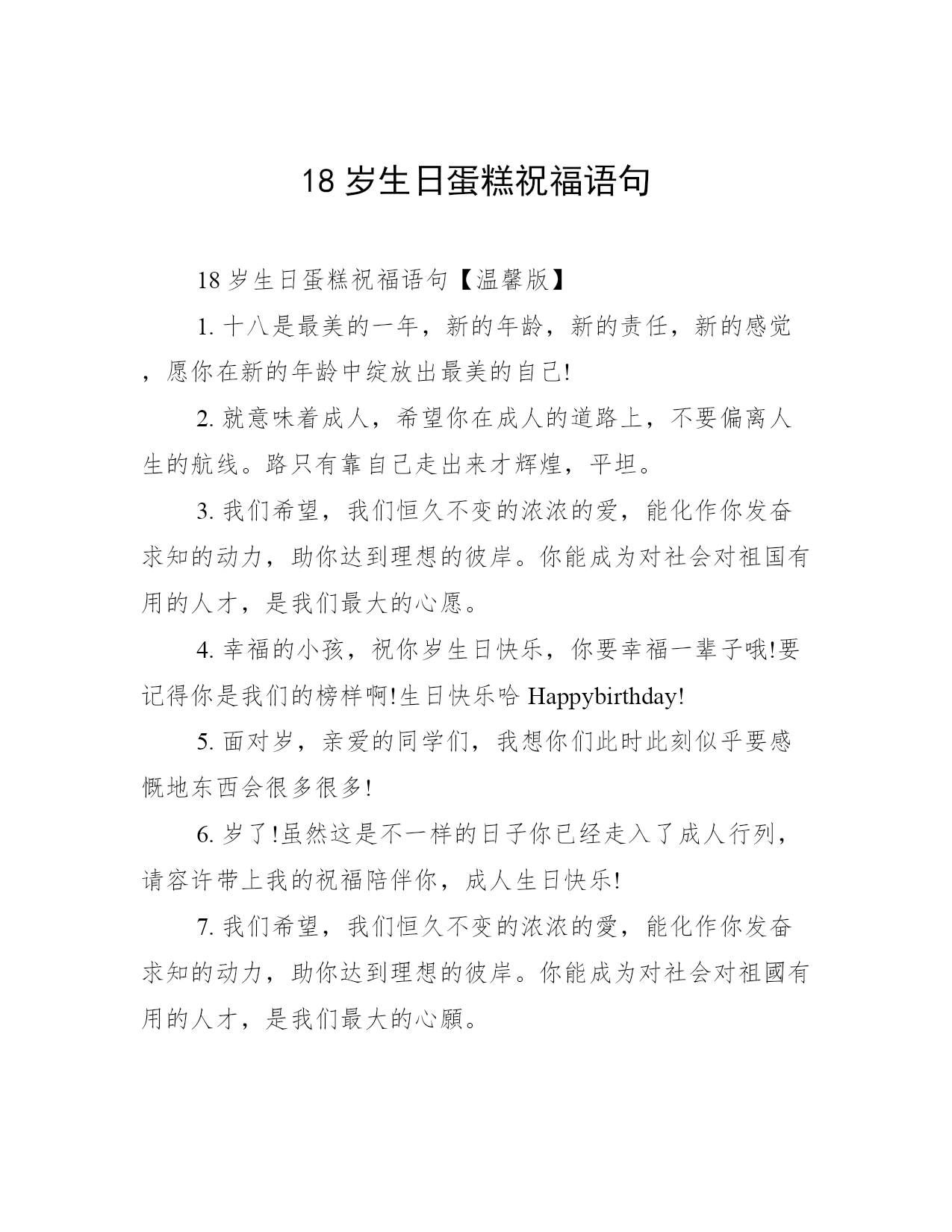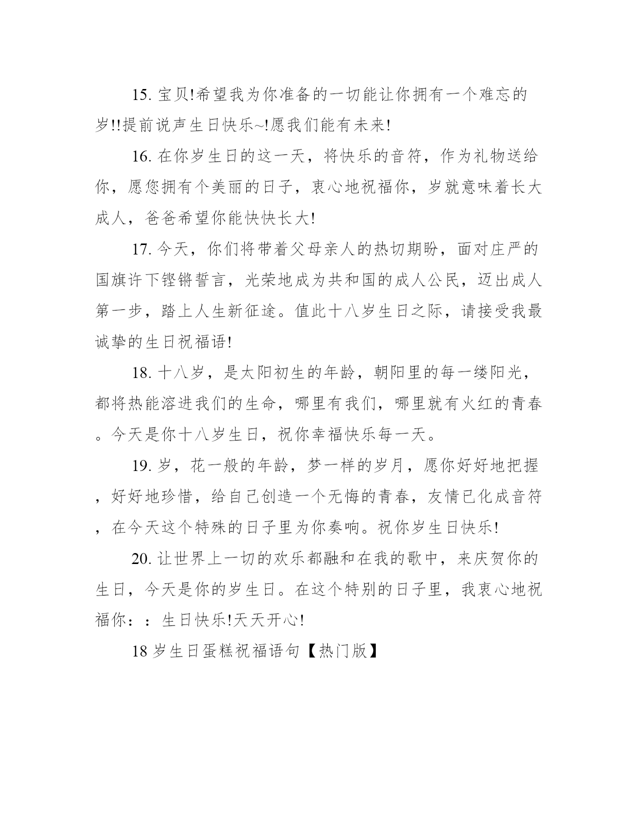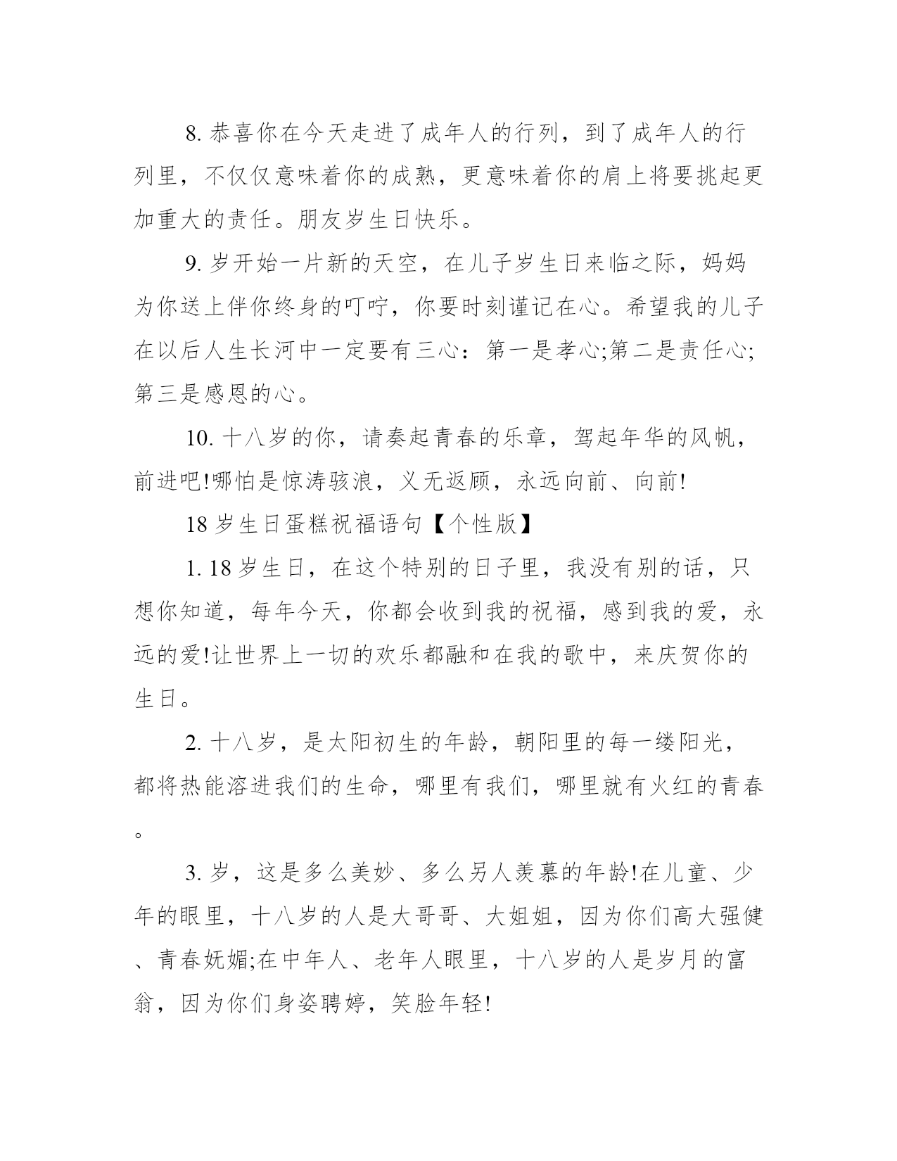 18岁生日蛋糕祝福语句18岁生日蛋糕祝福语句【温馨版】1.十八是最美的一年,新的年龄,新的责任,新的感觉,愿你在新的年龄中绽放出最美的自己!2.就意味着成人,希望你在成人的道路上,不要偏离人生的航线。路只有靠自己走出来才辉煌,平坦。3.我们希望,我们恒久不变的浓浓的爱,能化作你发奋求知的动力,助你达到理想的彼岸。你能成为对社会对祖国有用的人才,是我们最大的心愿。4.幸福的小孩,祝你岁生日快乐,你要幸福一辈子哦!要记得你是我们的榜样啊!生日快乐哈Happybirthday!5.面对岁,亲爱的同学们,我想你们此时此刻似乎要感慨地东西会很多很多!6.岁了!虽然这是不一样的日子你已经走入了成人行列,请容许带上我的祝福陪伴你,成人生日快乐!7.我们希望,我们恒久不变的浓浓的愛,能化作你发奋求知的动力,助你达到理想的彼岸。你能成为对社会对祖國有用的人才,是我们最大的心願。8.恭喜你在今天走进了成年人的行列,到了成年人的行列里,不仅仅意味着你的成熟,更意味着你的肩上将要挑起更加重大的责任。朋友岁生日快乐。9.岁开始一片新的天空,在儿子岁生日来临之际,妈妈为你送上伴你终身的叮咛,你要时刻谨记在心。希望我的儿子在以后人生长河中一定要有三心:第一是孝心;第二是责任心;第三是感恩的心。10.十八岁的你,请奏起青春的乐章,驾起年华的风帆,前进吧!哪怕是惊涛骇浪,义无返顾,永远向前、向前!18岁生日蛋糕祝福语句【个性版】1.18岁生日,在这个特别的日子里,我没有别的话,只想你知道,每年今天,你都会收到我的祝福,感到我的爱,永远的爱!让世界上一切的欢乐都融和在我的歌中,来庆贺你的生日。2.十八岁,是太阳初生的年龄,朝阳里的每一缕阳光,都将热能溶进我们的生命,哪里有我们,哪里就有火红的青春。3.岁,这是多么美妙、多么另人羡慕的年龄!在儿童、少年的眼里,十八岁的人是大哥哥、大姐姐,因为你们高大强健、青春妩媚;在中年人、老年人眼里,十八岁的人是岁月的富翁,因为你们身姿聘婷,笑脸年轻!4.今天是你的生日,愿所有的幸福都围绕着你,左边是甜蜜,右边是满足;愿所有的如意都围绕着你,前边是平安,后面是健康;祝你生日快乐!儿子,生日快乐,学习进步!5.十八岁是青春的象征,多像刚刚出水的芙蓉,在阳光的淋浴下,闪烁着迷人的色彩。它靓丽,多姿,渐渐地变成晨曦中耀眼的霞?不!是多彩的鸟在空中翱翔,追逐着太阳,企盼着真理,愿把自己的年华奉献给人类的和平与发展。6.转眼间,你已经走过了十八个春秋。从今天起,年少的无知。轻狂。就会离你而去。我深深的为您祝福。我的朋友。愿您在今后的路上。一鸣惊人,一飞冲天。7.脚下沉稳的步伐,你用行动告诉我们一个不变之理,没有走不完的路,没有过不了的山,成功正在终点冲着你高高的招手,用你那顽强的意志去努力,去迎接终点的鲜花与掌声,相信成功一定是属于你,祝十八岁生日快乐!8.岁,这是人生中一个新的里程碑,也是人生旅途中一个新的起点。它意味着,从此以后,你作为一个成年人,将承担更大的责任和使命,再不能任性,肆意挥霍青春。在此,小编整理了一些岁的生日祝福语,祝愿广大朋友在新的人生旅途中,有更好的发展。9.十八岁有"火"一样的激情,它的能量可以把高山熔铸成利剑,它的光芒可与日月同晖,在宇宙中与天地共享生命的崇高。10.岁生日祝福短信岁一个人生起步的始点,希望在这一路,都顺顺利利走下去。11.岁,这是一个多么美丽而又神圣的字眼。意味着从此以后,你将承担更大的责任和使命,思考更深的道理,探求更多的知识和学问;也意味着从此以后,你要将理想转化为现实,将依赖、依靠变为自立、自强;它还意味着从此以后,你的世界观人生观、价值观将进一步正确地确立和坚定,毅力、意志将进一步磨练和刚强。祝你岁生日快乐!12.父亲的世界大于天,父亲的责任重于山,父亲的怀抱暖如绵,父亲的微笑最灿烂,父亲的生日,我为您送祝愿:祝父亲生日快乐,和母亲相爱到永远!儿子,生日快乐,学习进步!13.送一缕茶香,让你品味浓情;送一罐蜜糖,让你品味甜蜜;送一丝关爱,让你品味温暖;送一句祝福,让你品味情怀。亲爱的同学,祝生日快乐!儿子,生日快乐,学习进步!14.朋友,不是话语能够表达的;情谊,不是金钱能够衡量的。岁,愿我们一起度过每一年的生日,直到永远。15.宝贝!希望我为你准备的一切能让你拥有一个难忘的岁!!提前说声生日快乐~!愿我们能有未来!16.在你岁生日的这一天,将快乐的音符,作为礼物送给你,愿您拥有个美丽的日子,衷心地祝福你,岁就意味着长大成人,爸爸希望你能快快长大!17.今天,你们将带着父母亲人的热切期盼,面对庄严的国旗许下铿锵誓言,光荣地成为共和国的成人公民,迈出成人第一步,踏上人生新征途。值此十八岁生日之际,请接受我最诚挚的生日祝福语!18.十八岁,是太阳初生的年龄,朝阳里的每一缕阳光,都将热能溶进