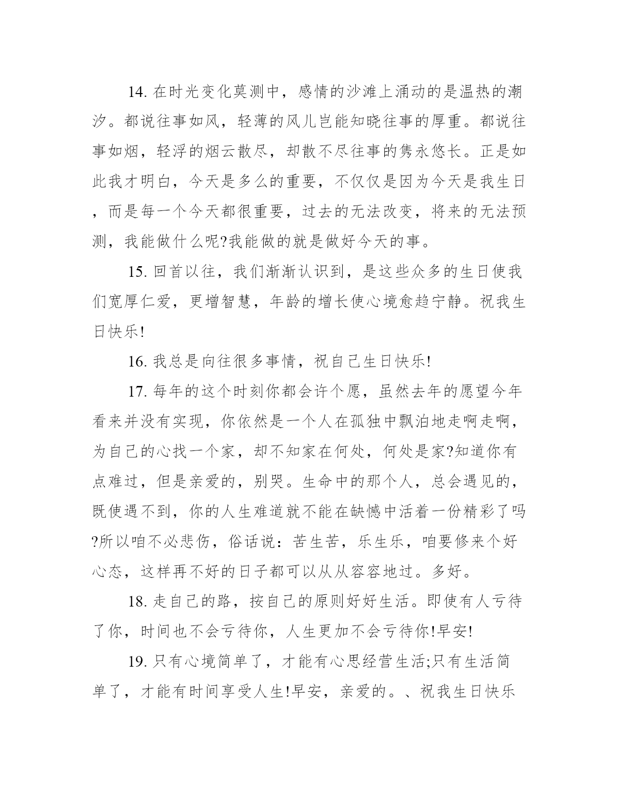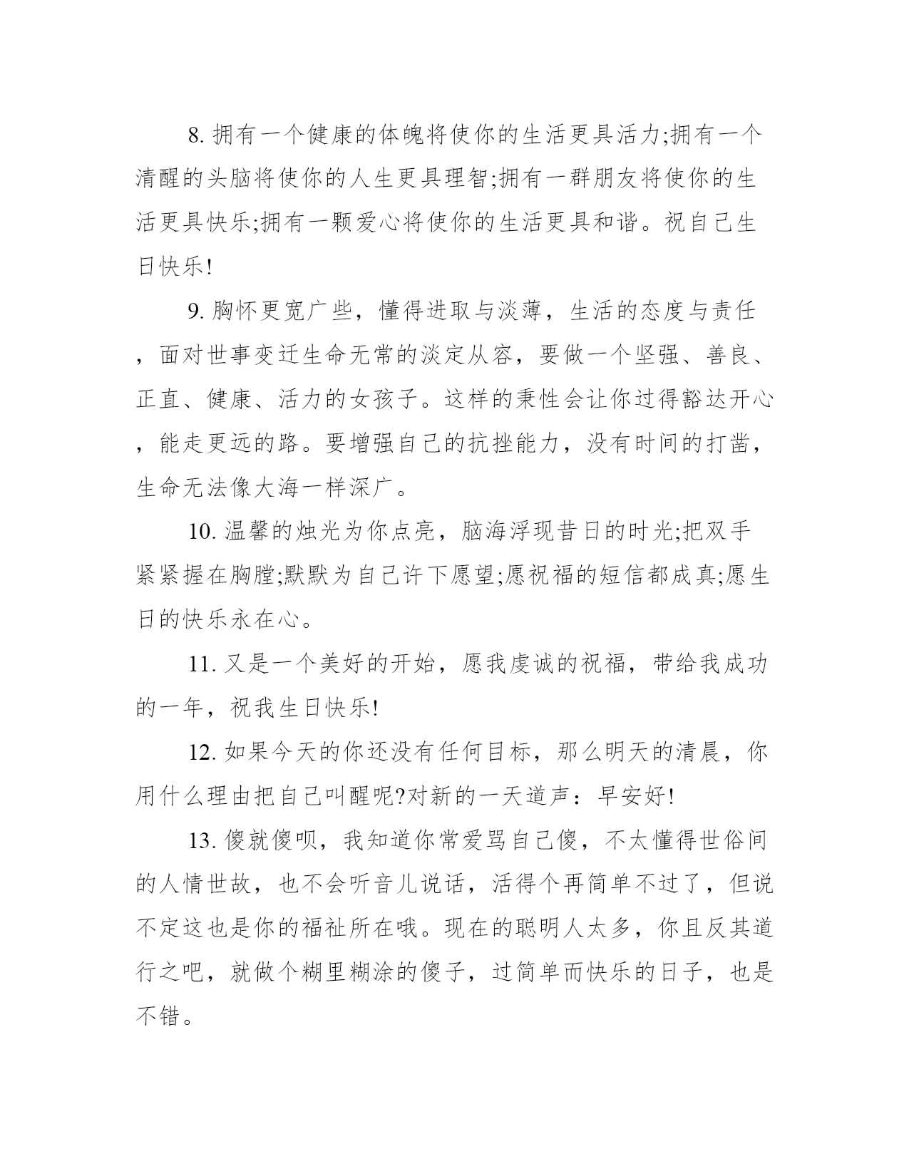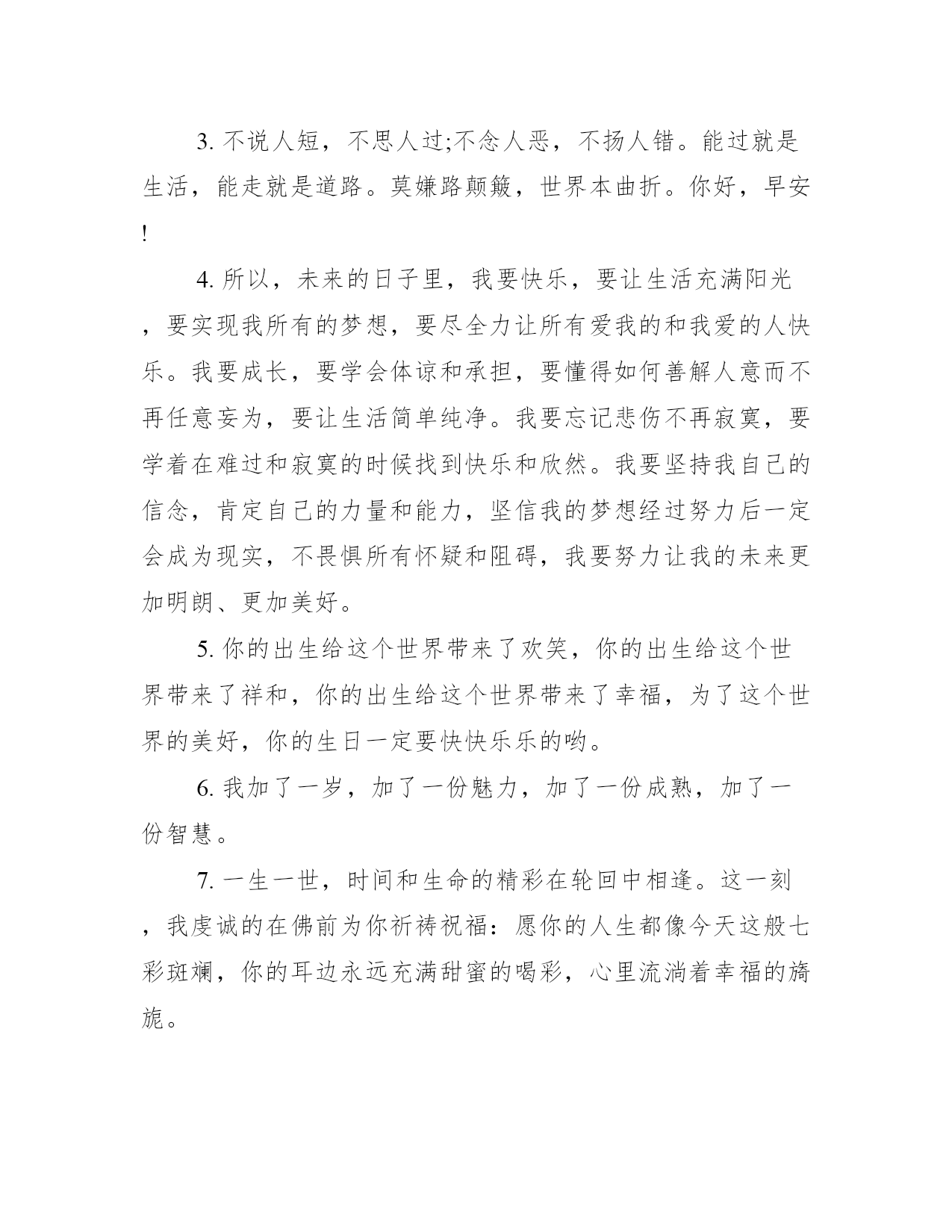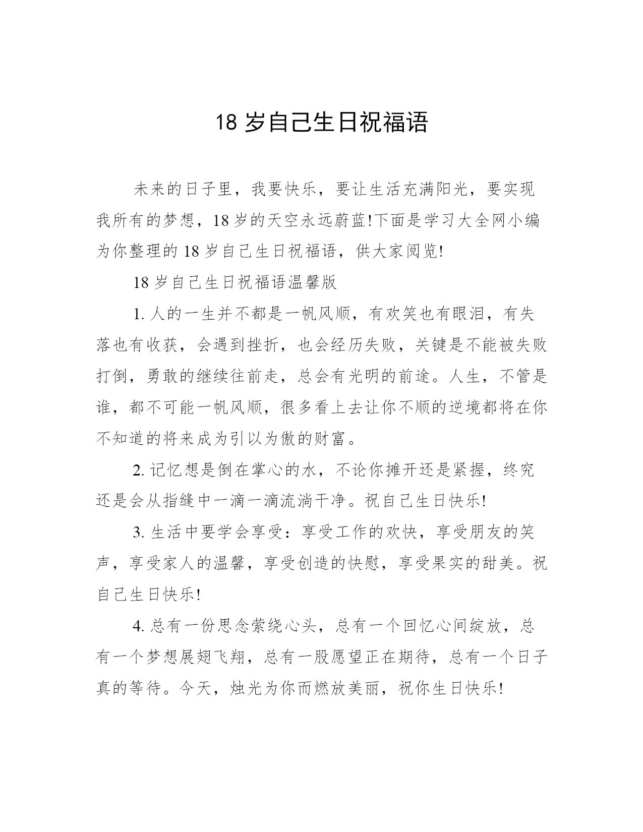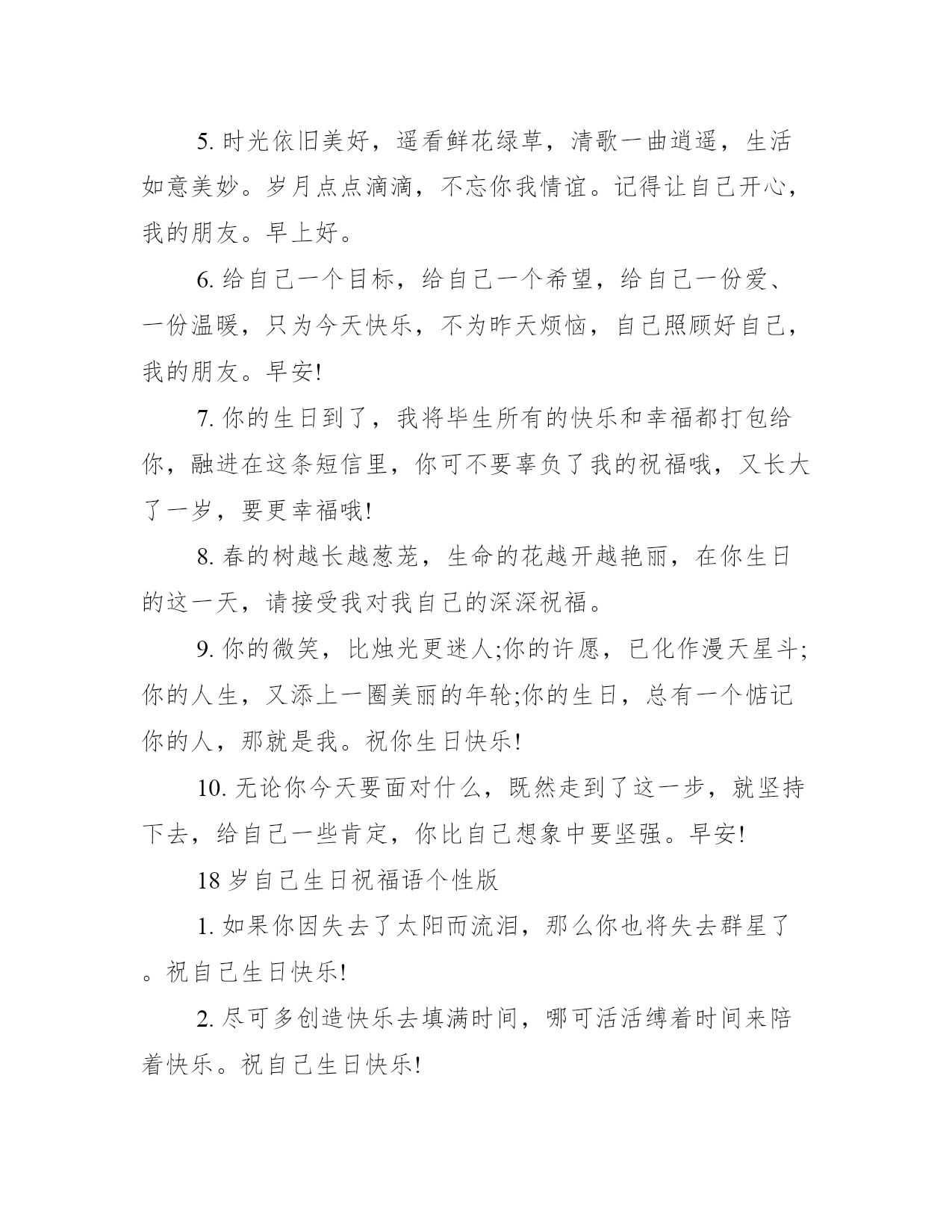 18岁自己生日祝福语未来的日子里,我要快乐,要让生活充满阳光,要实现我所有的梦想,18岁的天空永远蔚蓝!下面是学习大全网小编为你整理的18岁自己生日祝福语,供大家阅览!18岁自己生日祝福语温馨版1.人的一生并不都是一帆风顺,有欢笑也有眼泪,有失落也有收获,会遇到挫折,也会经历失败,关键是不能被失败打倒,勇敢的继续往前走,总会有光明的前途。人生,不管是谁,都不可能一帆风顺,很多看上去让你不顺的逆境都将在你不知道的将来成为引以为傲的财富。2.记忆想是倒在掌心的水,不论你摊开还是紧握,终究还是会从指缝中一滴一滴流淌干净。祝自己生日快乐!3.生活中要学会享受:享受工作的欢快,享受朋友的笑声,享受家人的温馨,享受创造的快慰,享受果实的甜美。祝自己生日快乐!4.总有一份思念萦绕心头,总有一个回忆心间绽放,总有一个梦想展翅飞翔,总有一股愿望正在期待,总有一个日子真的等待。今天,烛光为你而燃放美丽,祝你生日快乐!5.时光依旧美好,遥看鲜花绿草,清歌一曲逍遥,生活如意美妙。岁月点点滴滴,不忘你我情谊。记得让自己开心,我的朋友。早上好。6.给自己一个目标,给自己一个希望,给自己一份爱、一份温暖,只为今天快乐,不为昨天烦恼,自己照顾好自己,我的朋友。早安!7.你的生日到了,我将毕生所有的快乐和幸福都打包给你,融进在这条短信里,你可不要辜负了我的祝福哦,又长大了一岁,要更幸福哦!8.春的树越长越葱茏,生命的花越开越艳丽,在你生日的这一天,请接受我对我自己的深深祝福。9.你的微笑,比烛光更迷人;你的许愿,已化作漫天星斗;你的人生,又添上一圈美丽的年轮;你的生日,总有一个惦记你的人,那就是我。祝你生日快乐!10.无论你今天要面对什么,既然走到了这一步,就坚持下去,给自己一些肯定,你比自己想象中要坚强。早安!18岁自己生日祝福语个性版1.如果你因失去了太阳而流泪,那么你也将失去群星了。祝自己生日快乐!2.尽可多创造快乐去填满时间,哪可活活缚着时间来陪着快乐。祝自己生日快乐!3.不说人短,不思人过;不念人恶,不扬人错。能过就是生活,能走就是道路。莫嫌路颠簸,世界本曲折。你好,早安!4.所以,未来的日子里,我要快乐,要让生活充满阳光,要实现我所有的梦想,要尽全力让所有爱我的和我爱的人快乐。我要成长,要学会体谅和承担,要懂得如何善解人意而不再任意妄为,要让生活简单纯净。我要忘记悲伤不再寂寞,要学着在难过和寂寞的时候找到快乐和欣然。我要坚持我自己的信念,肯定自己的力量和能力,坚信我的梦想经过努力后一定会成为现实,不畏惧所有怀疑和阻碍,我要努力让我的未来更加明朗、更加美好。5.你的出生给这个世界带来了欢笑,你的出生给这个世界带来了祥和,你的出生给这个世界带来了幸福,为了这个世界的美好,你的生日一定要快快乐乐的哟。6.我加了一岁,加了一份魅力,加了一份成熟,加了一份智慧。7.一生一世,时间和生命的精彩在轮回中相逢。这一刻,我虔诚的在佛前为你祈祷祝福:愿你的人生都像今天这般七彩斑斓,你的耳边永远充满甜蜜的喝彩,心里流淌着幸福的旖旎。8.拥有一个健康的体魄将使你的生活更具活力;拥有一个清醒的头脑将使你的人生更具理智;拥有一群朋友将使你的生活更具快乐;拥有一颗爱心将使你的生活更具和谐。祝自己生日快乐!9.胸怀更宽广些,懂得进取与淡薄,生活的态度与责任,面对世事变迁生命无常的淡定从容,要做一个坚强、善良、正直、健康、活力的女孩子。这样的秉性会让你过得豁达开心,能走更远的路。要增强自己的抗挫能力,没有时间的打凿,生命无法像大海一样深广。10.温馨的烛光为你点亮,脑海浮现昔日的时光;把双手紧紧握在胸膛;默默为自己许下愿望;愿祝福的短信都成真;愿生日的快乐永在心。11.又是一个美好的开始,愿我虔诚的祝福,带给我成功的一年,祝我生日快乐!12.如果今天的你还没有任何目标,那么明天的清晨,你用什么理由把自己叫醒呢?对新的一天道声:早安好!13.傻就傻呗,我知道你常爱骂自己傻,不太懂得世俗间的人情世故,也不会听音儿说话,活得个再简单不过了,但说不定这也是你的福祉所在哦。现在的聪明人太多,你且反其道行之吧,就做个糊里糊涂的傻子,过简单而快乐的日子,也是不错。14.在时光变化莫测中,感情的沙滩上涌动的是温热的潮汐。都说往事如风,轻薄的风儿岂能知晓往事的厚重。都说往事如烟,轻浮的烟云散尽,却散不尽往事的隽永悠长。正是如此我才明白,今天是多么的重要,不仅仅是因为今天是我生日,而是每一个今天都很重要,过去的无法改变,将来的无法预测,我能做什么呢?我能做的就是做好今天的事。15.回首以往,我们渐渐认识到,是这些众多的生日使我们宽厚仁爱,更增智慧,年龄的增长使心境愈趋宁静。祝我生日快乐!16.我总是向往很多事情,祝自己生日快乐!17.每年的这个时刻你都会许个愿,虽然去年的愿望今年看来并没有实现,你依然