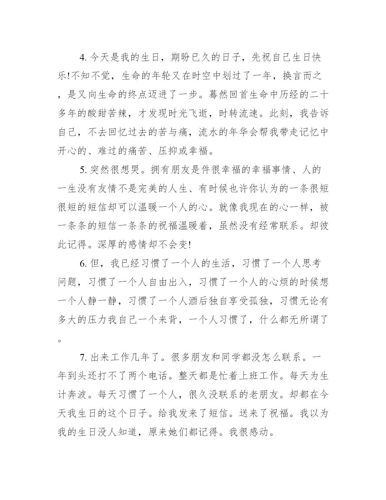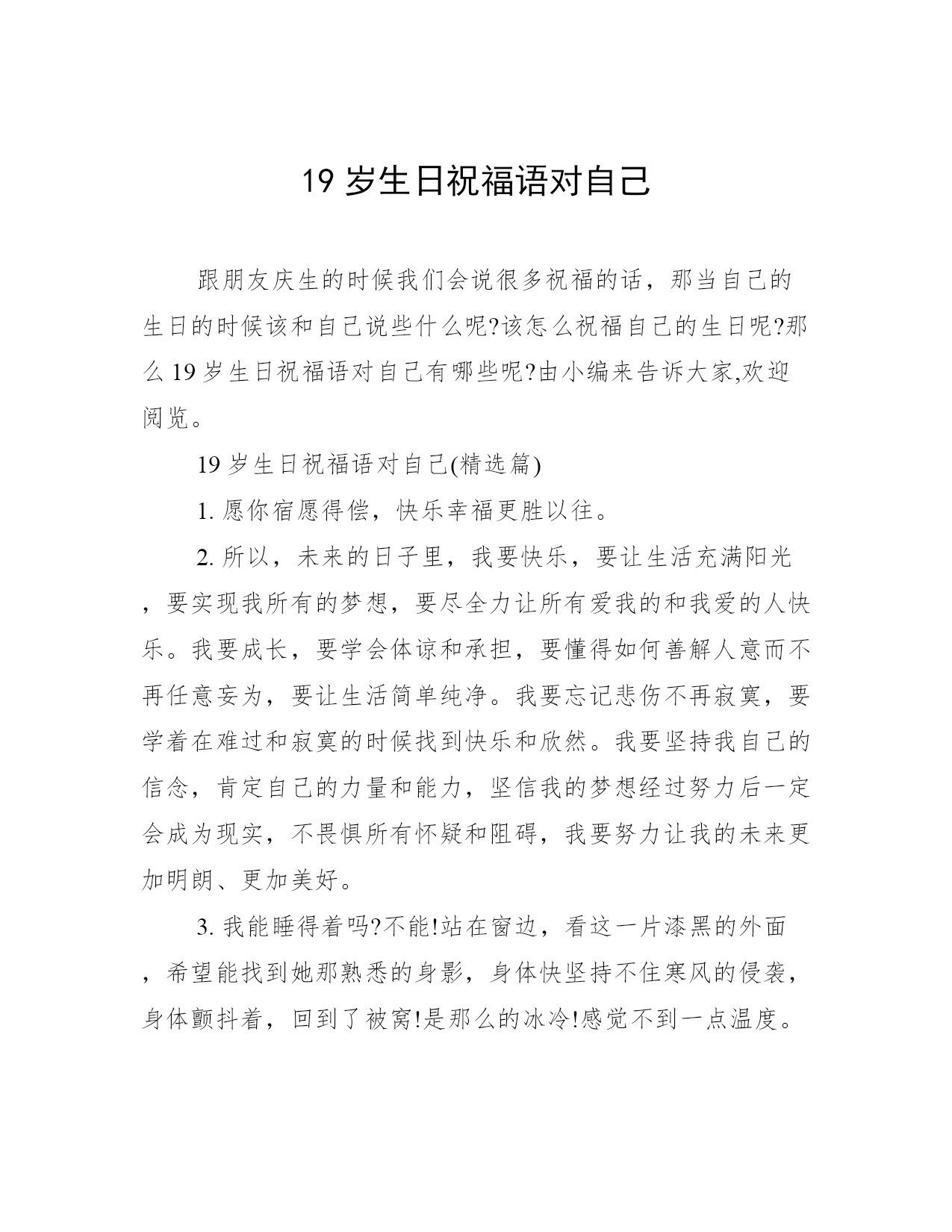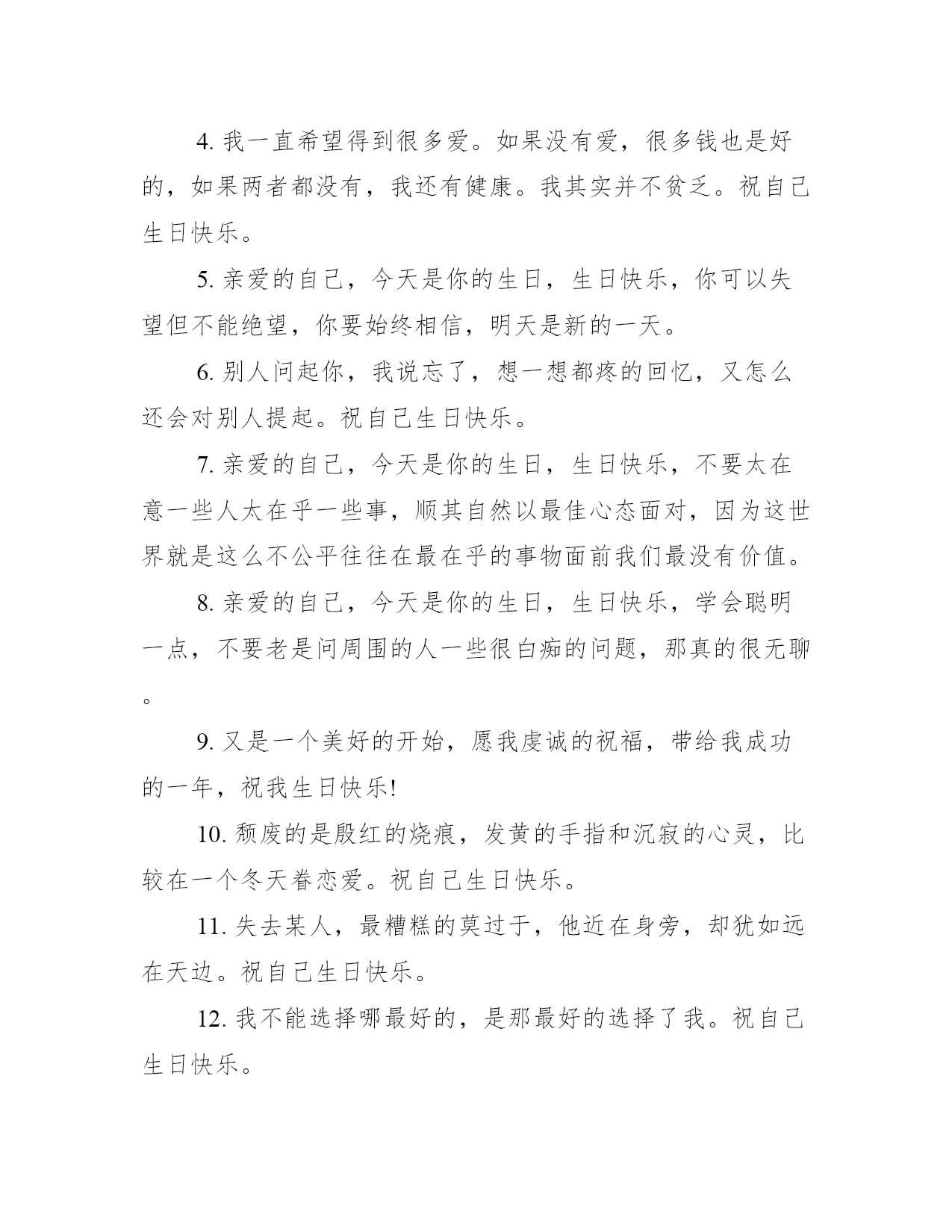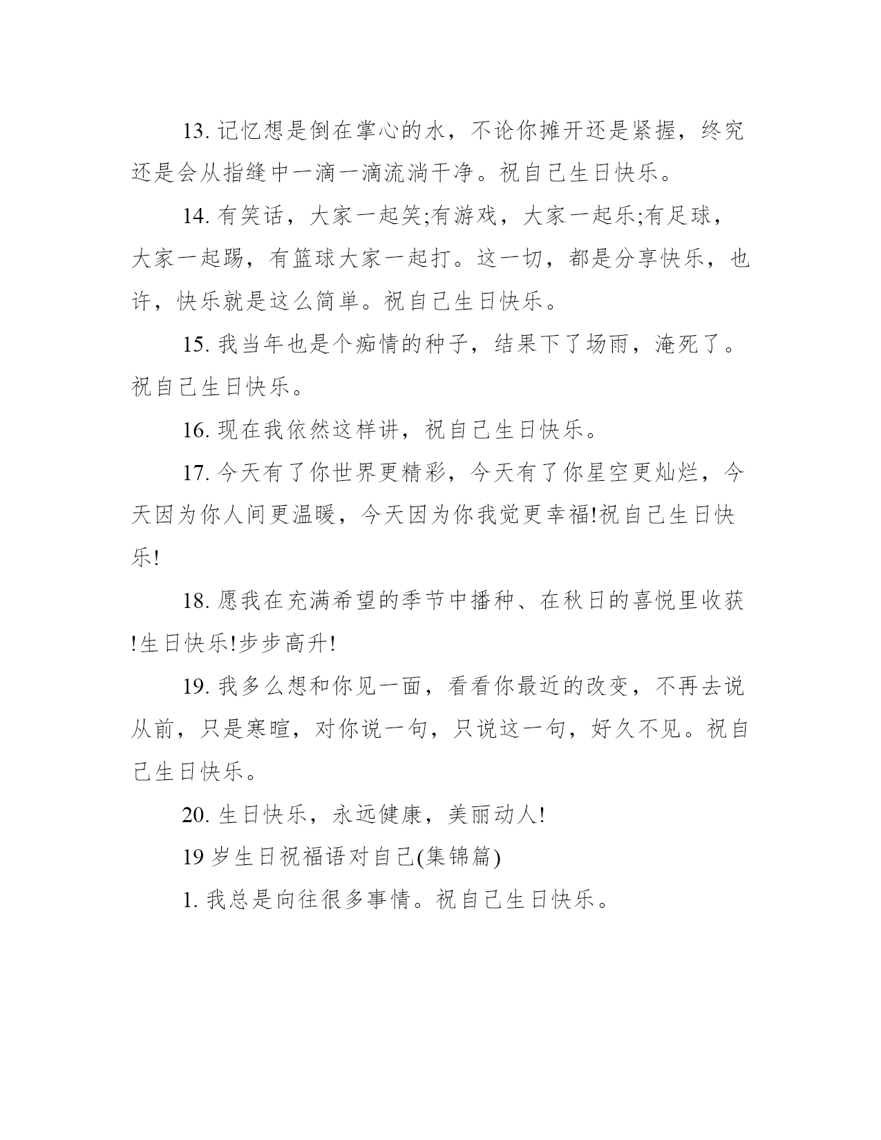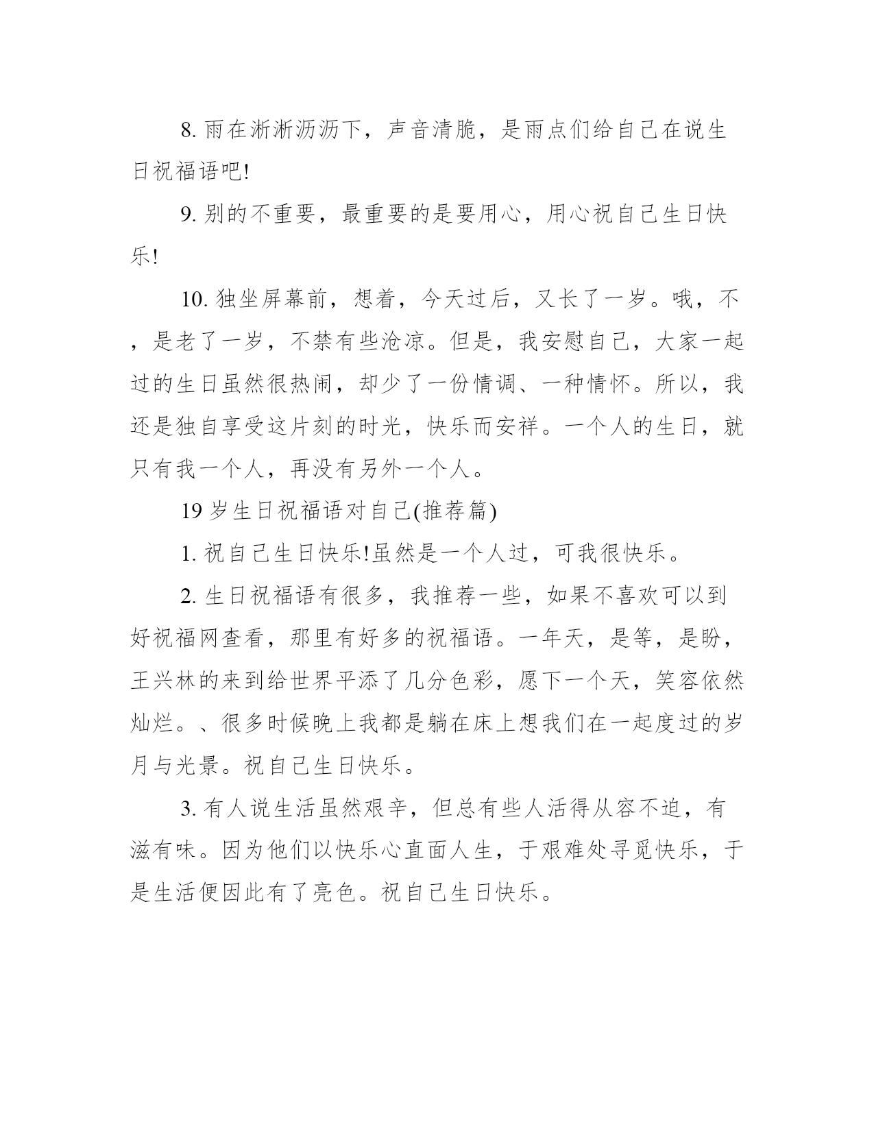 19岁生日祝福语对自己跟朋友庆生的时候我们会说很多祝福的话,那当自己的生日的时候该和自己说些什么呢?该怎么祝福自己的生日呢?那么19岁生日祝福语对自己有哪些呢?由小编来告诉大家,欢迎阅览。19岁生日祝福语对自己(精选篇)1.愿你宿愿得偿,快乐幸福更胜以往。2.所以,未来的日子里,我要快乐,要让生活充满阳光,要实现我所有的梦想,要尽全力让所有爱我的和我爱的人快乐。我要成长,要学会体谅和承担,要懂得如何善解人意而不再任意妄为,要让生活简单纯净。我要忘记悲伤不再寂寞,要学着在难过和寂寞的时候找到快乐和欣然。我要坚持我自己的信念,肯定自己的力量和能力,坚信我的梦想经过努力后一定会成为现实,不畏惧所有怀疑和阻碍,我要努力让我的未来更加明朗、更加美好。3.我能睡得着吗?不能!站在窗边,看这一片漆黑的外面,希望能找到她那熟悉的身影,身体快坚持不住寒风的侵袭,身体颤抖着,回到了被窝!是那么的冰冷!感觉不到一点温度。4.今天是我的生日,期盼已久的日子,先祝自己生日快乐!不知不觉,生命的年轮又在时空中划过了一年,换言而之,是又向生命的终点迈进了一步。蓦然回首生命中历经的二十多年的酸甜苦辣,才发现时光飞逝,时转流速。此刻,我告诉自己,不去回忆过去的苦与痛,流水的年华会帮我带走记忆中开心的、难过的痛苦、压抑或幸福。5.突然很想哭。拥有朋友是件很幸福的幸福事情、人的一生没有友情不是完美的人生、有时候也许你认为的一条很短很短的短信却可以温暖一个人的心。就像我现在的心一样,被一条条的短信一条条的祝福温暖着,虽然没有经常联系。却彼此记得。深厚的感情却不会变!6.但,我已经习惯了一个人的生活,习惯了一个人思考问题,习惯了一个人自由出入,习惯了一个人的心烦的时候想一个人静一静,习惯了一个人酒后独自享受孤独,习惯无论有多大的压力我自己一个来背,一个人习惯了,什么都无所谓了。7.出来工作几年了。很多朋友和同学都没怎么联系。一年到头还打不了两个电话。整天都是忙着上班工作。每天为生计奔波。每天习惯了一个人,很久没联系的老朋友。却都在今天我生日的这个日子。给我发来了短信。送来了祝福。我以为我的生日没人知道,原来她们都记得。我很感动。8.雨在淅淅沥沥下,声音清脆,是雨点们给自己在说生日祝福语吧!9.别的不重要,最重要的是要用心,用心祝自己生日快乐!10.独坐屏幕前,想着,今天过后,又长了一岁。哦,不,是老了一岁,不禁有些沧凉。但是,我安慰自己,大家一起过的生日虽然很热闹,却少了一份情调、一种情怀。所以,我还是独自享受这片刻的时光,快乐而安祥。一个人的生日,就只有我一个人,再没有另外一个人。19岁生日祝福语对自己(推荐篇)1.祝自己生日快乐!虽然是一个人过,可我很快乐。2.生日祝福语有很多,我推荐一些,如果不喜欢可以到好祝福网查看,那里有好多的祝福语。一年天,是等,是盼,王兴林的来到给世界平添了几分色彩,愿下一个天,笑容依然灿烂。、很多时候晚上我都是躺在床上想我们在一起度过的岁月与光景。祝自己生日快乐。3.有人说生活虽然艰辛,但总有些人活得从容不迫,有滋有味。因为他们以快乐心直面人生,于艰难处寻觅快乐,于是生活便因此有了亮色。祝自己生日快乐。4.我一直希望得到很多爱。如果没有爱,很多钱也是好的,如果两者都没有,我还有健康。我其实并不贫乏。祝自己生日快乐。5.亲爱的自己,今天是你的生日,生日快乐,你可以失望但不能绝望,你要始终相信,明天是新的一天。6.别人问起你,我说忘了,想一想都疼的回忆,又怎么还会对别人提起。祝自己生日快乐。7.亲爱的自己,今天是你的生日,生日快乐,不要太在意一些人太在乎一些事,顺其自然以最佳心态面对,因为这世界就是这么不公平往往在最在乎的事物面前我们最没有价值。8.亲爱的自己,今天是你的生日,生日快乐,学会聪明一点,不要老是问周围的人一些很白痴的问题,那真的很无聊。9.又是一个美好的开始,愿我虔诚的祝福,带给我成功的一年,祝我生日快乐!10.颓废的是殷红的烧痕,发黄的手指和沉寂的心灵,比较在一个冬天眷恋爱。祝自己生日快乐。11.失去某人,最糟糕的莫过于,他近在身旁,却犹如远在天边。祝自己生日快乐。12.我不能选择哪最好的,是那最好的选择了我。祝自己生日快乐。13.记忆想是倒在掌心的水,不论你摊开还是紧握,终究还是会从指缝中一滴一滴流淌干净。祝自己生日快乐。14.有笑话,大家一起笑;有游戏,大家一起乐;有足球,大家一起踢,有篮球大家一起打。这一切,都是分享快乐,也许,快乐就是这么简単。祝自己生日快乐。15.我当年也是个痴情的种子,结果下了场雨,淹死了。祝自己生日快乐。16.现在我依然这样讲,祝自己生日快乐。17.今天有了你世界更精彩,今天有了你星空更灿烂,今天因为你人间更温暖,今天因为你我觉更幸福!祝自己生日快乐!18.愿我在充满希望的季节中播种、在秋日的喜