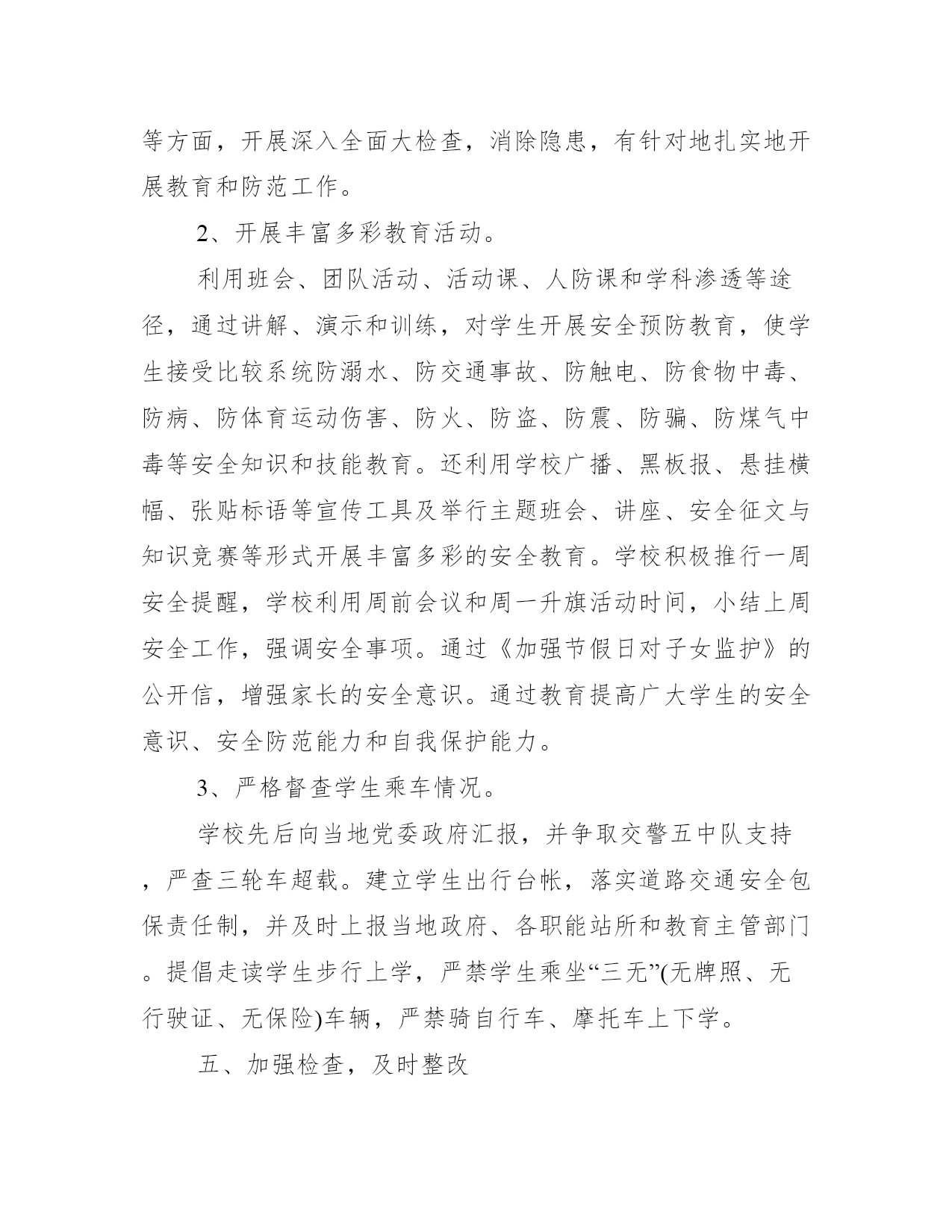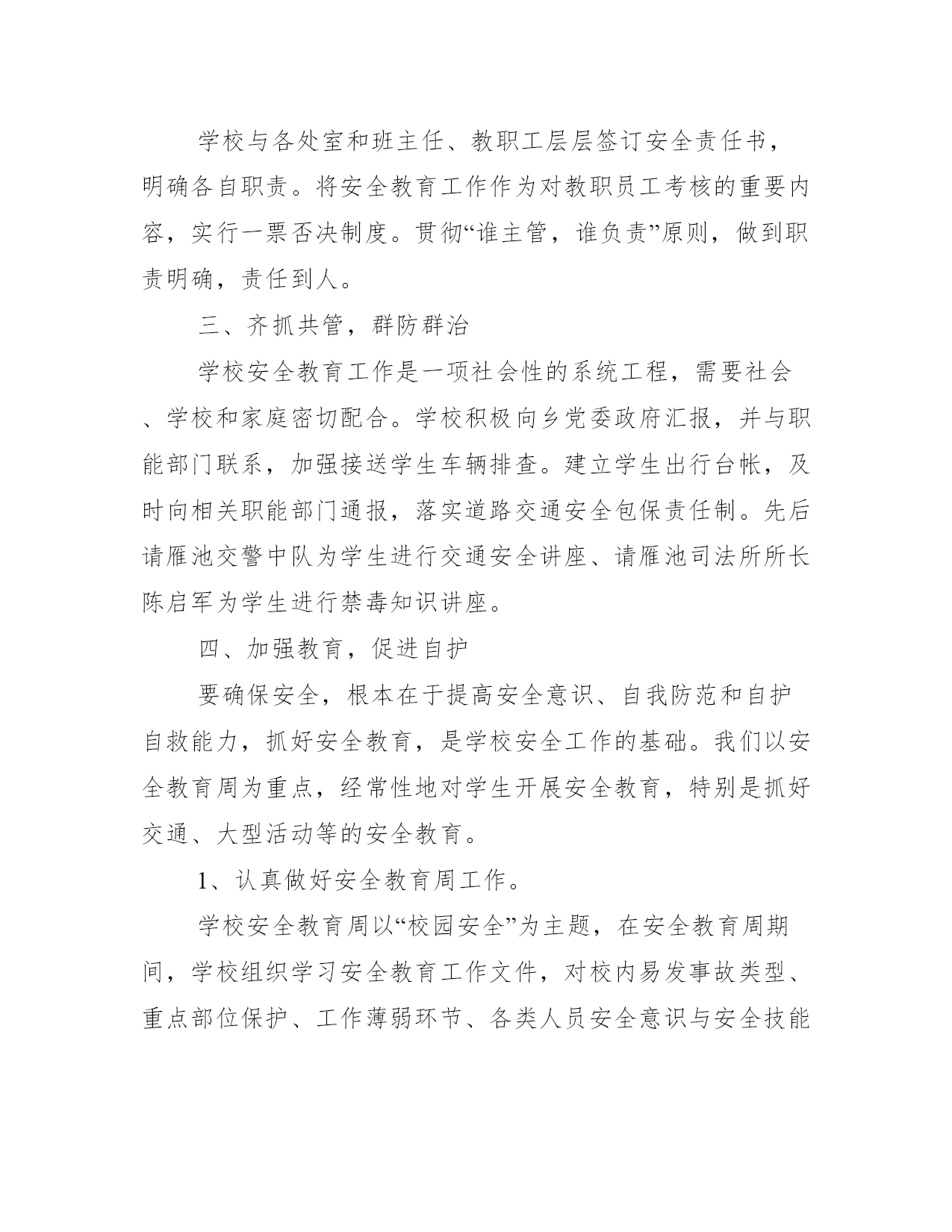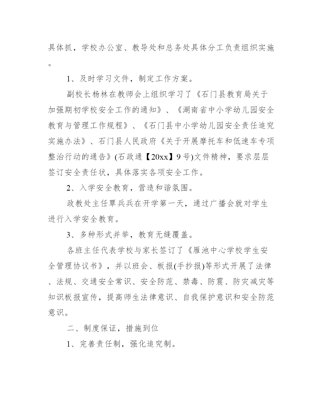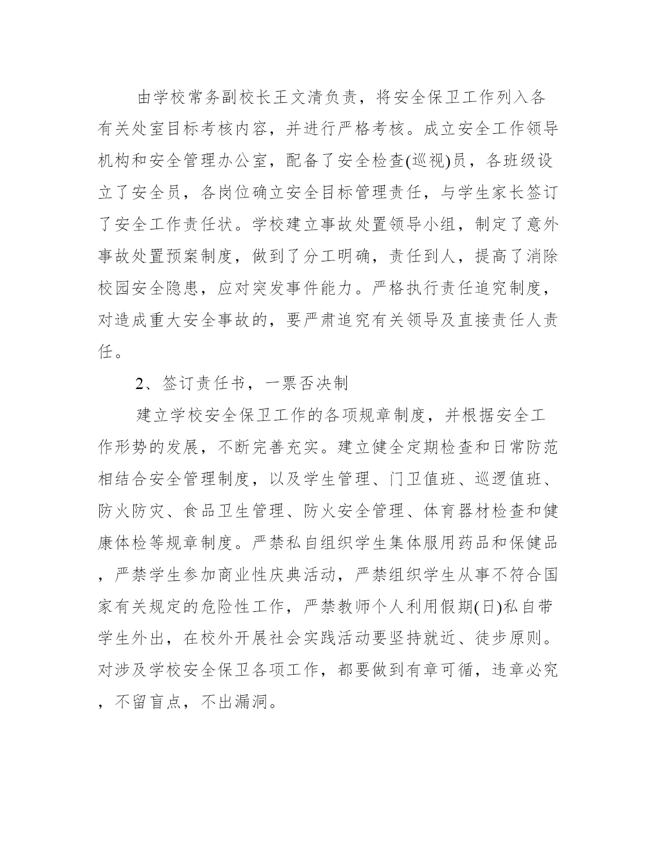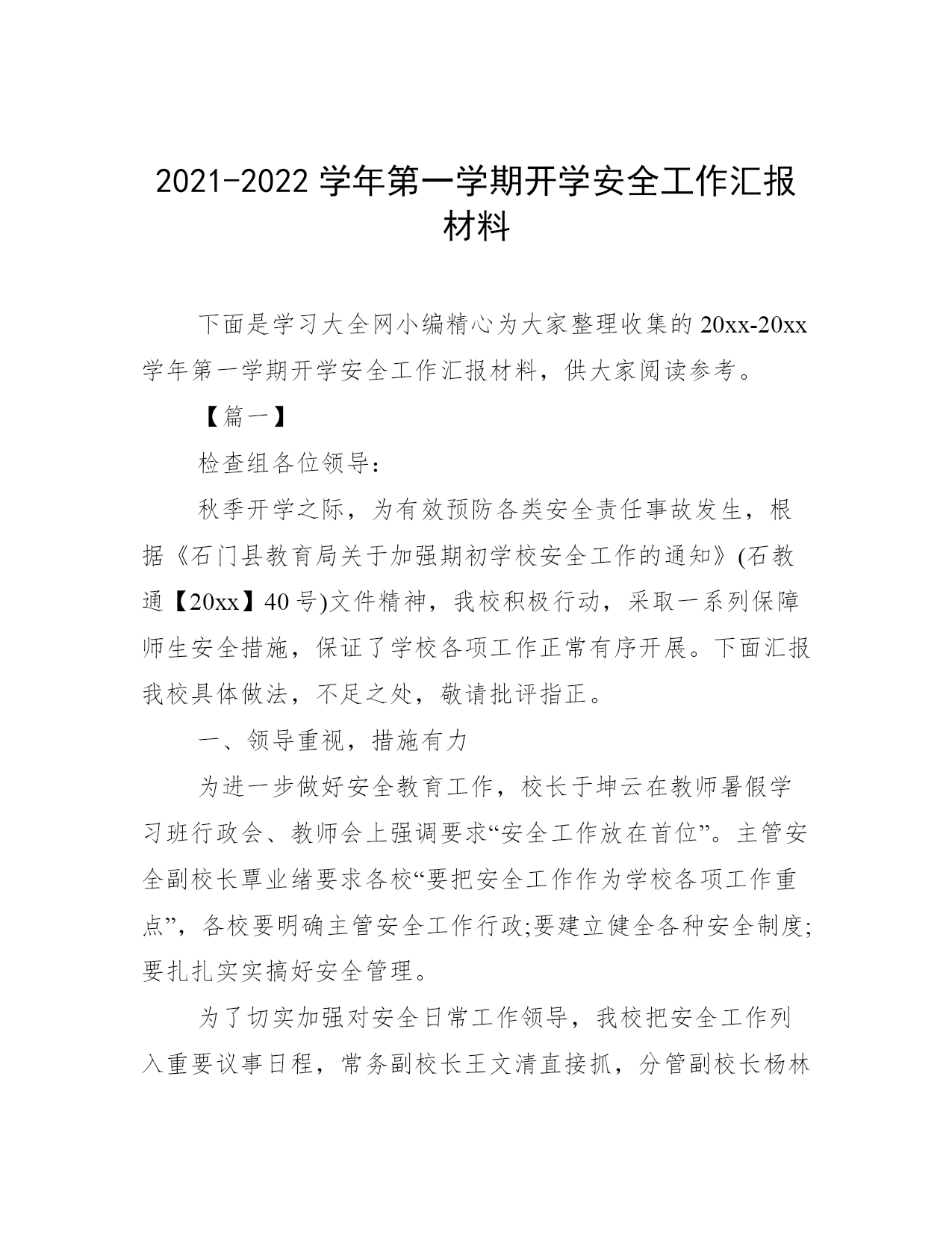 2021-2022学年第一学期开学安全工作汇报材料下面是学习大全网小编精心为大家整理收集的20xx-20xx学年第一学期开学安全工作汇报材料,供大家阅读参考。【篇一】检查组各位领导:秋季开学之际,为有效预防各类安全责任事故发生,根据《石门县教育局关于加强期初学校安全工作的通知》(石教通【20xx】40号)文件精神,我校积极行动,采取一系列保障师生安全措施,保证了学校各项工作正常有序开展。下面汇报我校具体做法,不足之处,敬请批评指正。一、领导重视,措施有力为进一步做好安全教育工作,校长于坤云在教师暑假学习班行政会、教师会上强调要求“安全工作放在首位”。主管安全副校长覃业绪要求各校“要把安全工作作为学校各项工作重点”,各校要明确主管安全工作行政;要建立健全各种安全制度;要扎扎实实搞好安全管理。为了切实加强对安全日常工作领导,我校把安全工作列入重要议事日程,常务副校长王文清直接抓,分管副校长杨林具体抓,学校办公室、教导处和总务处具体分工负责组织实施。1、及时学习文件,制定工作方案。副校长杨林在教师会上组织学习了《石门县教育局关于加强期初学校安全工作的通知》、《湖南省中小学幼儿园安全教育与管理工作规程》、《石门县中小学幼儿园安全责任追究实施办法》、石门县人民政府《关于开展摩托车和低速车专项整治行动的通告》(石政通【20xx】9号)文件精神,要求层层签订安全责任状,具体落实各项安全工作。2、入学安全教育,营造和谐氛围。政教处主任覃兵兵在开学第一天,通过广播会就对学生进行入学安全教育。3、多种形式并举,教育无缝覆盖。各班主任代表学校与家长签订了《雁池中心学校学生安全管理协议书》,并以班会、板报(手抄报)等形式开展了法律、法规、交通安全常识、安全防范、禁毒、防震、防灾减灾等知识板报宣传,提高师生法律意识、自我保护意识和安全防范意识。二、制度保证,措施到位1、完善责任制,强化追究制。由学校常务副校长王文清负责,将安全保卫工作列入各有关处室目标考核内容,并进行严格考核。成立安全工作领导机构和安全管理办公室,配备了安全检查(巡视)员,各班级设立了安全员,各岗位确立安全目标管理责任,与学生家长签订了安全工作责任状。学校建立事故处置领导小组,制定了意外事故处置预案制度,做到了分工明确,责任到人,提高了消除校园安全隐患,应对突发事件能力。严格执行责任追究制度,对造成重大安全事故的,要严肃追究有关领导及直接责任人责任。2、签订责任书,一票否决制建立学校安全保卫工作的各项规章制度,并根据安全工作形势的发展,不断完善充实。建立健全定期检查和日常防范相结合安全管理制度,以及学生管理、门卫值班、巡逻值班、防火防灾、食品卫生管理、防火安全管理、体育器材检查和健康体检等规章制度。严禁私自组织学生集体服用药品和保健品,严禁学生参加商业性庆典活动,严禁组织学生从事不符合国家有关规定的危险性工作,严禁教师个人利用假期(日)私自带学生外出,在校外开展社会实践活动要坚持就近、徒步原则。对涉及学校安全保卫各项工作,都要做到有章可循,违章必究,不留盲点,不出漏洞。学校与各处室和班主任、教职工层层签订安全责任书,明确各自职责。将安全教育工作作为对教职员工考核的重要内容,实行一票否决制度。贯彻“谁主管,谁负责”原则,做到职责明确,责任到人。三、齐抓共管,群防群治学校安全教育工作是一项社会性的系统工程,需要社会、学校和家庭密切配合。学校积极向乡党委政府汇报,并与职能部门联系,加强接送学生车辆排查。建立学生出行台帐,及时向相关职能部门通报,落实道路交通安全包保责任制。先后请雁池交警中队为学生进行交通安全讲座、请雁池司法所所长陈启军为学生进行禁毒知识讲座。四、加强教育,促进自护要确保安全,根本在于提高安全意识、自我防范和自护自救能力,抓好安全教育,是学校安全工作的基础。我们以安全教育周为重点,经常性地对学生开展安全教育,特别是抓好交通、大型活动等的安全教育。1、认真做好安全教育周工作。学校安全教育周以“校园安全”为主题,在安全教育周期间,学校组织学习安全教育工作文件,对校内易发事故类型、重点部位保护、工作薄弱环节、各类人员安全意识与安全技能等方面,开展深入全面大检查,消除隐患,有针对地扎实地开展教育和防范工作。2、开展丰富多彩教育活动。利用班会、团队活动、活动课、人防课和学科渗透等途径,通过讲解、演示和训练,对学生开展安全预防教育,使学生接受比较系统防溺水、防交通事故、防触电、防食物中毒、防病、防体育运动伤害、防火、防盗、防震、防骗、防煤气中毒等安全知识和技能教育。还利用学校广播、黑板报、悬挂横幅、张贴标语等宣传工具及举行主题班会、讲座、安全征文与知识竞赛等形式开展丰富多彩的安全教育。学校积极推行一周安全提醒,学校利用周前会议和周一升旗活动时间,小结上周安全工作,强调安全事项。通过《加强节